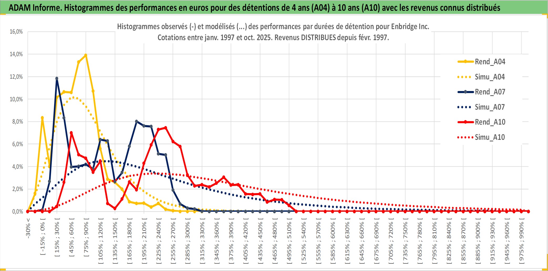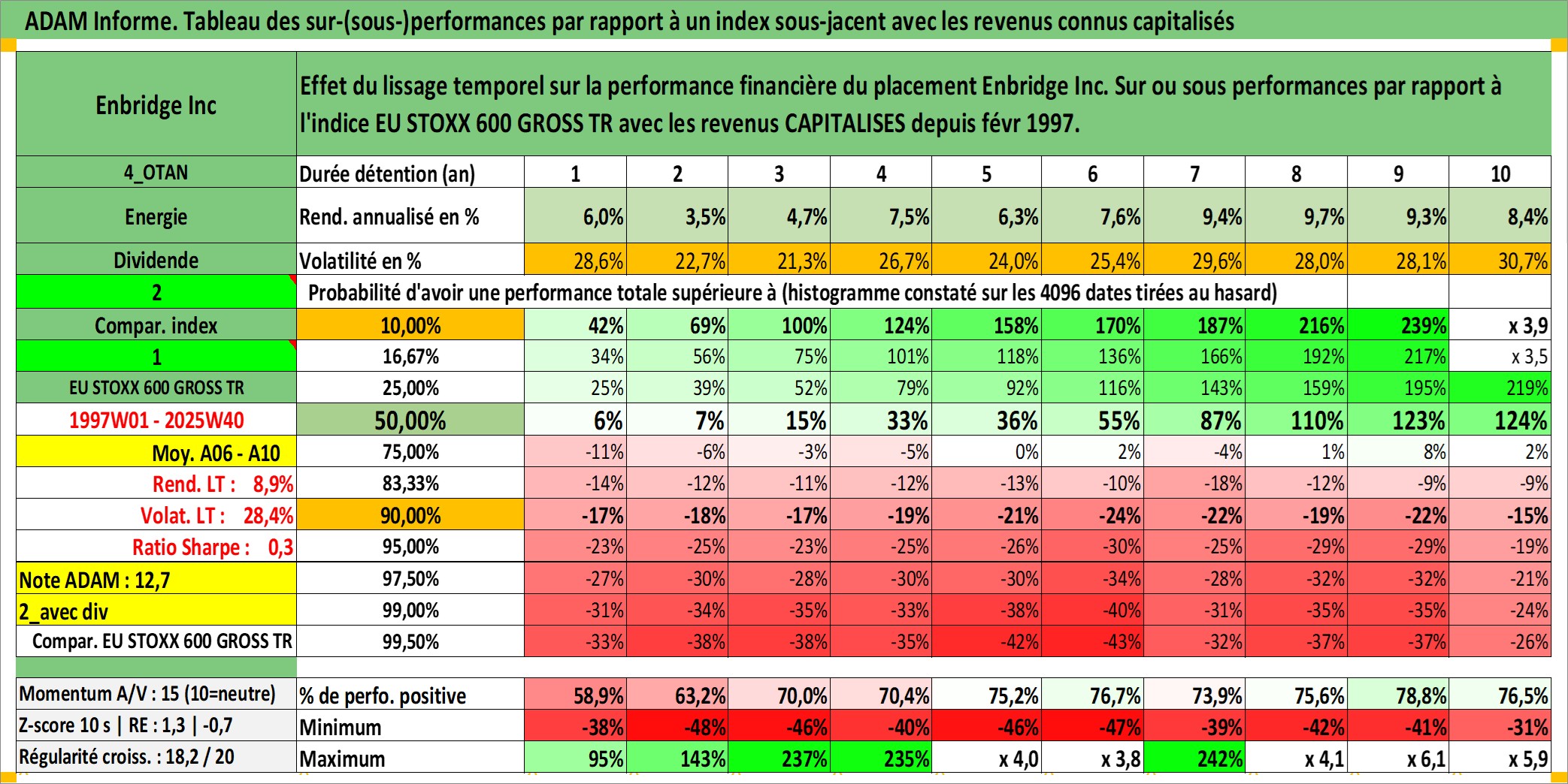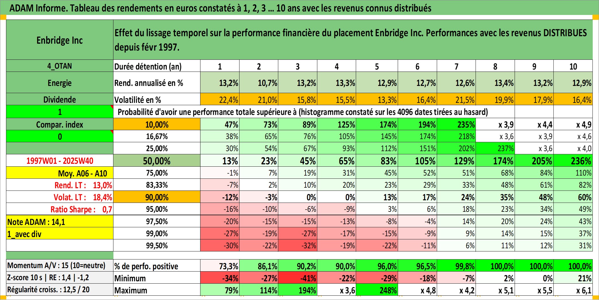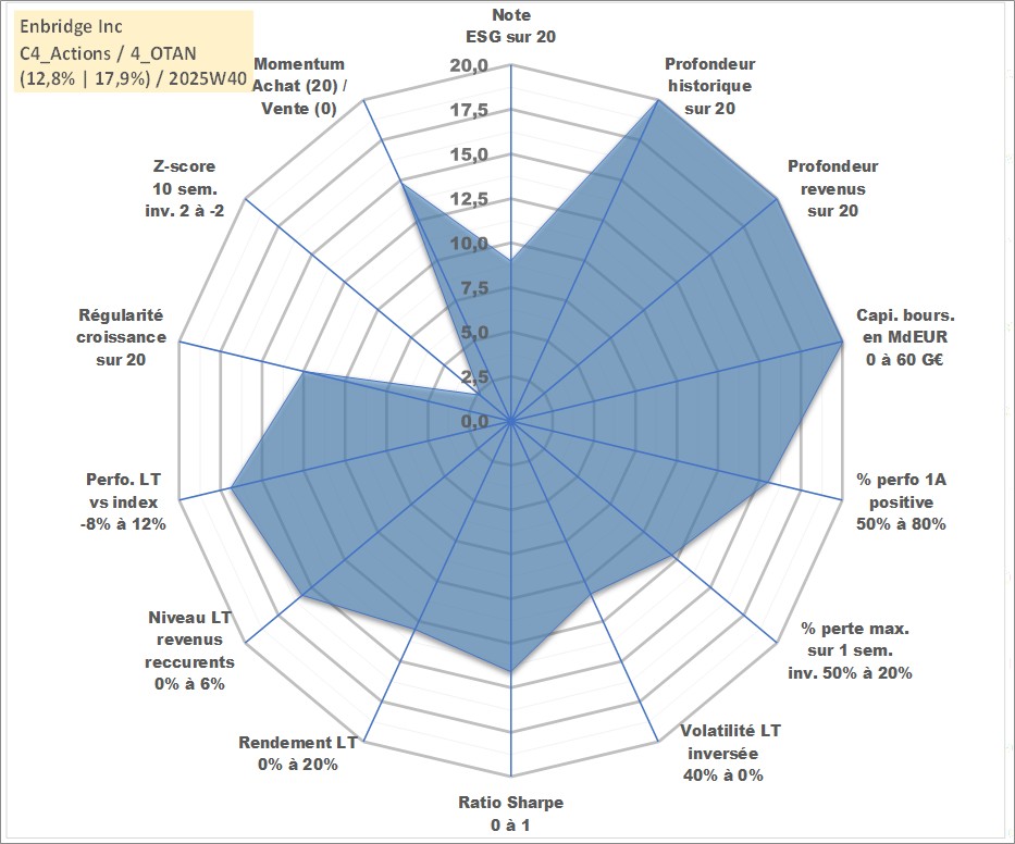 Site dédié aux investisseursPage dédiée sur site financeAnalyse des valorisations hebdomadaires de l'action Enbridge Inc. Cet actif est cote en CAD. Les valorisations sont en contrevaleur EURO et couvrent les semaines 1997W01 a 2025W40. Les revenus de cet actif financier sont pris en compte depuis la semaine 1997W07. La note globale ESG de cet actif est estimee a 9.0 (apres rebasage entre 0 et 20).
