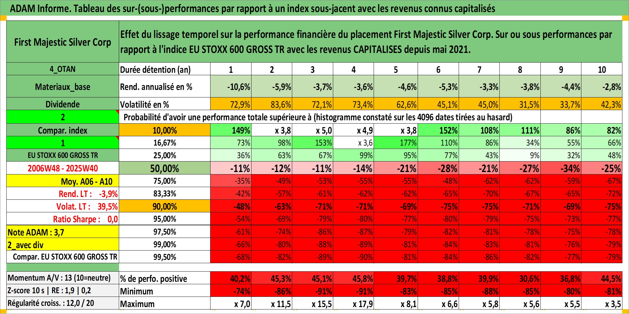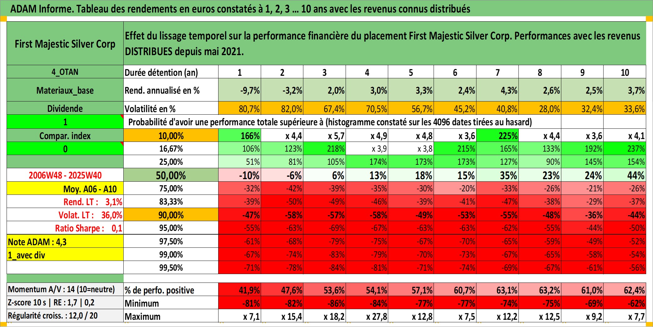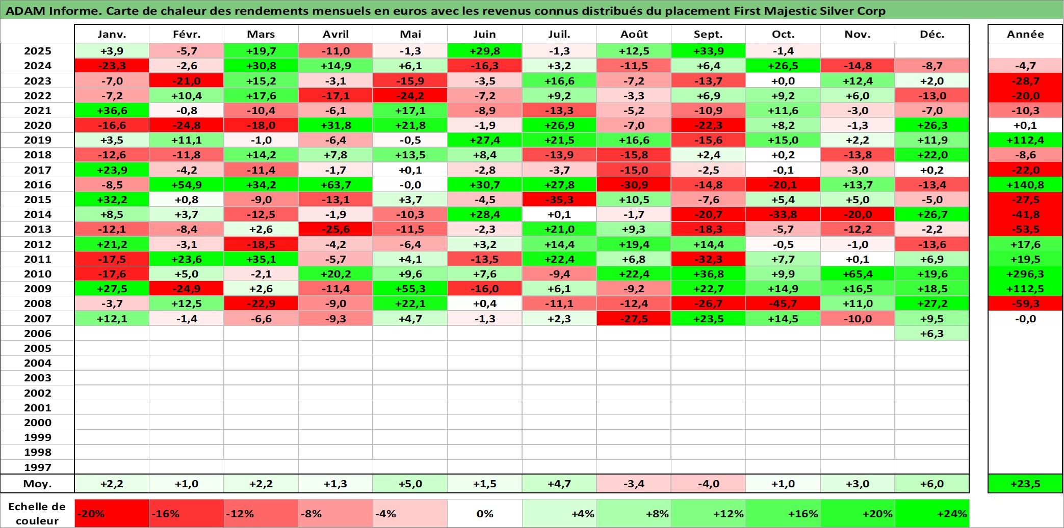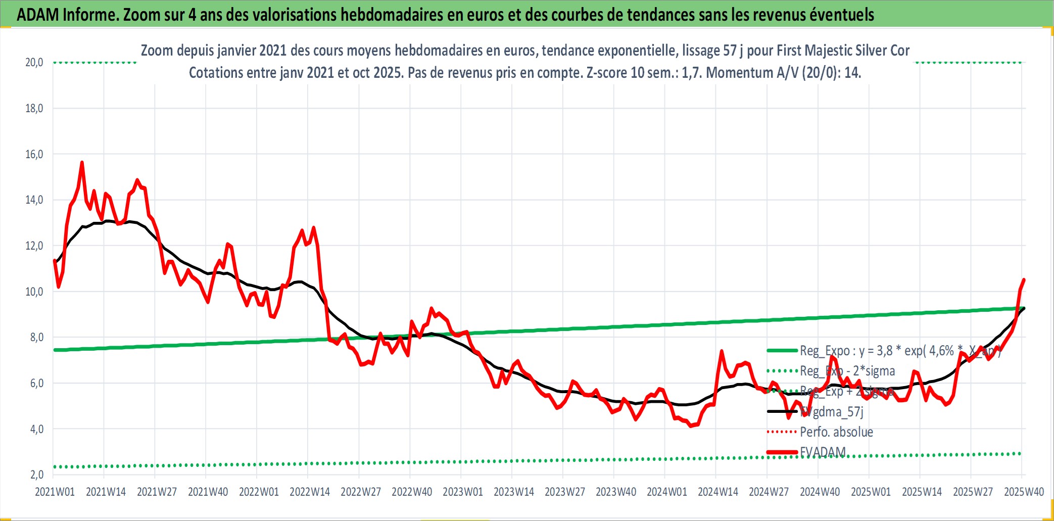 Site dédié aux investisseursPage dédiée sur site financeAnalyse des valorisations hebdomadaires de l'action First Majestic Silver Corp. Cet actif est cote en USD. Les valorisations sont en contrevaleur EURO et couvrent les semaines 2006W48 a 2025W40. Les revenus de cet actif financier sont pris en compte depuis la semaine 2021W19. La note ESG de cet actif n'est pas connue.