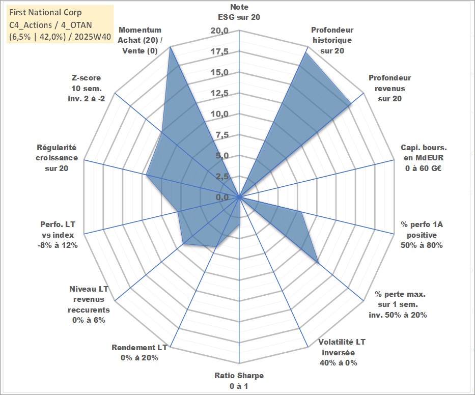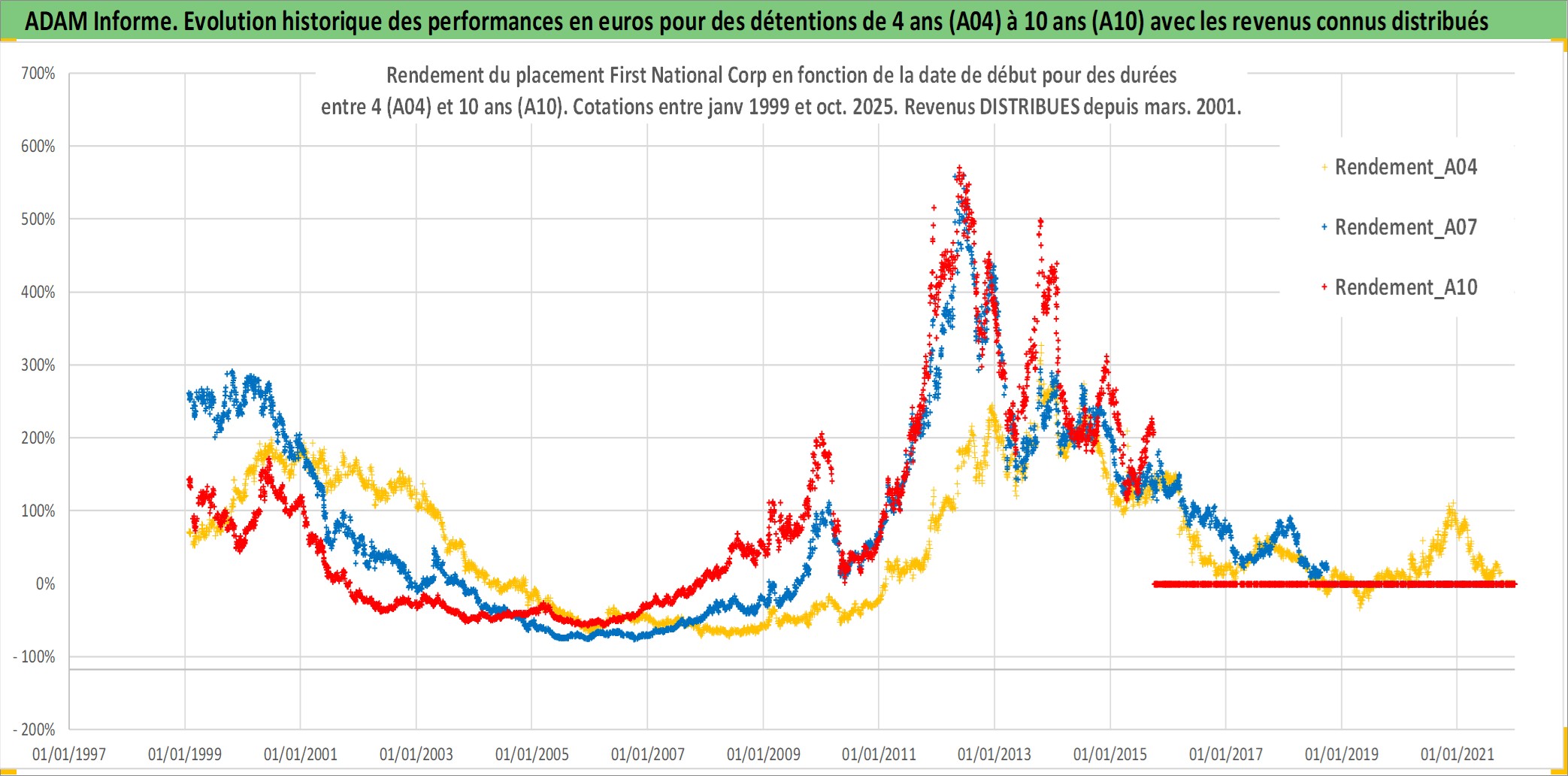 Site dédié aux investisseursPage dédiée sur site financeAnalyse des valorisations hebdomadaires de l'action First National Corp. Cet actif est cote en USD. Les valorisations sont en contrevaleur EURO et couvrent les semaines 1999W02 a 2025W40. Les revenus de cet actif financier sont pris en compte depuis la semaine 2001W11. La note ESG de cet actif n'est pas connue.