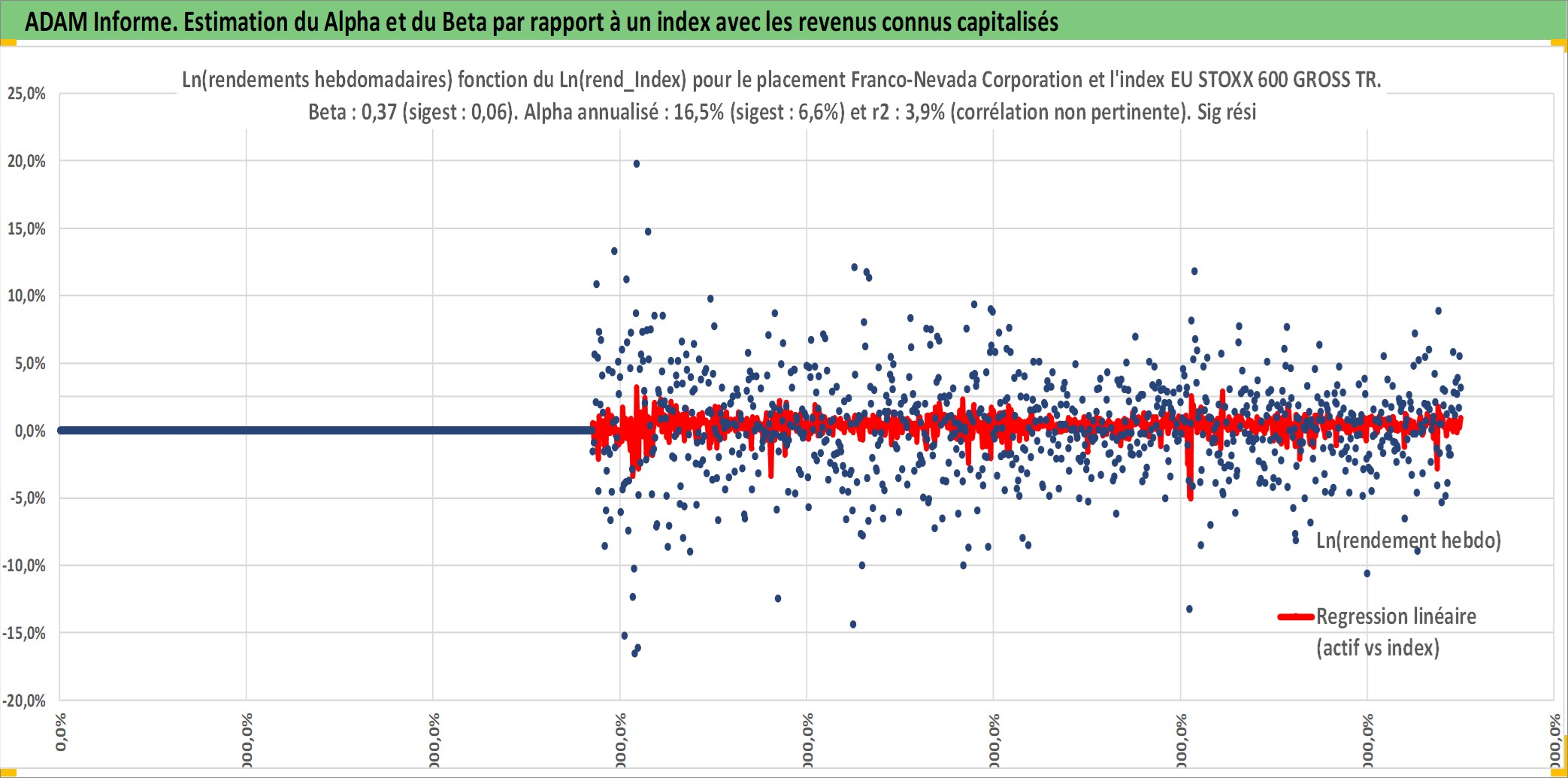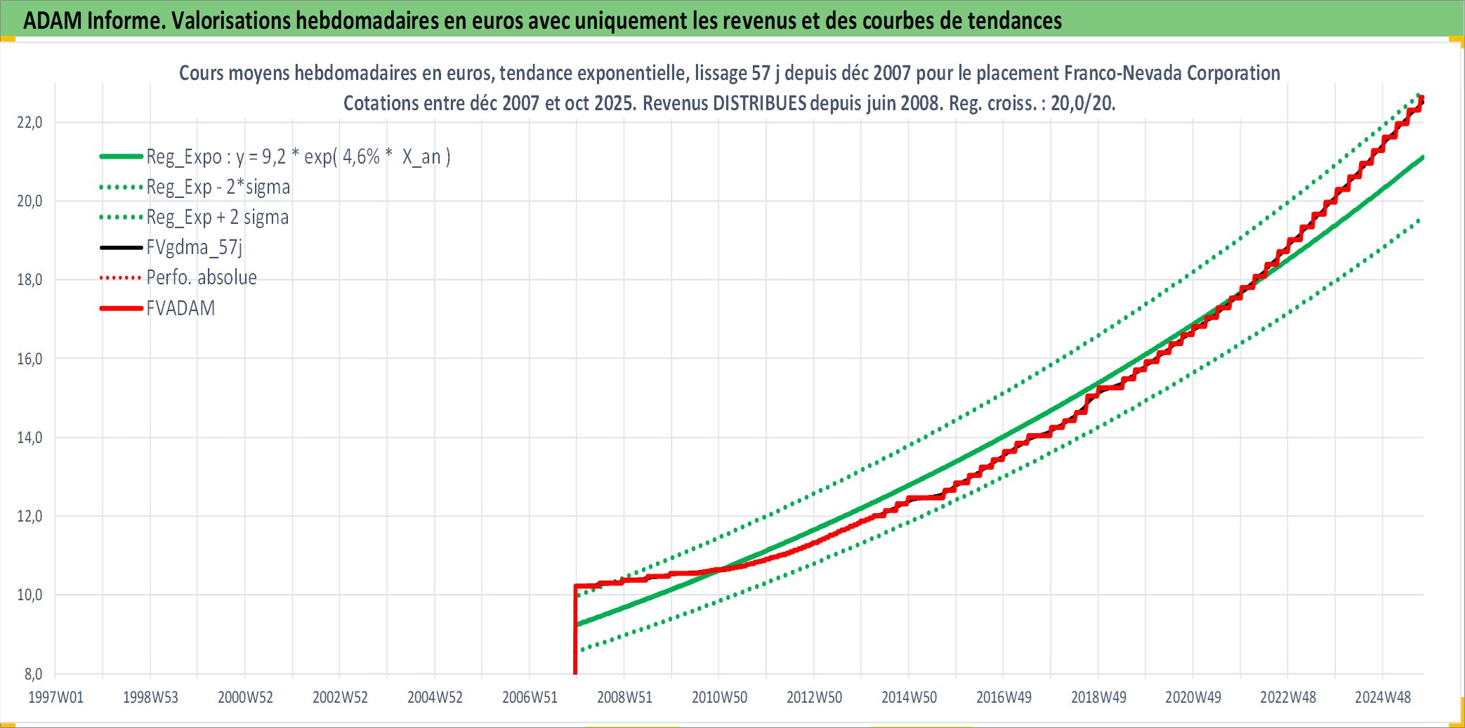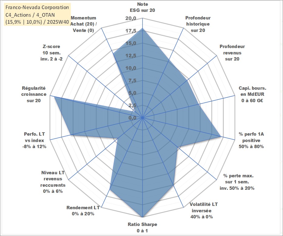 Site dédié aux investisseursPage dédiée sur site financeAnalyse des valorisations hebdomadaires de l'action Franco-Nevada Corporation. Cet actif est cote en CAD. Les valorisations sont en contrevaleur EURO et couvrent les semaines 2007W49 a 2025W40. Les revenus de cet actif financier sont pris en compte depuis la semaine 2008W23. La note globale ESG de cet actif est estimee a 18.0 (apres rebasage entre 0 et 20).