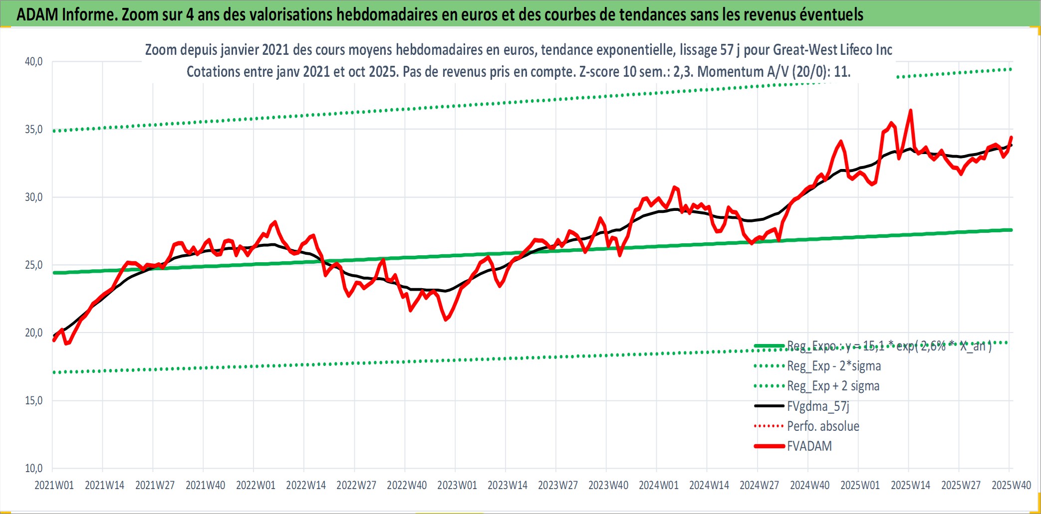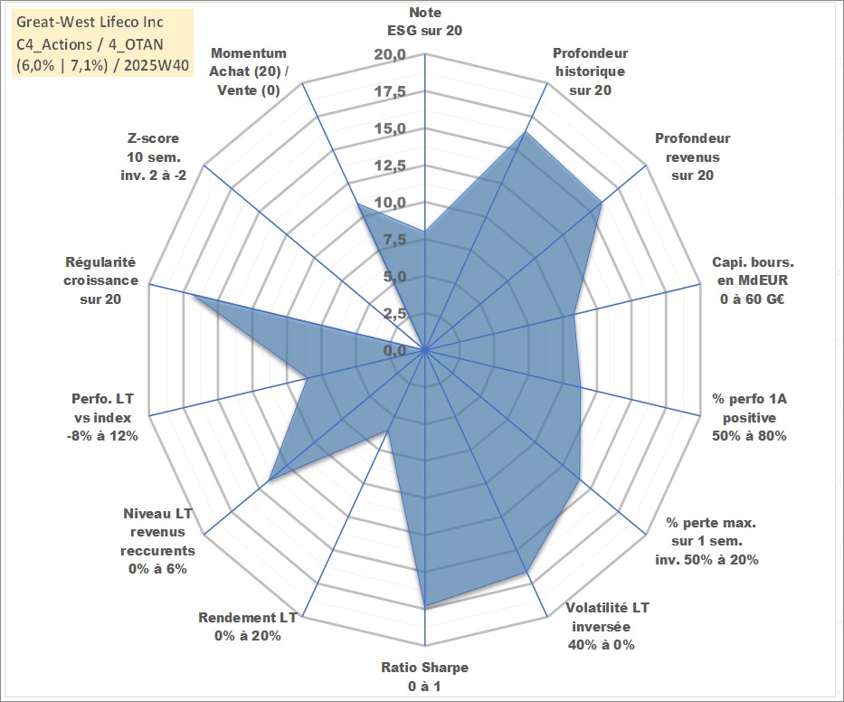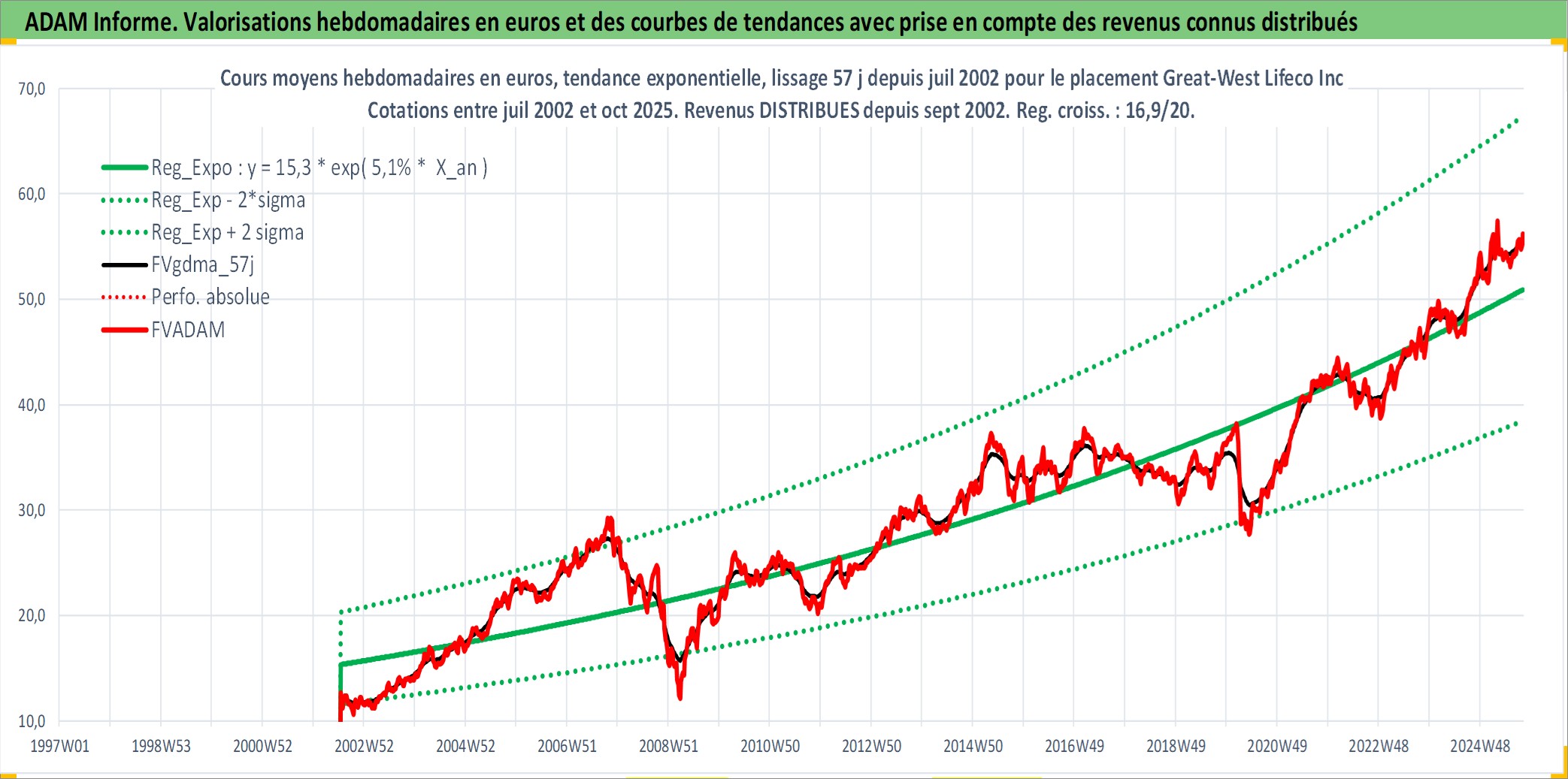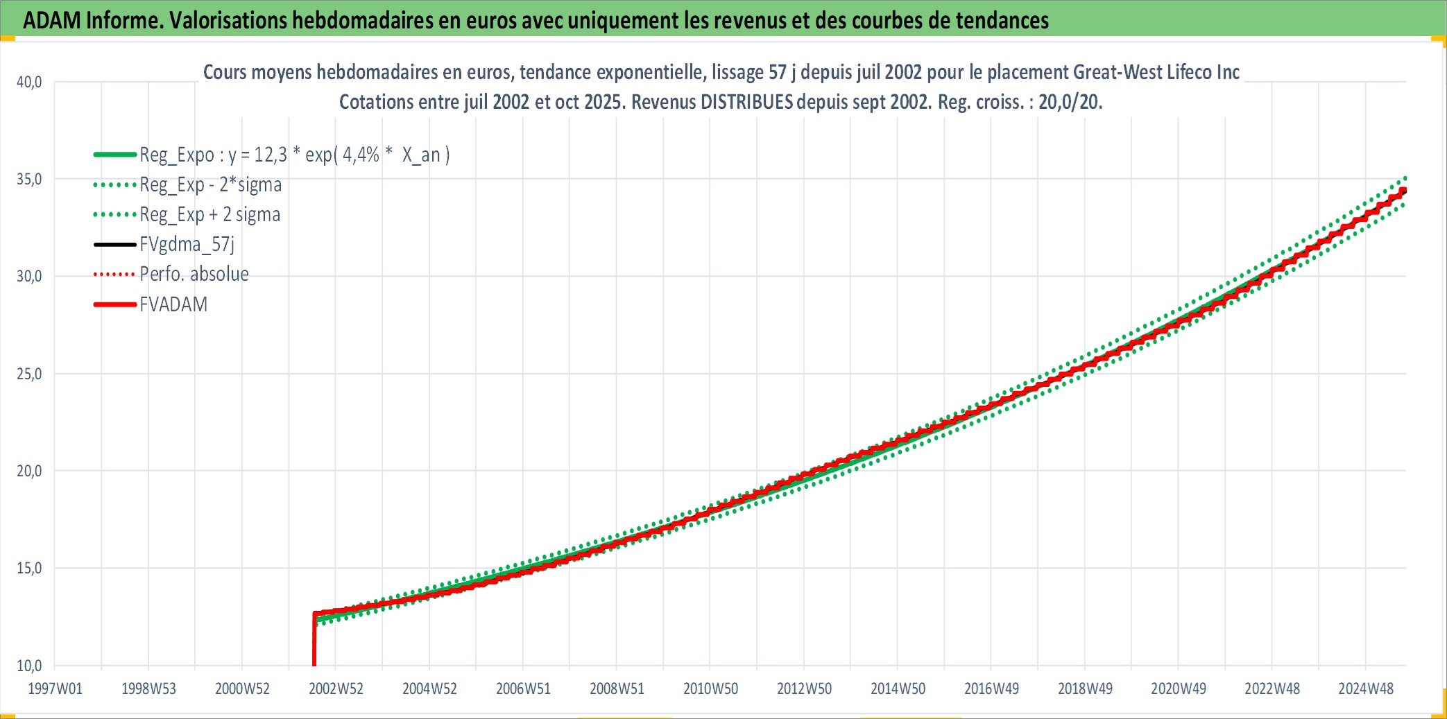 Site dédié aux investisseursPage dédiée sur site financeAnalyse des valorisations hebdomadaires de l'action Great-West Lifeco Inc. Cet actif est cote en CAD. Les valorisations sont en contrevaleur EURO et couvrent les semaines 2002W28 a 2025W40. Les revenus de cet actif financier sont pris en compte depuis la semaine 2002W37. La note globale ESG de cet actif est estimee a 8.0 (apres rebasage entre 0 et 20).