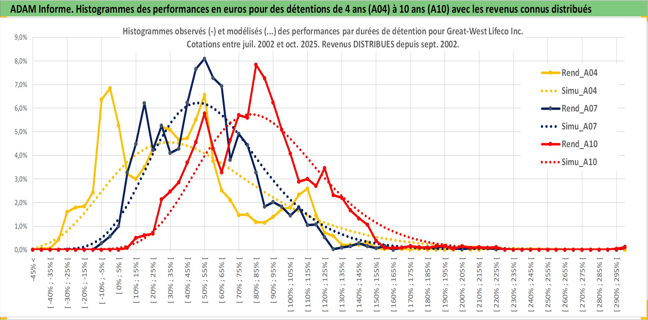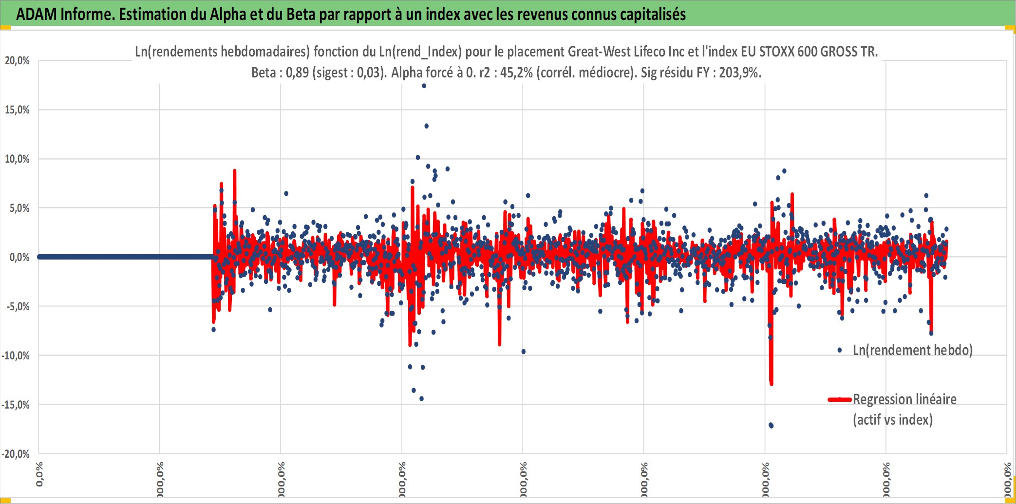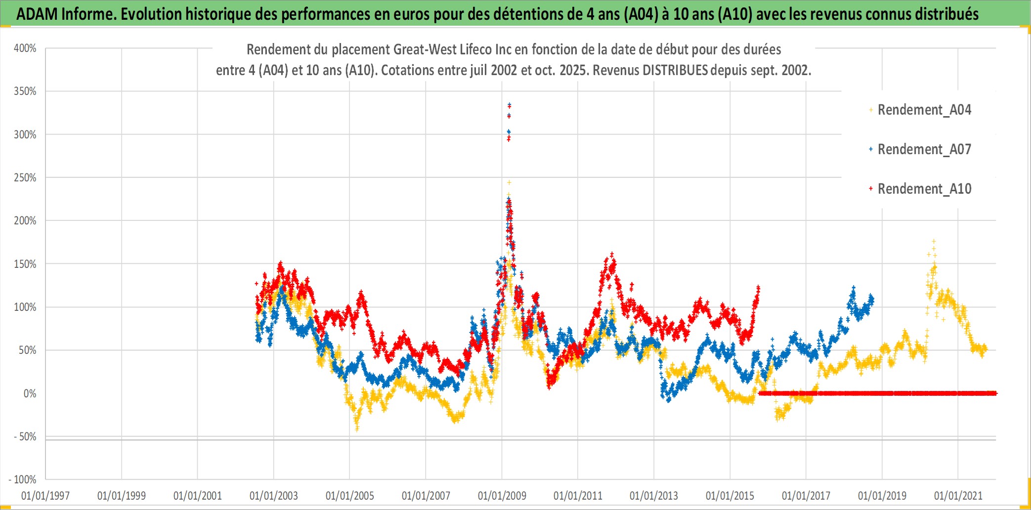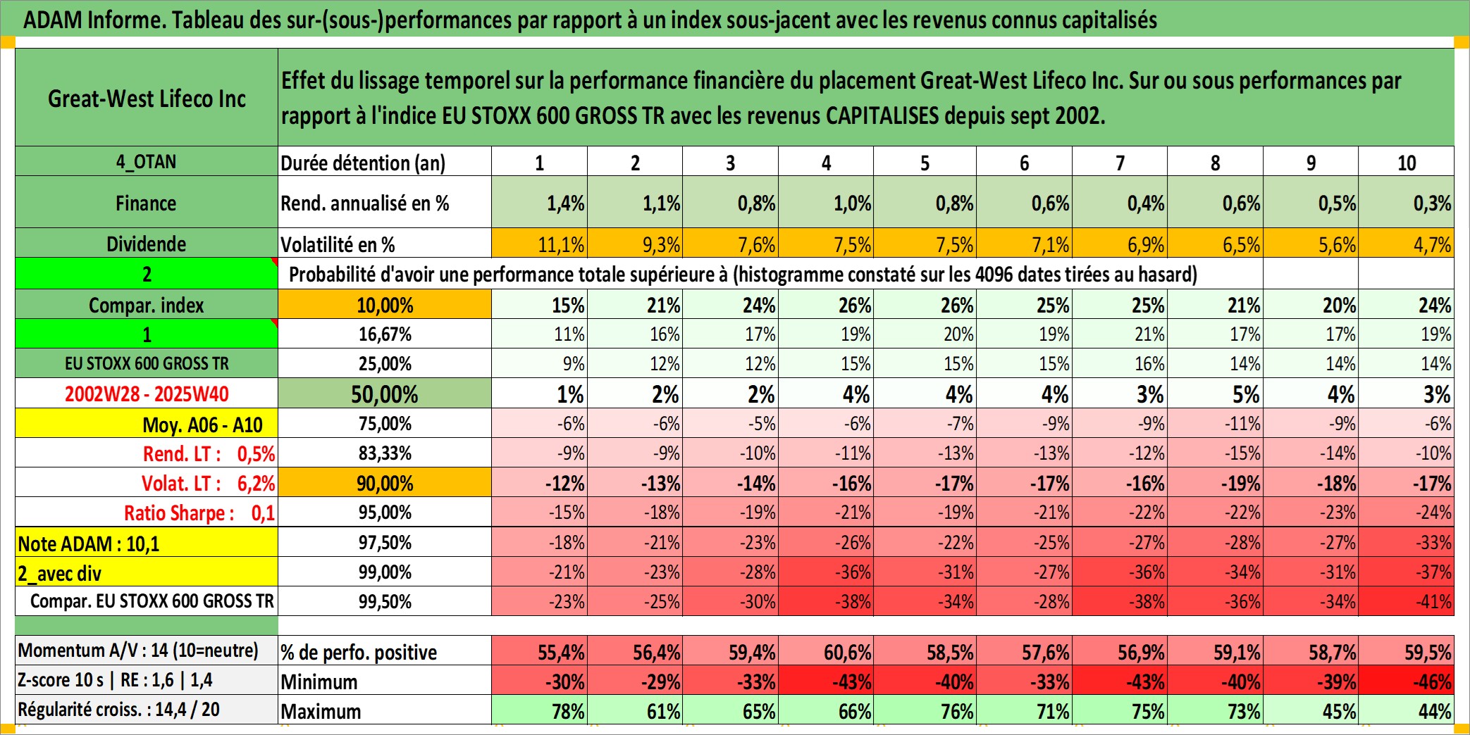 Site dédié aux investisseursPage dédiée sur site financeAnalyse des valorisations hebdomadaires de l'action Great-West Lifeco Inc. Cet actif est cote en CAD. Les valorisations sont en contrevaleur EURO et couvrent les semaines 2002W28 a 2025W40. Les revenus de cet actif financier sont pris en compte depuis la semaine 2002W37. La note globale ESG de cet actif est estimee a 8.0 (apres rebasage entre 0 et 20).