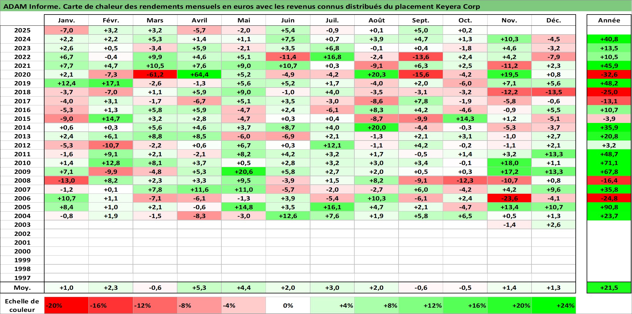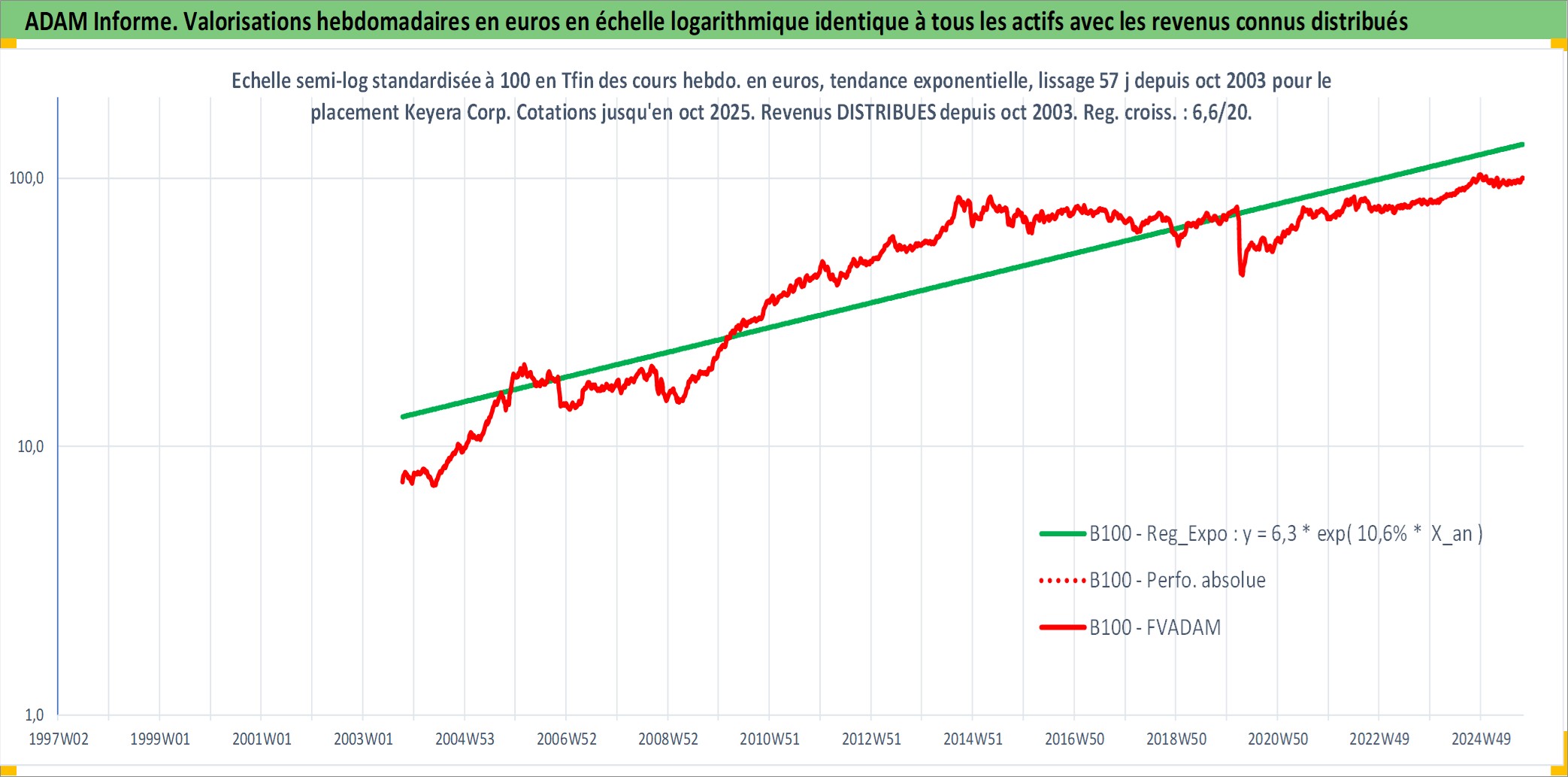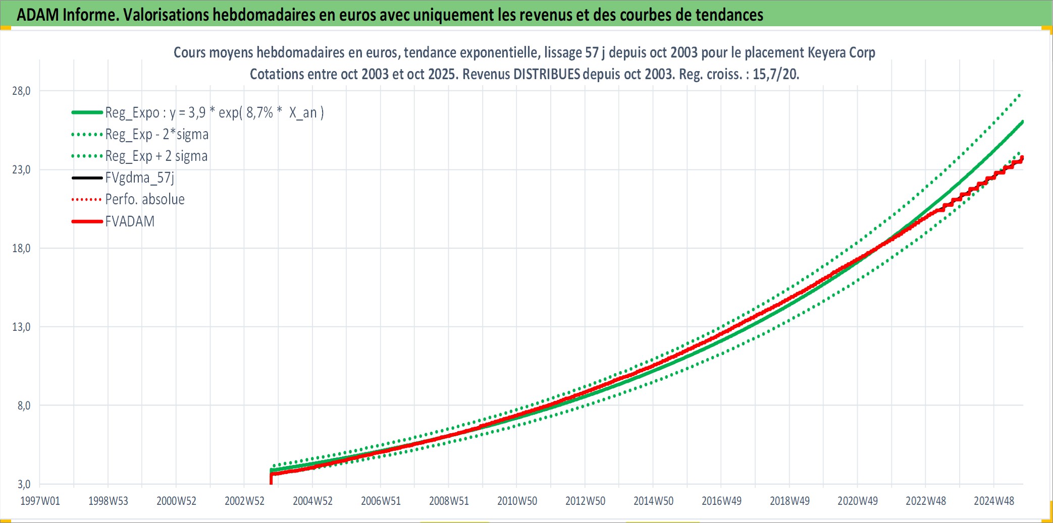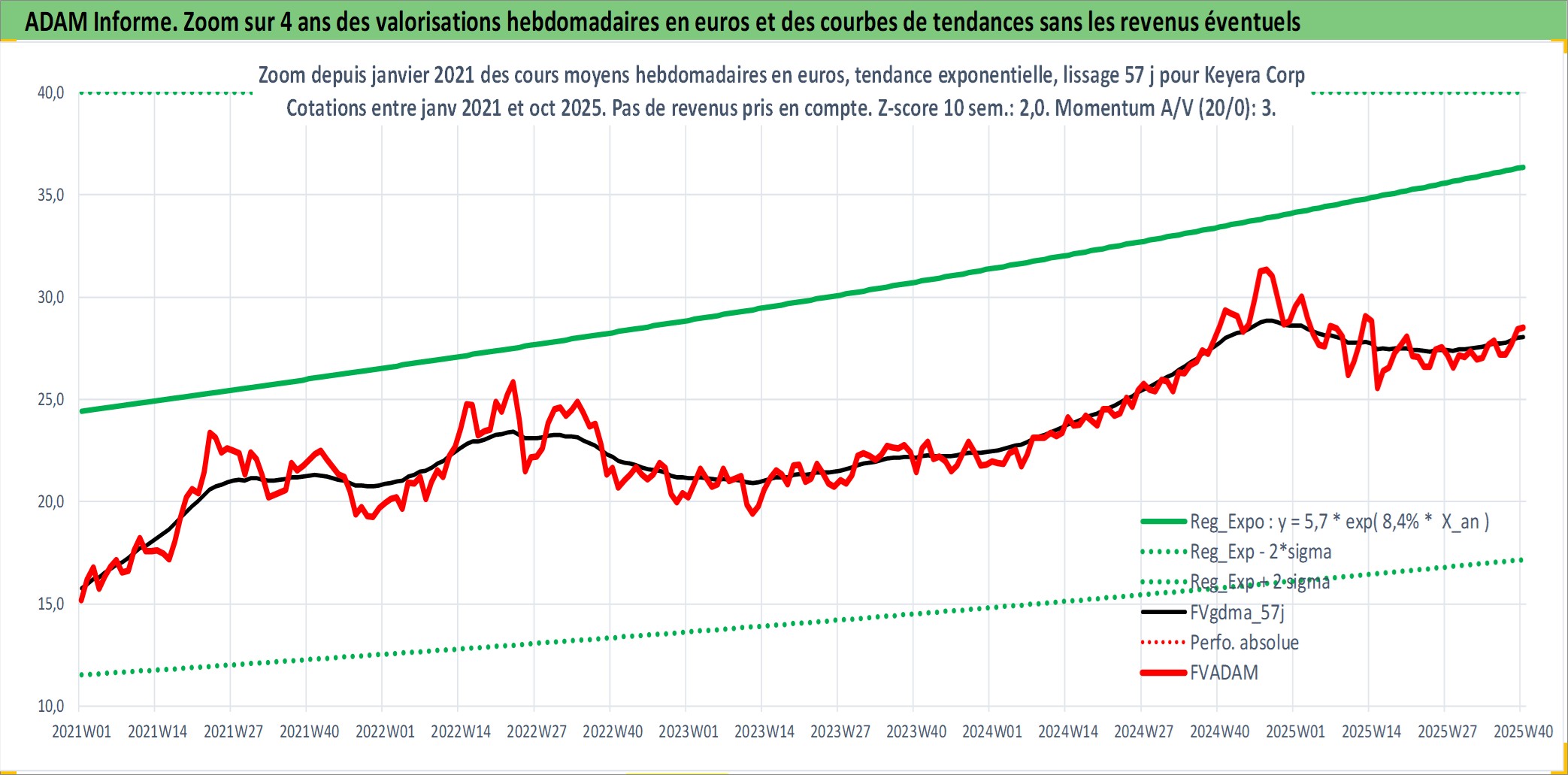 Site dédié aux investisseursPage dédiée sur site financeAnalyse des valorisations hebdomadaires de l'action Keyera Corp. Cet actif est cote en CAD. Les valorisations sont en contrevaleur EURO et couvrent les semaines 2003W41 a 2025W40. Les revenus de cet actif financier sont pris en compte depuis la semaine 2003W44. La note globale ESG de cet actif est estimee a 9.0 (apres rebasage entre 0 et 20).