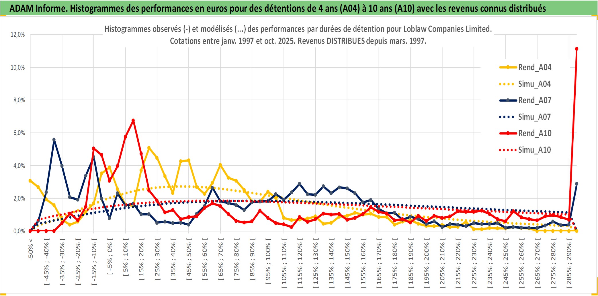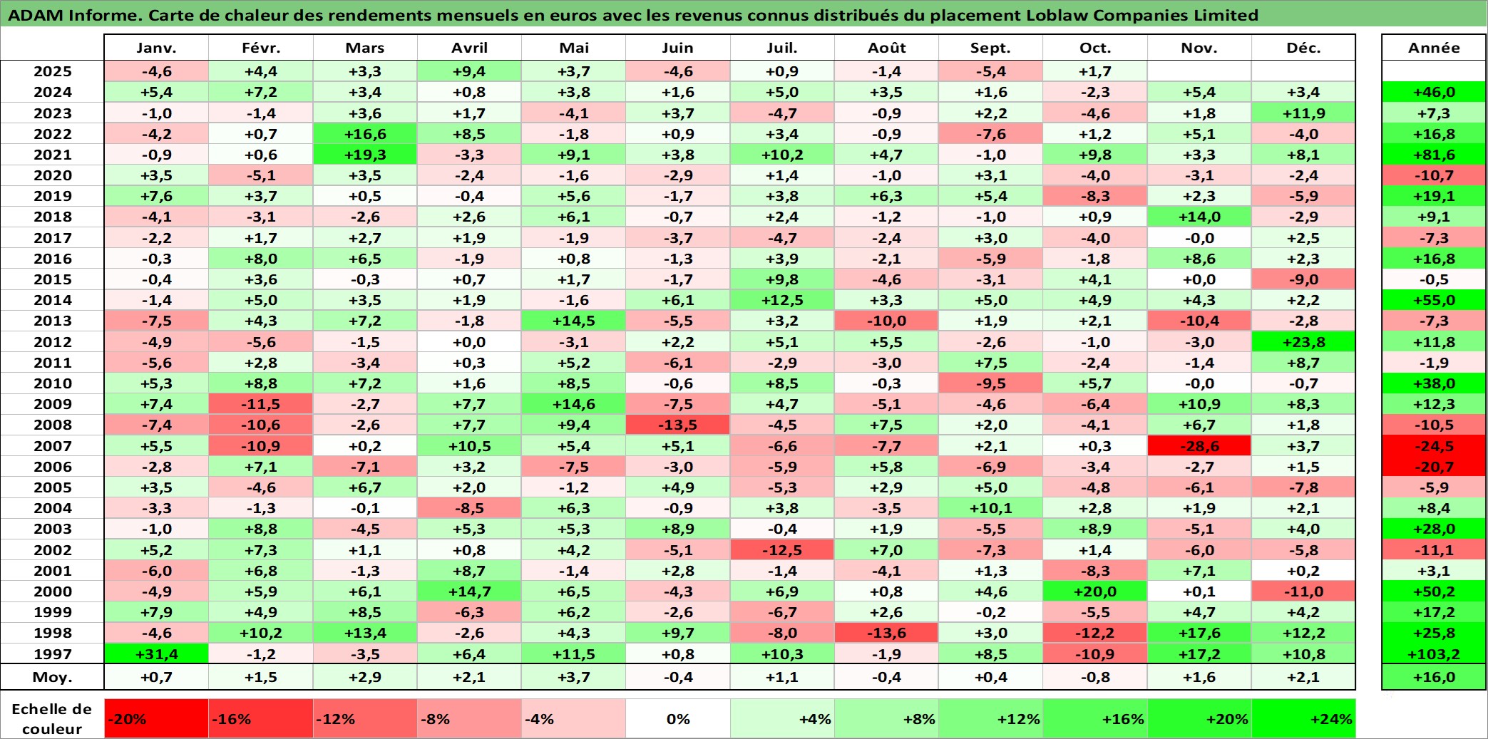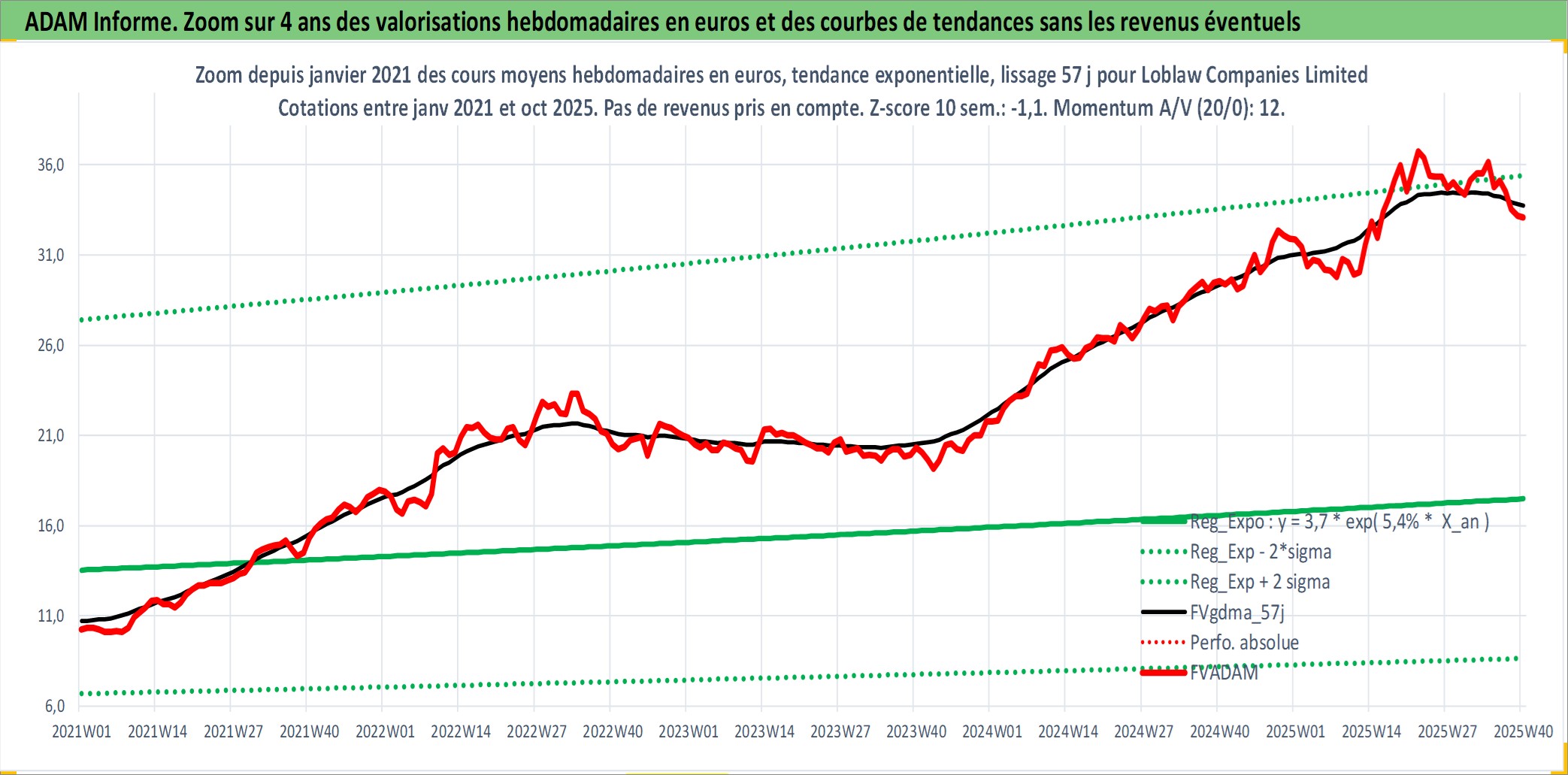 Site dédié aux investisseursPage dédiée sur site financeAnalyse des valorisations hebdomadaires de l'action Loblaw Companies Limited. Cet actif est cote en CAD. Les valorisations sont en contrevaleur EURO et couvrent les semaines 1997W01 a 2025W40. Les revenus de cet actif financier sont pris en compte depuis la semaine 1997W11. La note globale ESG de cet actif est estimee a 10.0 (apres rebasage entre 0 et 20).