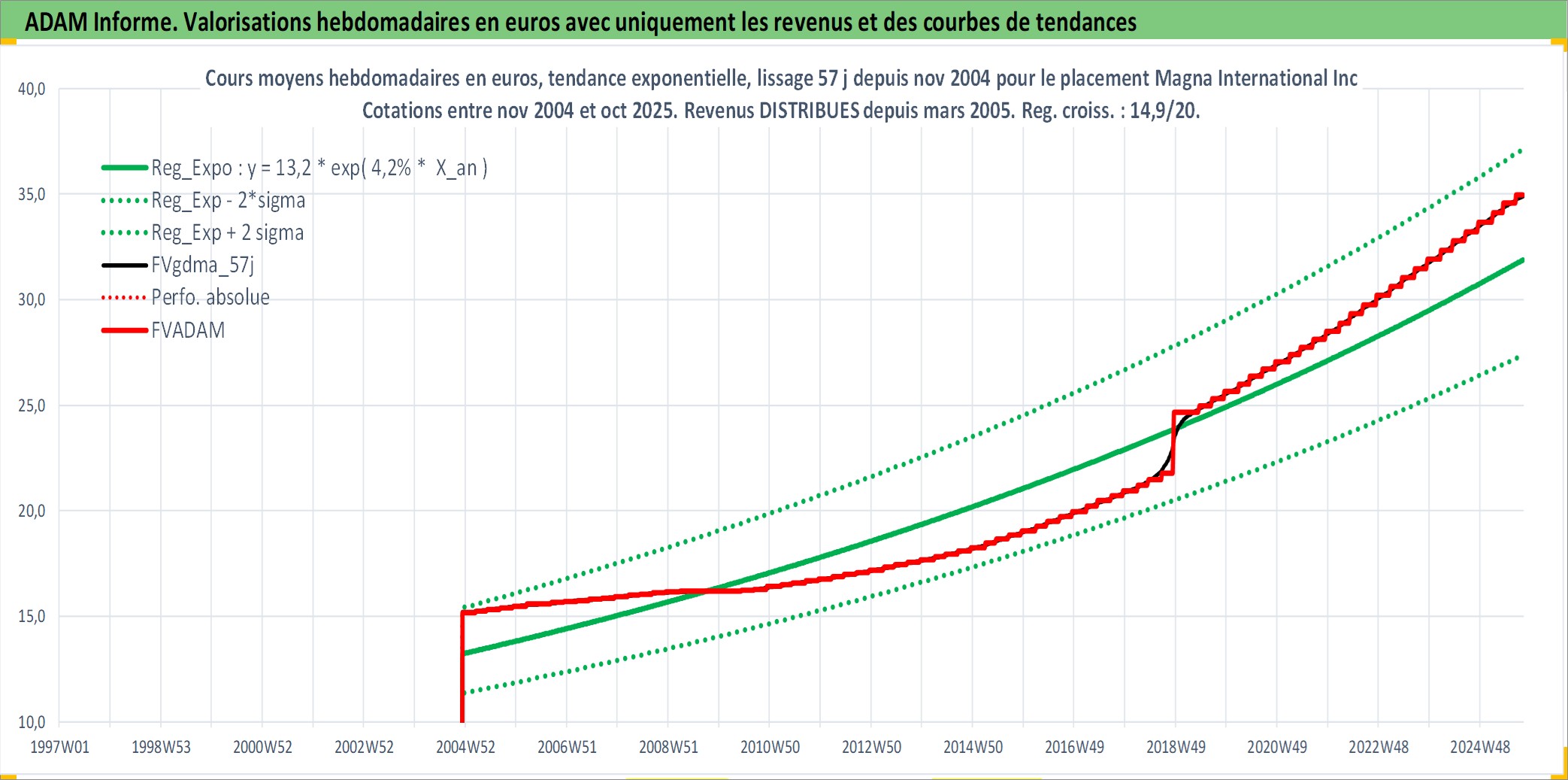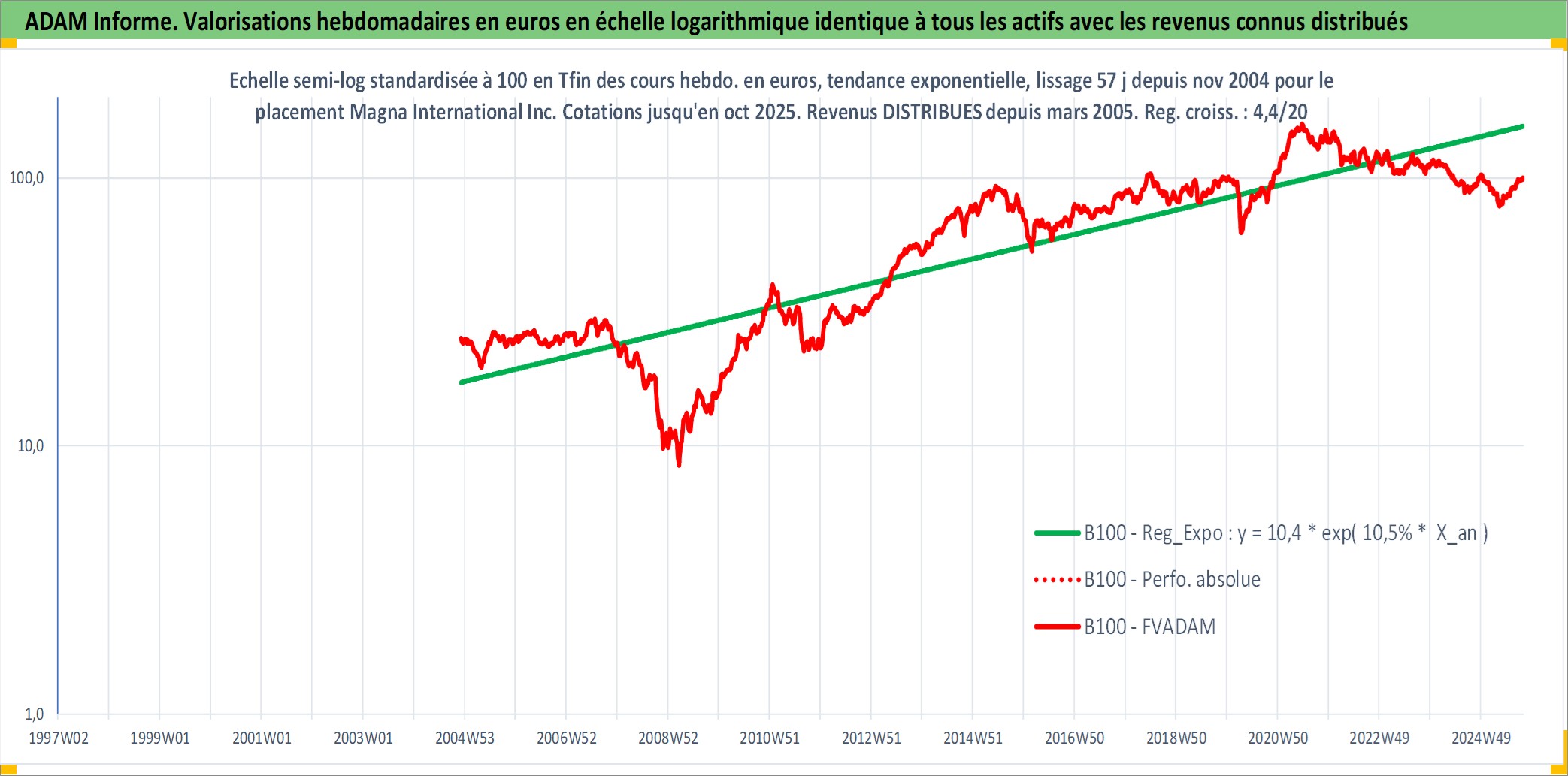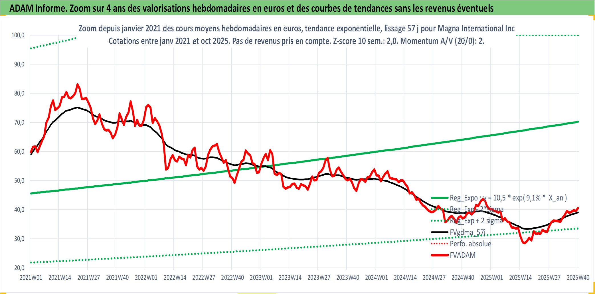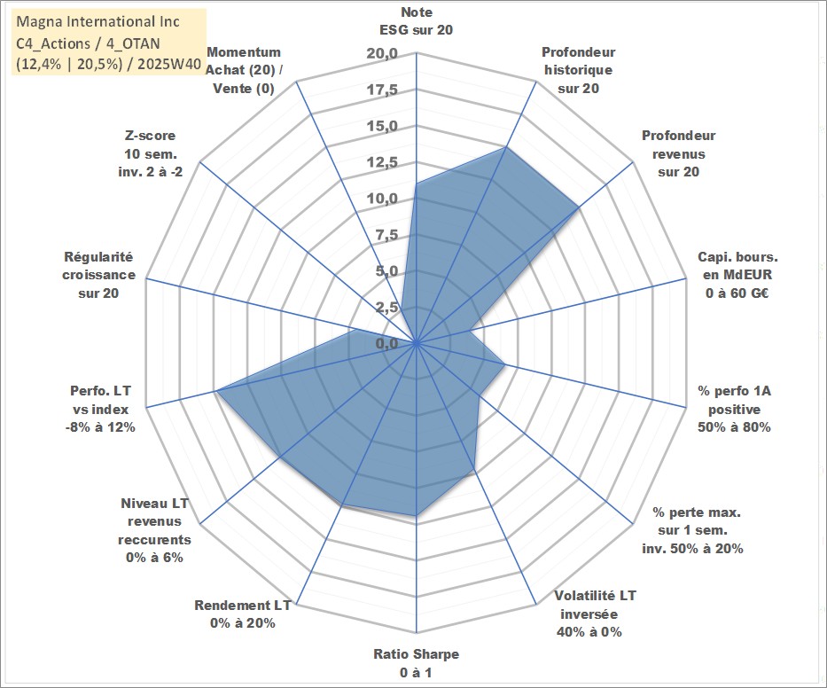 Site dédié aux investisseursPage dédiée sur site financeAnalyse des valorisations hebdomadaires de l'action Magna International Inc. Cet actif est cote en CAD. Les valorisations sont en contrevaleur EURO et couvrent les semaines 2004W49 a 2025W40. Les revenus de cet actif financier sont pris en compte depuis la semaine 2005W10. La note globale ESG de cet actif est estimee a 11.0 (apres rebasage entre 0 et 20).