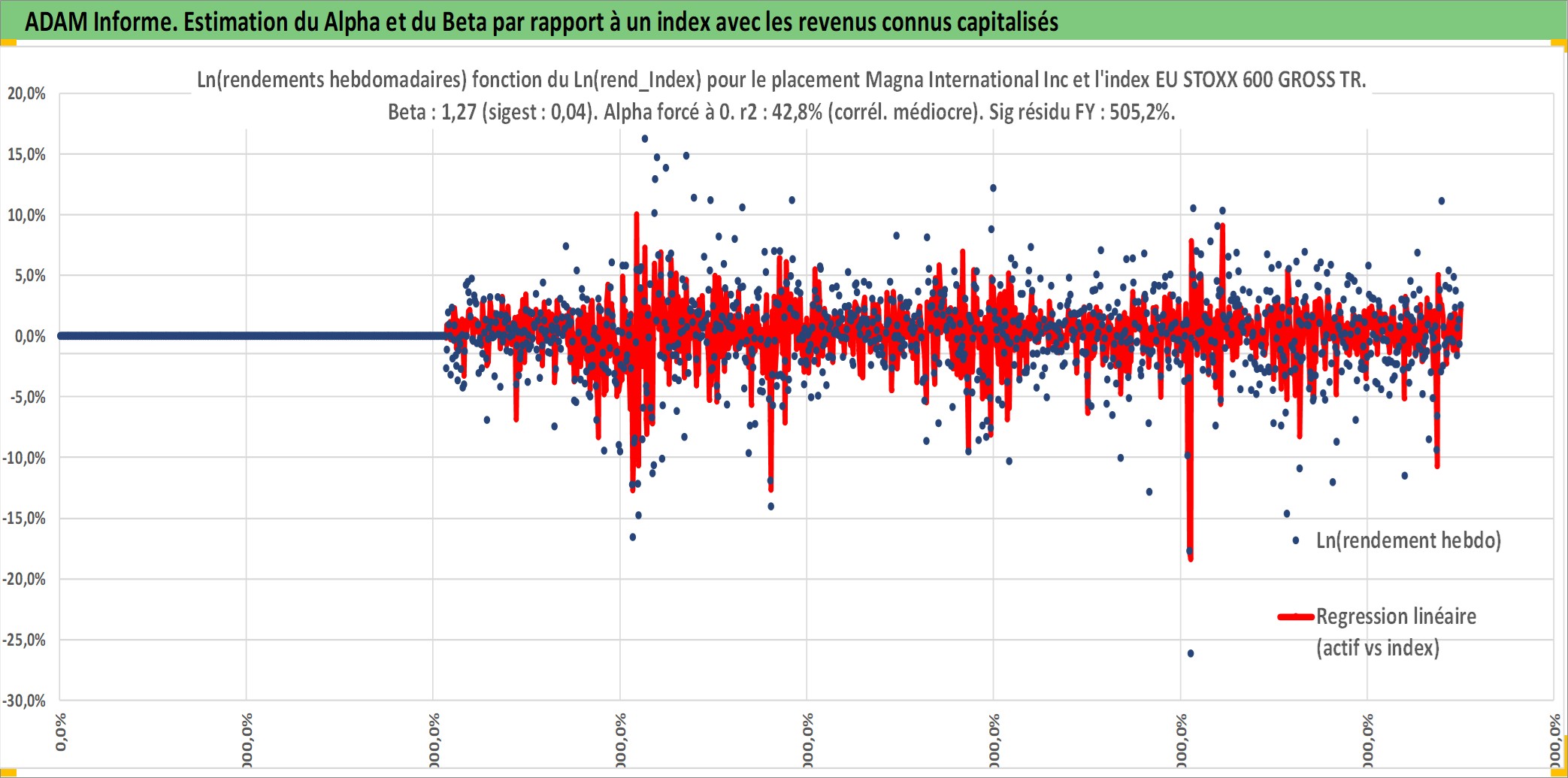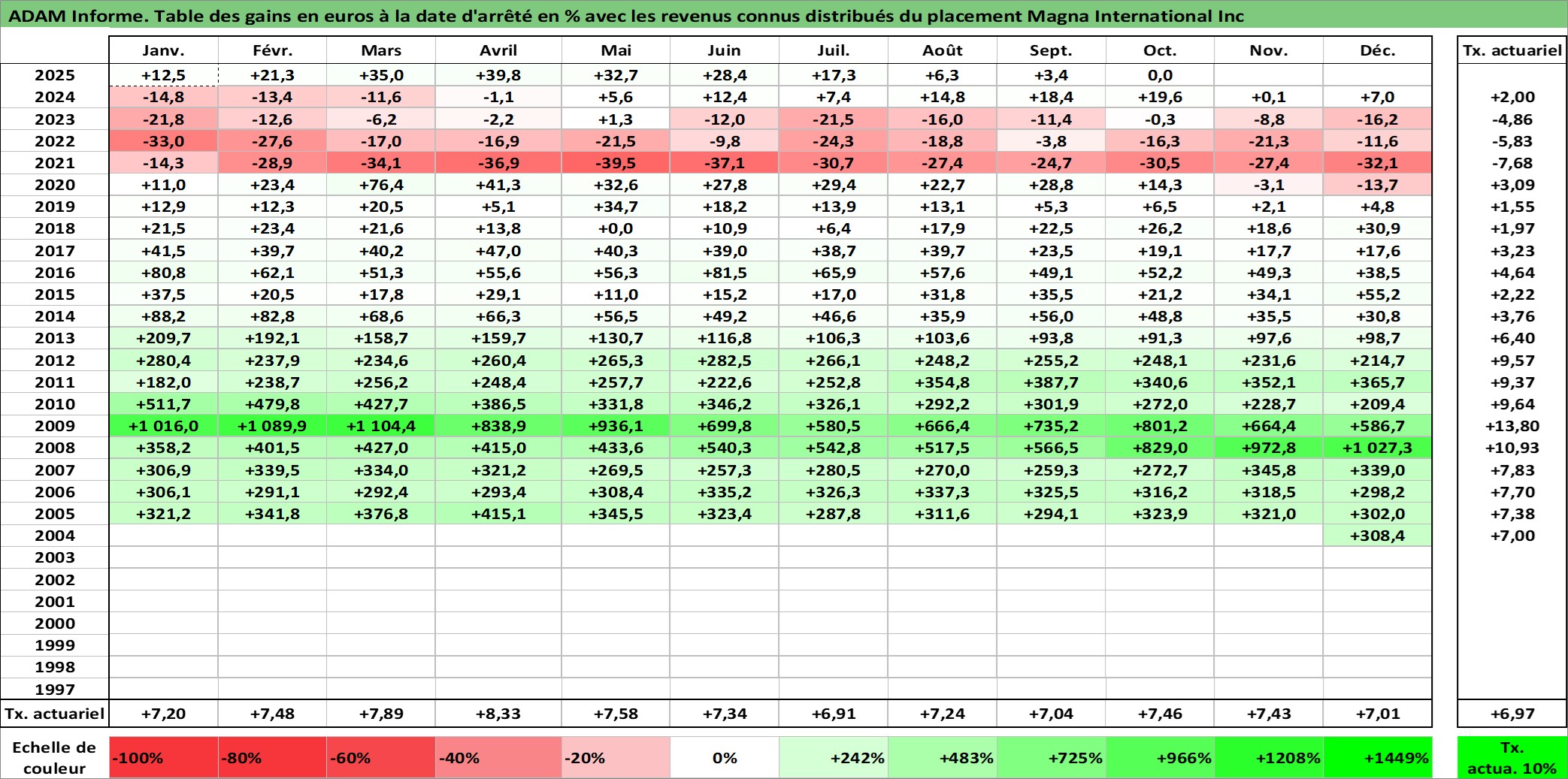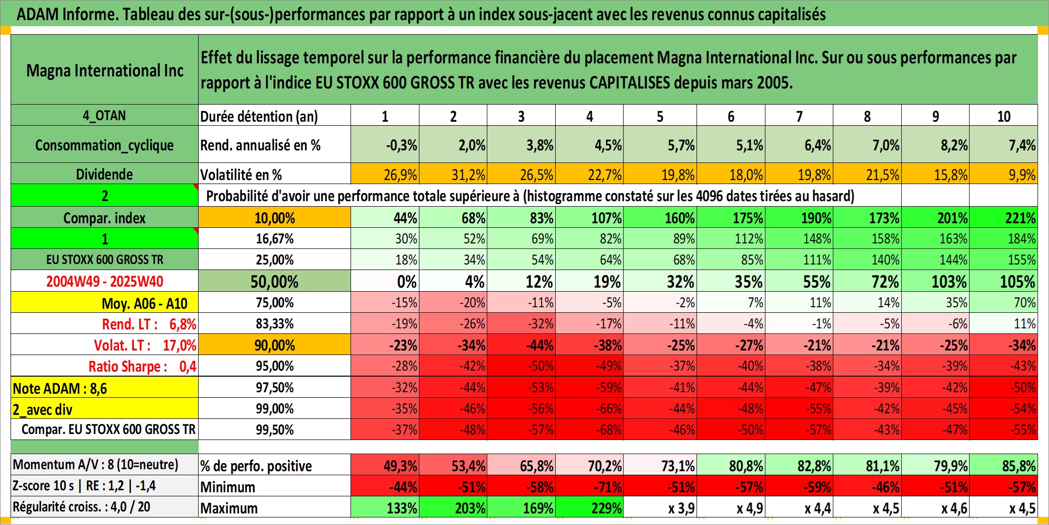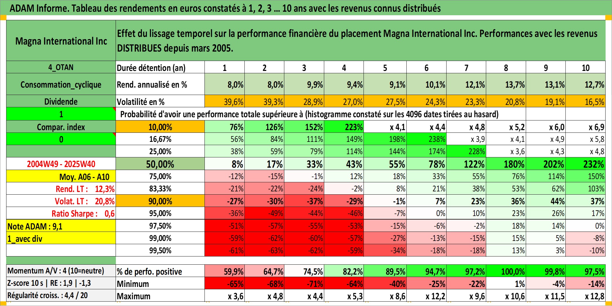Site dédié aux investisseursPage dédiée sur site financeAnalyse des valorisations hebdomadaires de l'action Magna International Inc. Cet actif est cote en CAD. Les valorisations sont en contrevaleur EURO et couvrent les semaines 2004W49 a 2025W40. Les revenus de cet actif financier sont pris en compte depuis la semaine 2005W10. La note globale ESG de cet actif est estimee a 11.0 (apres rebasage entre 0 et 20).