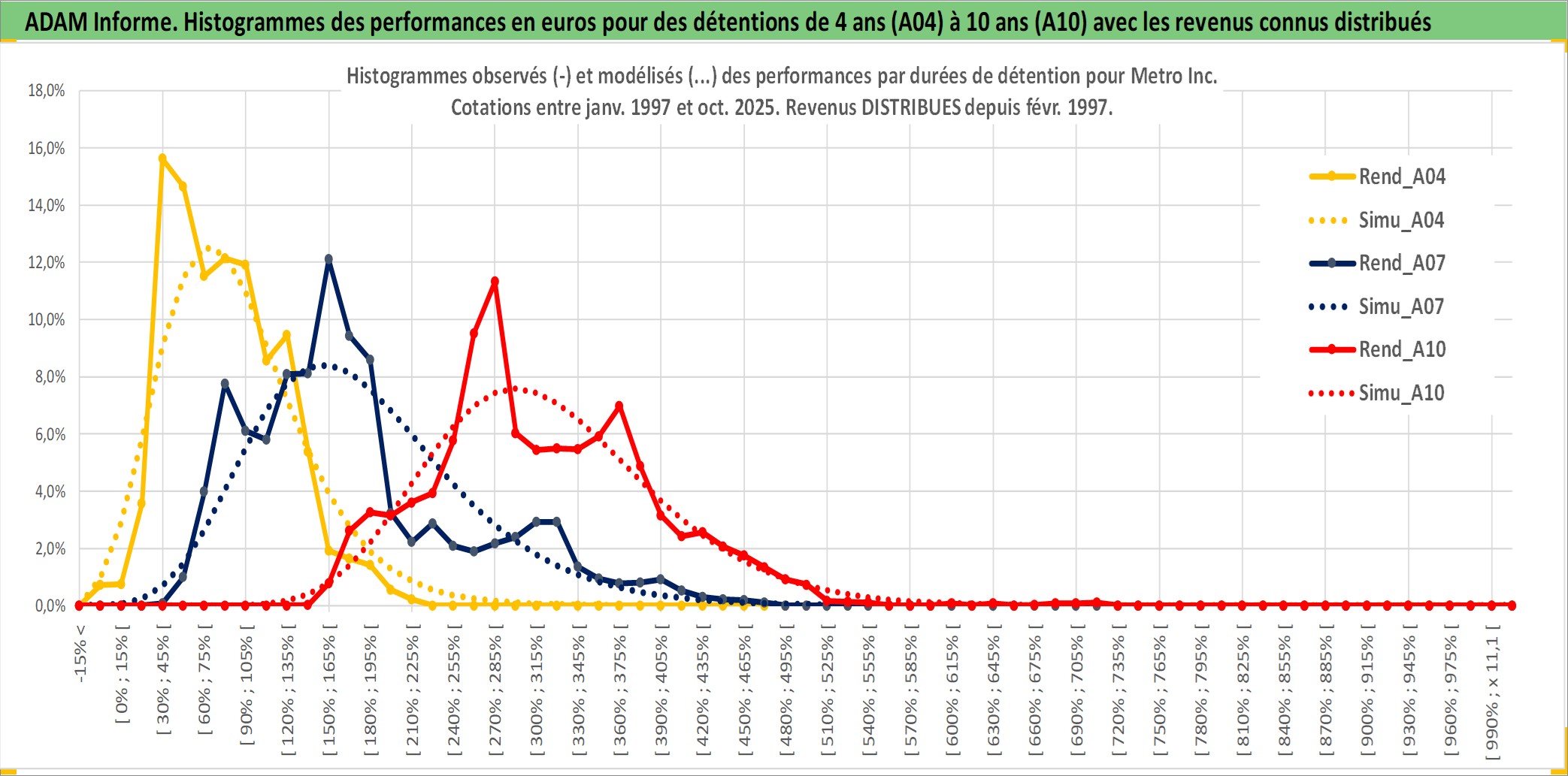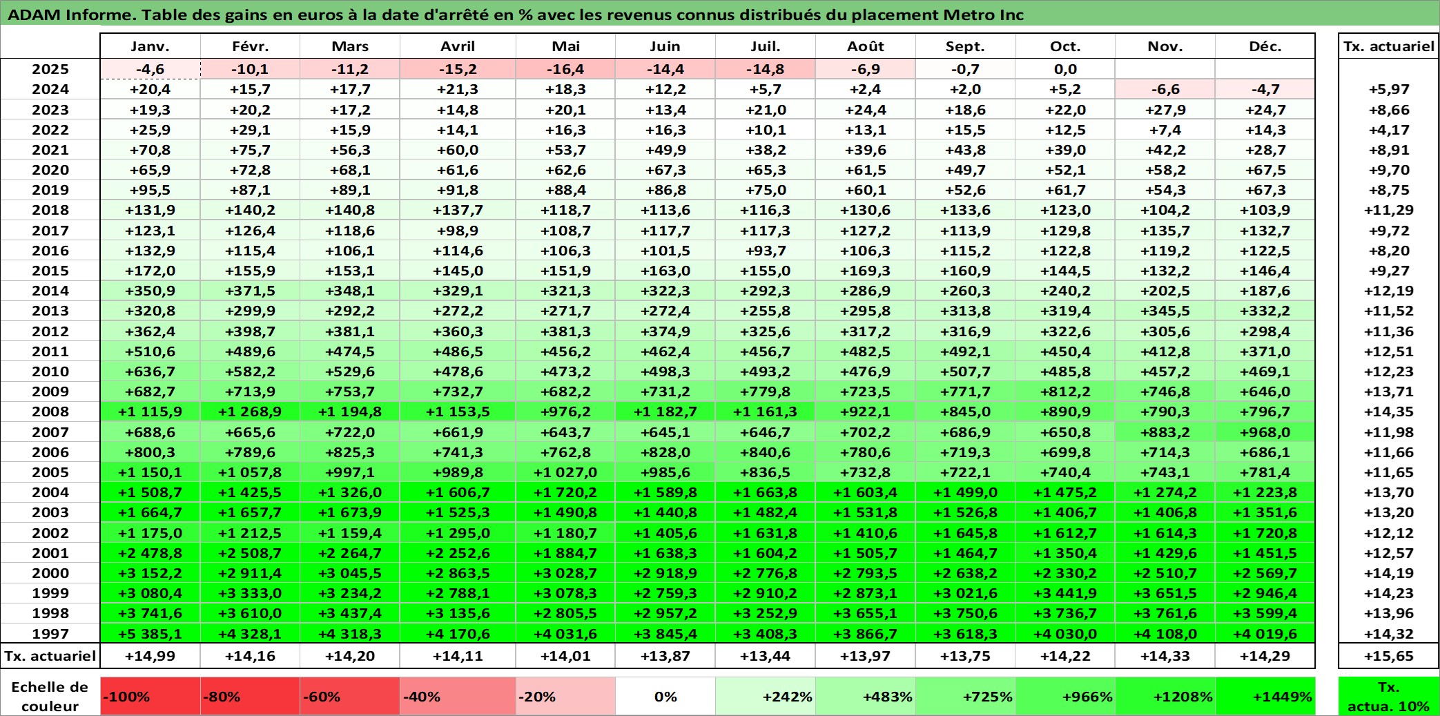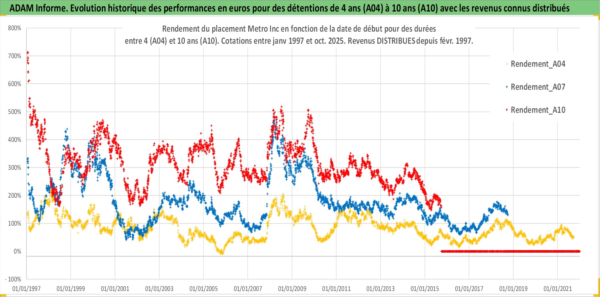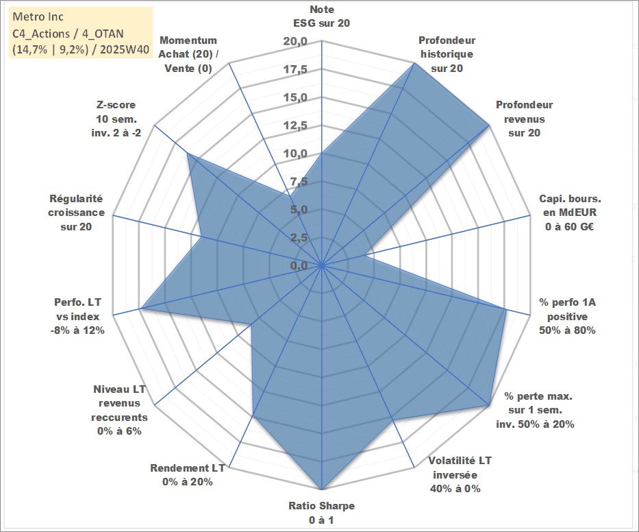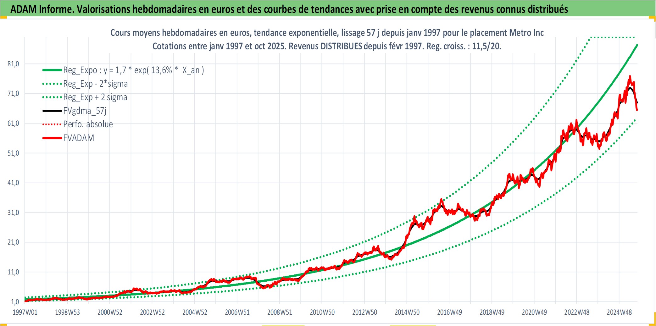 Site dédié aux investisseursPage dédiée sur site financeAnalyse des valorisations hebdomadaires de l'action Metro Inc. Cet actif est cote en CAD. Les valorisations sont en contrevaleur EURO et couvrent les semaines 1997W01 a 2025W40. Les revenus de cet actif financier sont pris en compte depuis la semaine 1997W06. La note globale ESG de cet actif est estimee a 10.0 (apres rebasage entre 0 et 20).