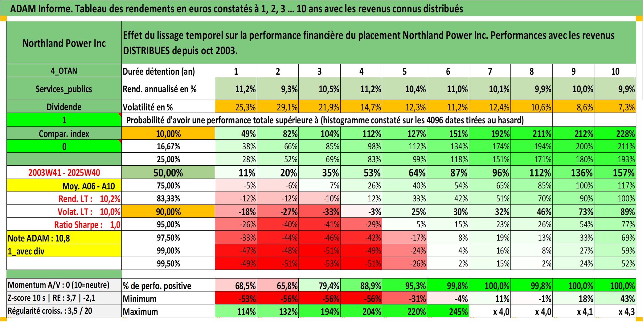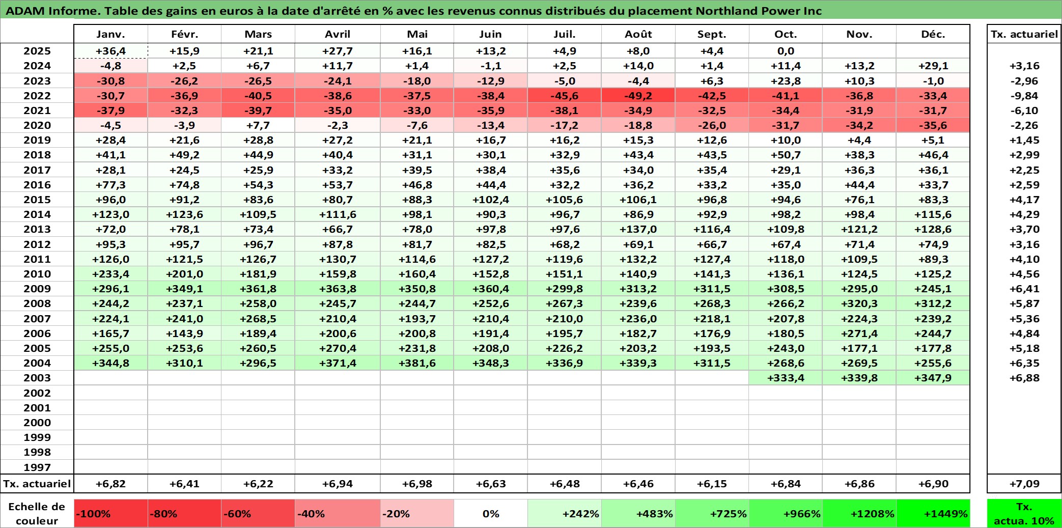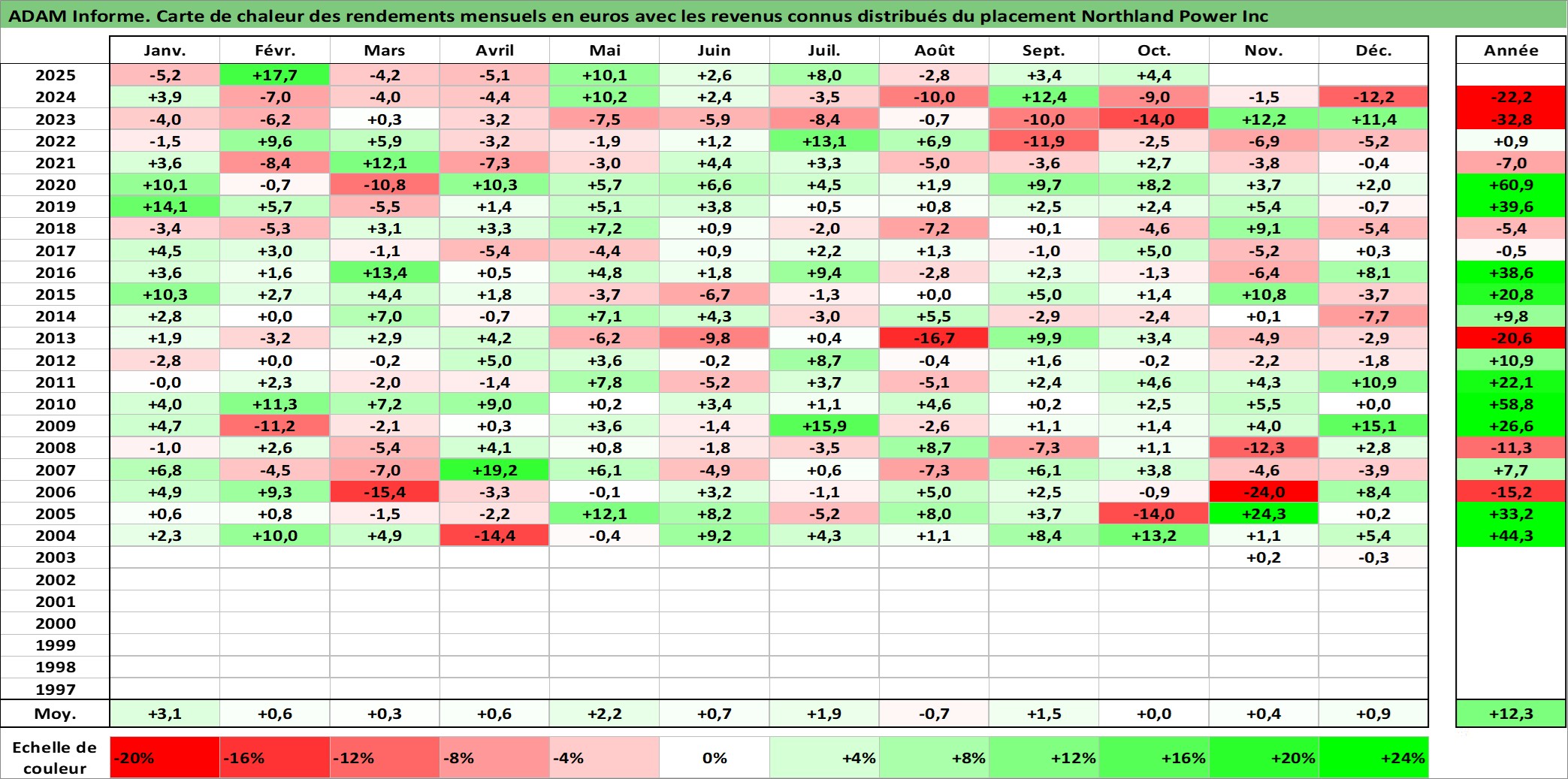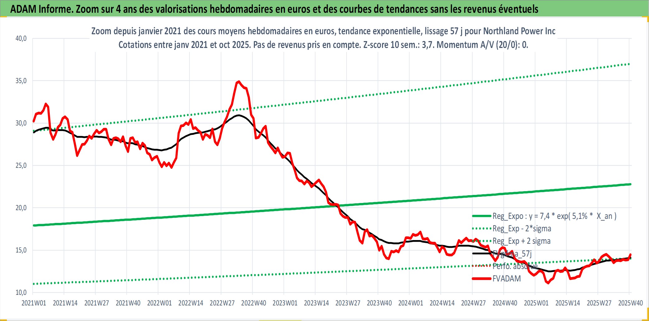 Site dédié aux investisseursPage dédiée sur site financeAnalyse des valorisations hebdomadaires de l'action Northland Power Inc. Cet actif est cote en CAD. Les valorisations sont en contrevaleur EURO et couvrent les semaines 2003W41 a 2025W40. Les revenus de cet actif financier sont pris en compte depuis la semaine 2003W44. La note ESG de cet actif n'est pas connue.