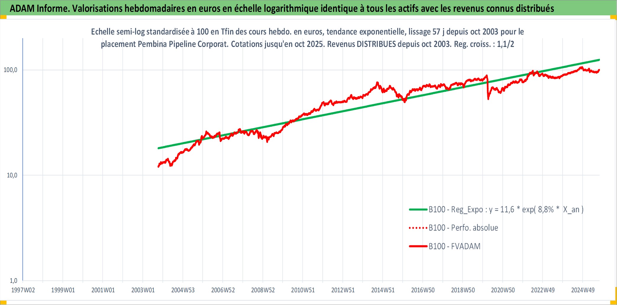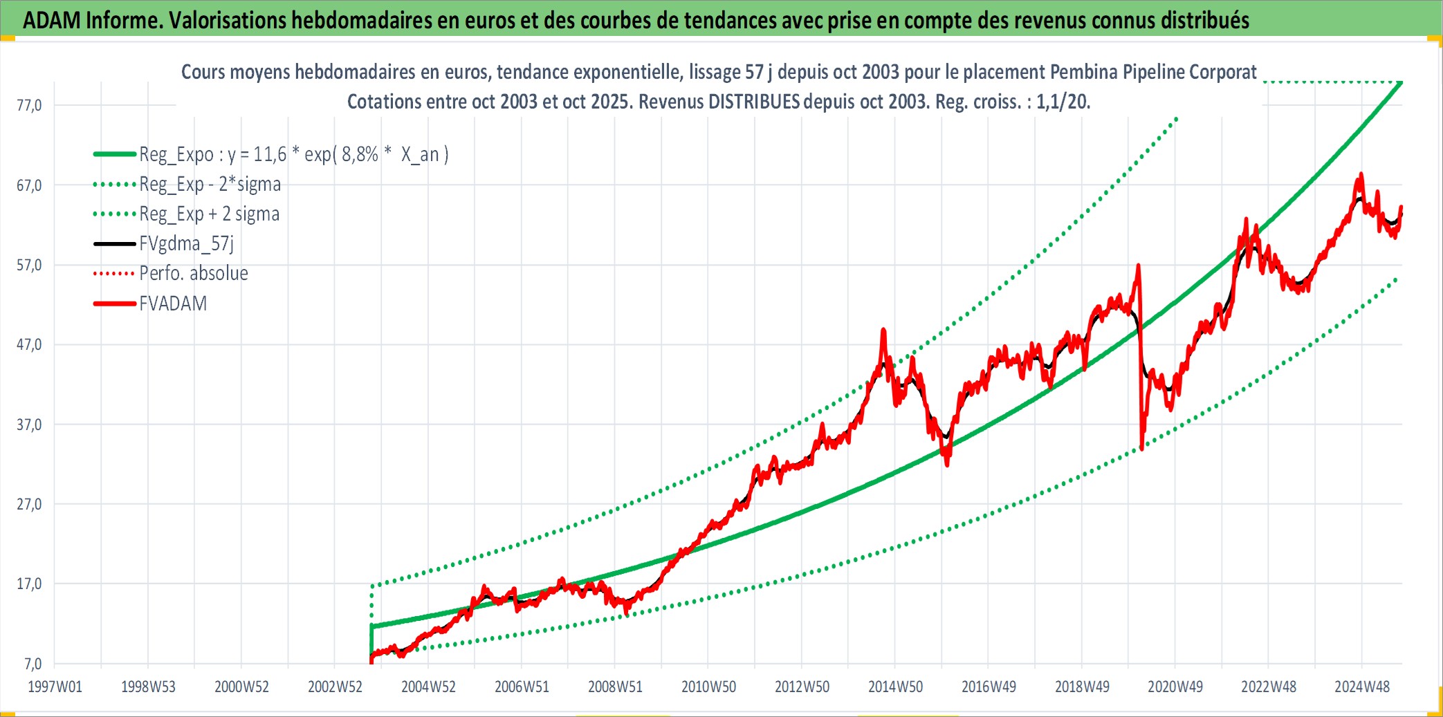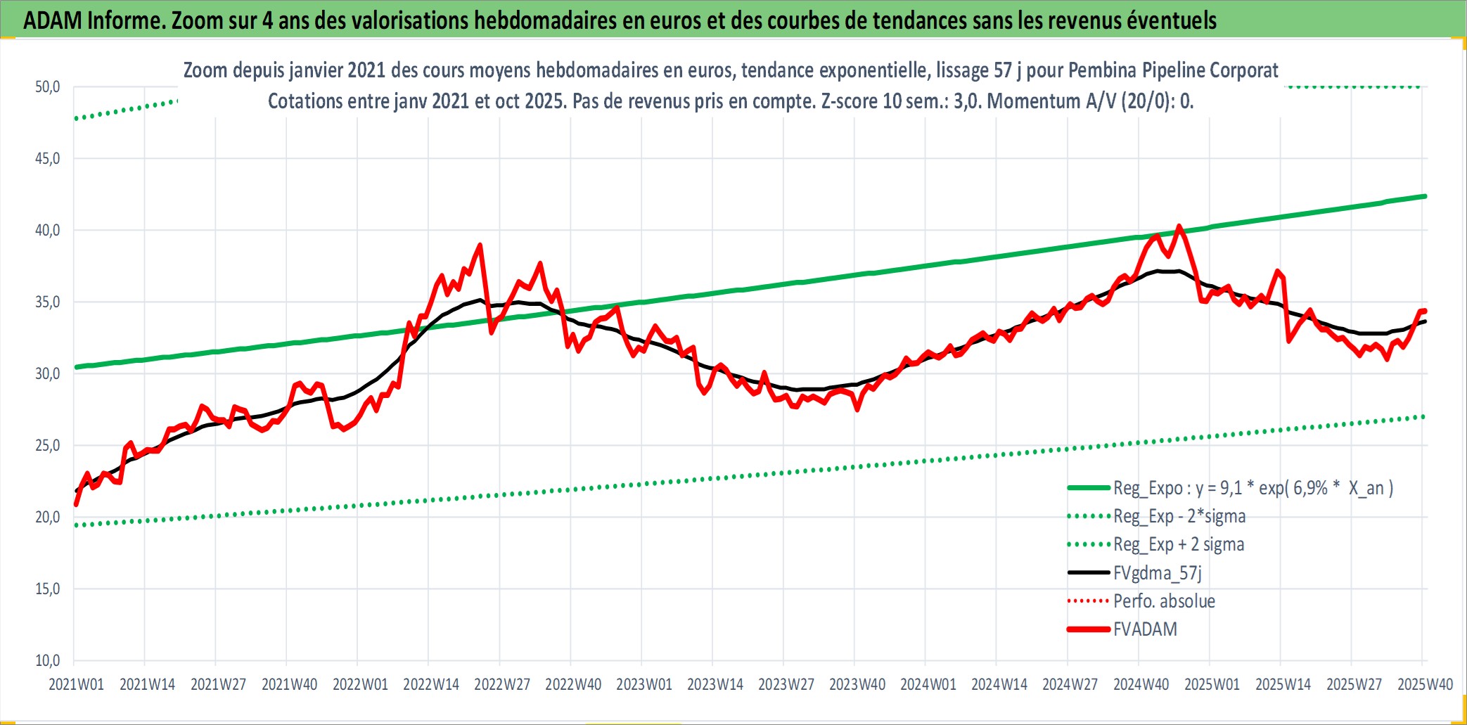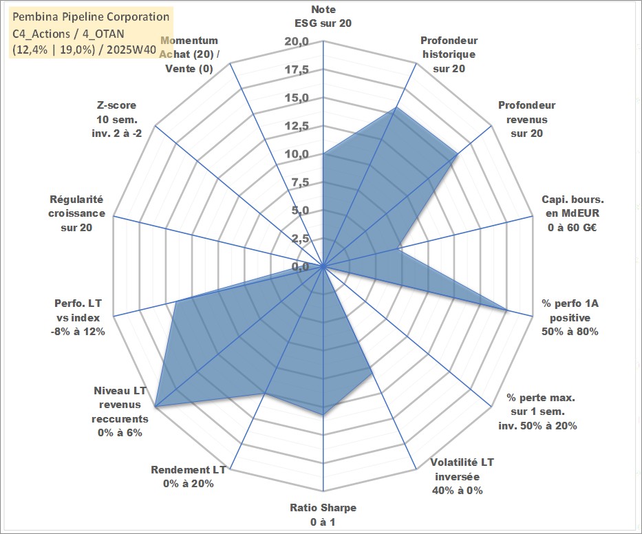 Site dédié aux investisseursPage dédiée sur site financeAnalyse des valorisations hebdomadaires de l'action Pembina Pipeline Corporation. Cet actif est cote en CAD. Les valorisations sont en contrevaleur EURO et couvrent les semaines 2003W41 a 2025W40. Les revenus de cet actif financier sont pris en compte depuis la semaine 2003W44. La note globale ESG de cet actif est estimee a 10.0 (apres rebasage entre 0 et 20).