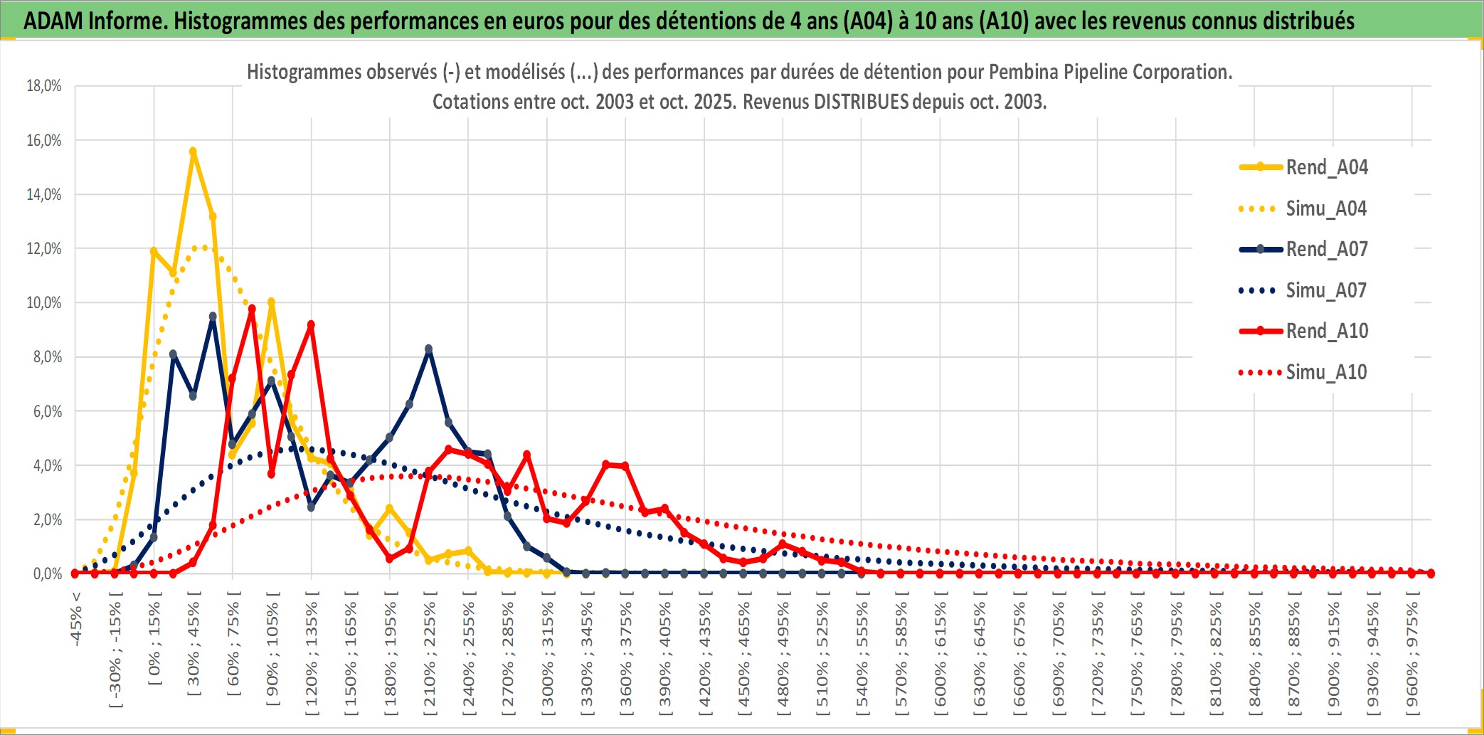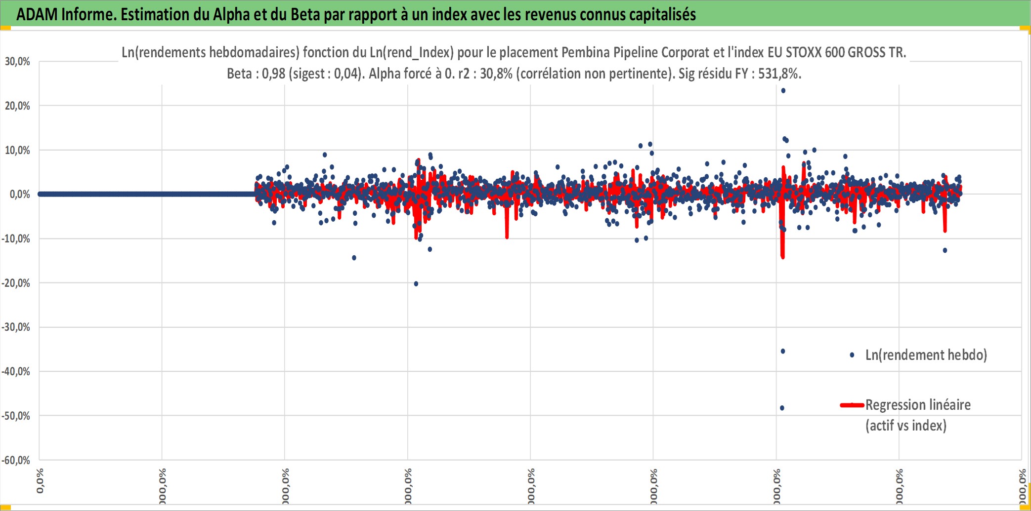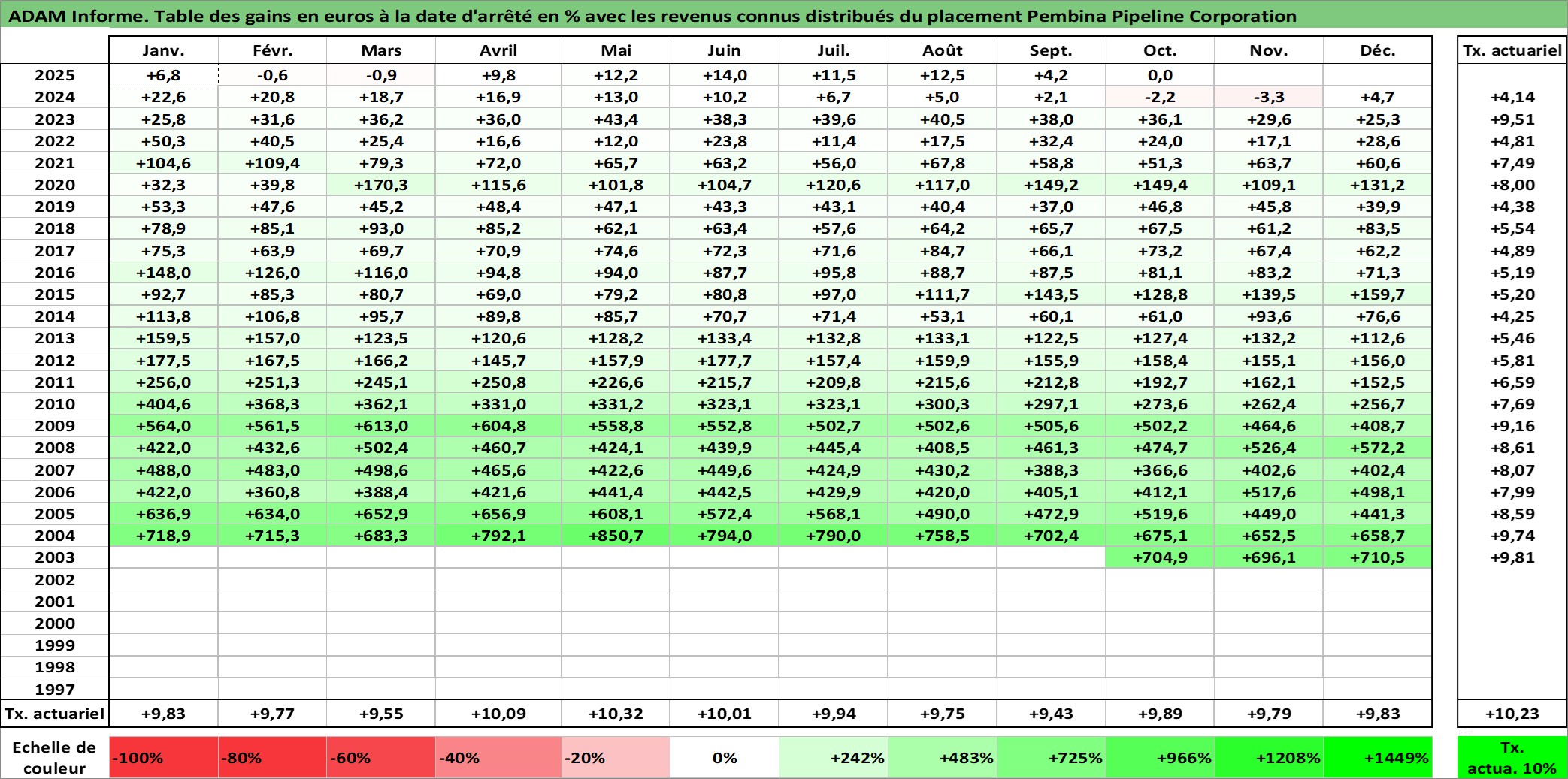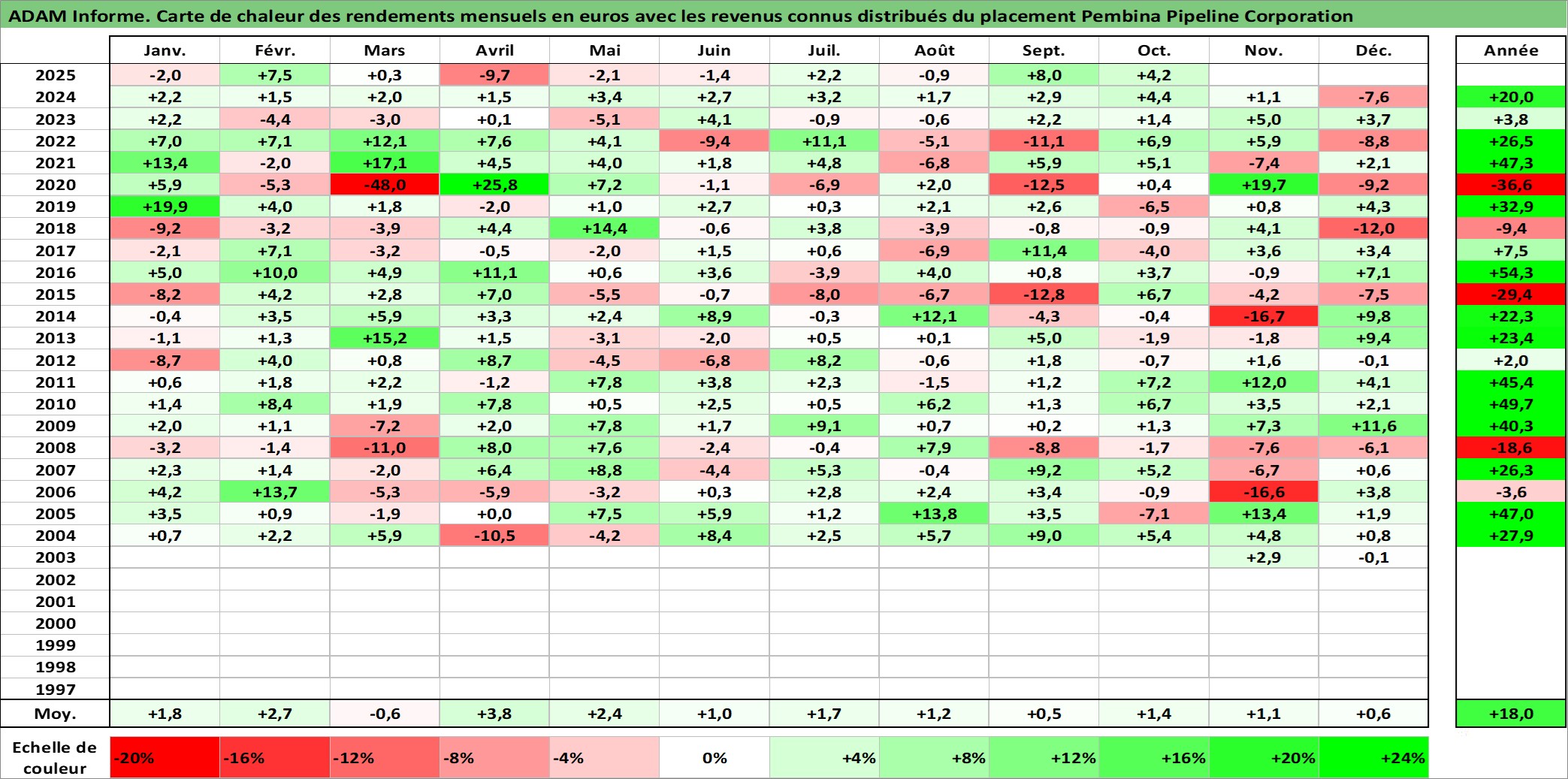 Site dédié aux investisseursPage dédiée sur site financeAnalyse des valorisations hebdomadaires de l'action Pembina Pipeline Corporation. Cet actif est cote en CAD. Les valorisations sont en contrevaleur EURO et couvrent les semaines 2003W41 a 2025W40. Les revenus de cet actif financier sont pris en compte depuis la semaine 2003W44. La note globale ESG de cet actif est estimee a 10.0 (apres rebasage entre 0 et 20).