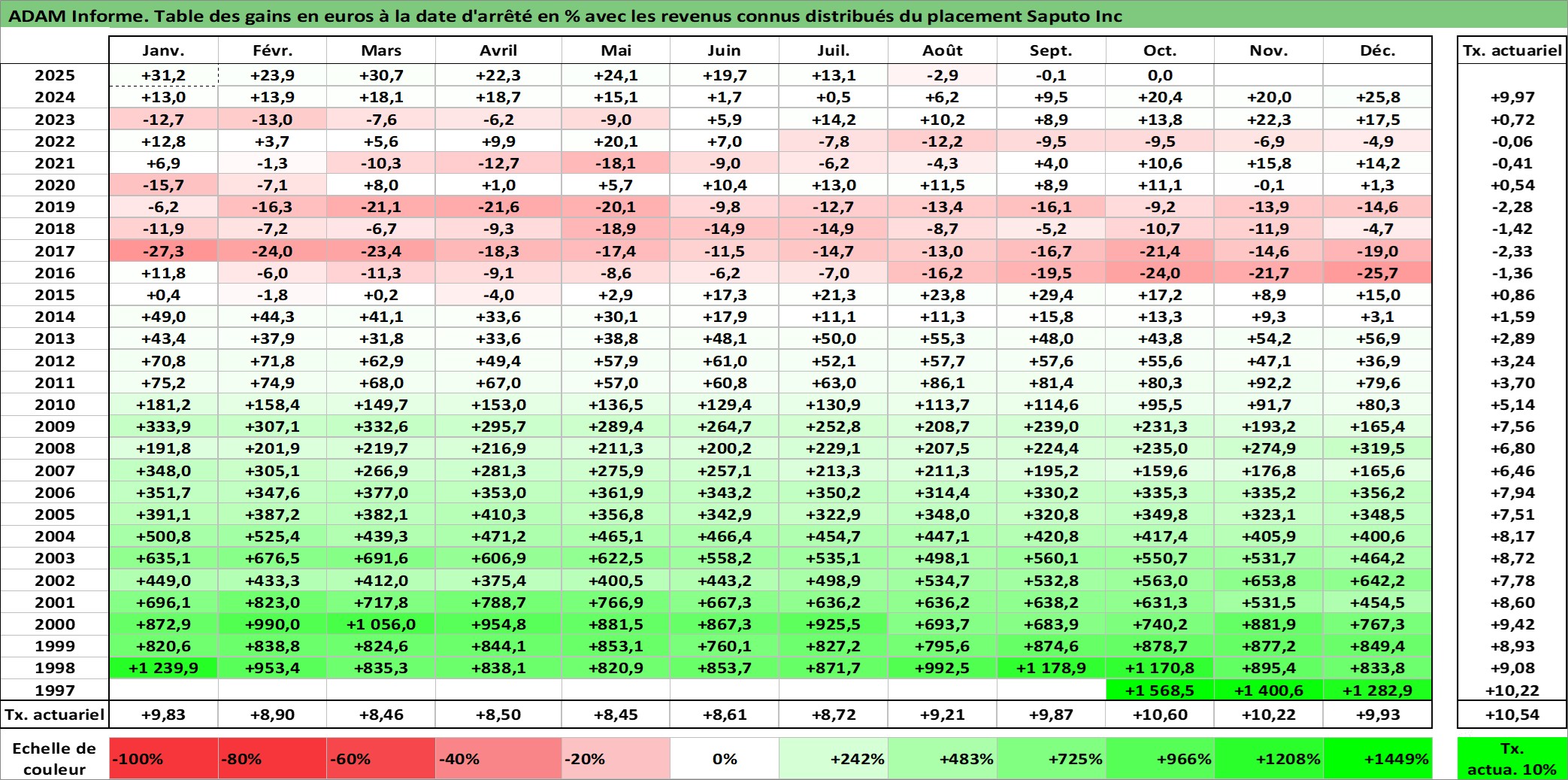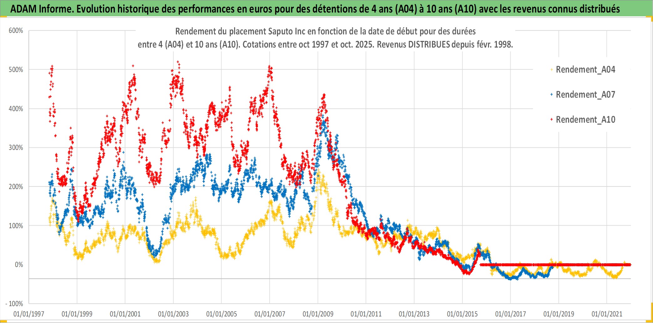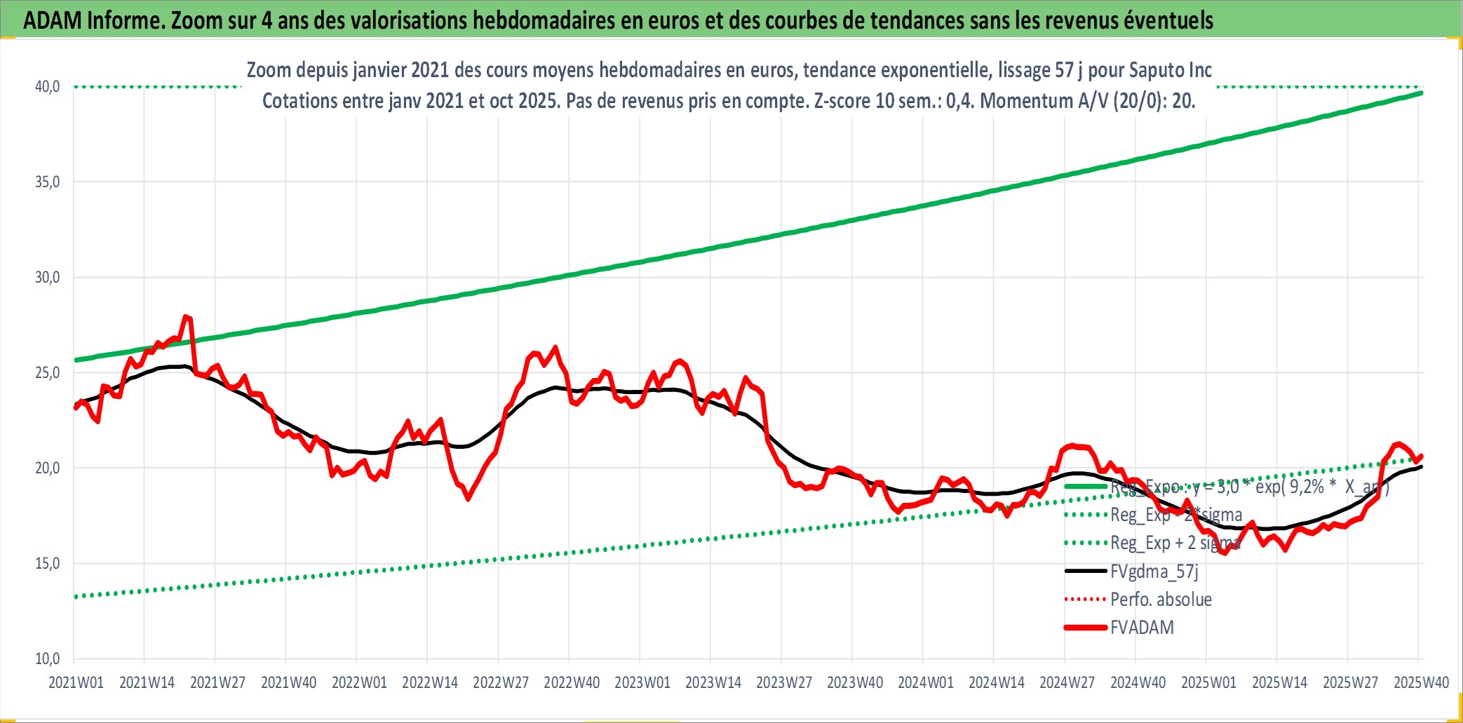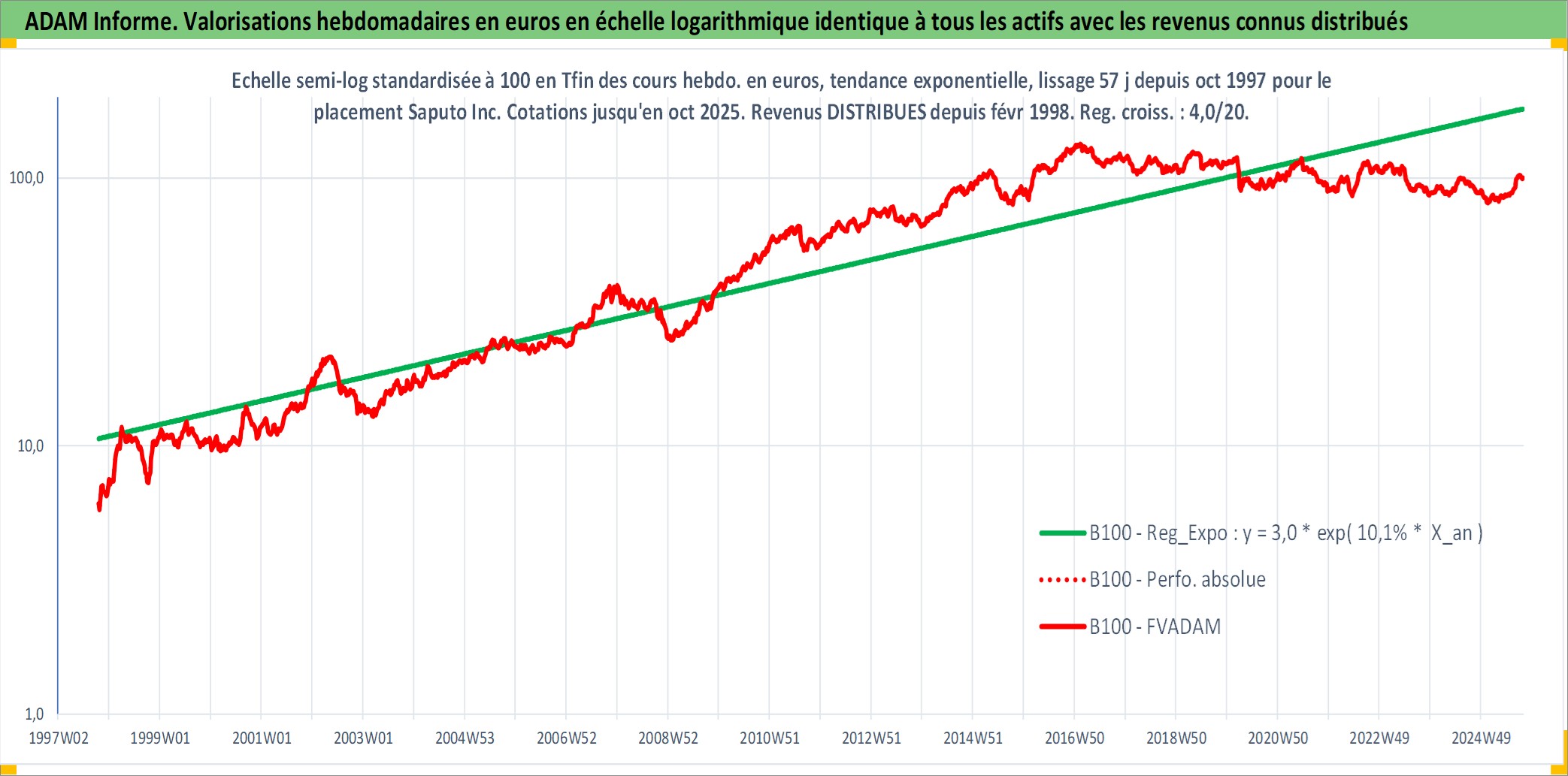 Site dédié aux investisseursPage dédiée sur site financeAnalyse des valorisations hebdomadaires de l'action Saputo Inc. Cet actif est cote en CAD. Les valorisations sont en contrevaleur EURO et couvrent les semaines 1997W43 a 2025W40. Les revenus de cet actif financier sont pris en compte depuis la semaine 1998W08. La note globale ESG de cet actif est estimee a 5.0 (apres rebasage entre 0 et 20).