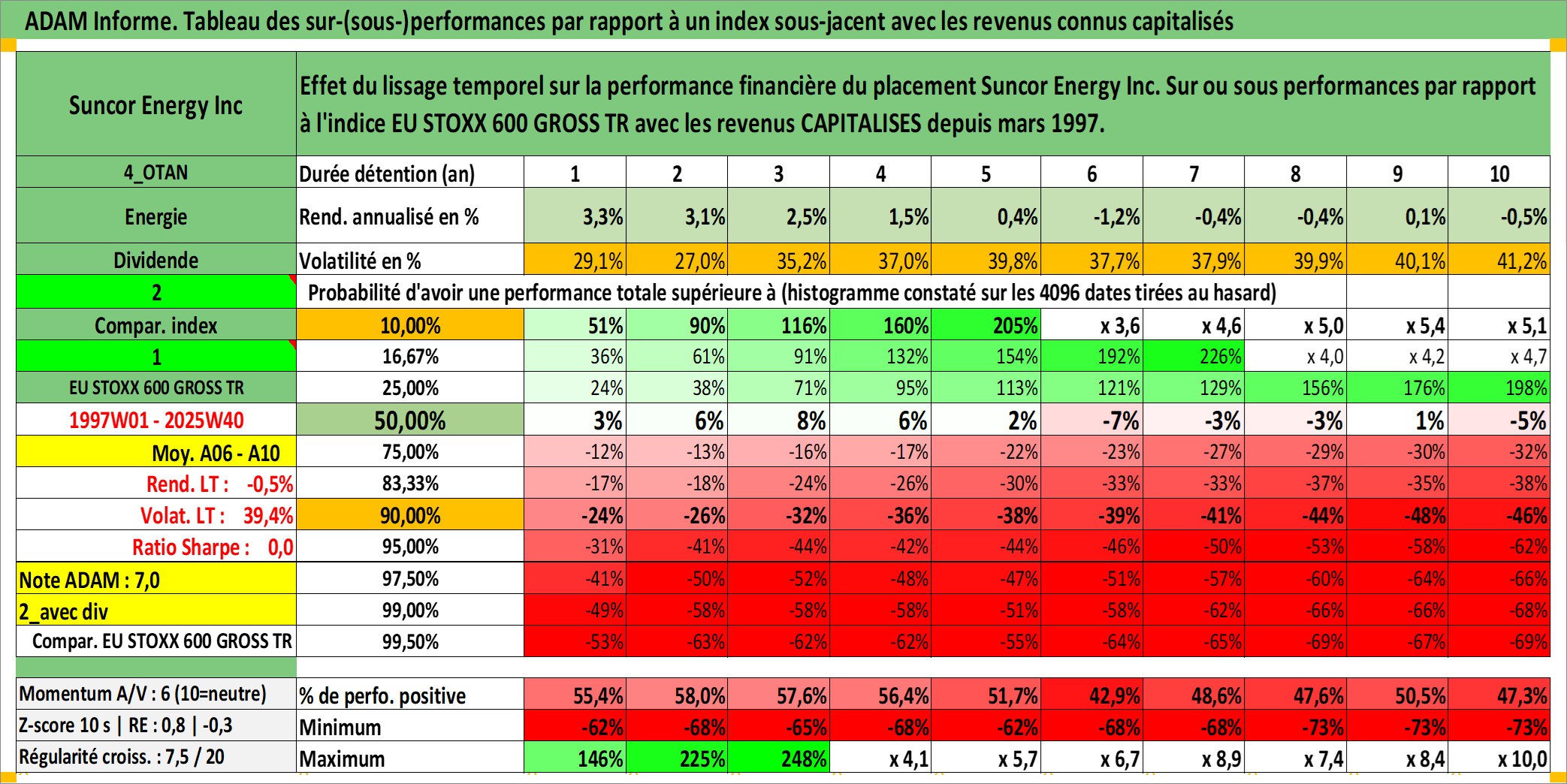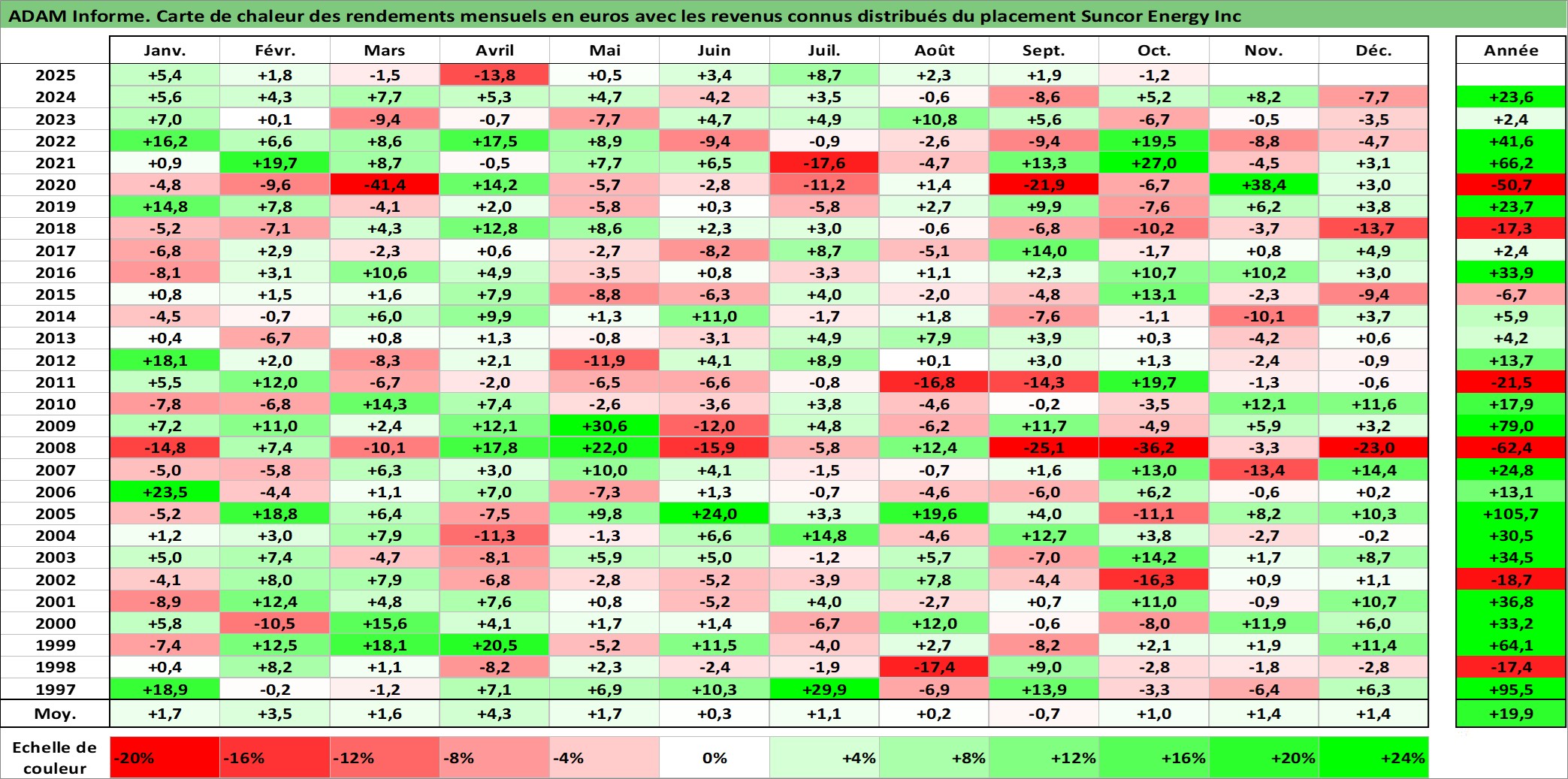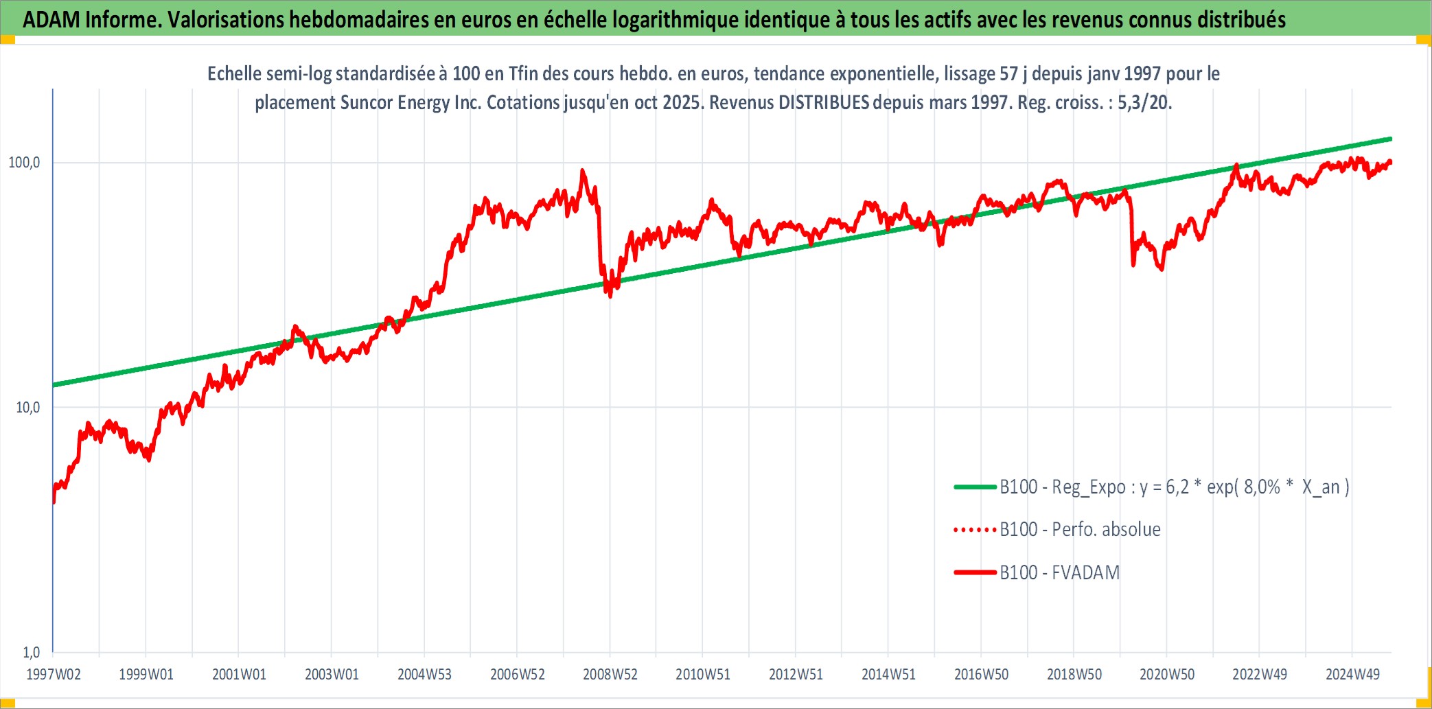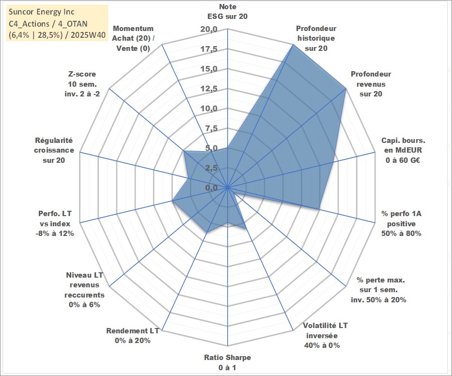 Site dédié aux investisseursPage dédiée sur site financeAnalyse des valorisations hebdomadaires de l'action Suncor Energy Inc. Cet actif est cote en CAD. Les valorisations sont en contrevaleur EURO et couvrent les semaines 1997W01 a 2025W40. Les revenus de cet actif financier sont pris en compte depuis la semaine 1997W11. La note globale ESG de cet actif est estimee a 5.0 (apres rebasage entre 0 et 20).