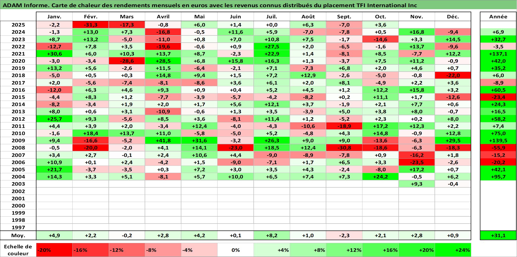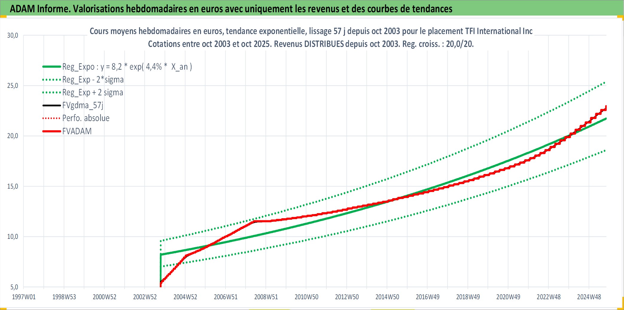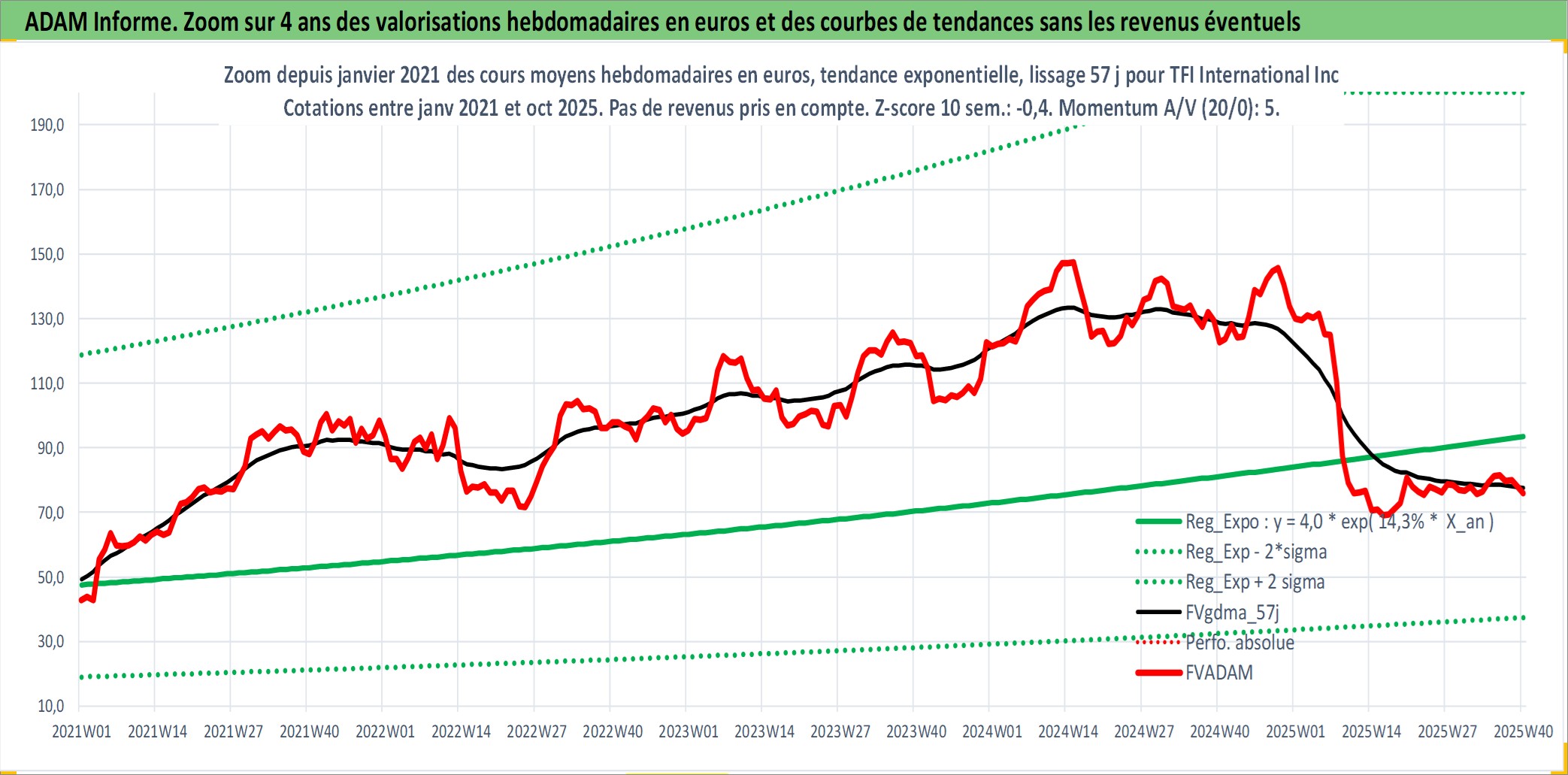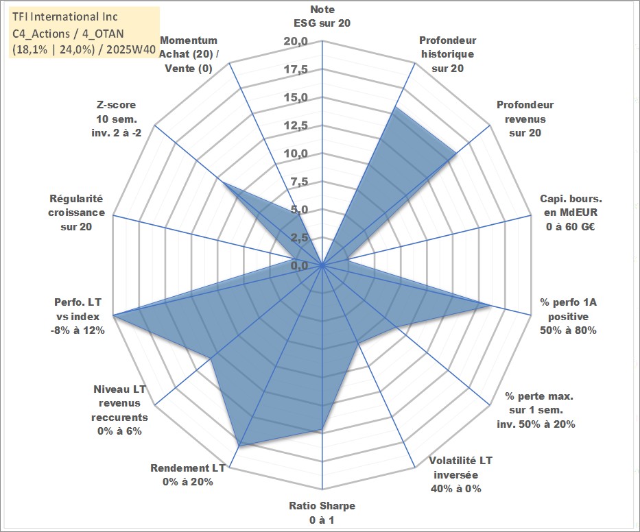 Site dédié aux investisseursPage dédiée sur site financeAnalyse des valorisations hebdomadaires de l'action TFI International Inc. Cet actif est cote en CAD. Les valorisations sont en contrevaleur EURO et couvrent les semaines 2003W41 a 2025W40. Les revenus de cet actif financier sont pris en compte depuis la semaine 2003W44. La note ESG de cet actif n'est pas connue.
