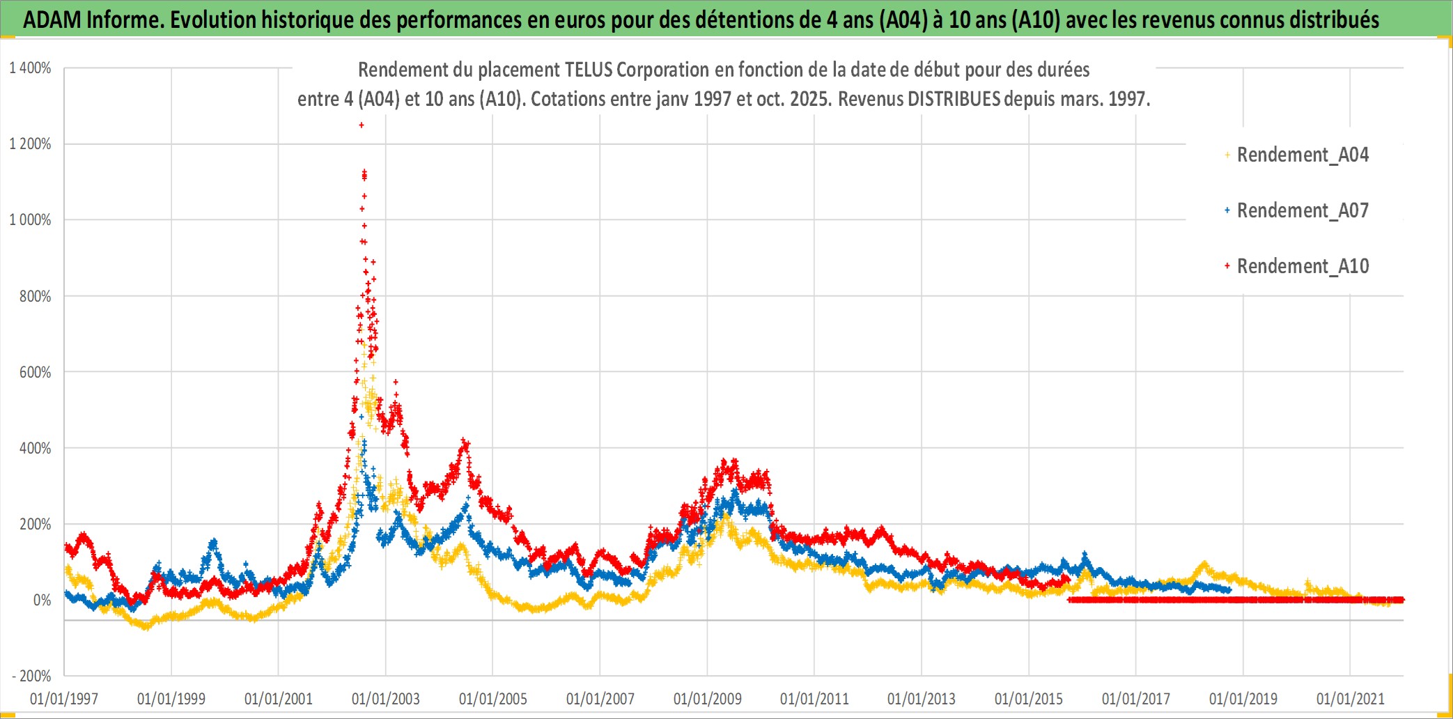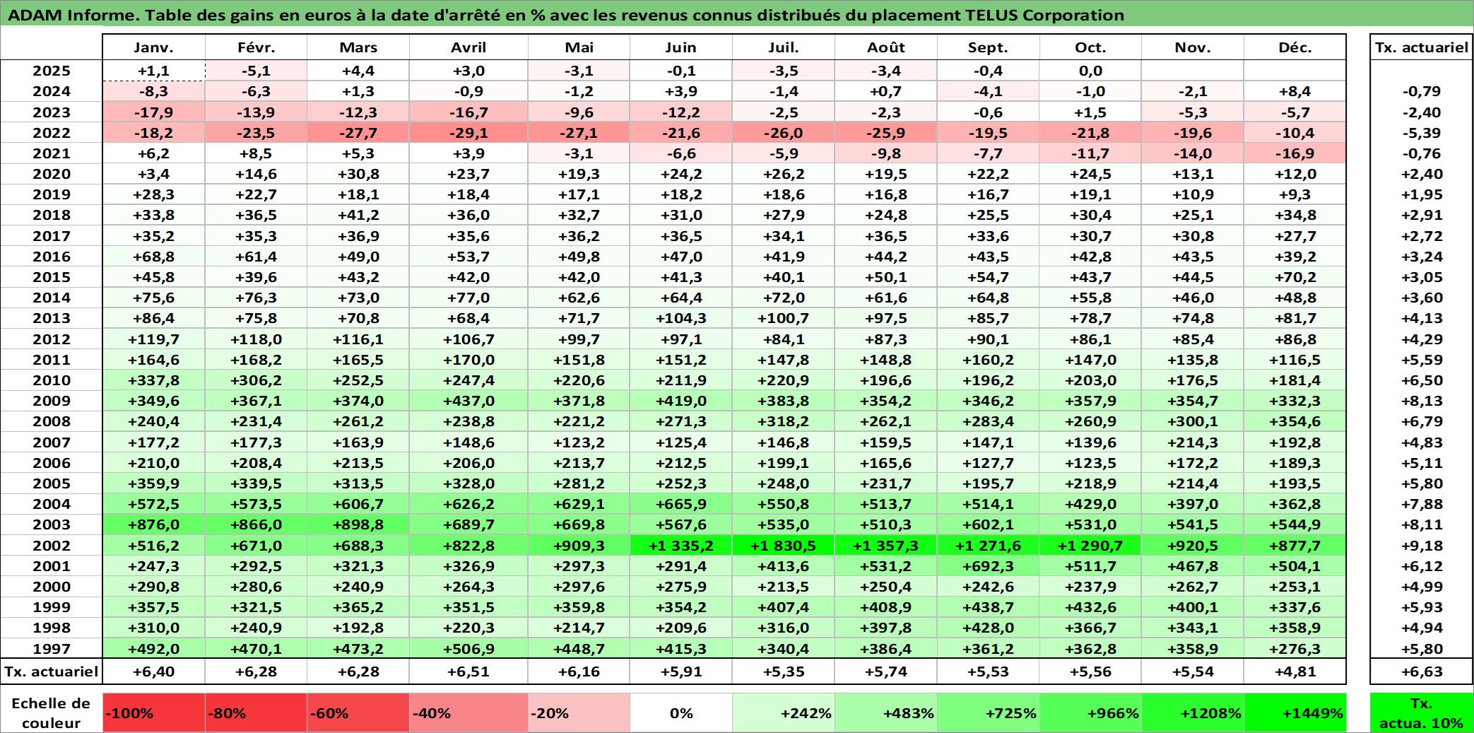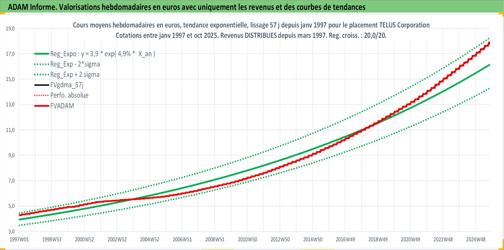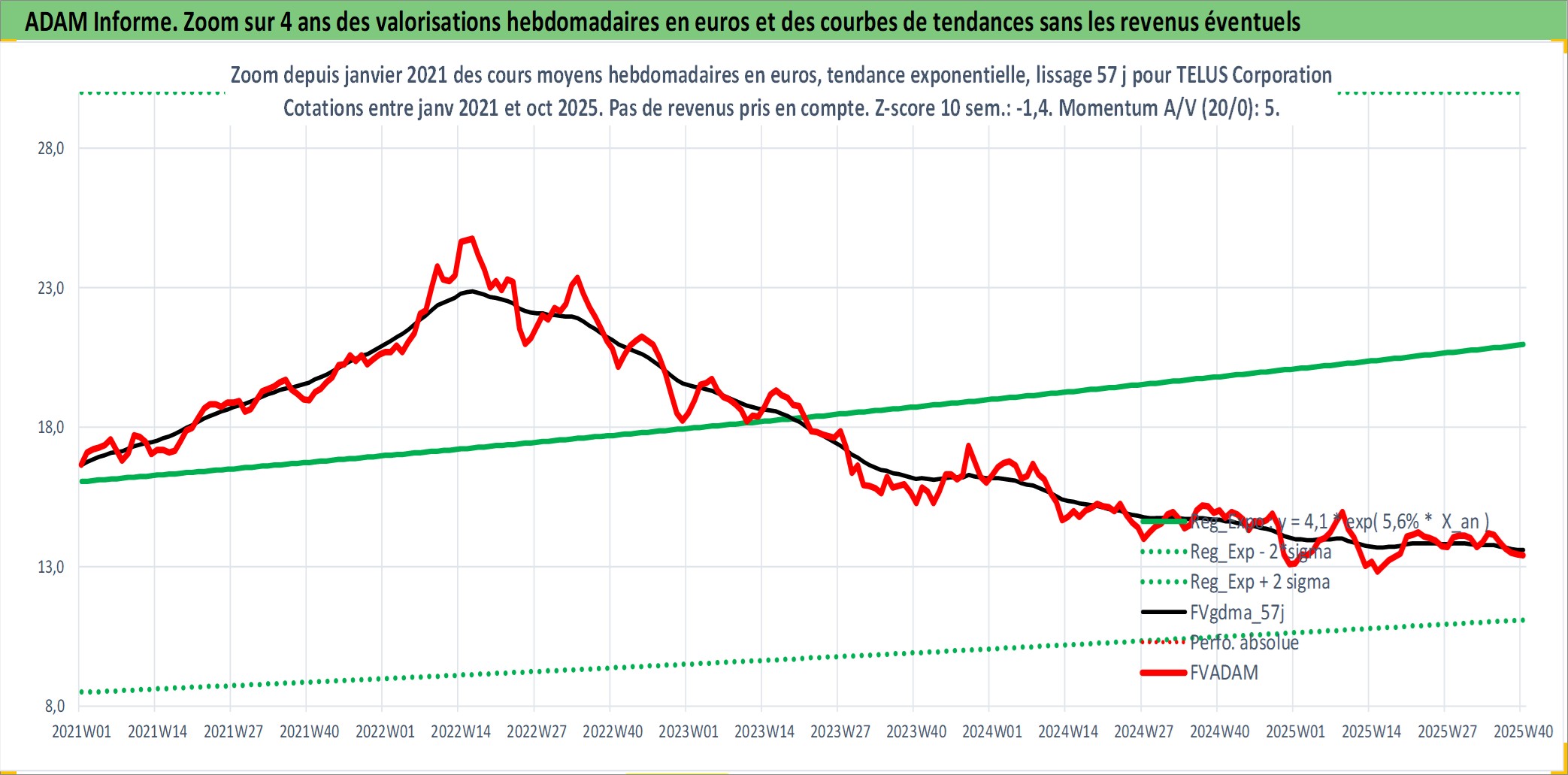 Site dédié aux investisseursPage dédiée sur site financeAnalyse des valorisations hebdomadaires de l'action TELUS Corporation. Cet actif est cote en CAD. Les valorisations sont en contrevaleur EURO et couvrent les semaines 1997W01 a 2025W40. Les revenus de cet actif financier sont pris en compte depuis la semaine 1997W10. La note globale ESG de cet actif est estimee a 12.0 (apres rebasage entre 0 et 20).