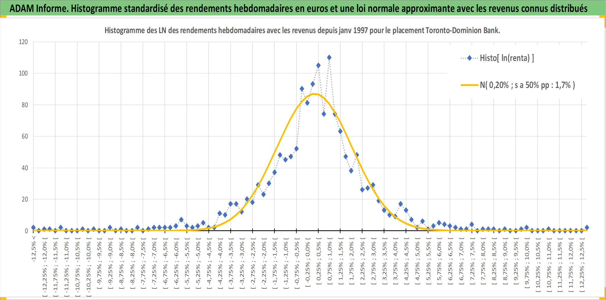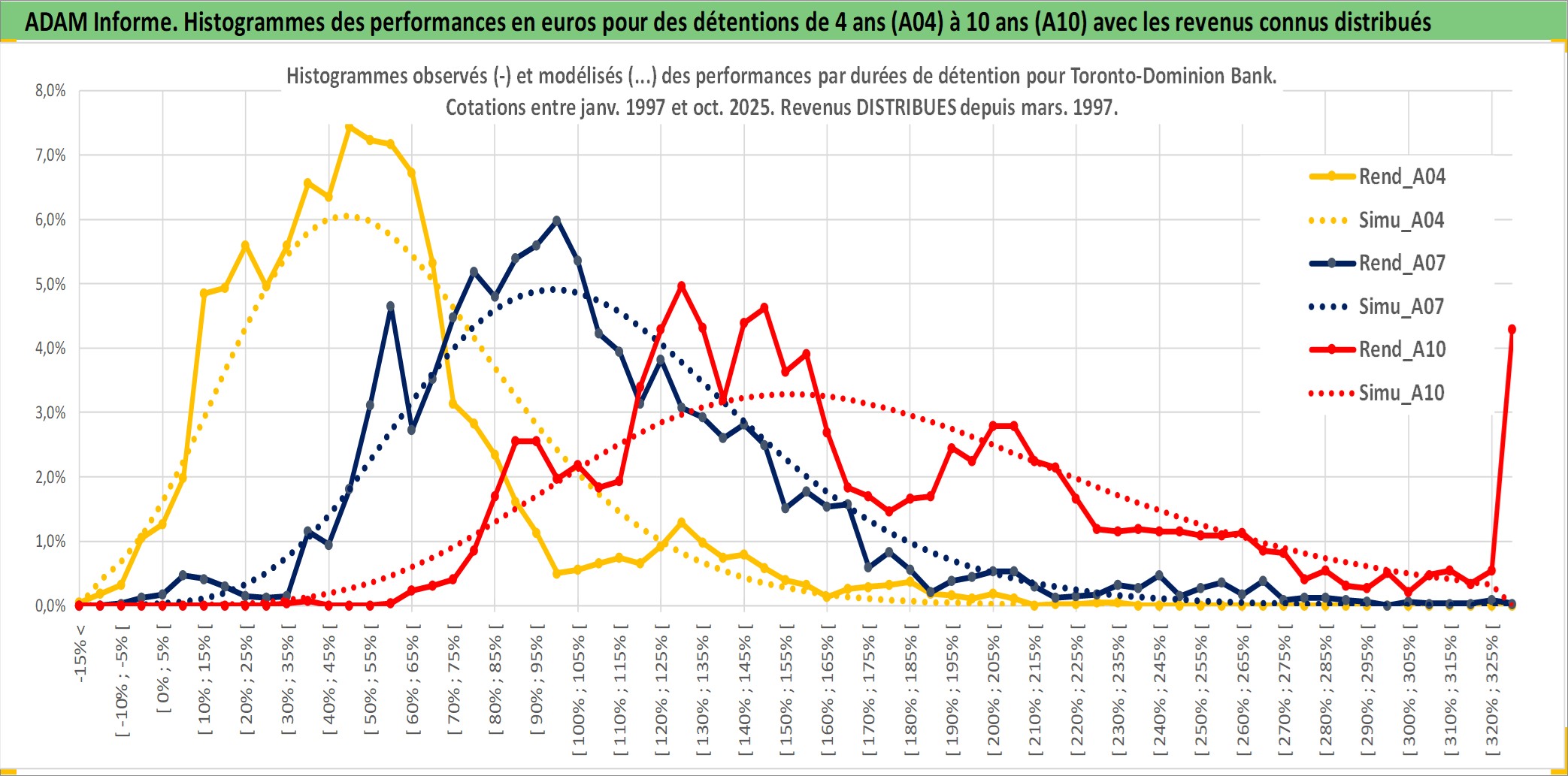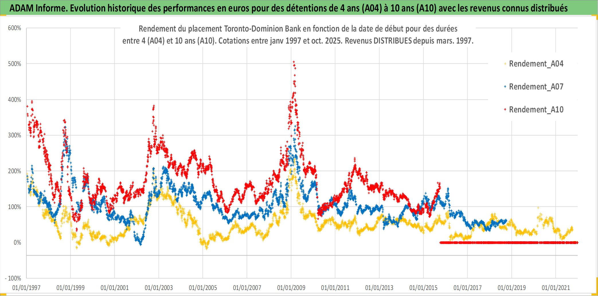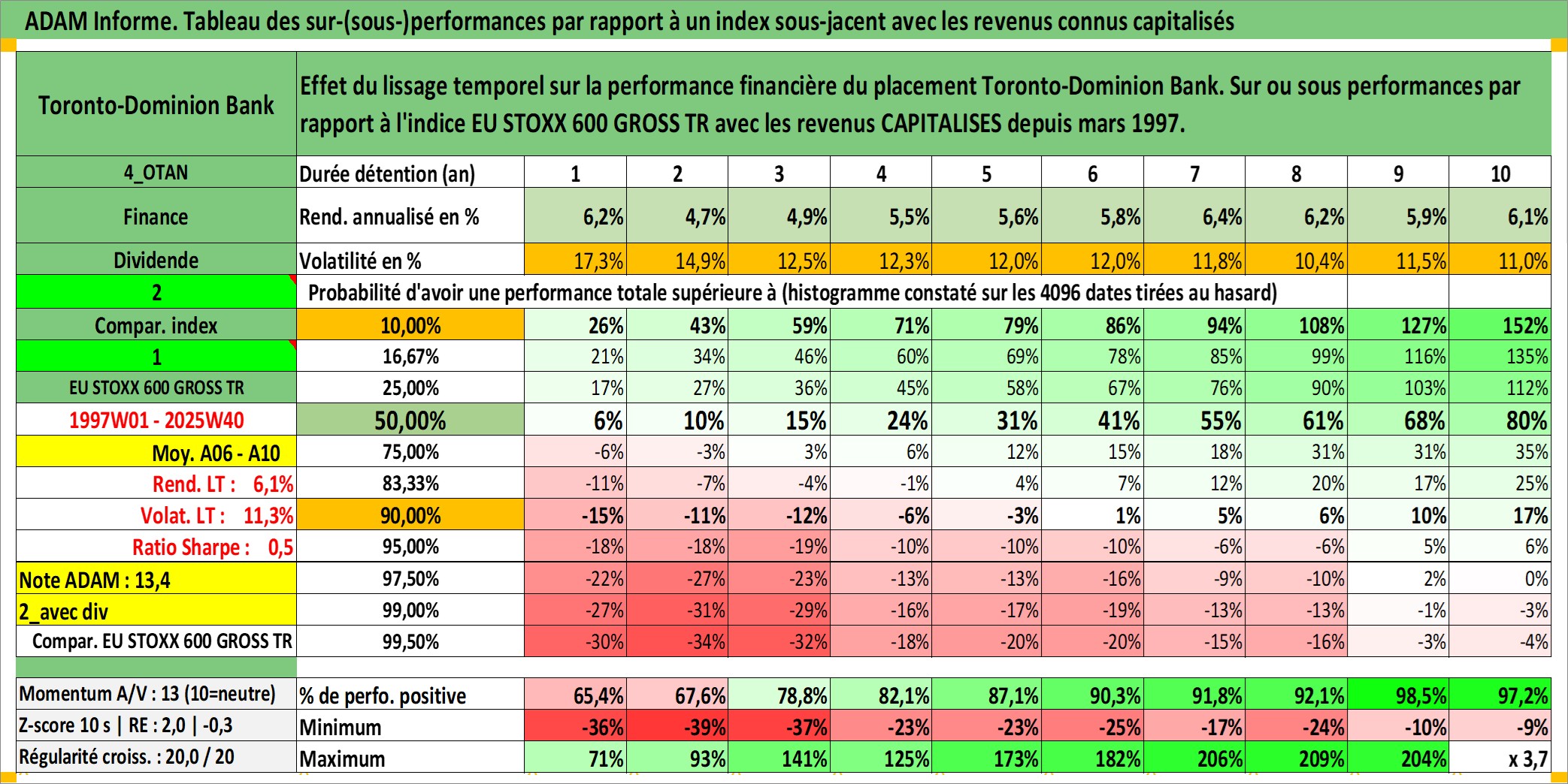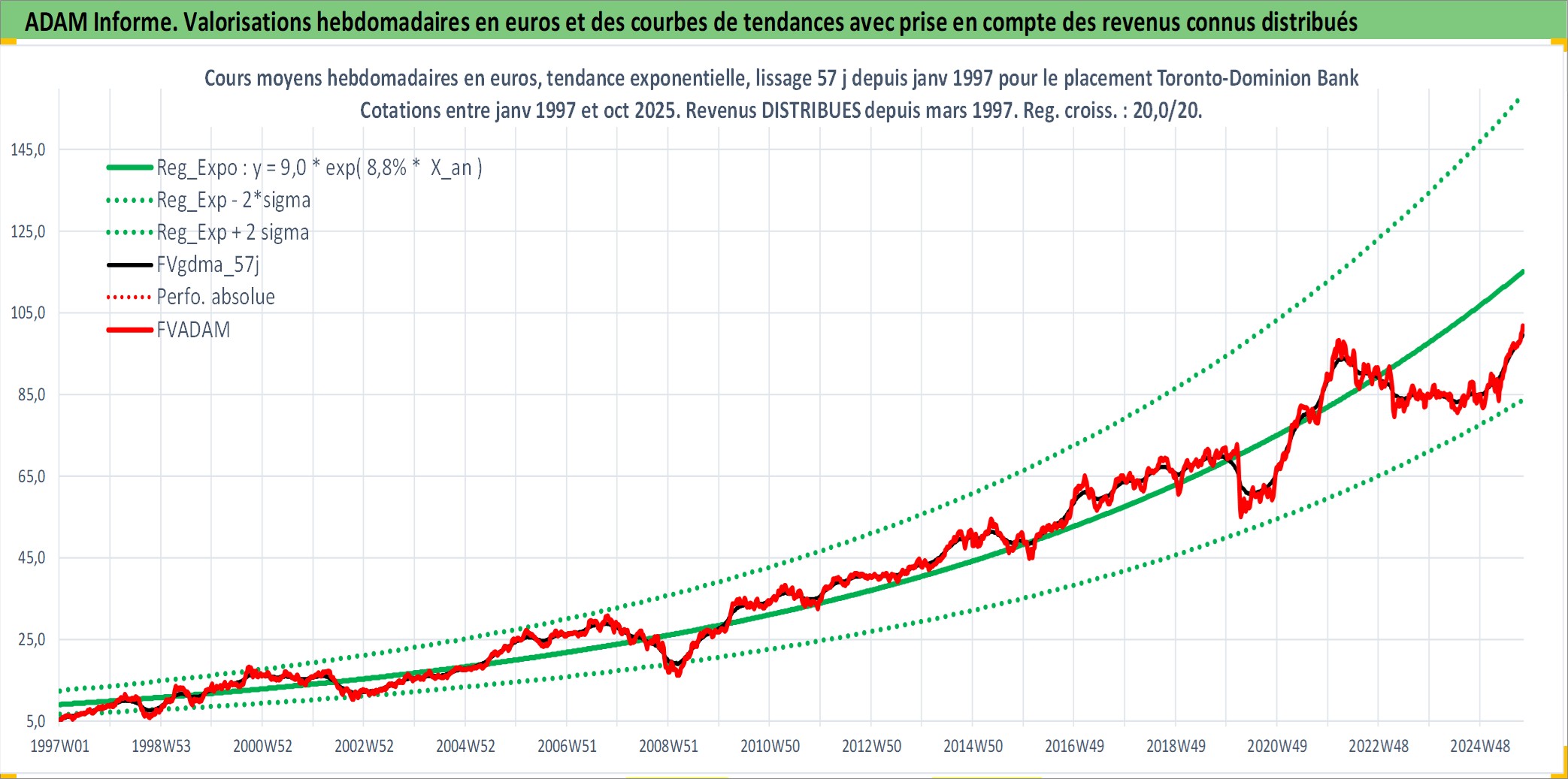 Site dédié aux investisseursPage dédiée sur site financeAnalyse des valorisations hebdomadaires de l'action Toronto-Dominion Bank. Cet actif est cote en CAD. Les valorisations sont en contrevaleur EURO et couvrent les semaines 1997W01 a 2025W40. Les revenus de cet actif financier sont pris en compte depuis la semaine 1997W12. La note globale ESG de cet actif est estimee a 10.0 (apres rebasage entre 0 et 20).