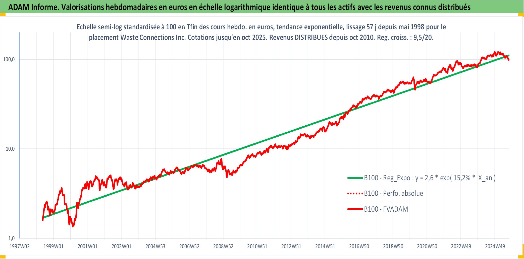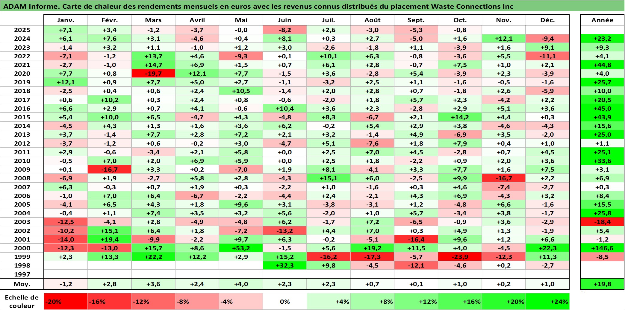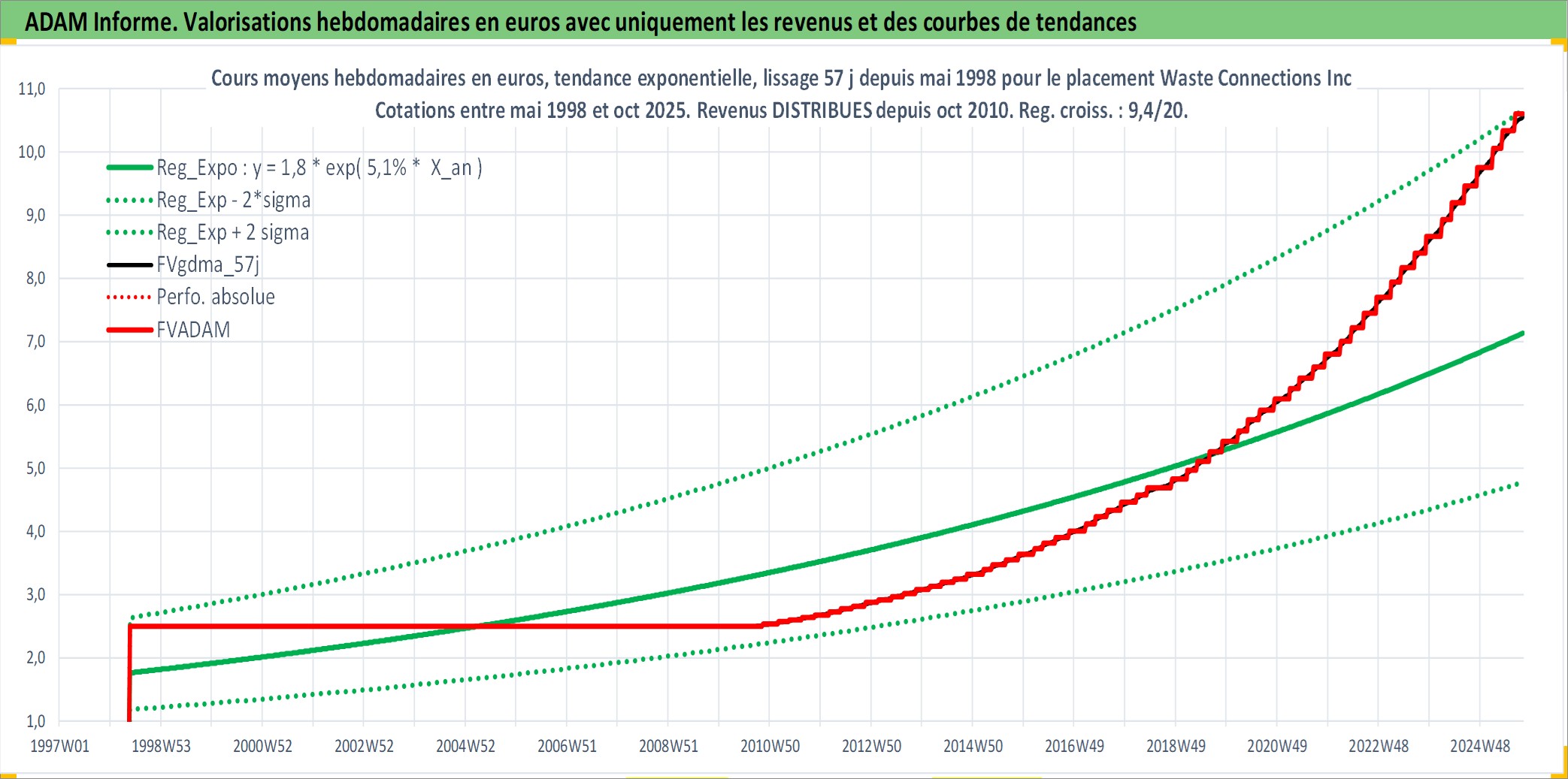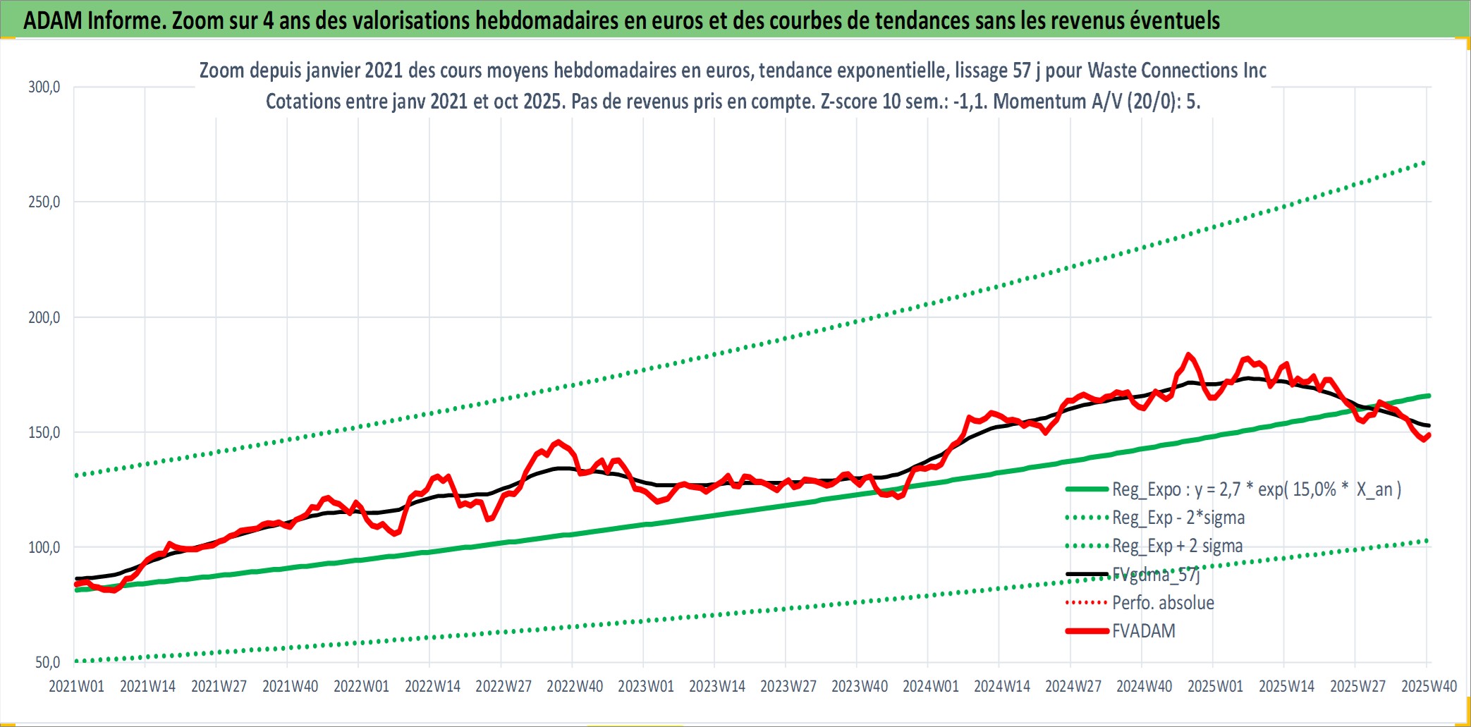 Site dédié aux investisseursPage dédiée sur site financeAnalyse des valorisations hebdomadaires de l'action Waste Connections Inc. Cet actif est cote en USD. Les valorisations sont en contrevaleur EURO et couvrent les semaines 1998W21 a 2025W40. Les revenus de cet actif financier sont pris en compte depuis la semaine 2010W43. La note globale ESG de cet actif est estimee a 11.0 (apres rebasage entre 0 et 20).