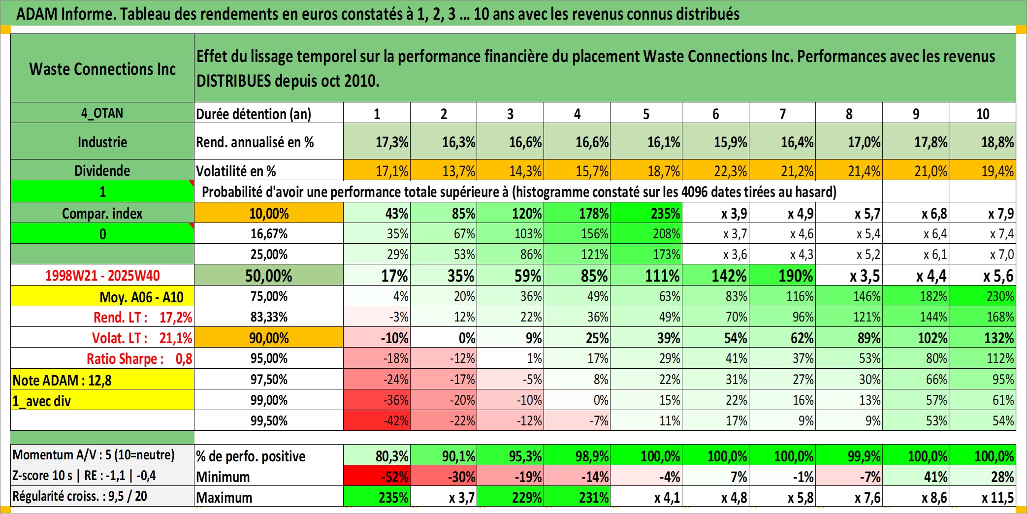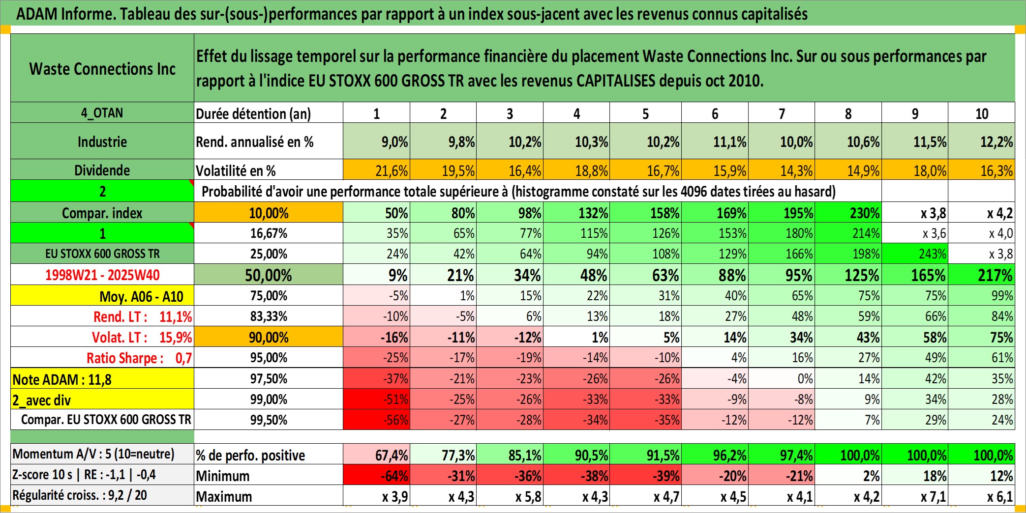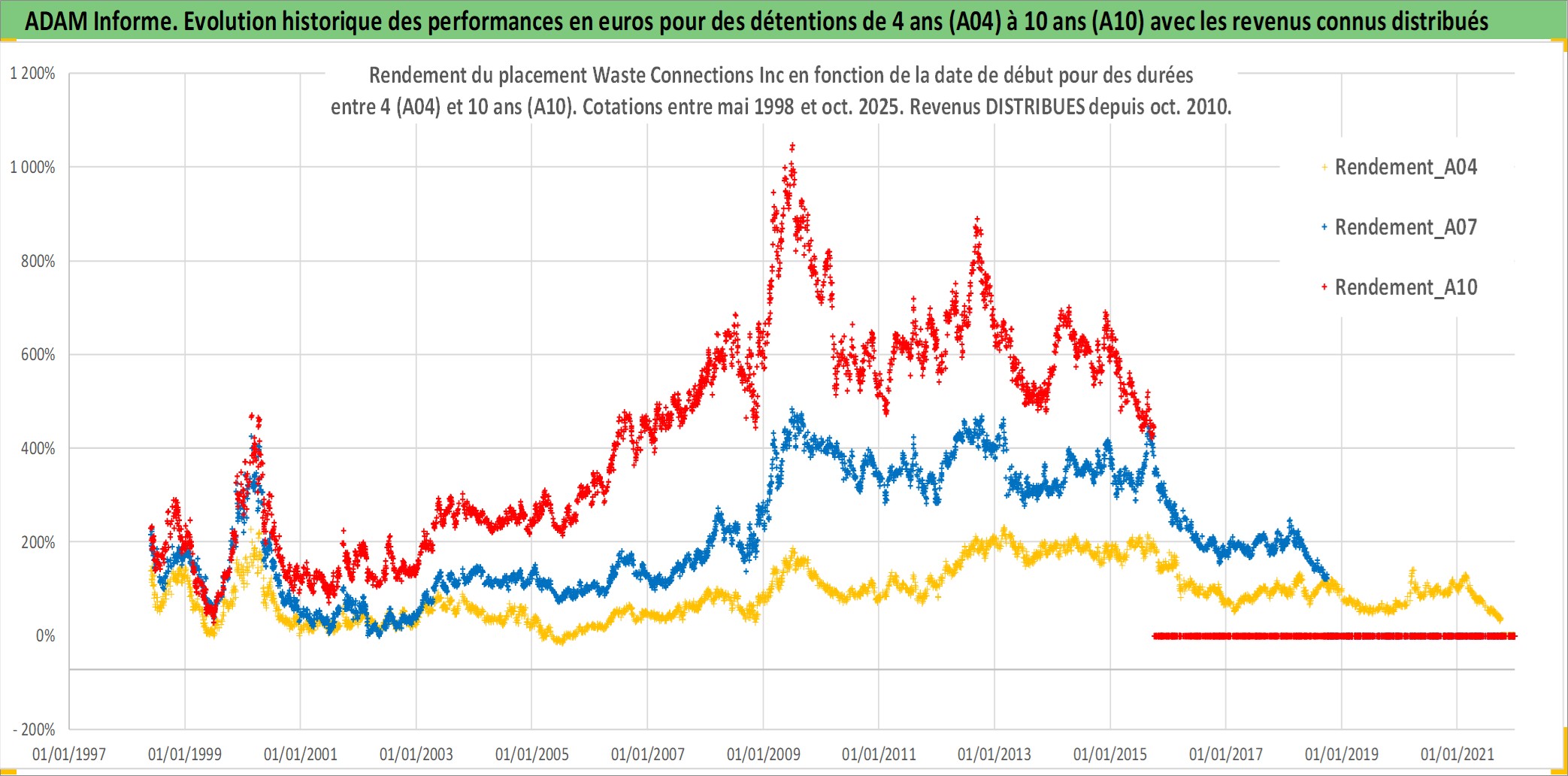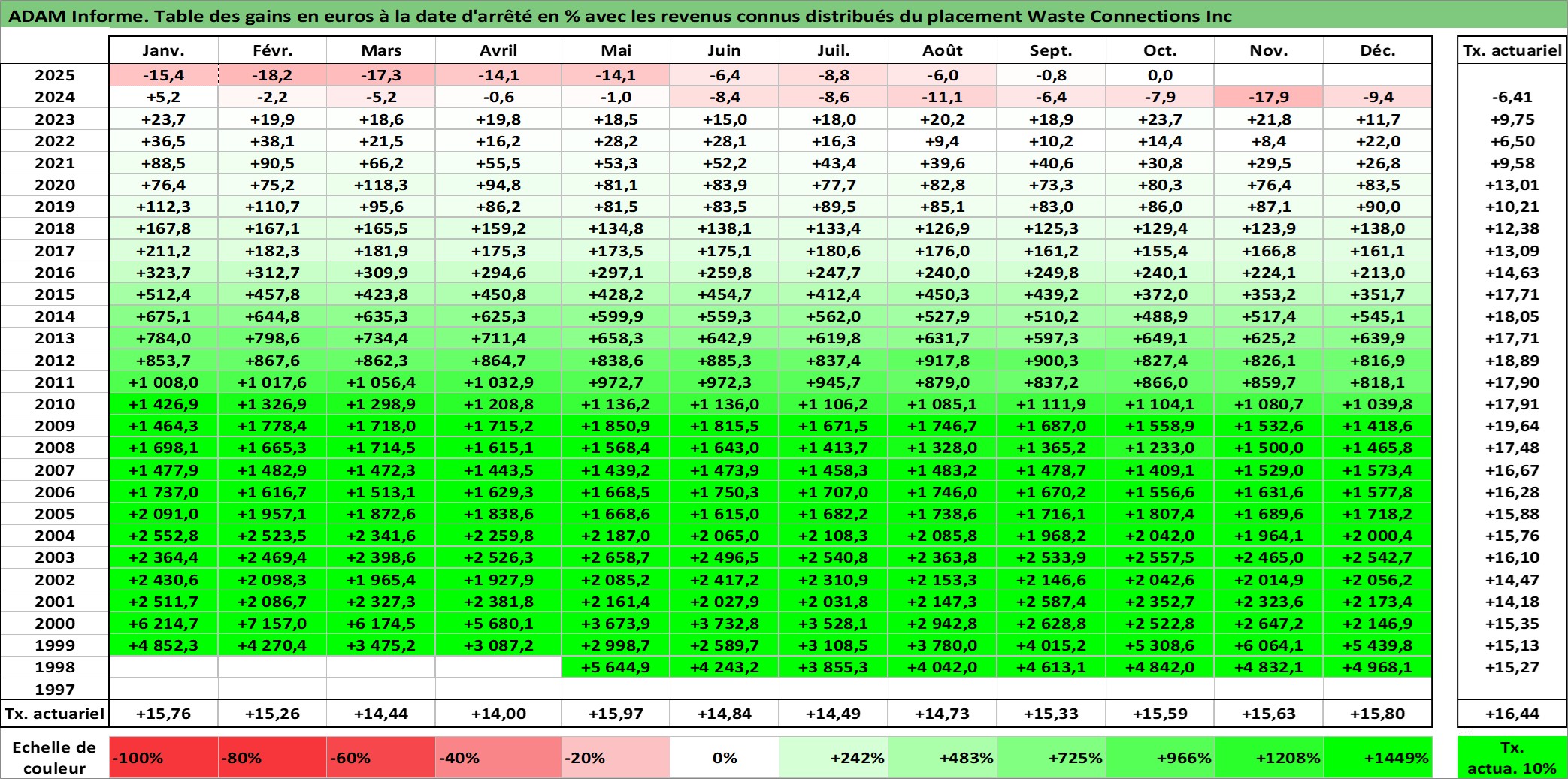 Site dédié aux investisseursPage dédiée sur site financeAnalyse des valorisations hebdomadaires de l'action Waste Connections Inc. Cet actif est cote en USD. Les valorisations sont en contrevaleur EURO et couvrent les semaines 1998W21 a 2025W40. Les revenus de cet actif financier sont pris en compte depuis la semaine 2010W43. La note globale ESG de cet actif est estimee a 11.0 (apres rebasage entre 0 et 20).