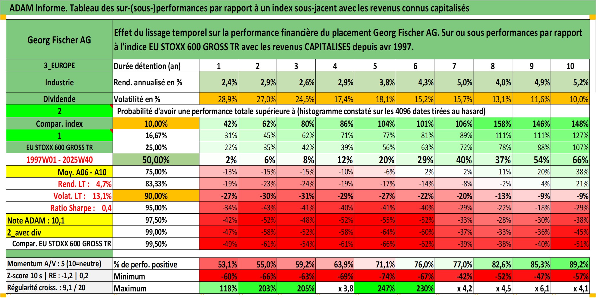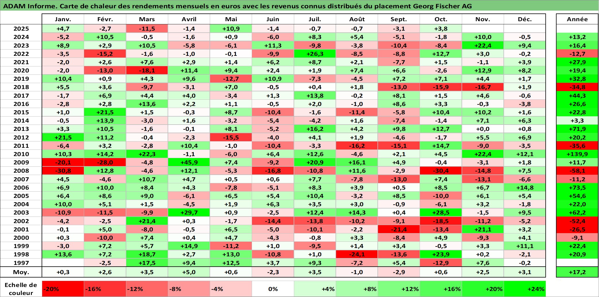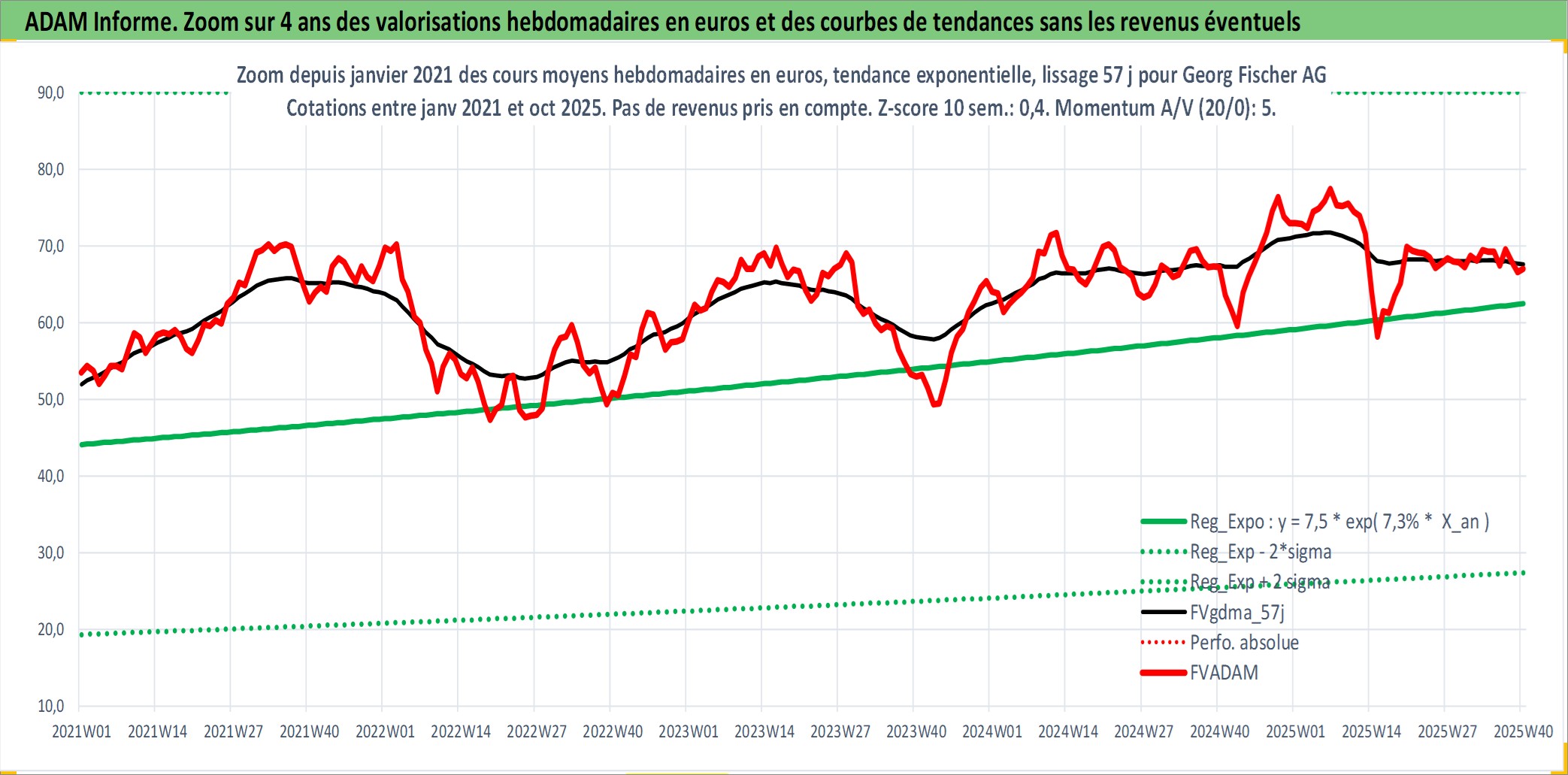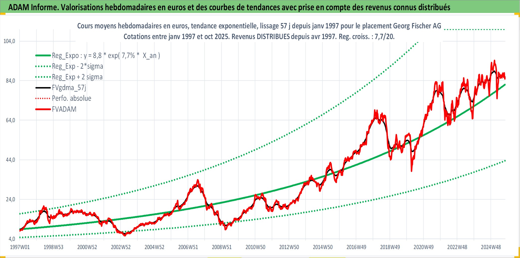 Site dédié aux investisseursPage dédiée sur site financeAnalyse des valorisations hebdomadaires de l'action Georg Fischer AG. Cet actif est cote en CHF. Les valorisations sont en contrevaleur EURO et couvrent les semaines 1997W01 a 2025W40. Les revenus de cet actif financier sont pris en compte depuis la semaine 1997W15. La note ESG de cet actif n'est pas connue.