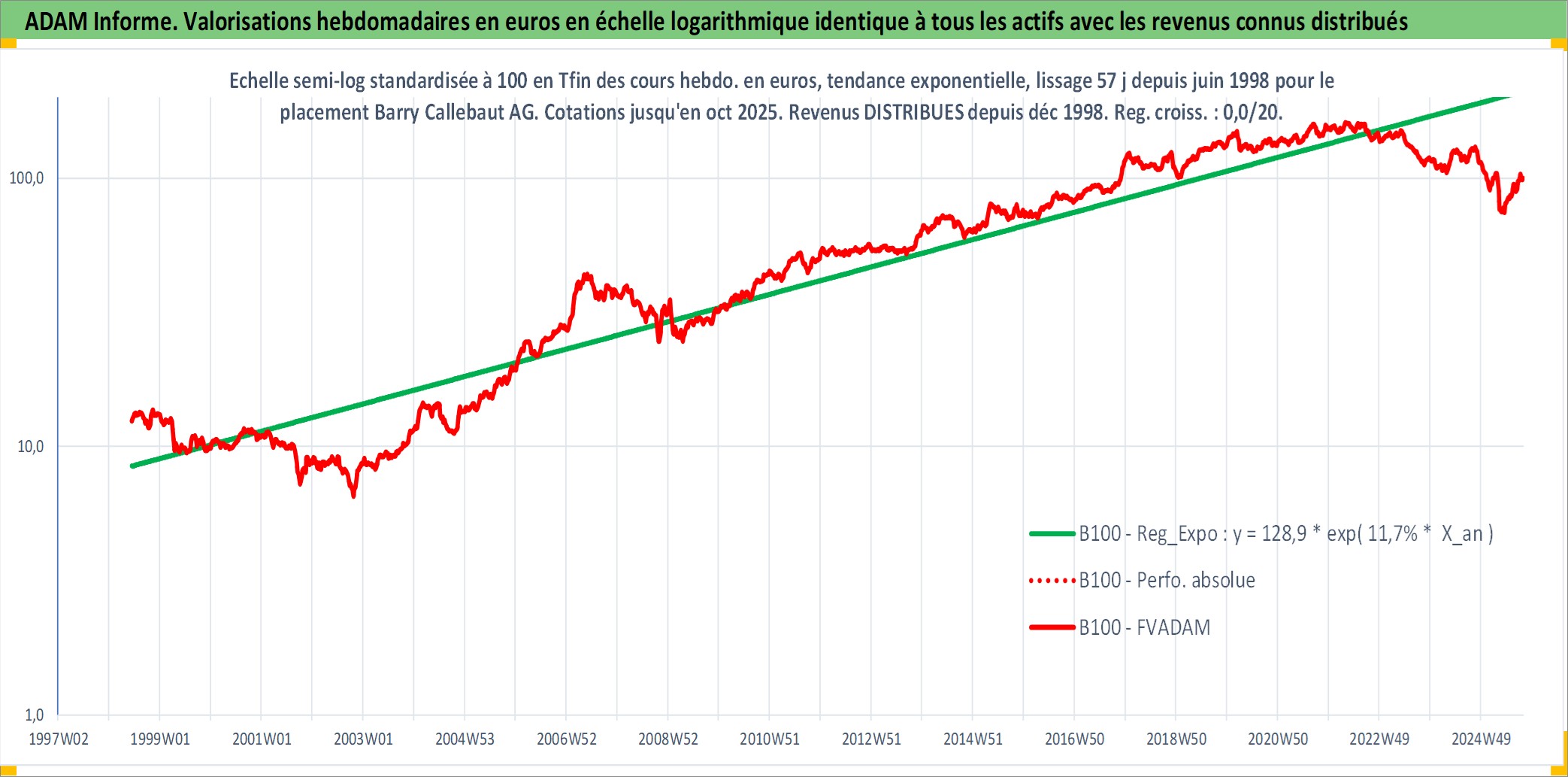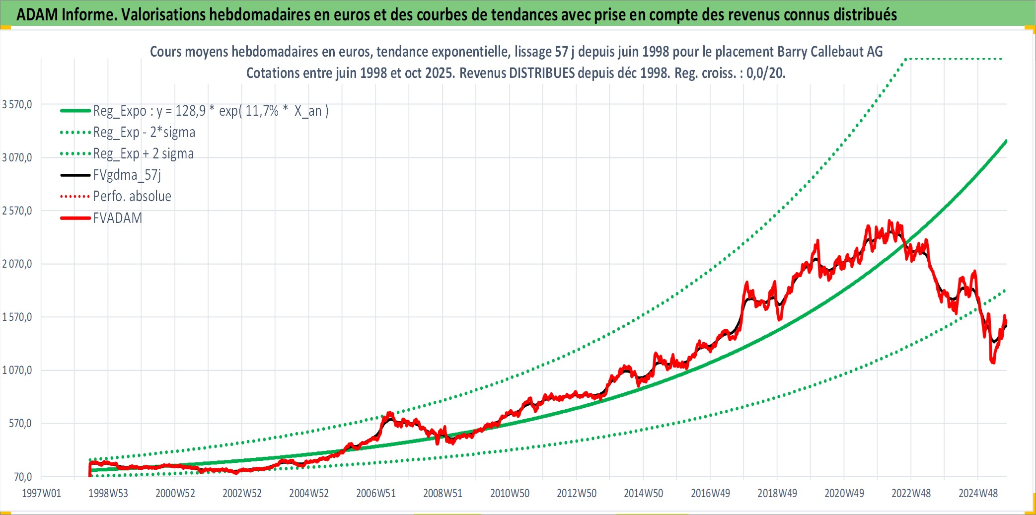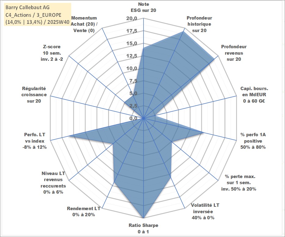Site dédié aux investisseursPage dédiée sur site financeAnalyse des valorisations hebdomadaires de l'action Barry Callebaut AG. Cet actif est cote en CHF. Les valorisations sont en contrevaleur EURO et couvrent les semaines 1998W25 a 2025W40. Les revenus de cet actif financier sont pris en compte depuis la semaine 1998W51. La note globale ESG de cet actif est estimee a 14.0 (apres rebasage entre 0 et 20).