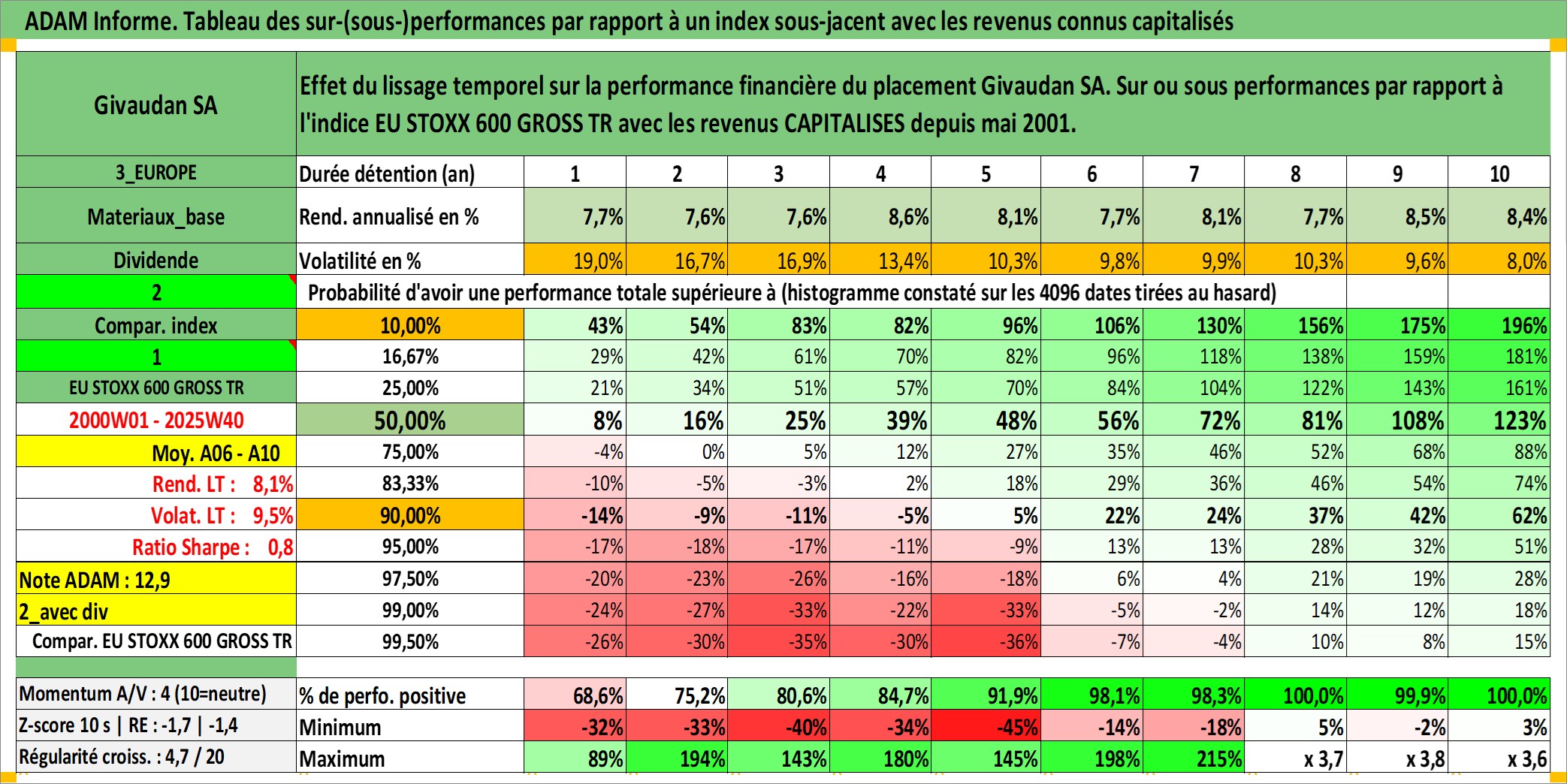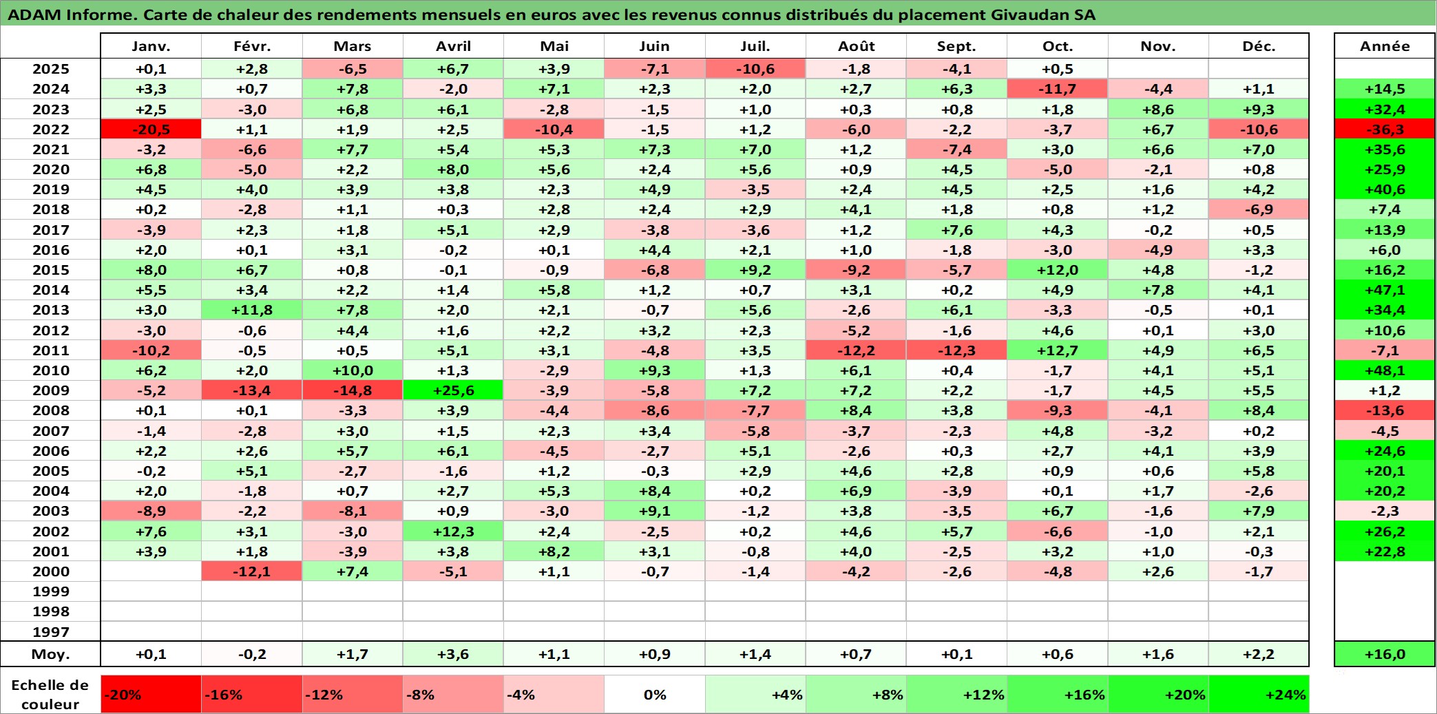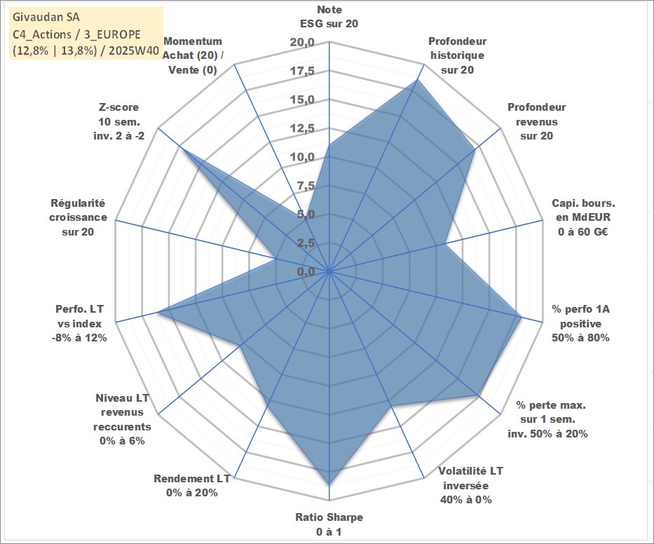 Site dédié aux investisseursPage dédiée sur site financeAnalyse des valorisations hebdomadaires de l'action Givaudan SA. Cet actif est cote en CHF. Les valorisations sont en contrevaleur EURO et couvrent les semaines 2000W01 a 2025W40. Les revenus de cet actif financier sont pris en compte depuis la semaine 2001W21. La note globale ESG de cet actif est estimee a 11.0 (apres rebasage entre 0 et 20).
