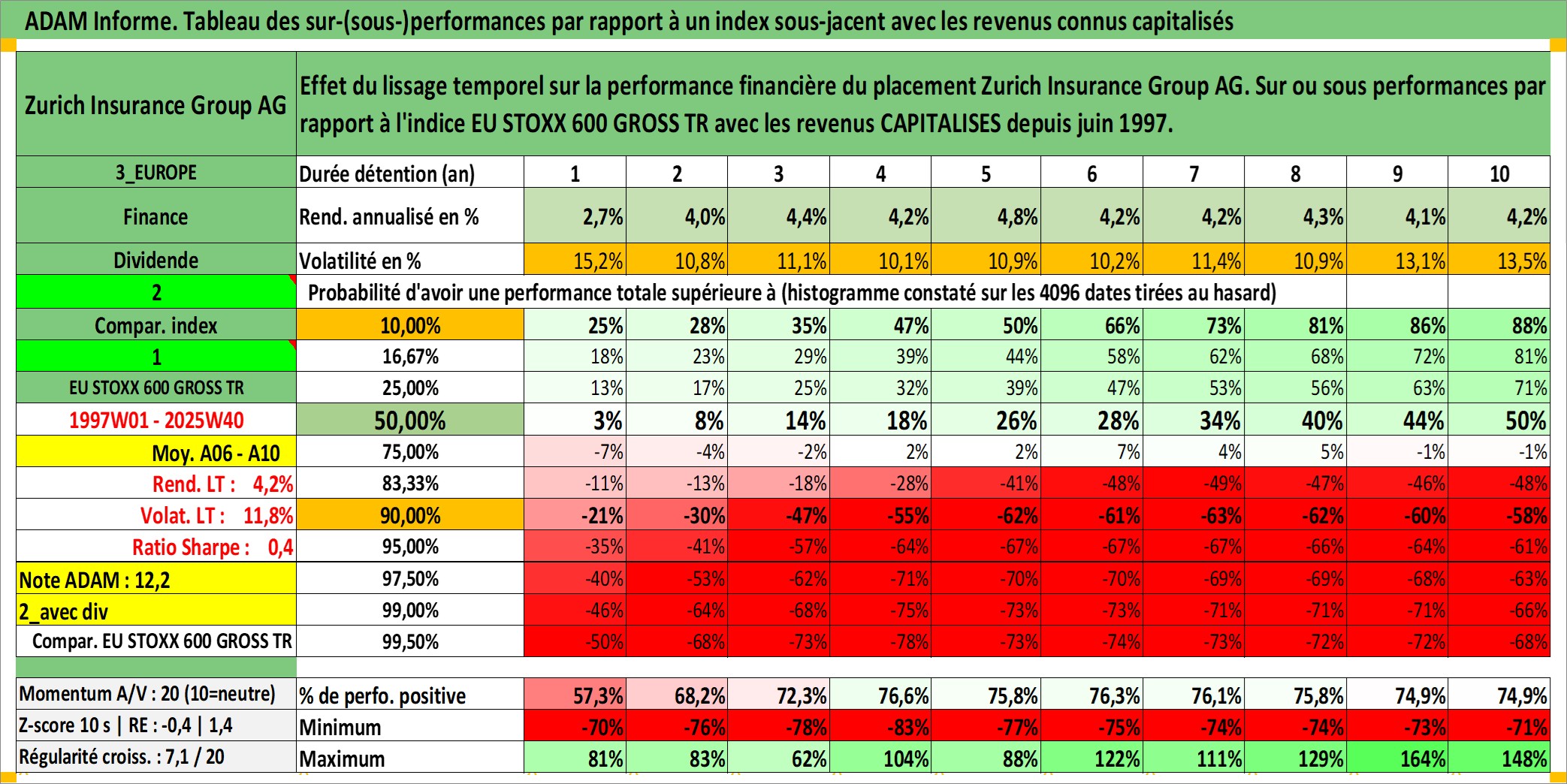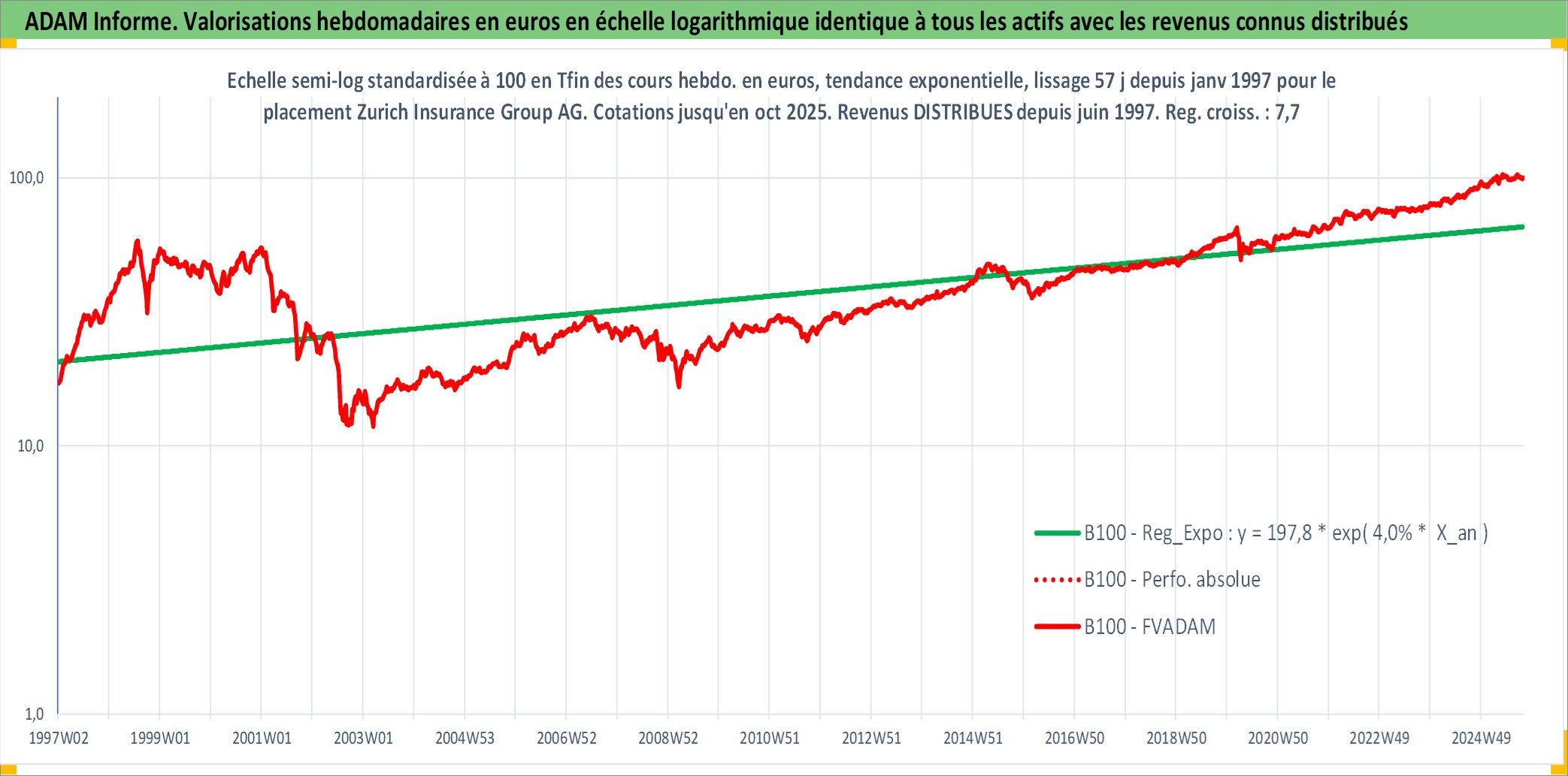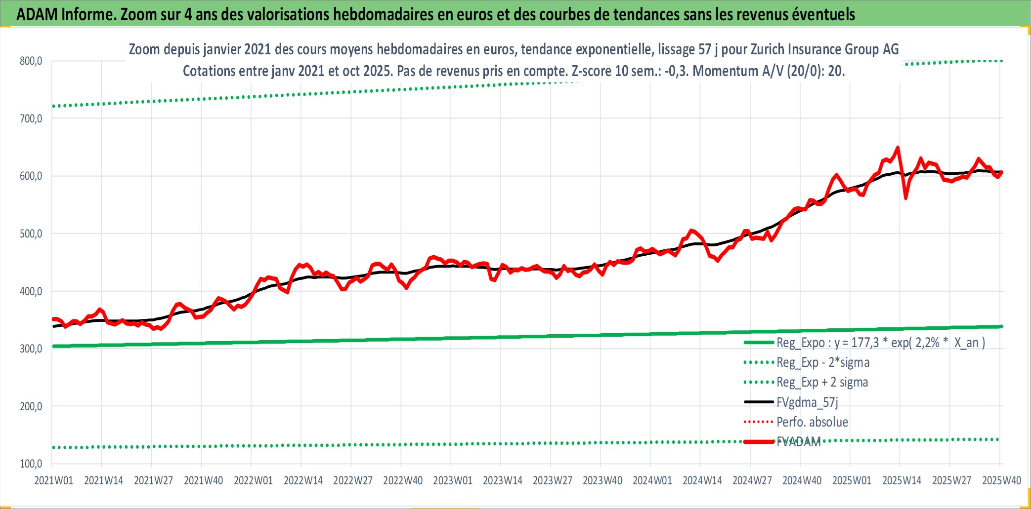 Site dédié aux investisseursPage dédiée sur site financeAnalyse des valorisations hebdomadaires de l'action Zurich Insurance Group AG. Cet actif est cote en CHF. Les valorisations sont en contrevaleur EURO et couvrent les semaines 1997W01 a 2025W40. Les revenus de cet actif financier sont pris en compte depuis la semaine 1997W25. La note globale ESG de cet actif est estimee a 11.0 (apres rebasage entre 0 et 20).