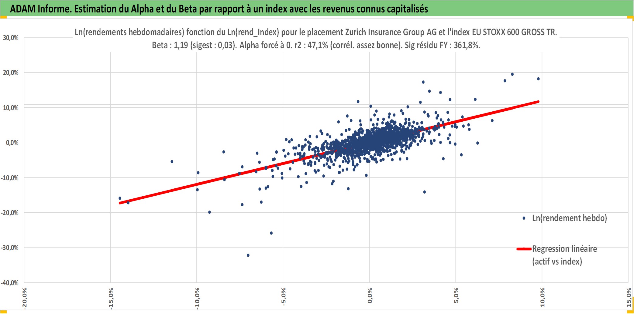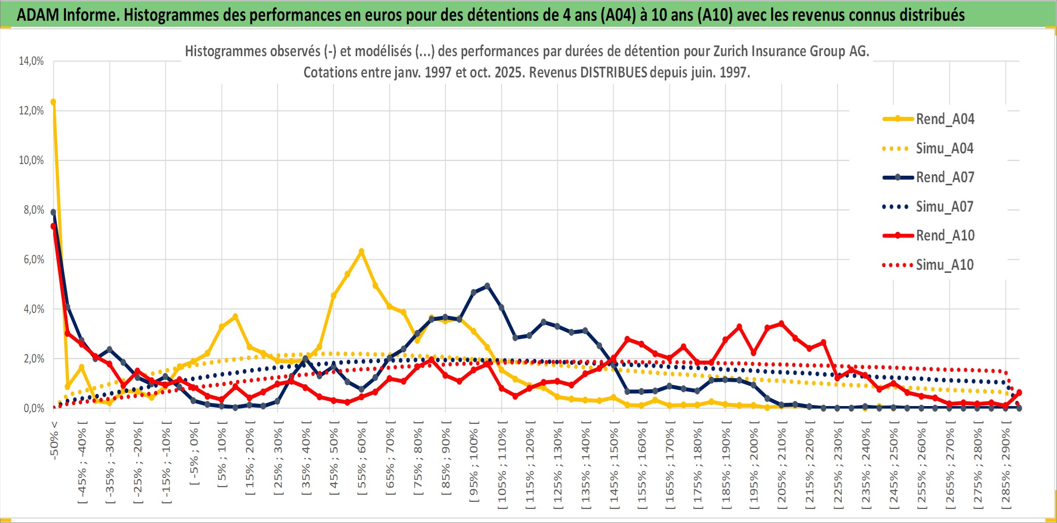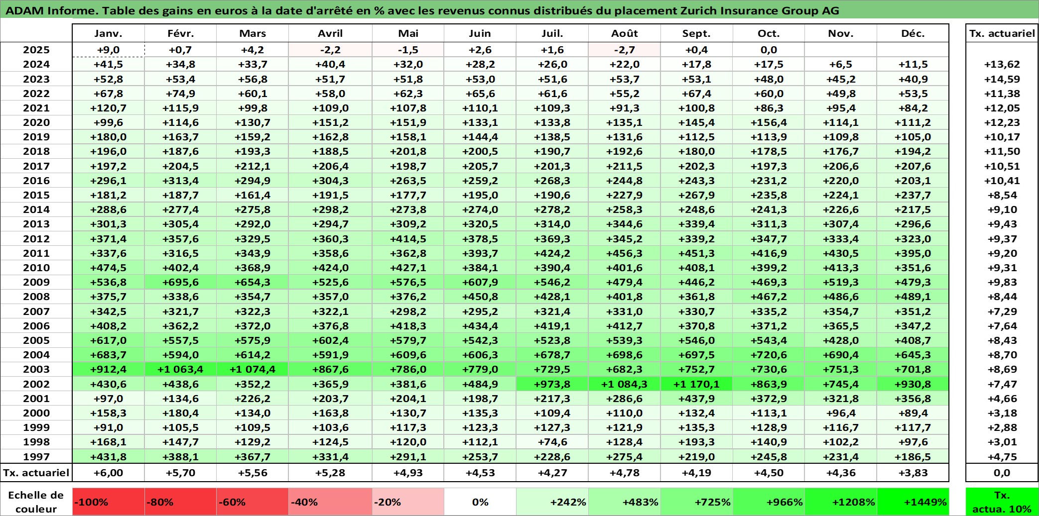 Site dédié aux investisseursPage dédiée sur site financeAnalyse des valorisations hebdomadaires de l'action Zurich Insurance Group AG. Cet actif est cote en CHF. Les valorisations sont en contrevaleur EURO et couvrent les semaines 1997W01 a 2025W40. Les revenus de cet actif financier sont pris en compte depuis la semaine 1997W25. La note globale ESG de cet actif est estimee a 11.0 (apres rebasage entre 0 et 20).