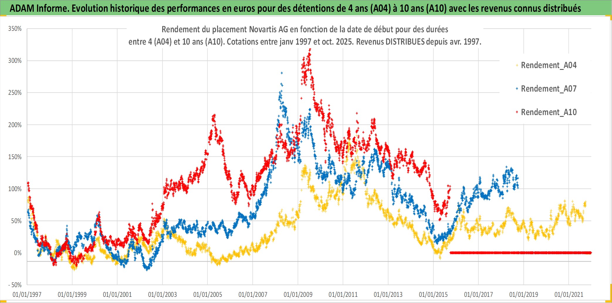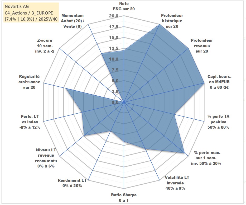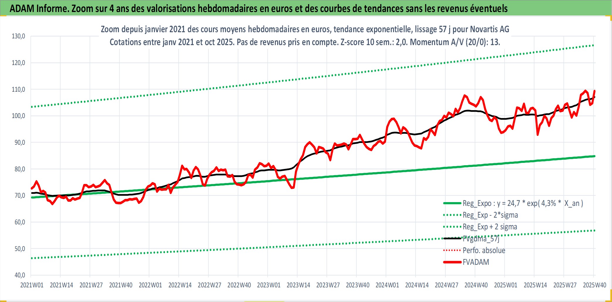 Site dédié aux investisseursPage dédiée sur site financeAnalyse des valorisations hebdomadaires de l'action Novartis AG. Cet actif est cote en CHF. Les valorisations sont en contrevaleur EURO et couvrent les semaines 1997W01 a 2025W40. Les revenus de cet actif financier sont pris en compte depuis la semaine 1997W17. La note globale ESG de cet actif est estimee a 12.0 (apres rebasage entre 0 et 20).