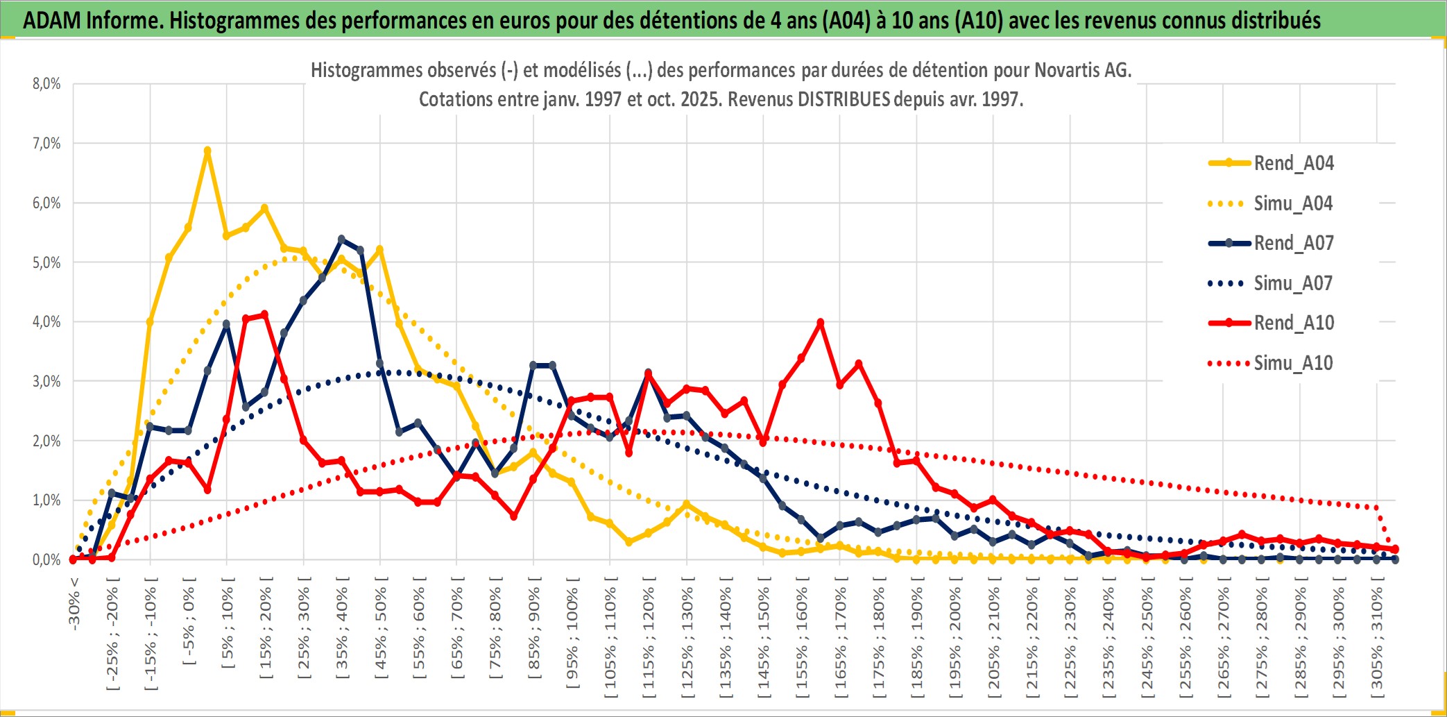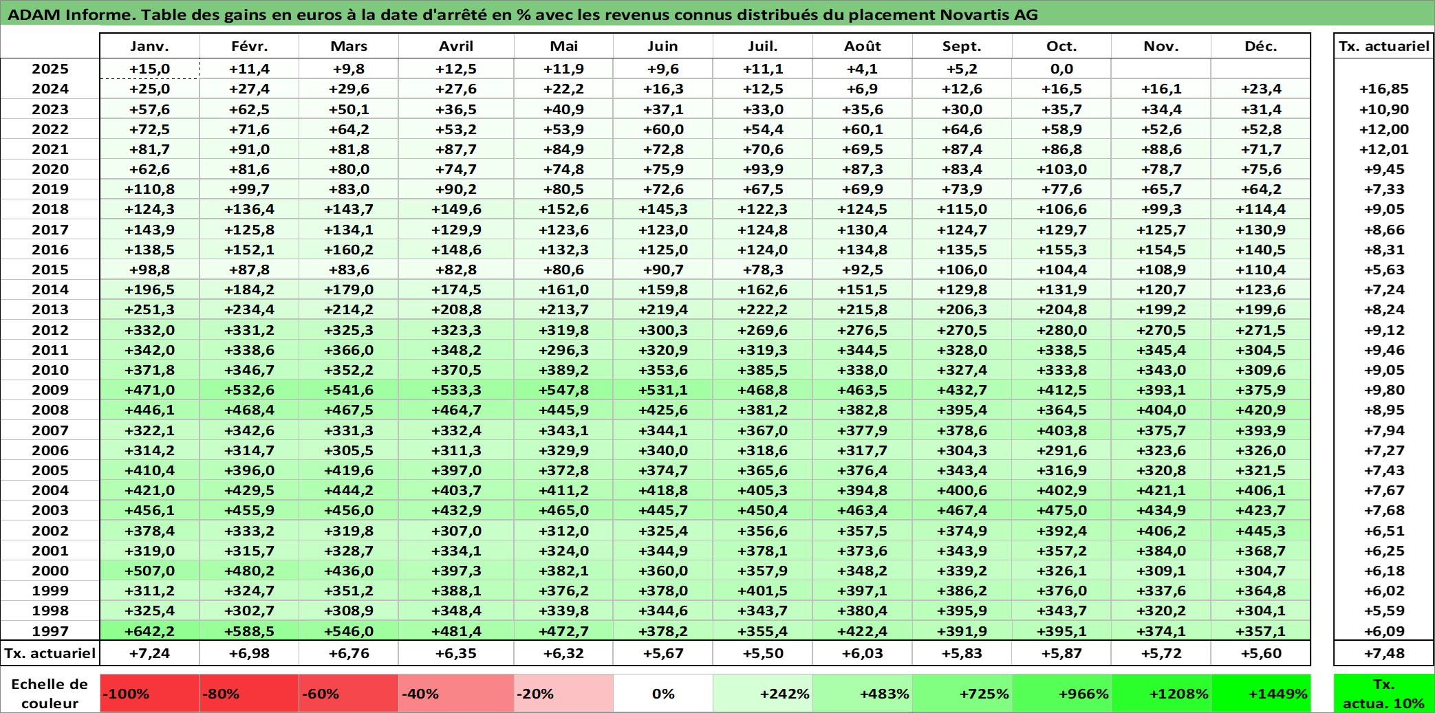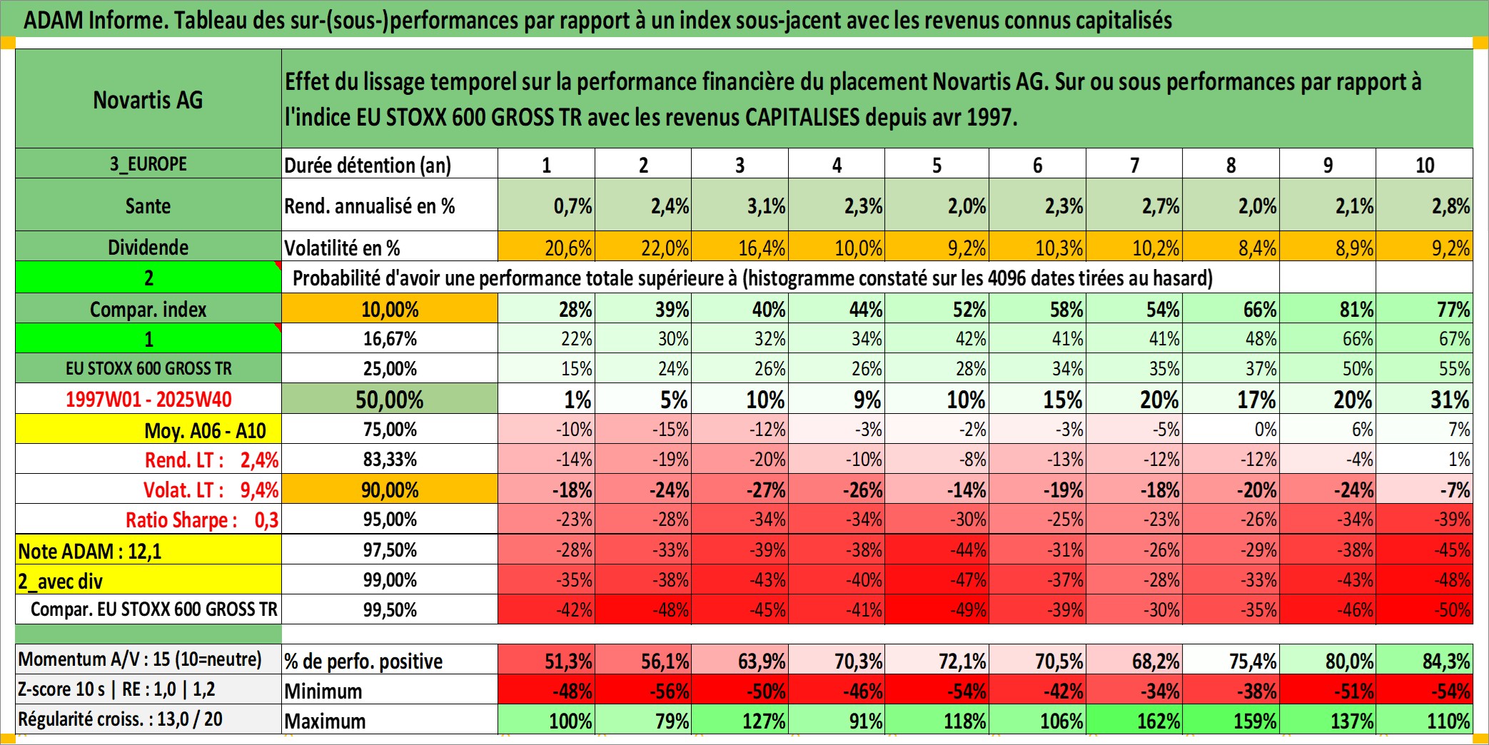 Site dédié aux investisseursPage dédiée sur site financeAnalyse des valorisations hebdomadaires de l'action Novartis AG. Cet actif est cote en CHF. Les valorisations sont en contrevaleur EURO et couvrent les semaines 1997W01 a 2025W40. Les revenus de cet actif financier sont pris en compte depuis la semaine 1997W17. La note globale ESG de cet actif est estimee a 12.0 (apres rebasage entre 0 et 20).