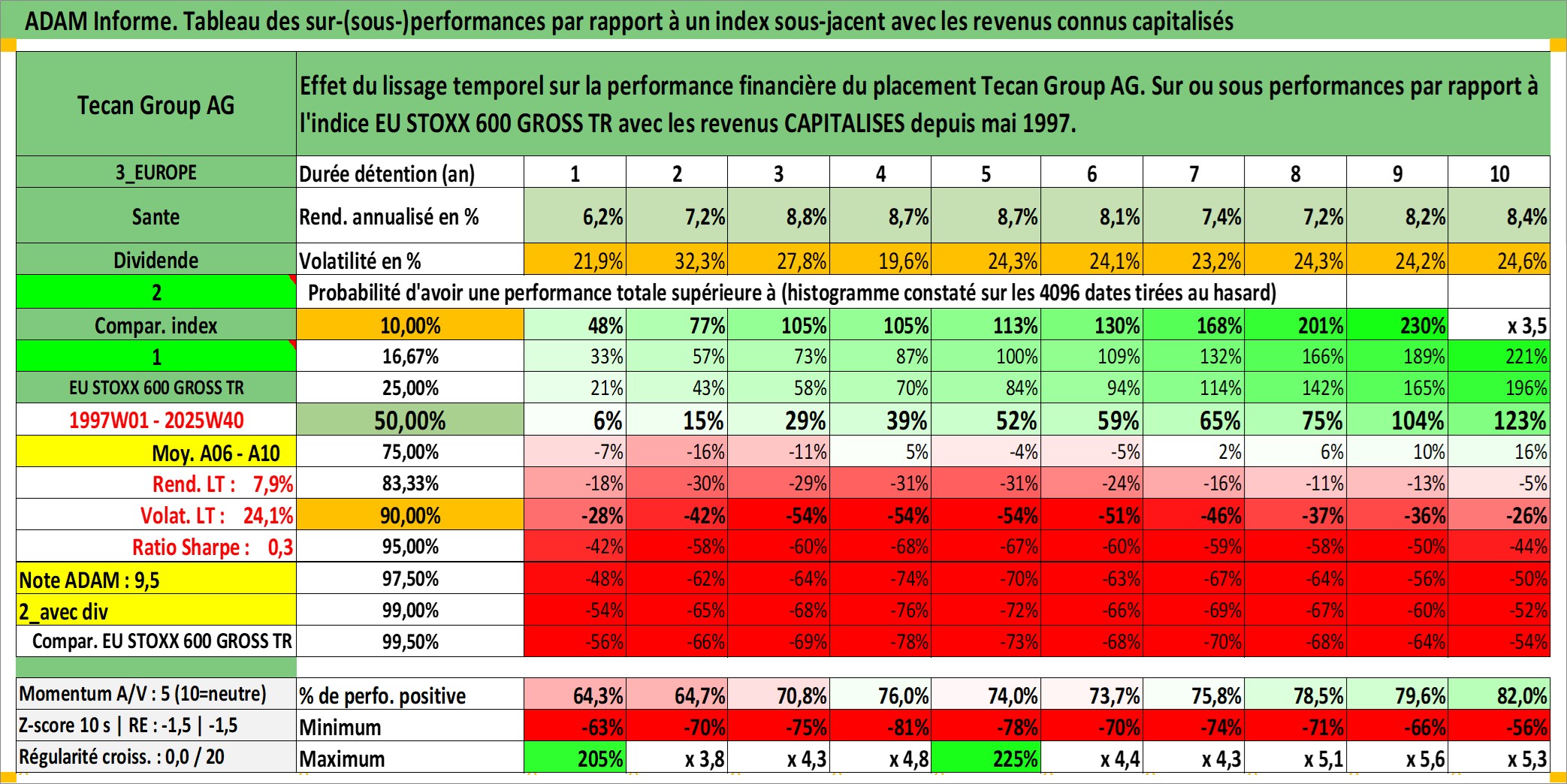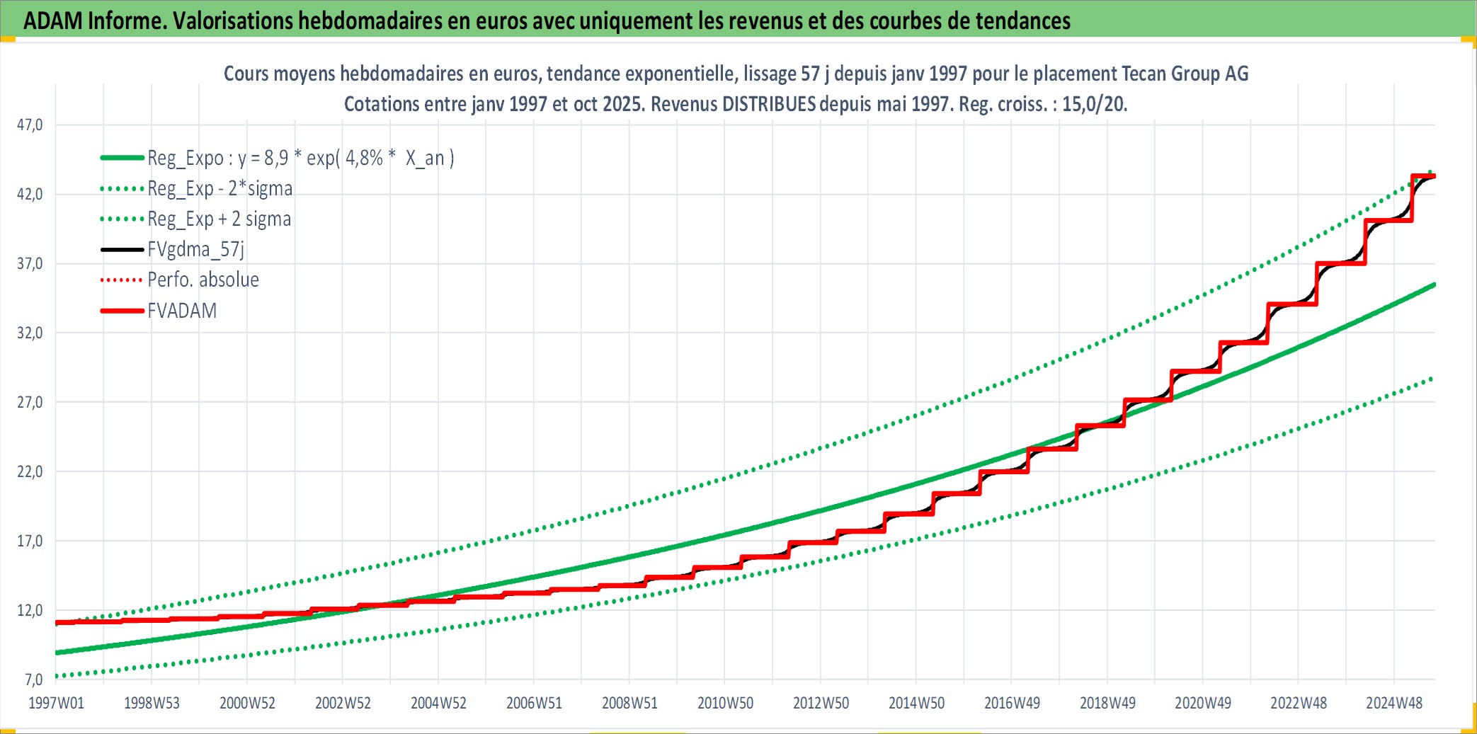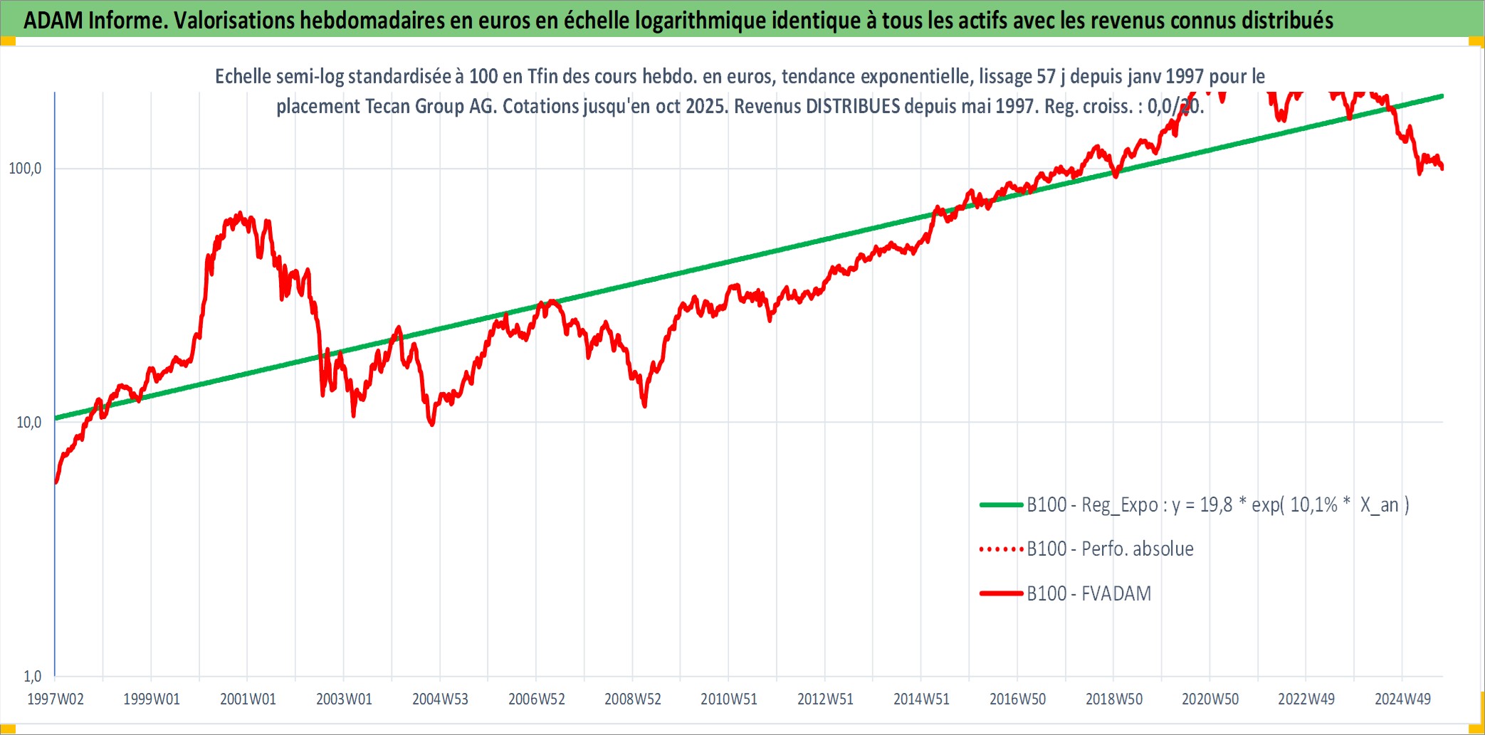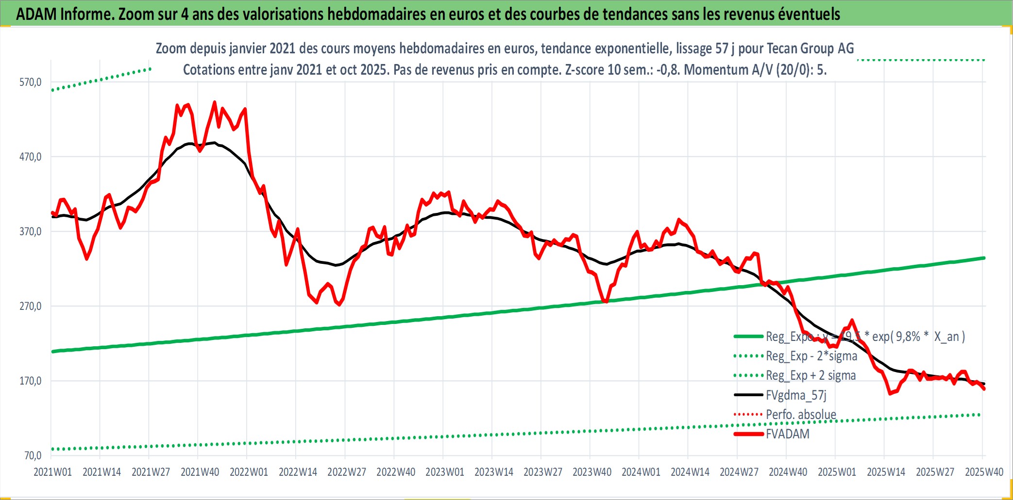 Site dédié aux investisseursPage dédiée sur site financeAnalyse des valorisations hebdomadaires de l'action Tecan Group AG. Cet actif est cote en CHF. Les valorisations sont en contrevaleur EURO et couvrent les semaines 1997W01 a 2025W40. Les revenus de cet actif financier sont pris en compte depuis la semaine 1997W21. La note ESG de cet actif n'est pas connue.