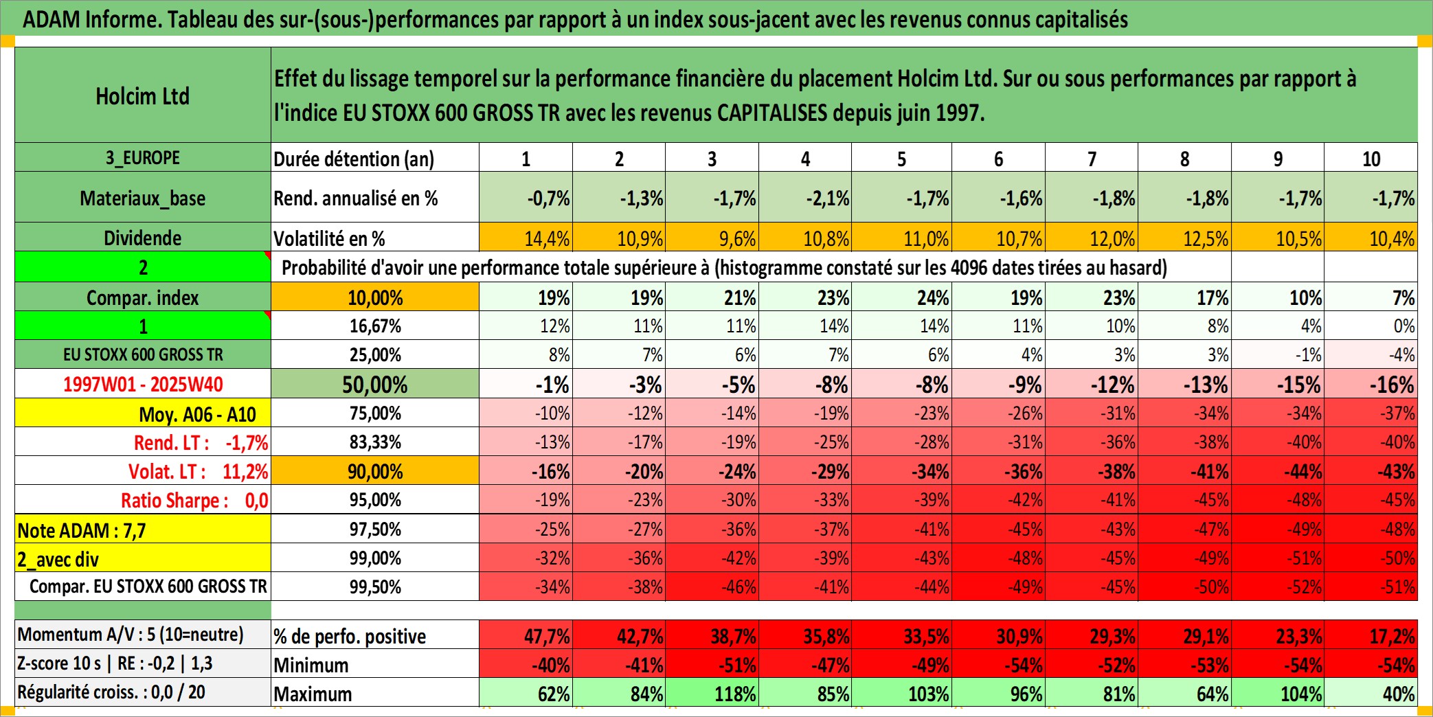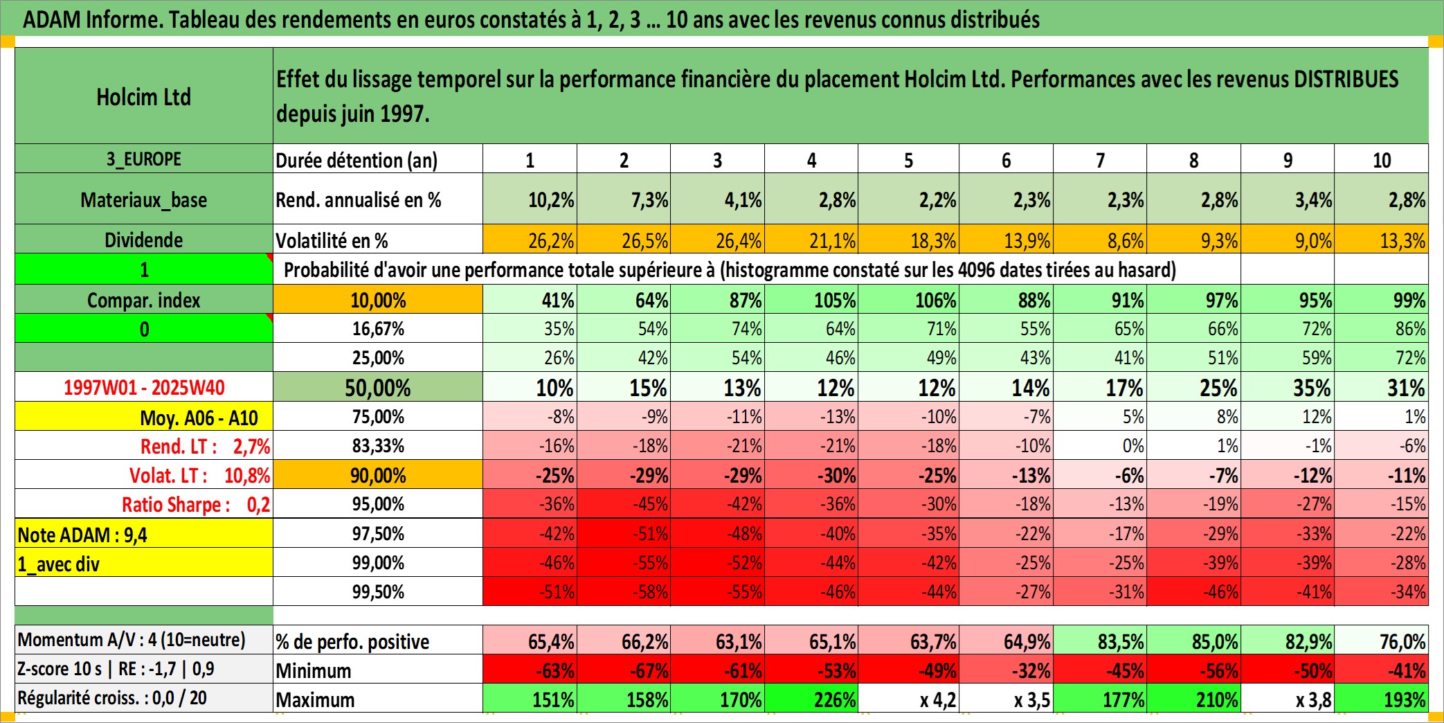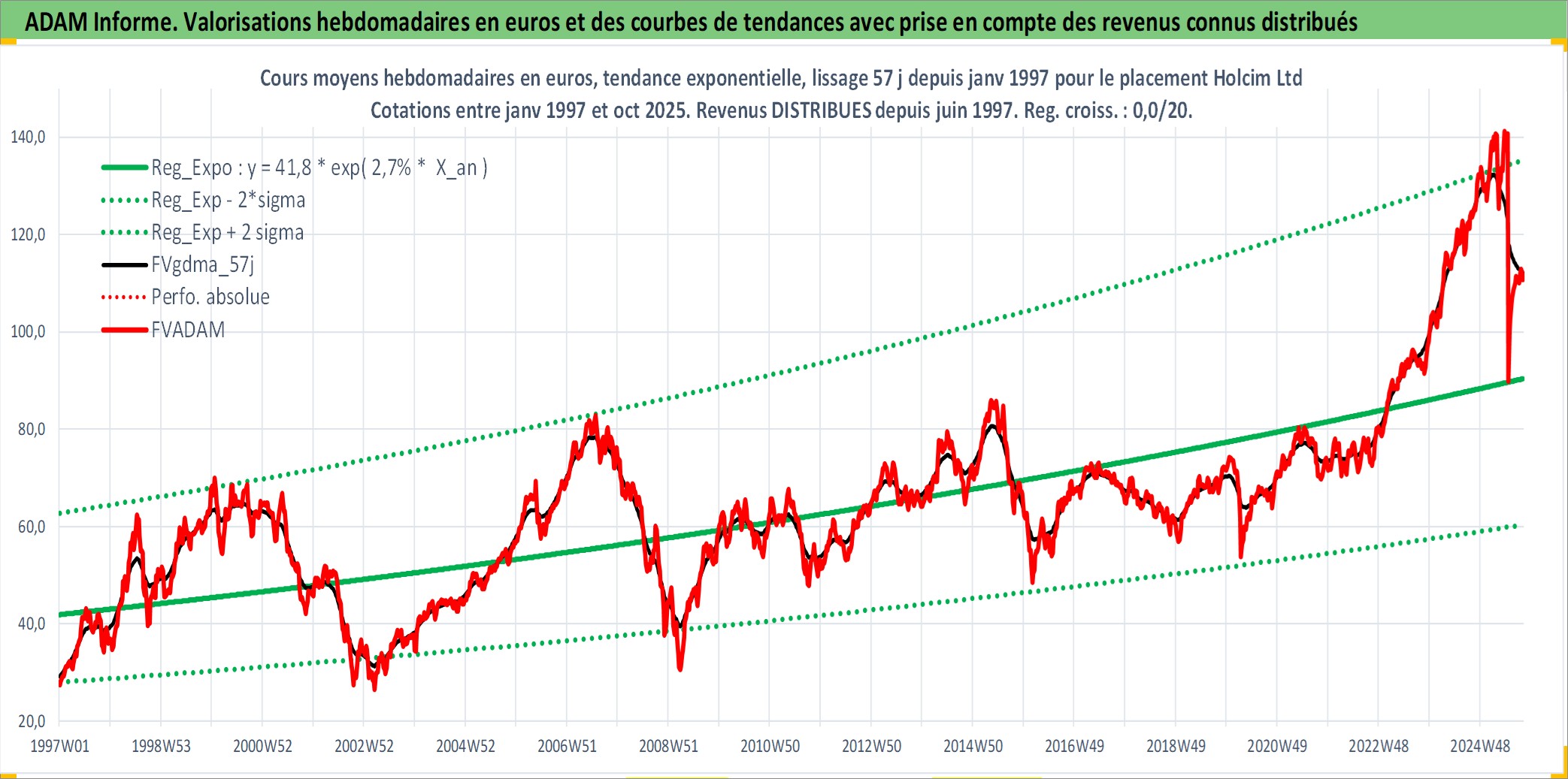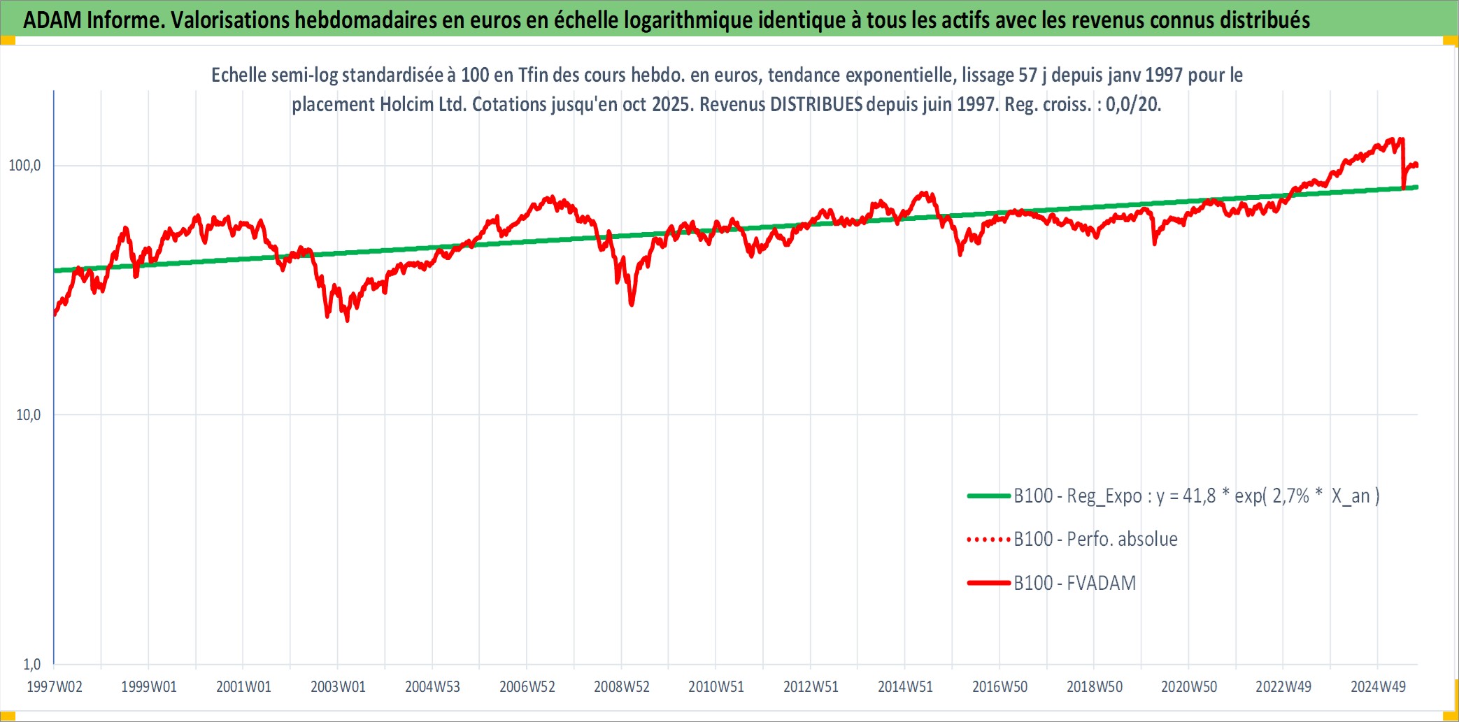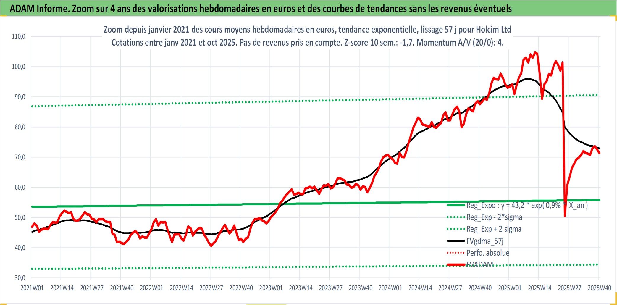 Site dédié aux investisseursPage dédiée sur site financeAnalyse des valorisations hebdomadaires de l'action Holcim Ltd. Cet actif est cote en CHF. Les valorisations sont en contrevaleur EURO et couvrent les semaines 1997W01 a 2025W40. Les revenus de cet actif financier sont pris en compte depuis la semaine 1997W24. La note globale ESG de cet actif est estimee a 10.0 (apres rebasage entre 0 et 20).