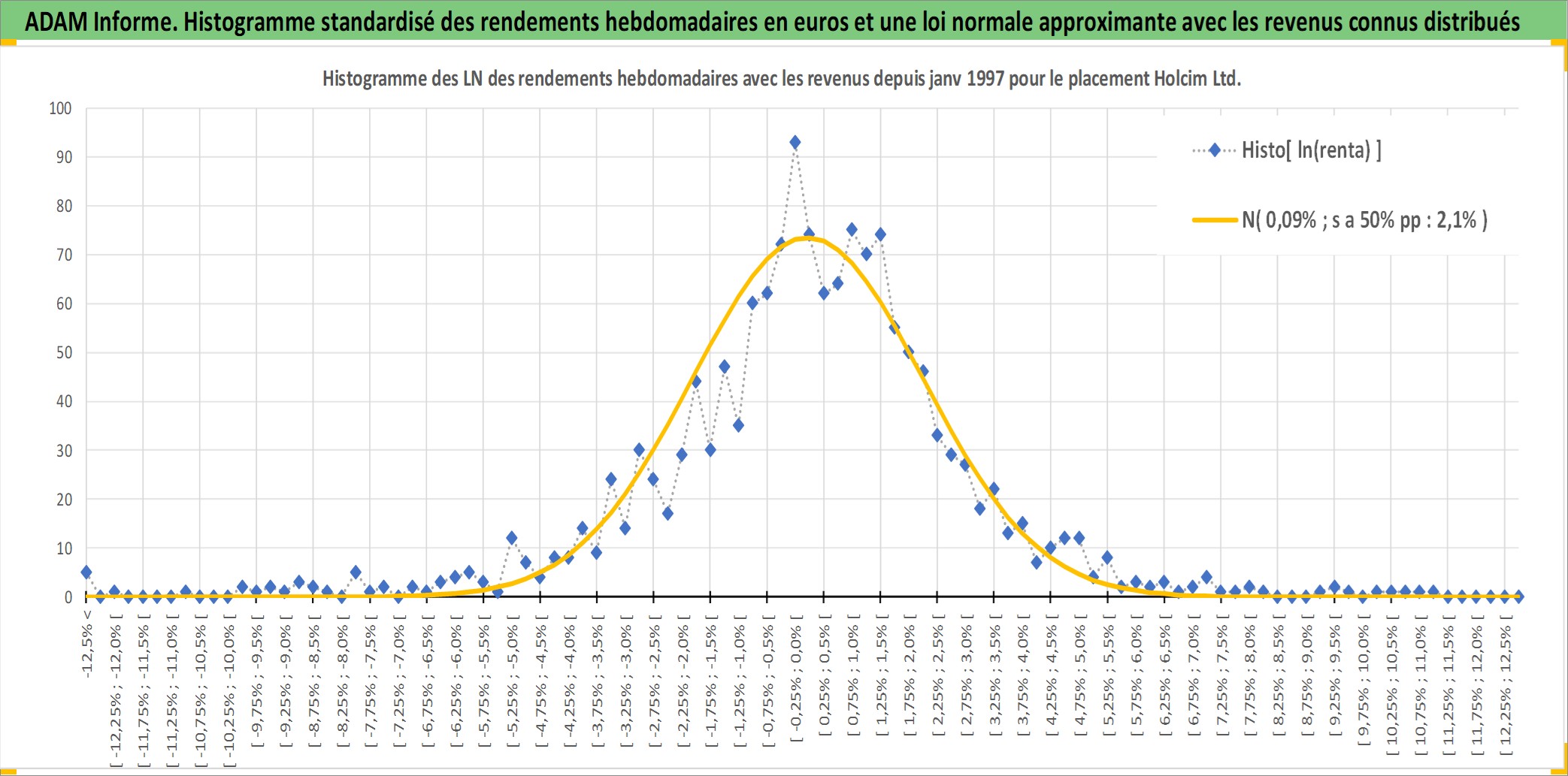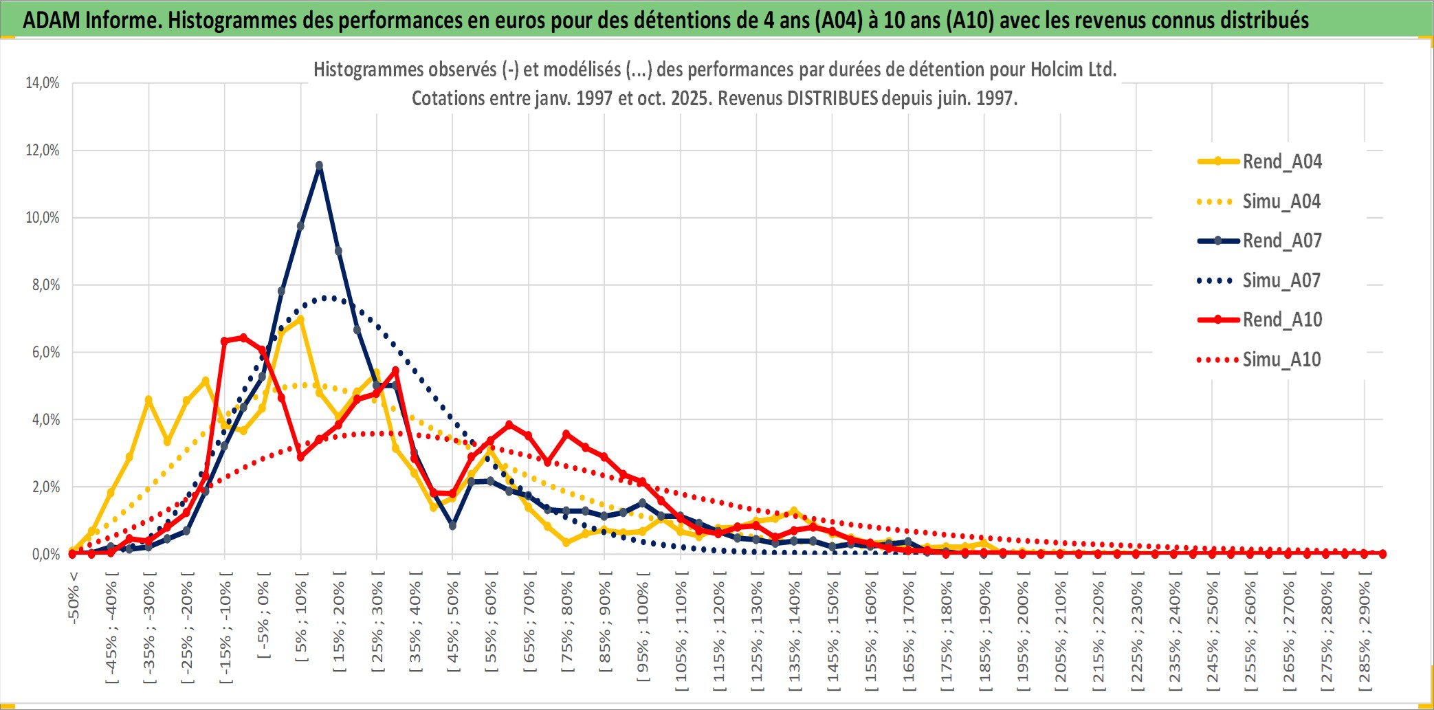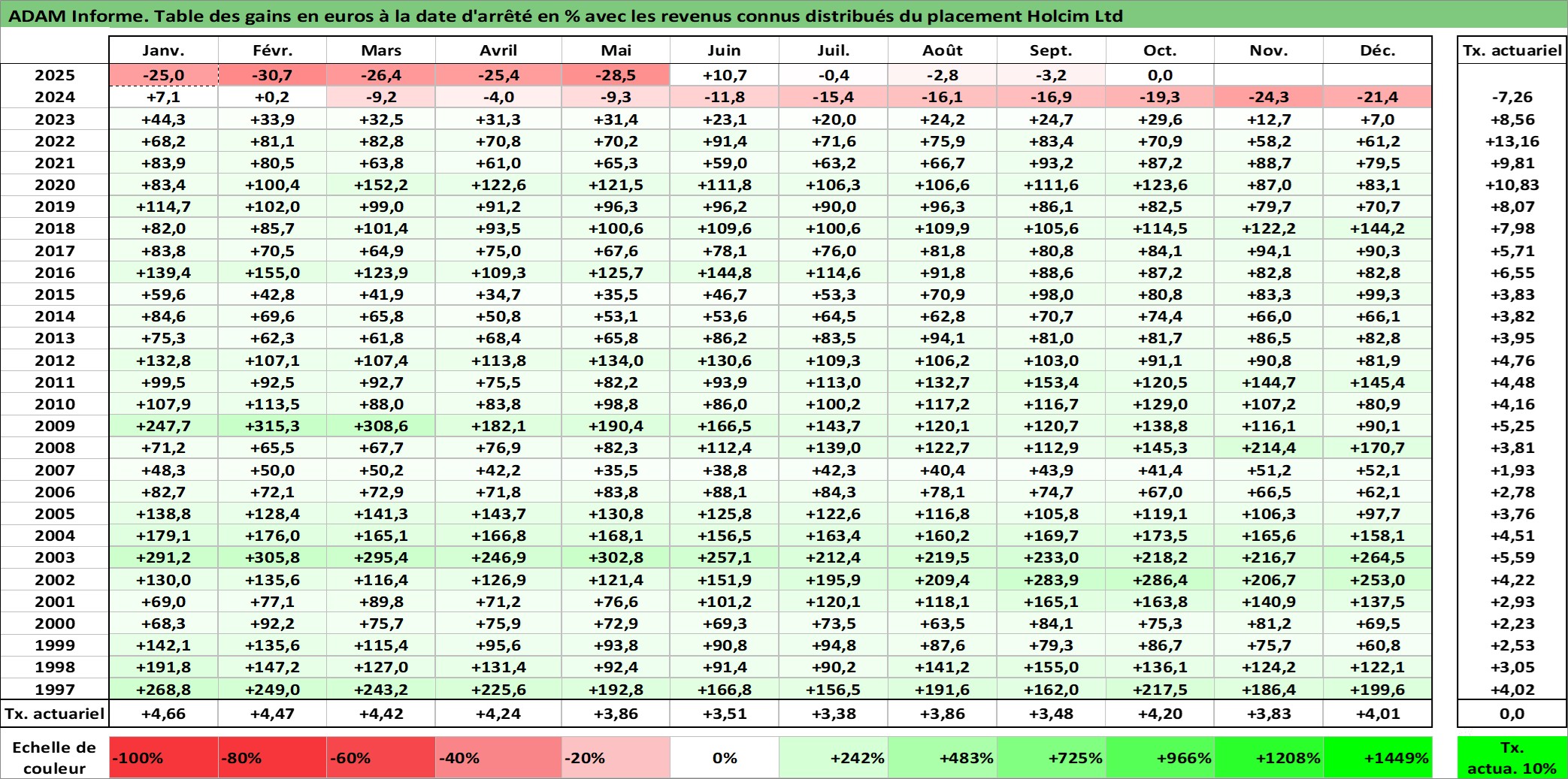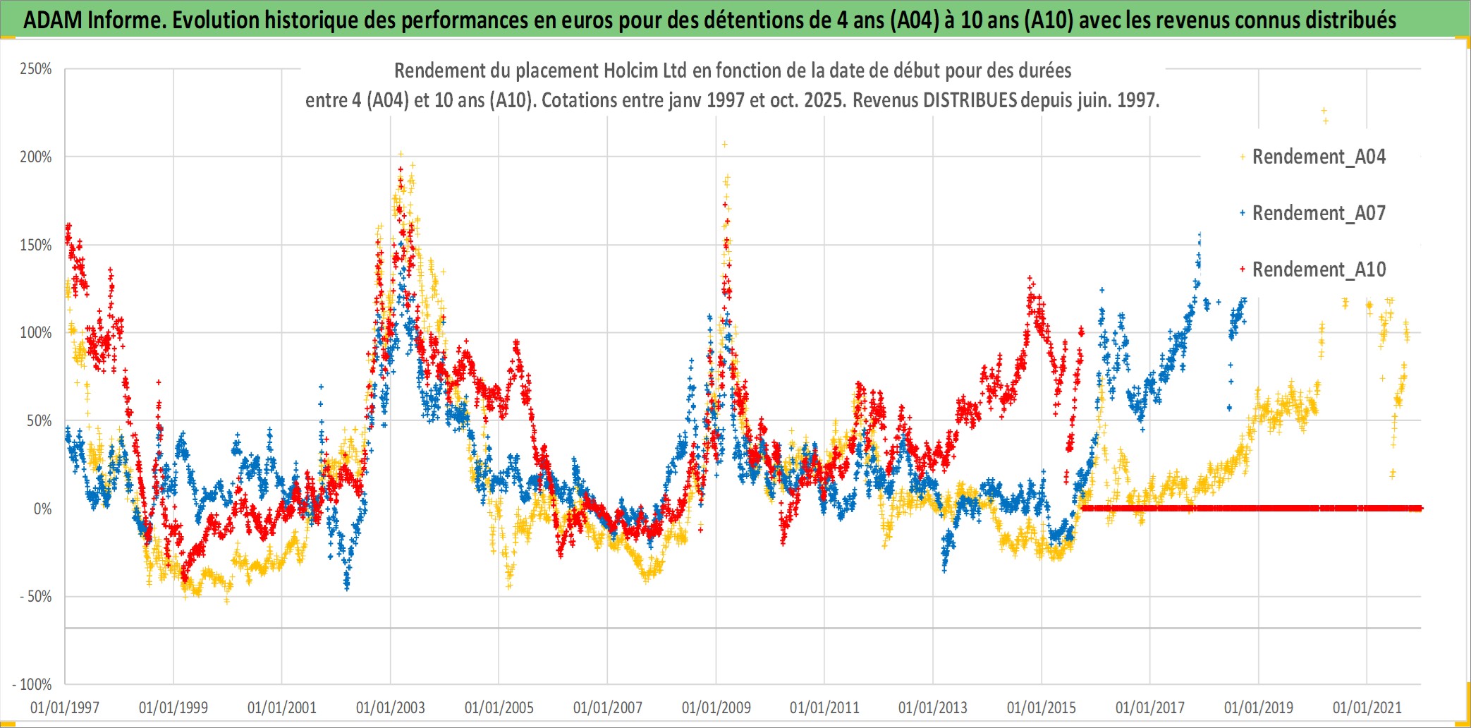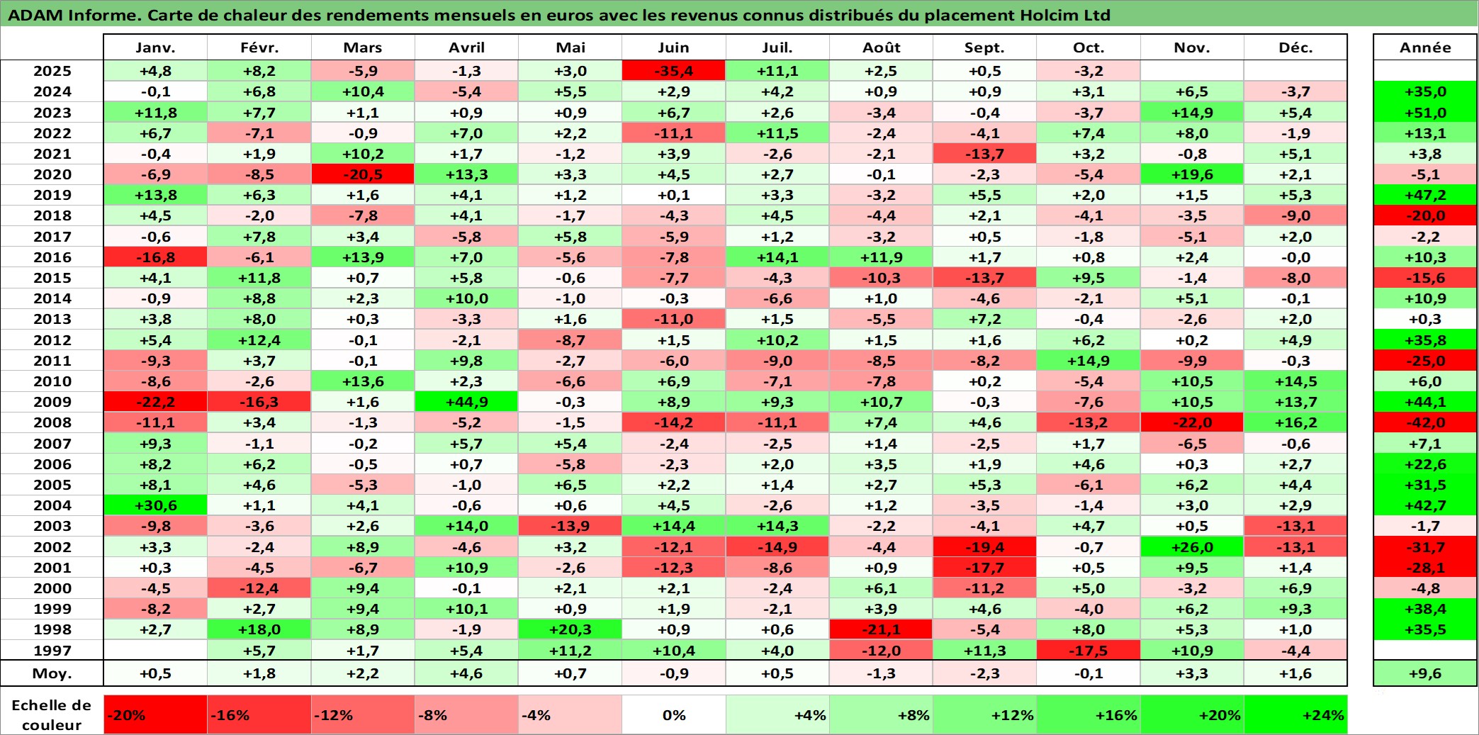Site dédié aux investisseursPage dédiée sur site financeAnalyse des valorisations hebdomadaires de l'action Holcim Ltd. Cet actif est cote en CHF. Les valorisations sont en contrevaleur EURO et couvrent les semaines 1997W01 a 2025W40. Les revenus de cet actif financier sont pris en compte depuis la semaine 1997W24. La note globale ESG de cet actif est estimee a 10.0 (apres rebasage entre 0 et 20).