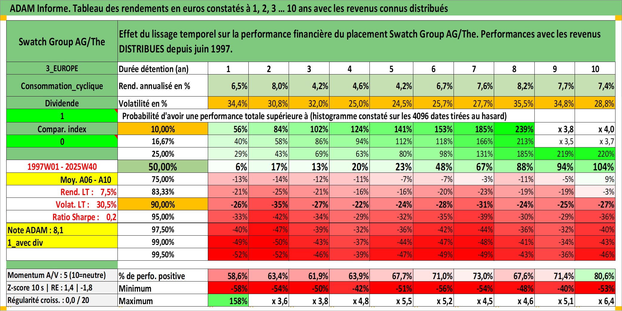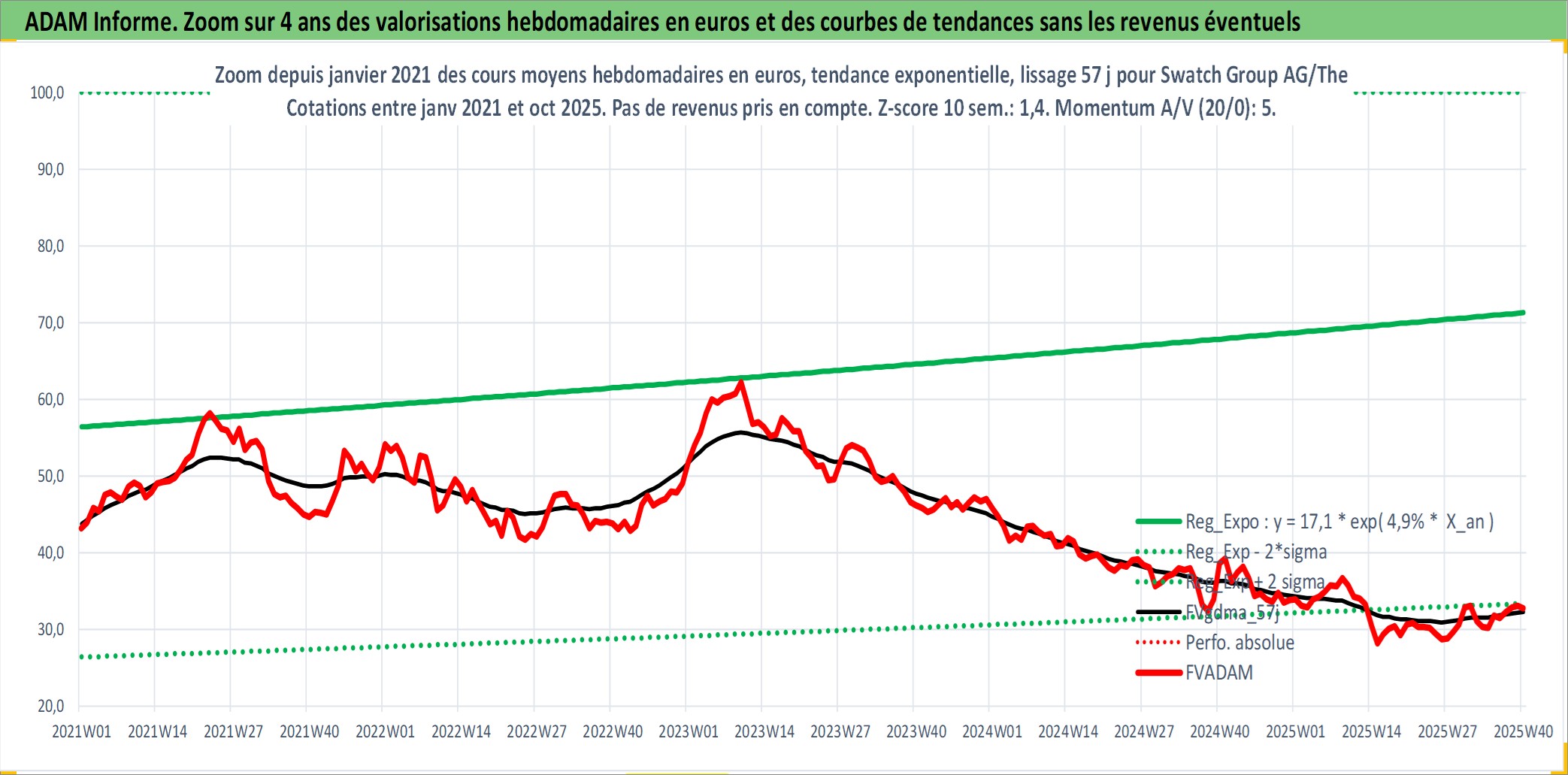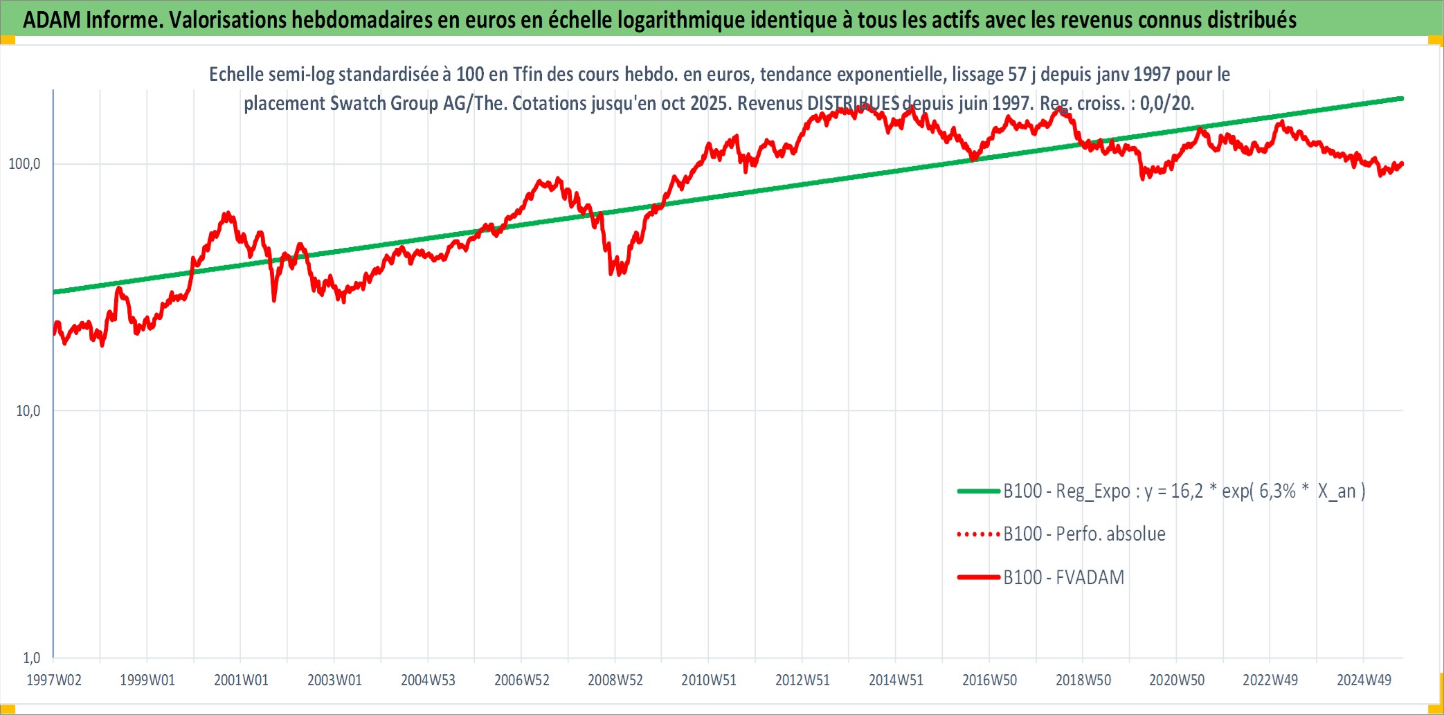 Site dédié aux investisseursPage dédiée sur site financeAnalyse des valorisations hebdomadaires de l'action Swatch Group AG/The. Cet actif est cote en CHF. Les valorisations sont en contrevaleur EURO et couvrent les semaines 1997W01 a 2025W40. Les revenus de cet actif financier sont pris en compte depuis la semaine 1997W26. La note ESG de cet actif n'est pas connue.