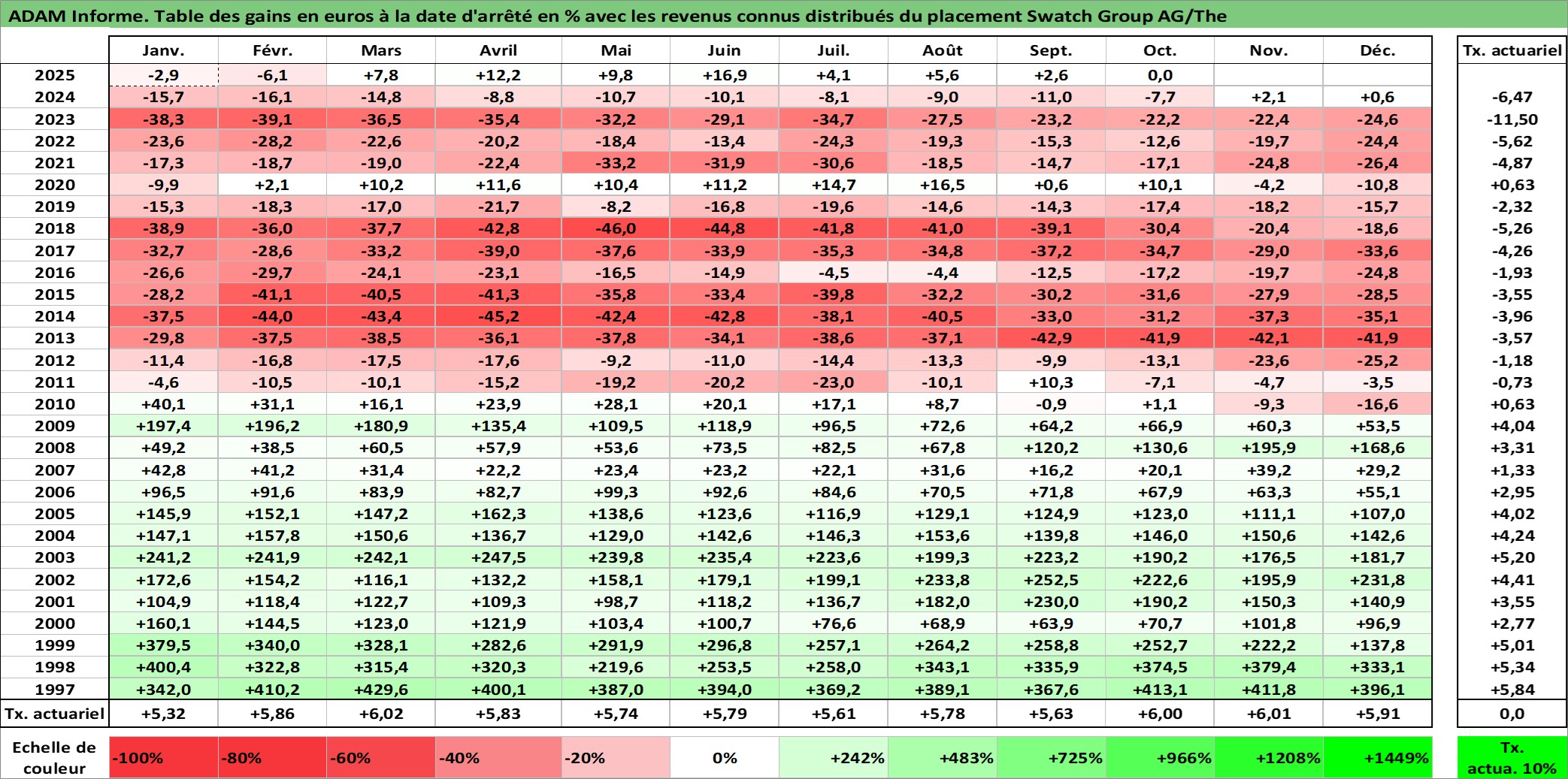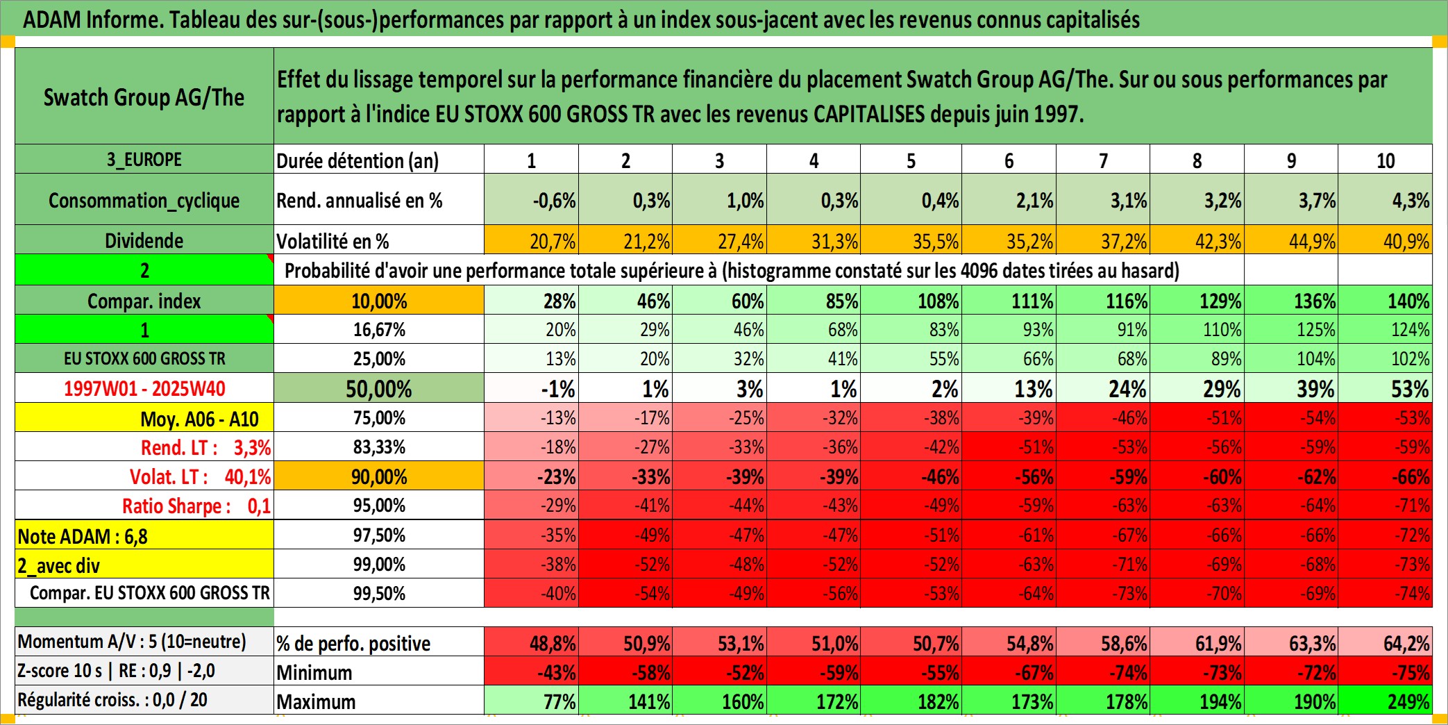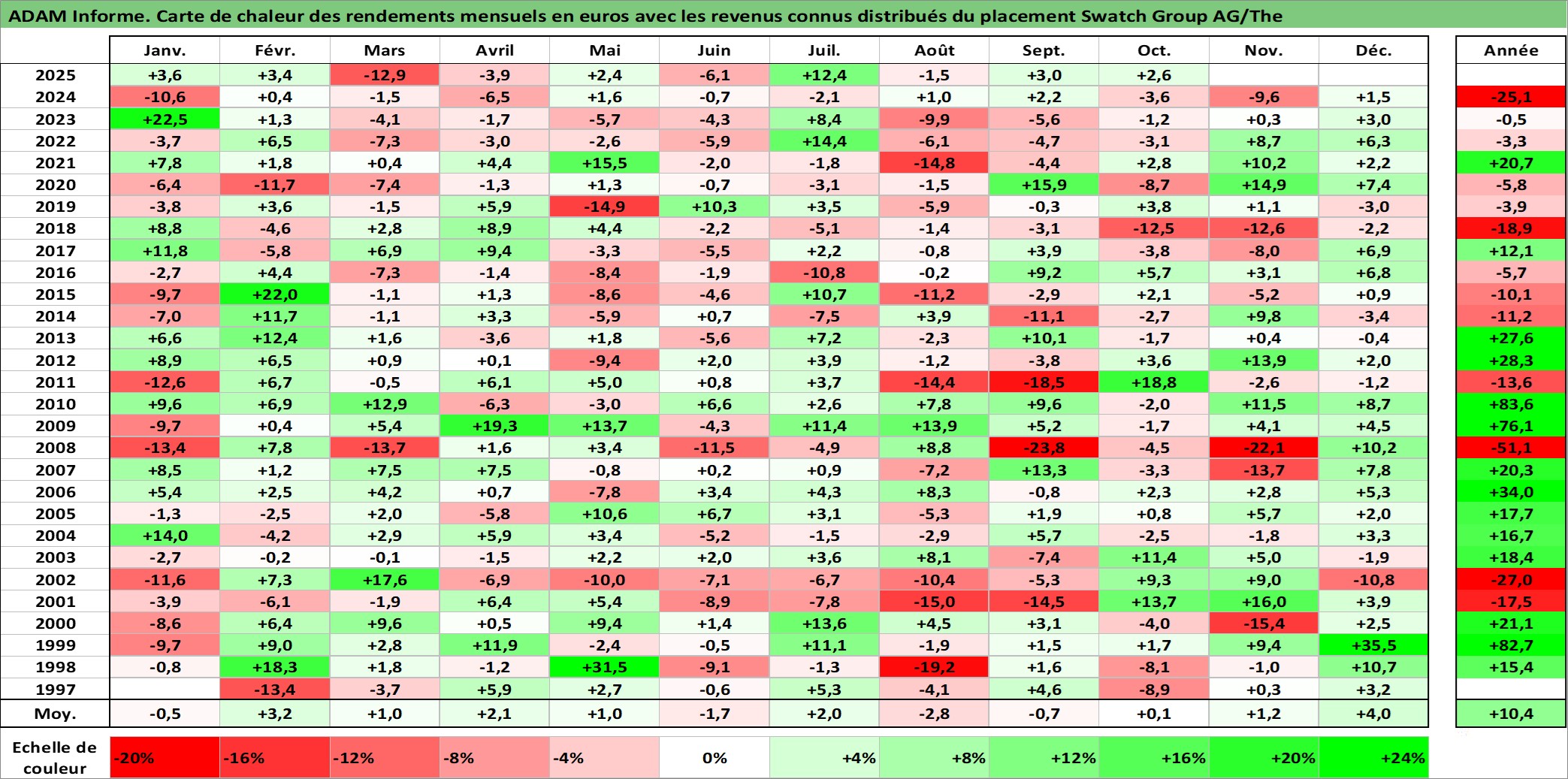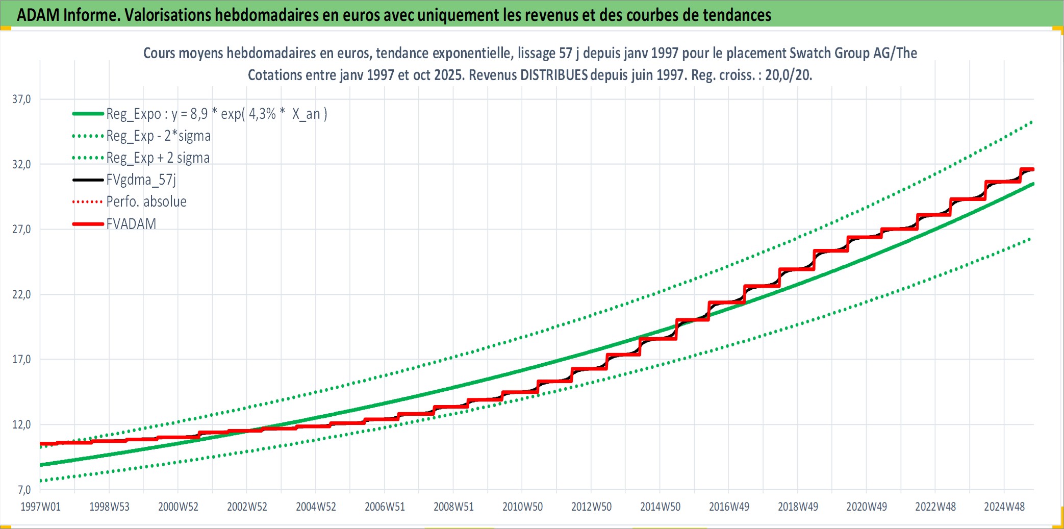Site dédié aux investisseursPage dédiée sur site financeAnalyse des valorisations hebdomadaires de l'action Swatch Group AG/The. Cet actif est cote en CHF. Les valorisations sont en contrevaleur EURO et couvrent les semaines 1997W01 a 2025W40. Les revenus de cet actif financier sont pris en compte depuis la semaine 1997W26. La note ESG de cet actif n'est pas connue.