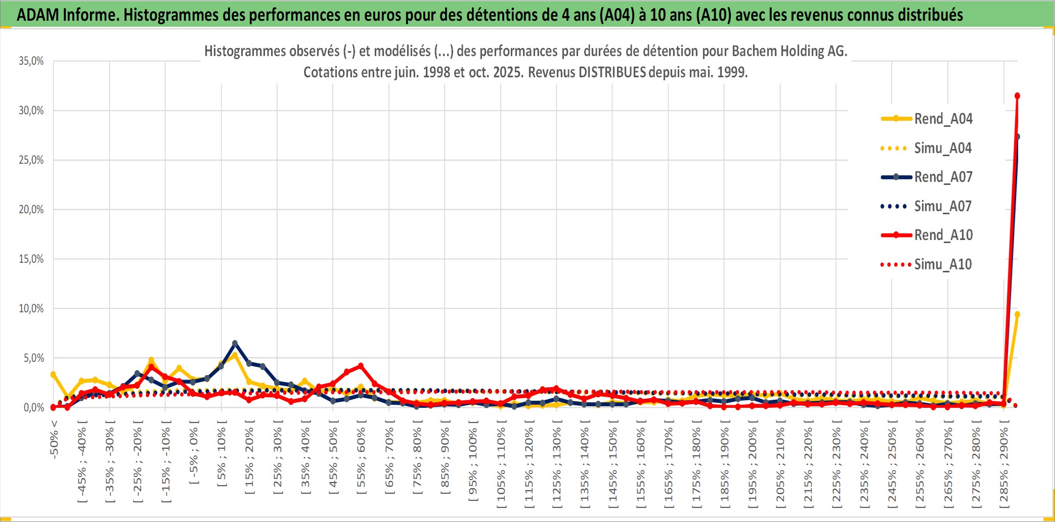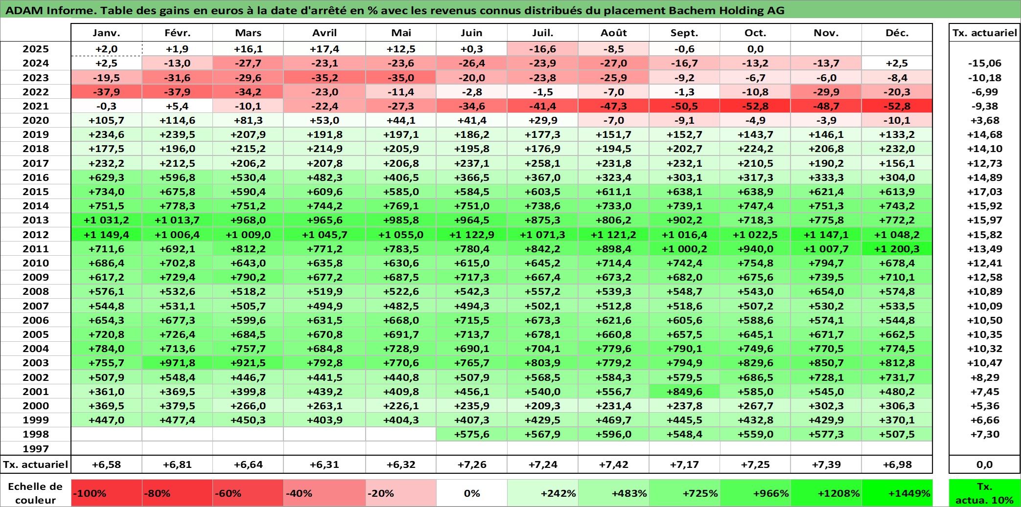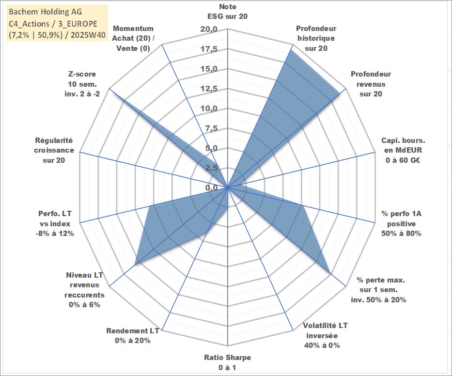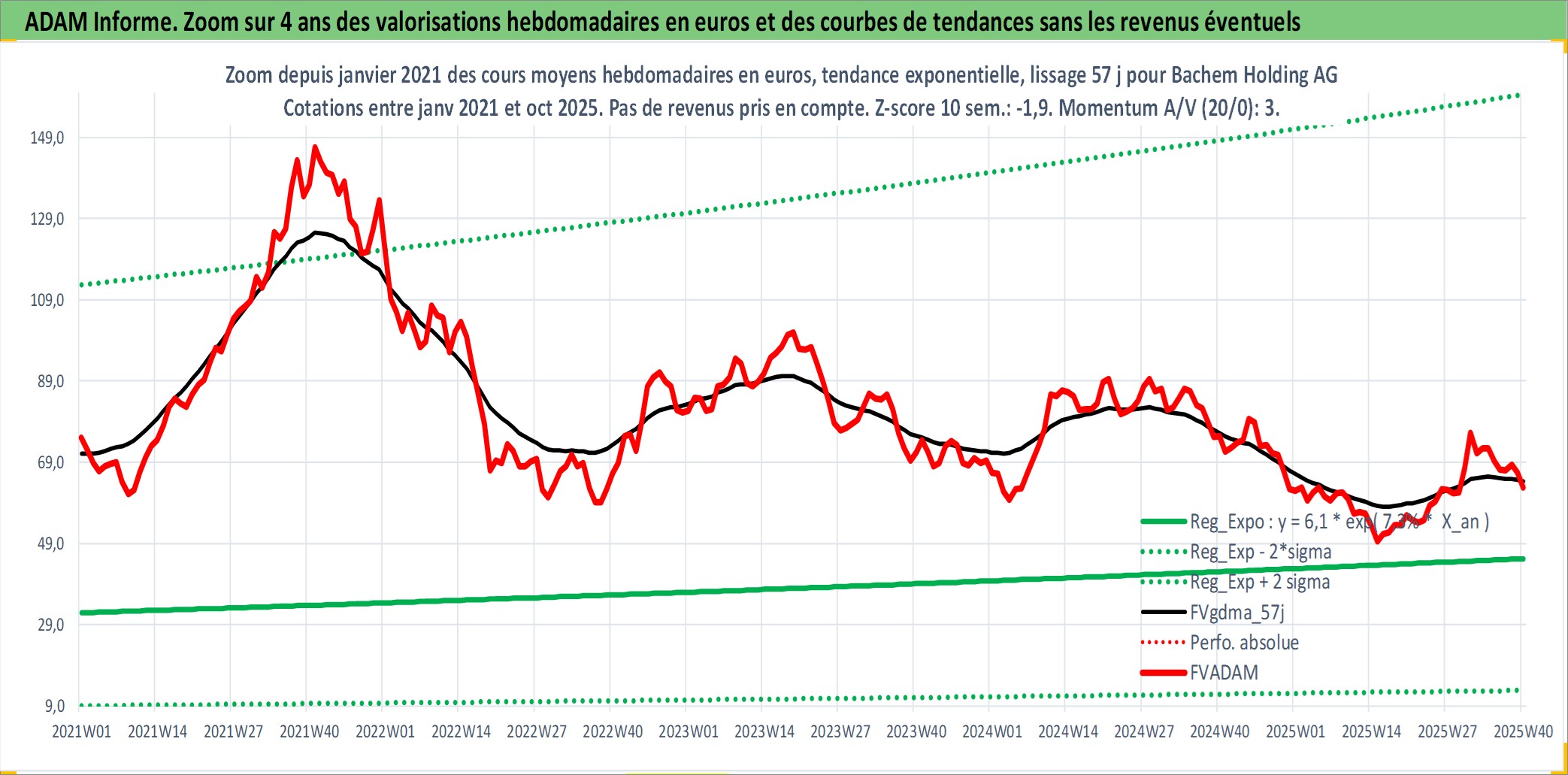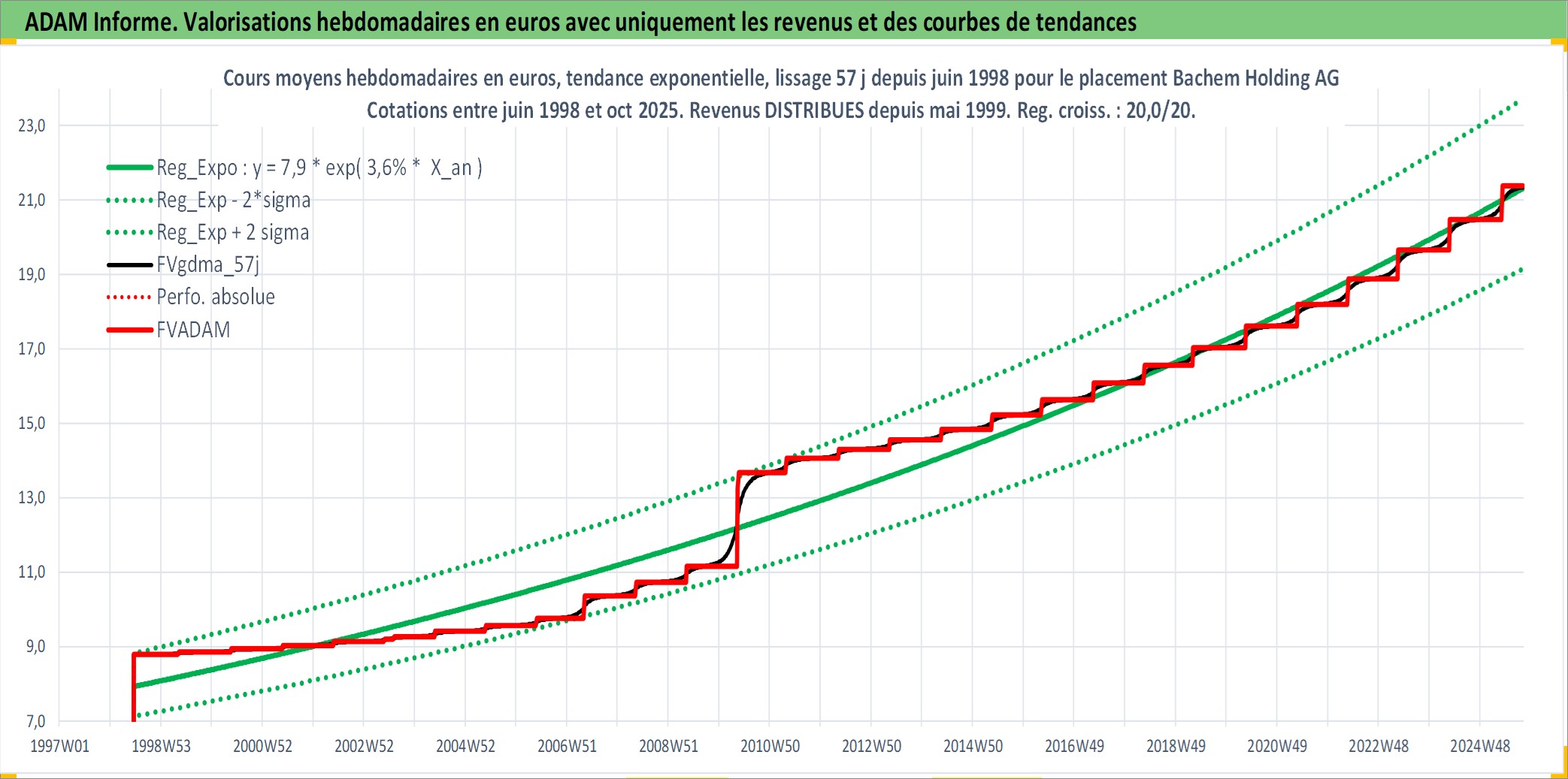 Site dédié aux investisseursPage dédiée sur site financeAnalyse des valorisations hebdomadaires de l'action Bachem Holding AG. Cet actif est cote en CHF. Les valorisations sont en contrevaleur EURO et couvrent les semaines 1998W25 a 2025W40. Les revenus de cet actif financier sont pris en compte depuis la semaine 1999W18. La note ESG de cet actif n'est pas connue.