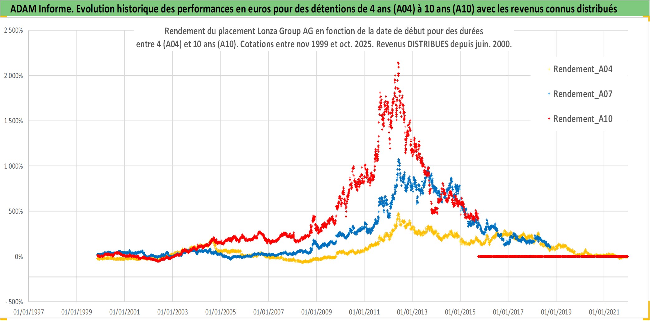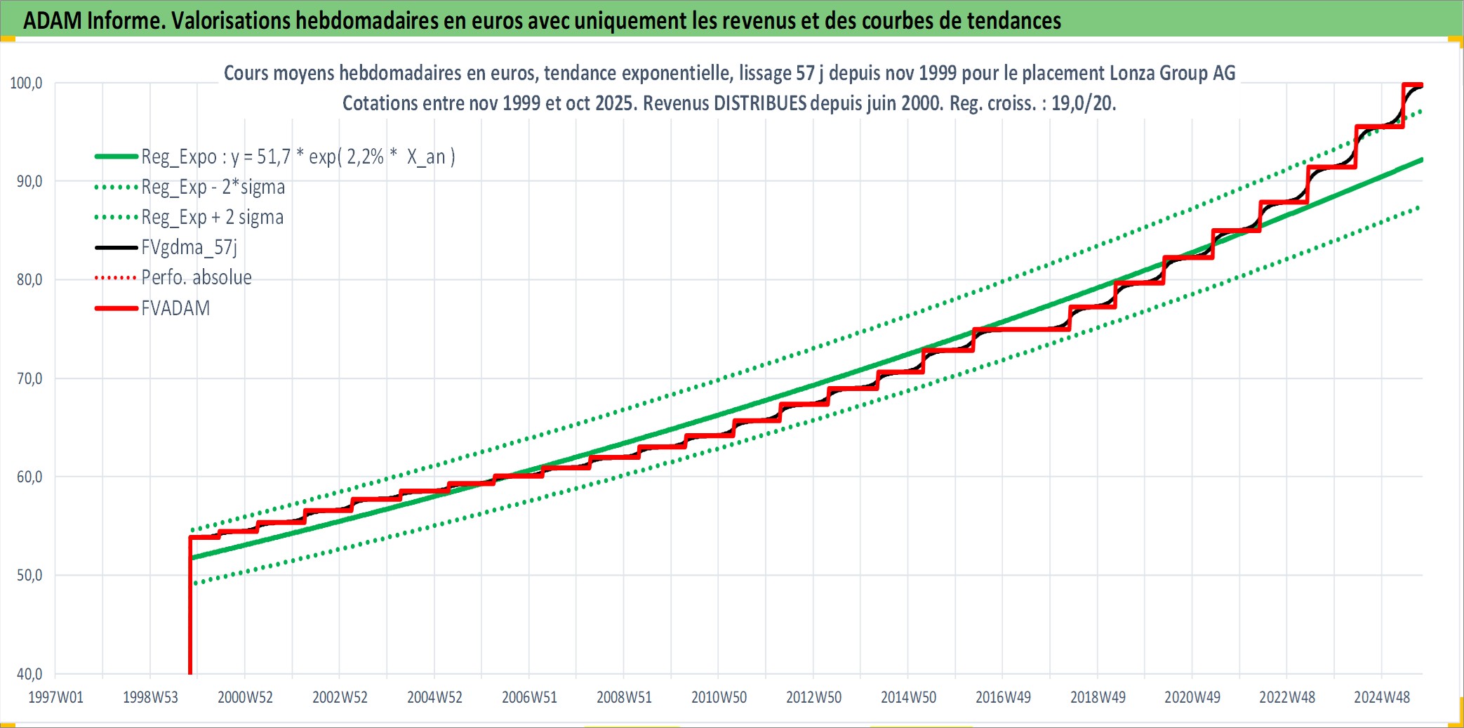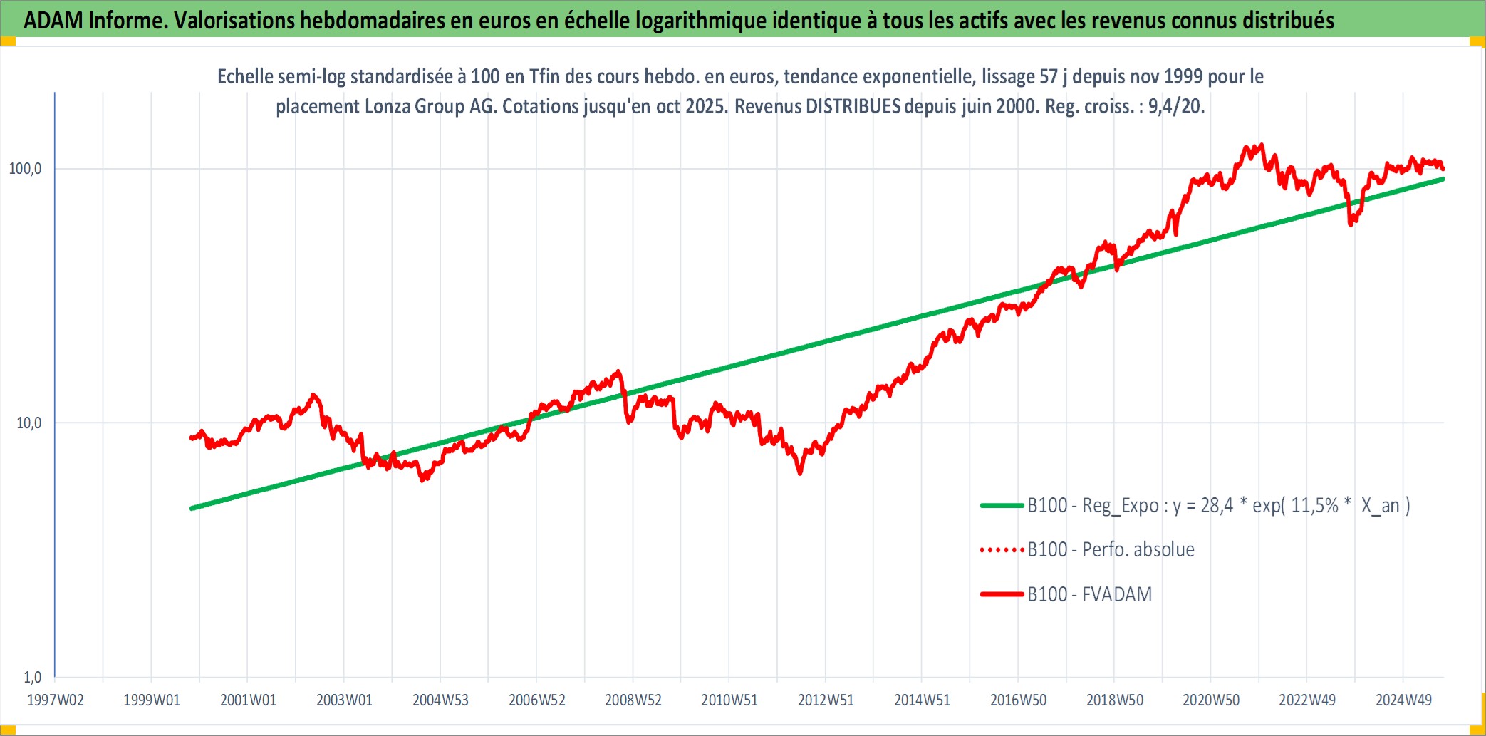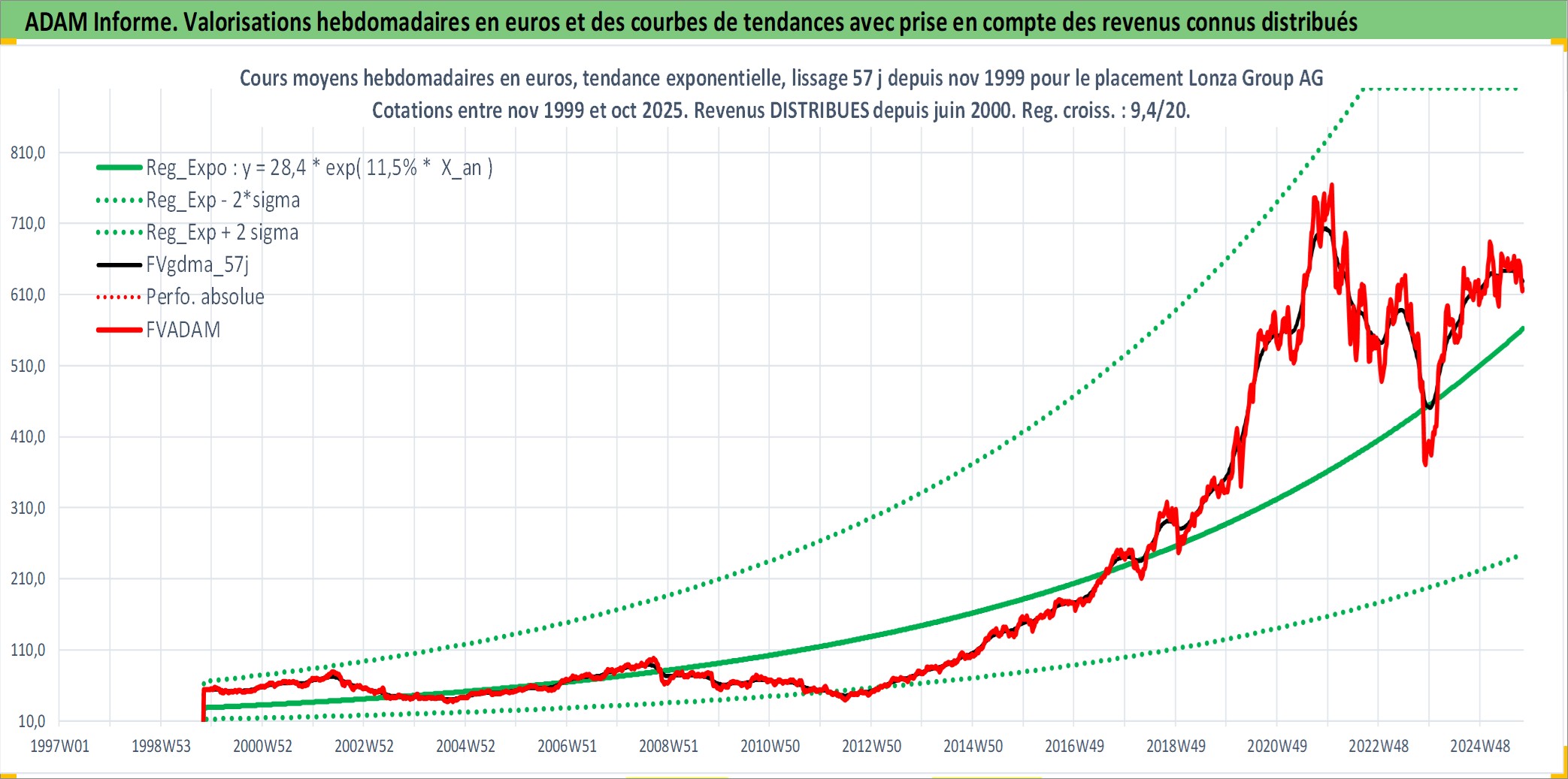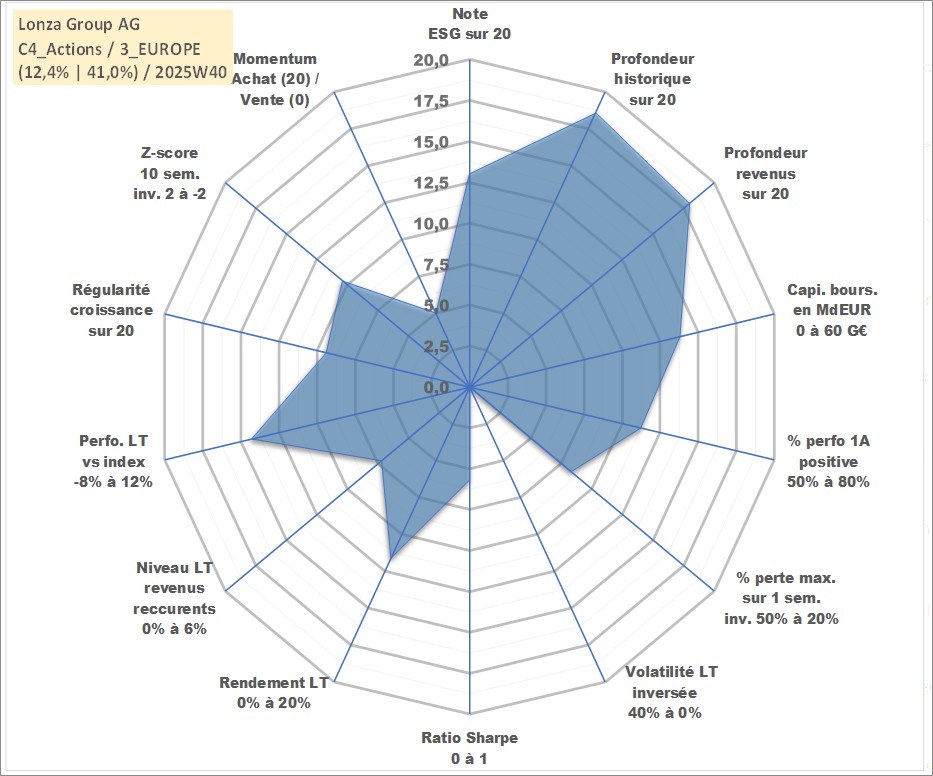Site dédié aux investisseursPage dédiée sur site financeAnalyse des valorisations hebdomadaires de l'action Lonza Group AG. Cet actif est cote en CHF. Les valorisations sont en contrevaleur EURO et couvrent les semaines 1999W44 a 2025W40. Les revenus de cet actif financier sont pris en compte depuis la semaine 2000W24. La note globale ESG de cet actif est estimee a 13.0 (apres rebasage entre 0 et 20).