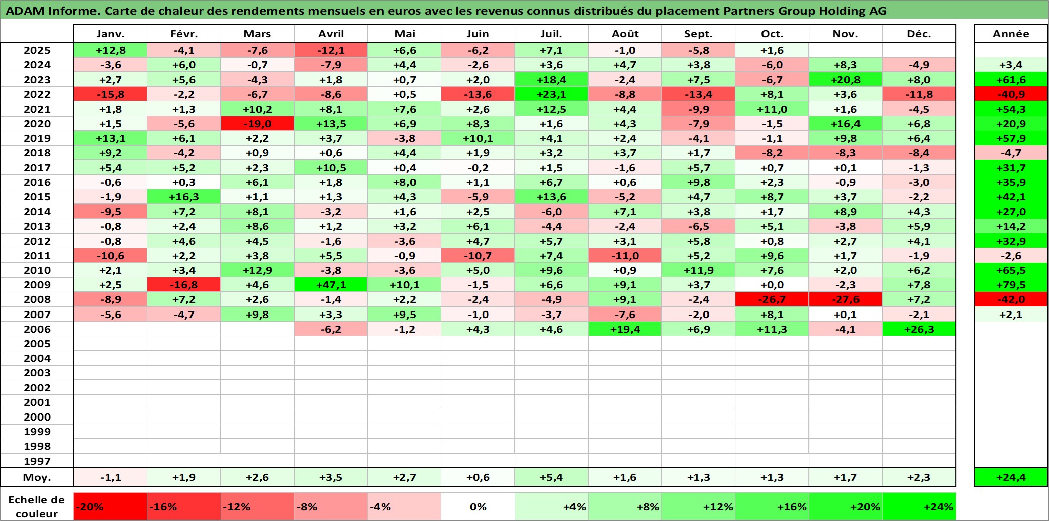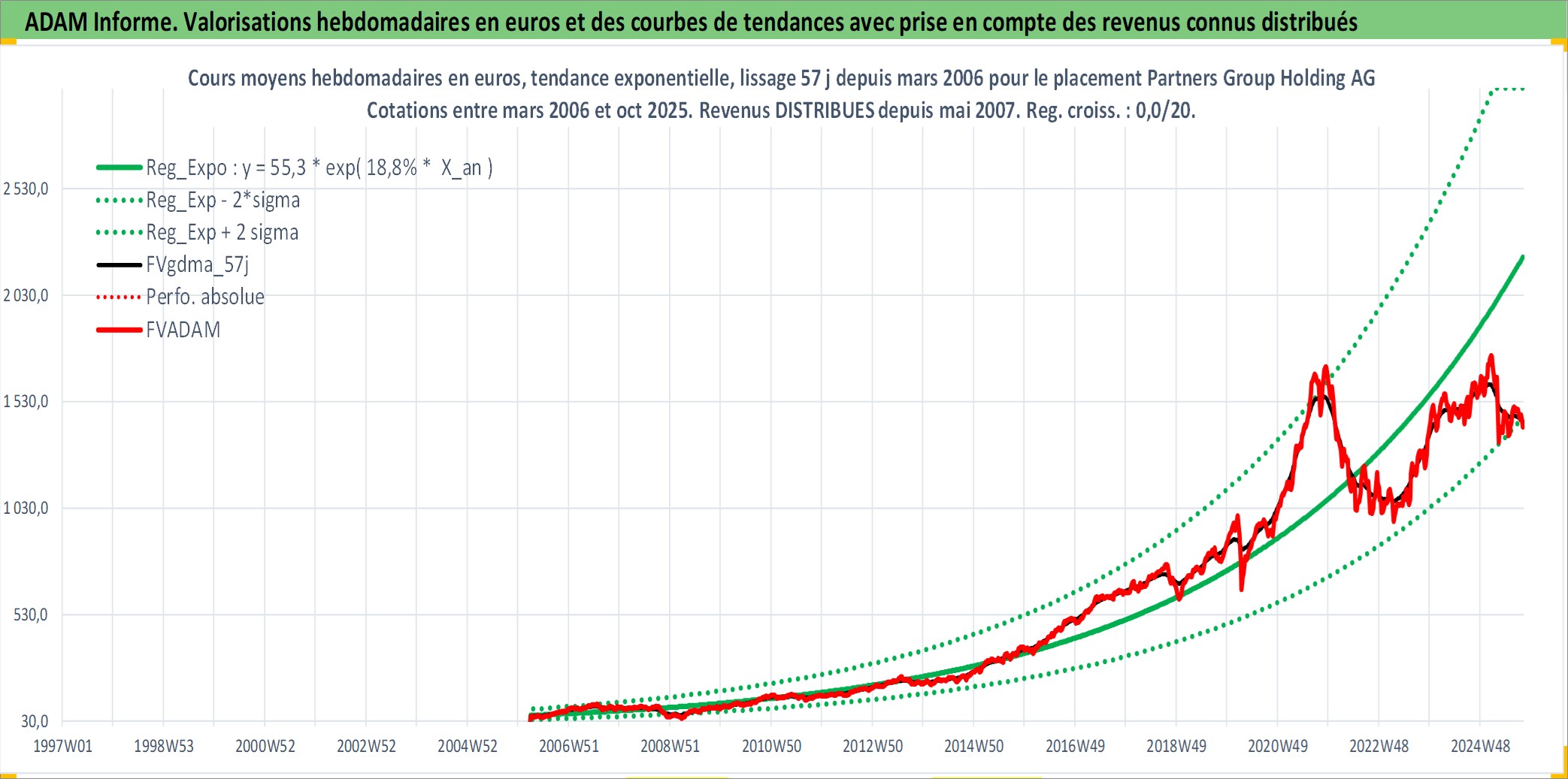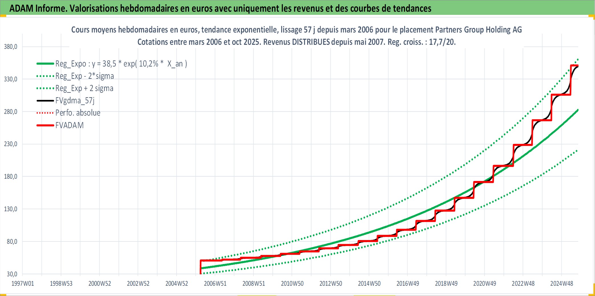 Site dédié aux investisseursPage dédiée sur site financeAnalyse des valorisations hebdomadaires de l'action Partners Group Holding AG. Cet actif est cote en CHF. Les valorisations sont en contrevaleur EURO et couvrent les semaines 2006W12 a 2025W40. Les revenus de cet actif financier sont pris en compte depuis la semaine 2007W18. La note globale ESG de cet actif est estimee a 11.0 (apres rebasage entre 0 et 20).