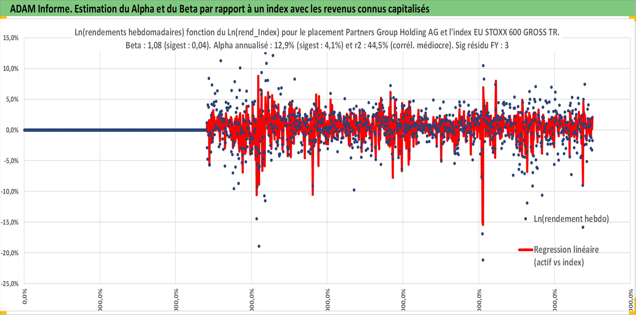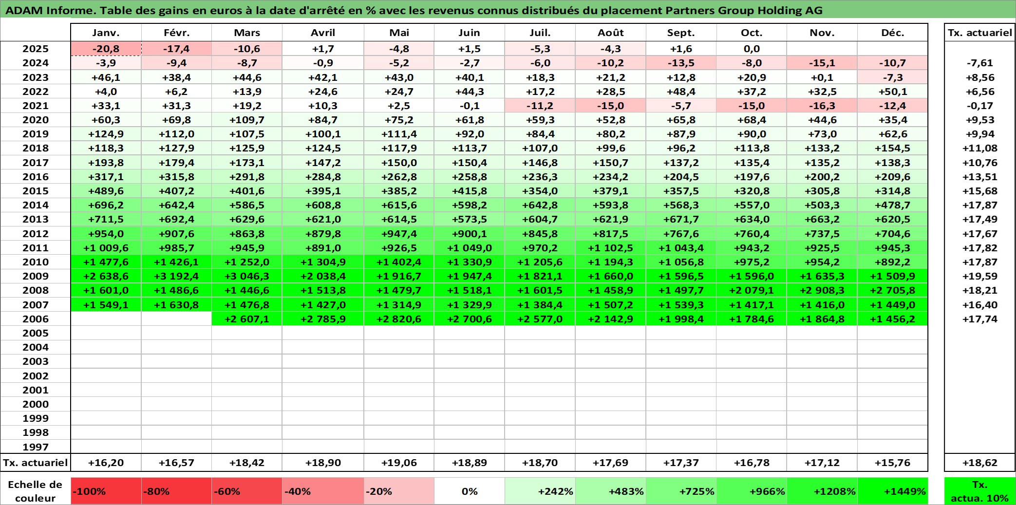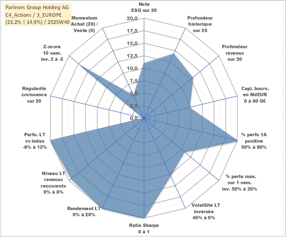Site dédié aux investisseursPage dédiée sur site financeAnalyse des valorisations hebdomadaires de l'action Partners Group Holding AG. Cet actif est cote en CHF. Les valorisations sont en contrevaleur EURO et couvrent les semaines 2006W12 a 2025W40. Les revenus de cet actif financier sont pris en compte depuis la semaine 2007W18. La note globale ESG de cet actif est estimee a 11.0 (apres rebasage entre 0 et 20).