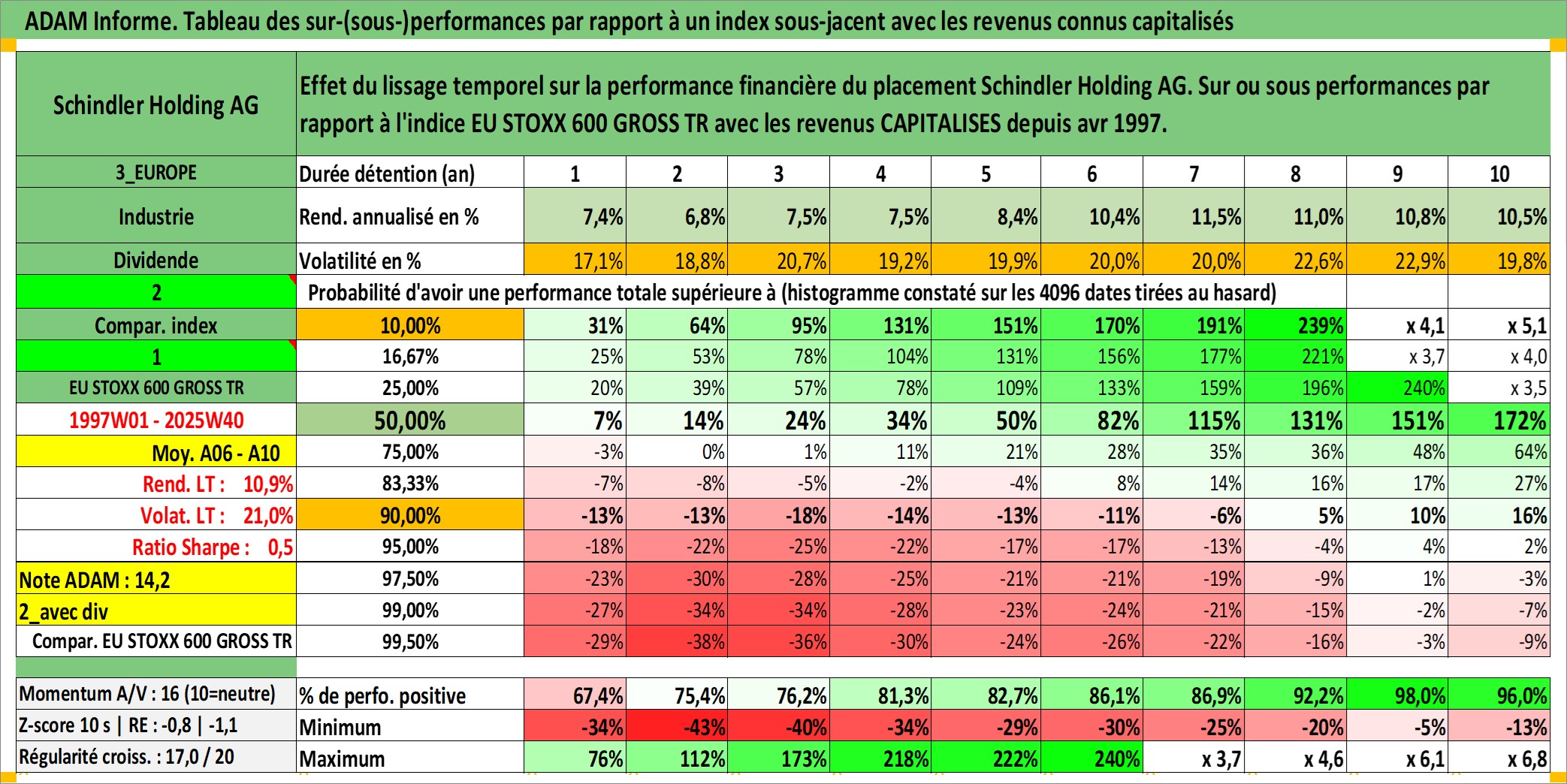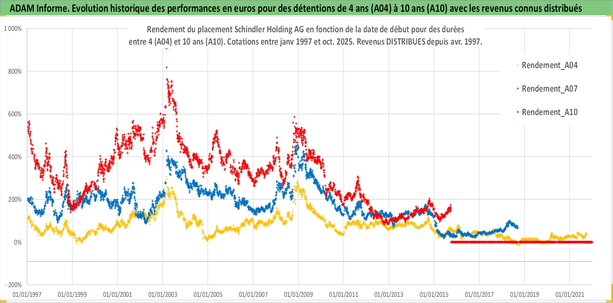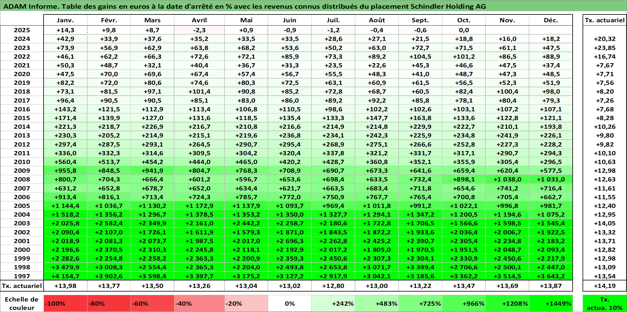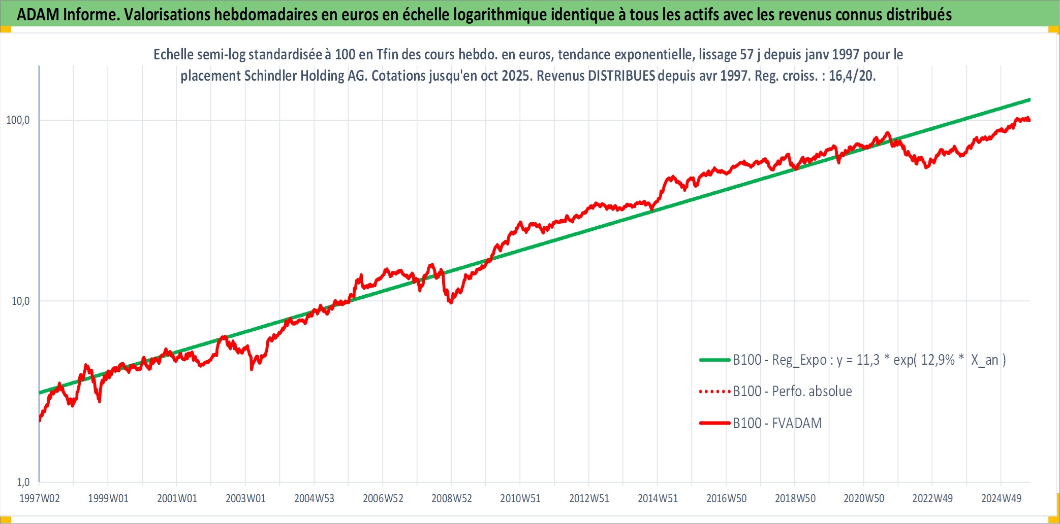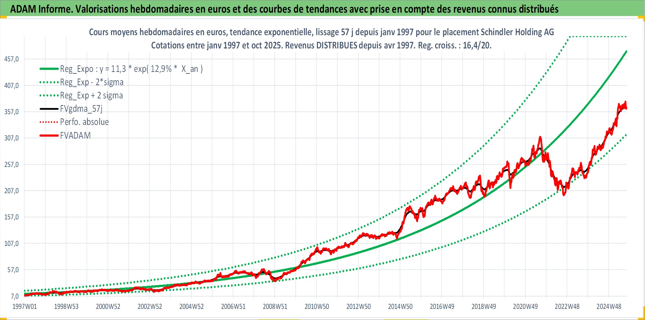 Site dédié aux investisseursPage dédiée sur site financeAnalyse des valorisations hebdomadaires de l'action Schindler Holding AG. Cet actif est cote en CHF. Les valorisations sont en contrevaleur EURO et couvrent les semaines 1997W01 a 2025W40. Les revenus de cet actif financier sont pris en compte depuis la semaine 1997W17. La note ESG de cet actif n'est pas connue.