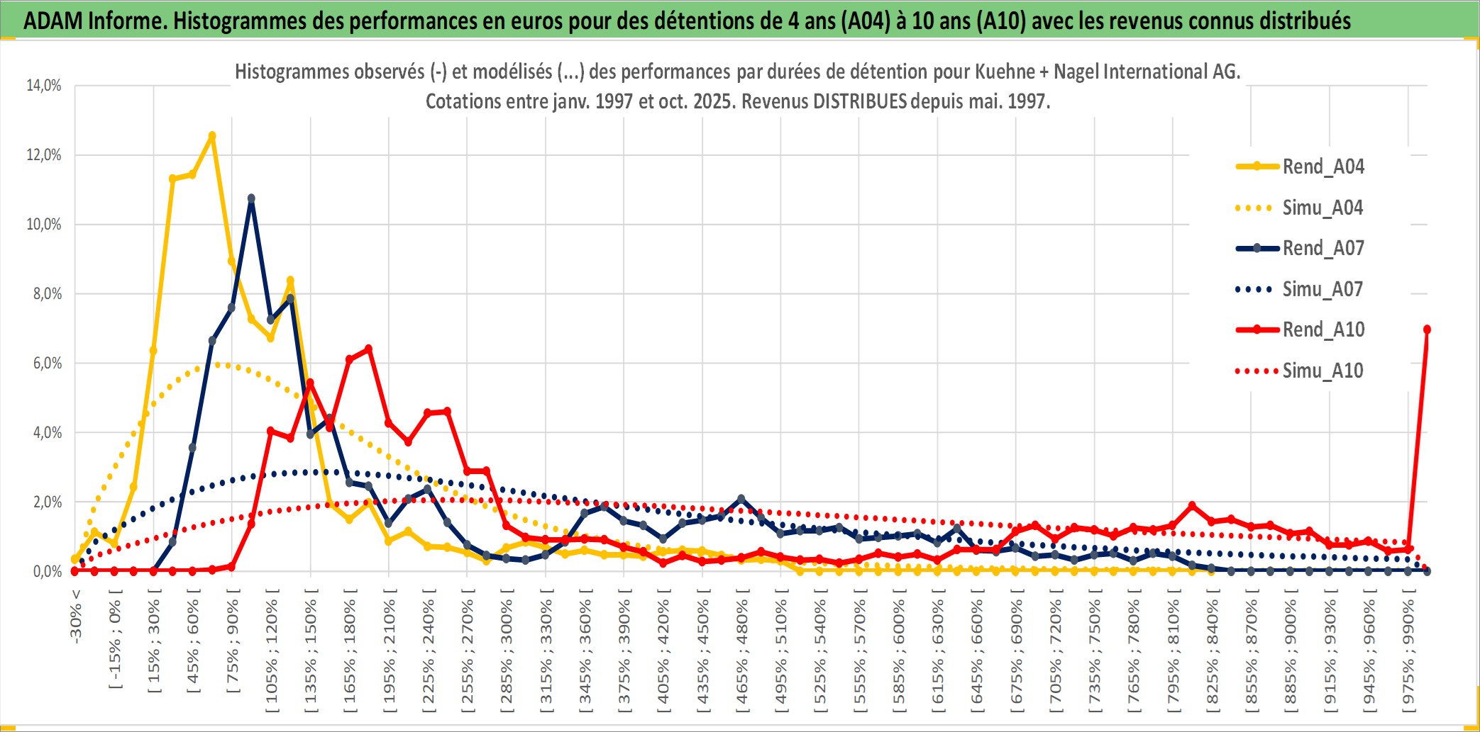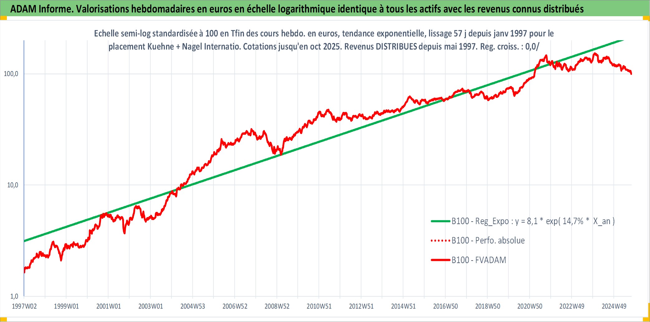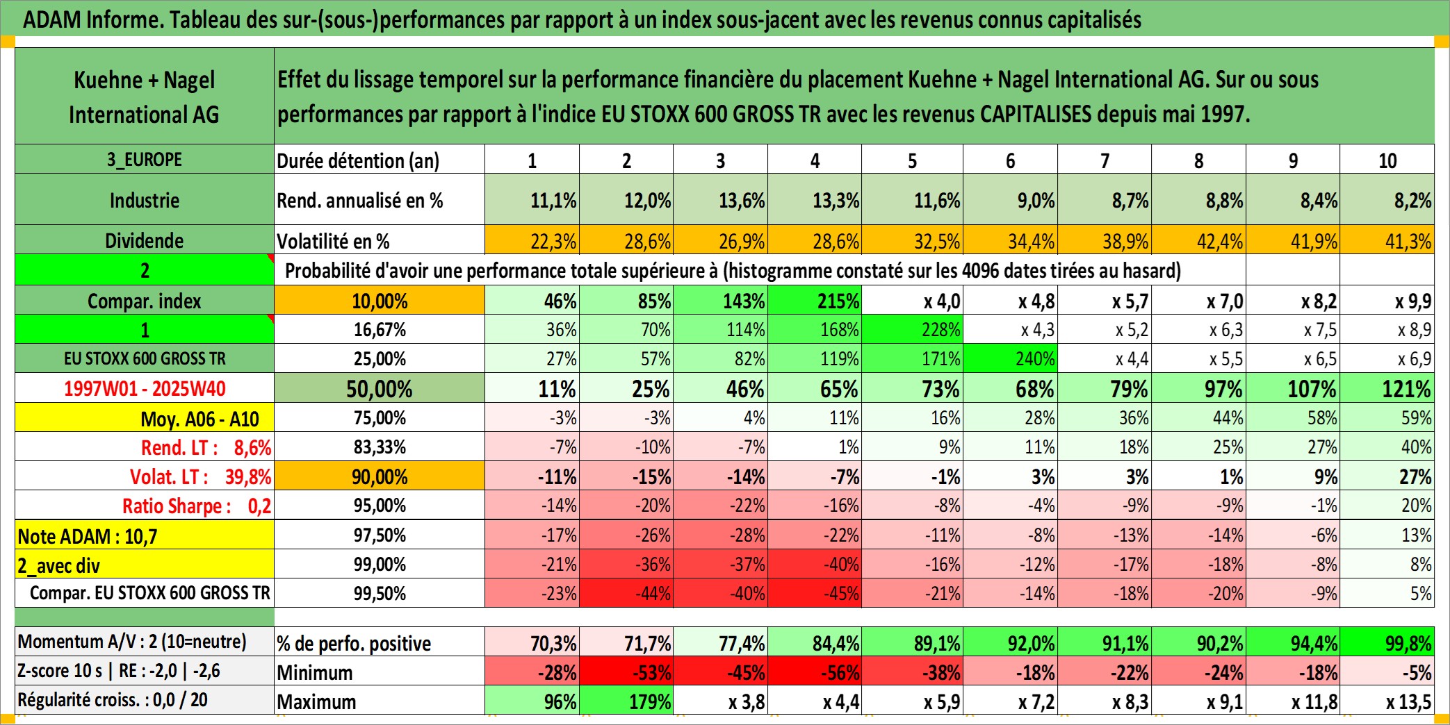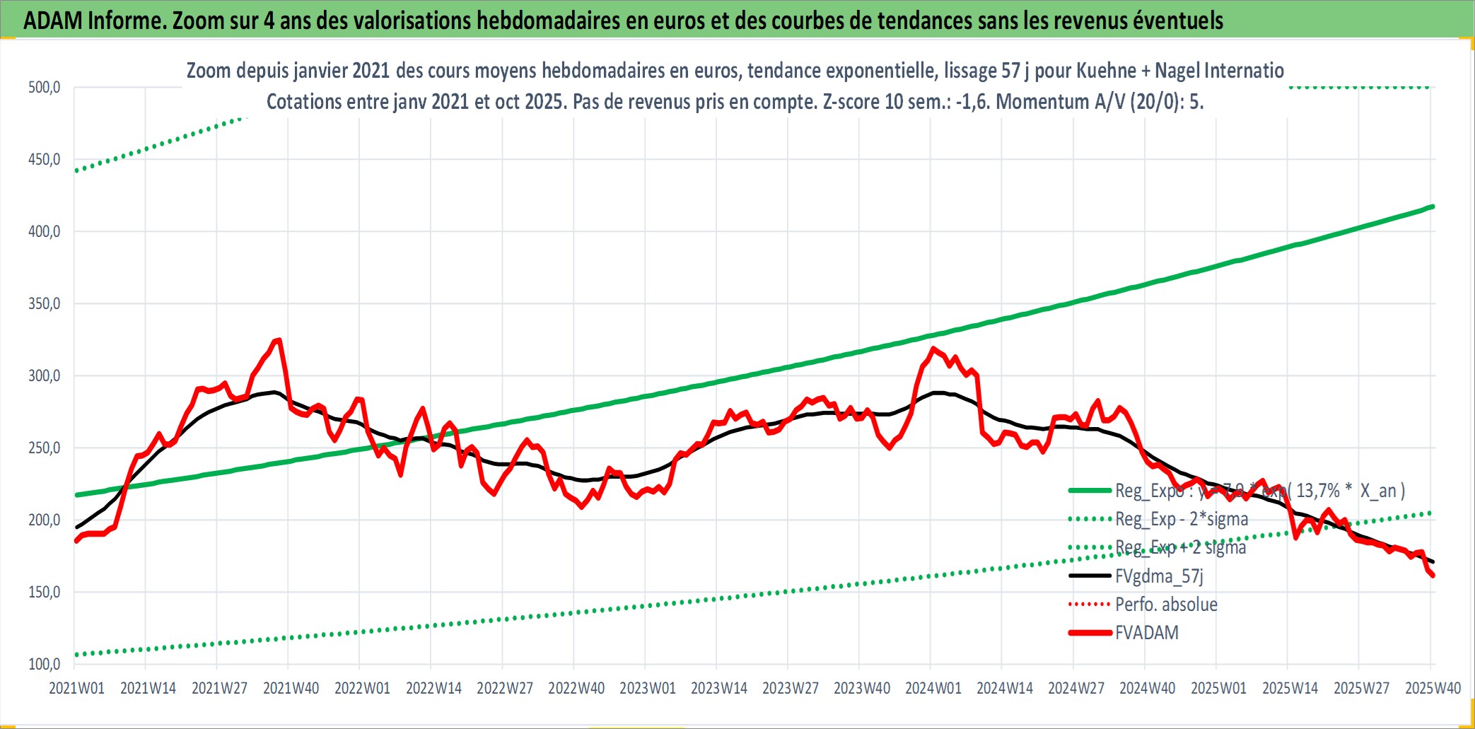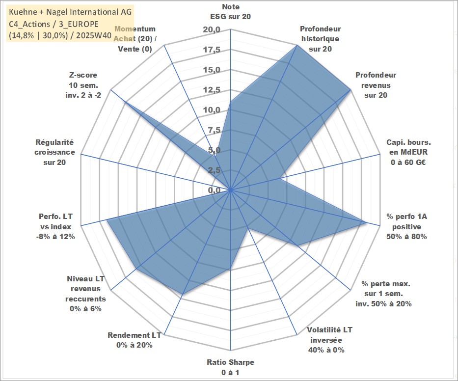 Site dédié aux investisseursPage dédiée sur site financeAnalyse des valorisations hebdomadaires de l'action Kuehne + Nagel International AG. Cet actif est cote en CHF. Les valorisations sont en contrevaleur EURO et couvrent les semaines 1997W01 a 2025W40. Les revenus de cet actif financier sont pris en compte depuis la semaine 1997W20. La note globale ESG de cet actif est estimee a 11.0 (apres rebasage entre 0 et 20).