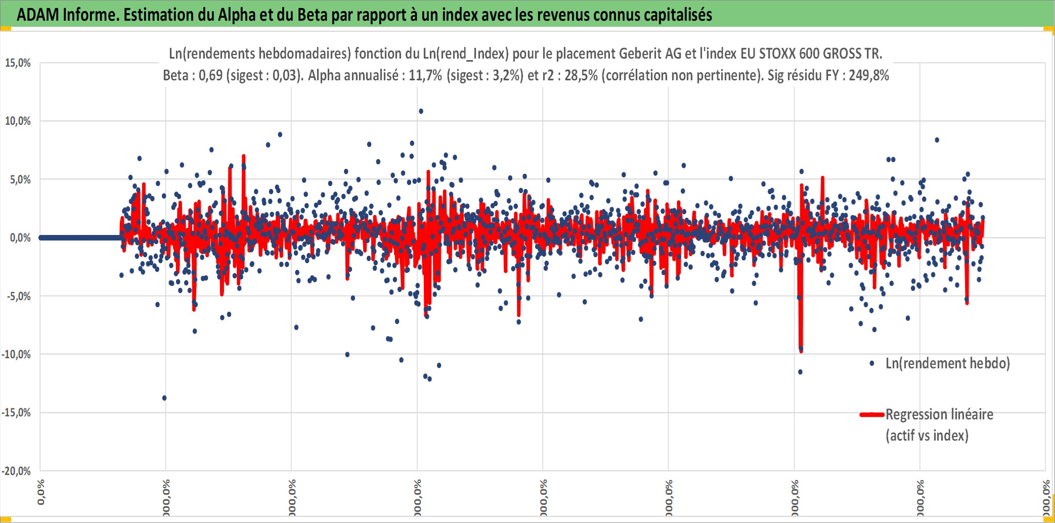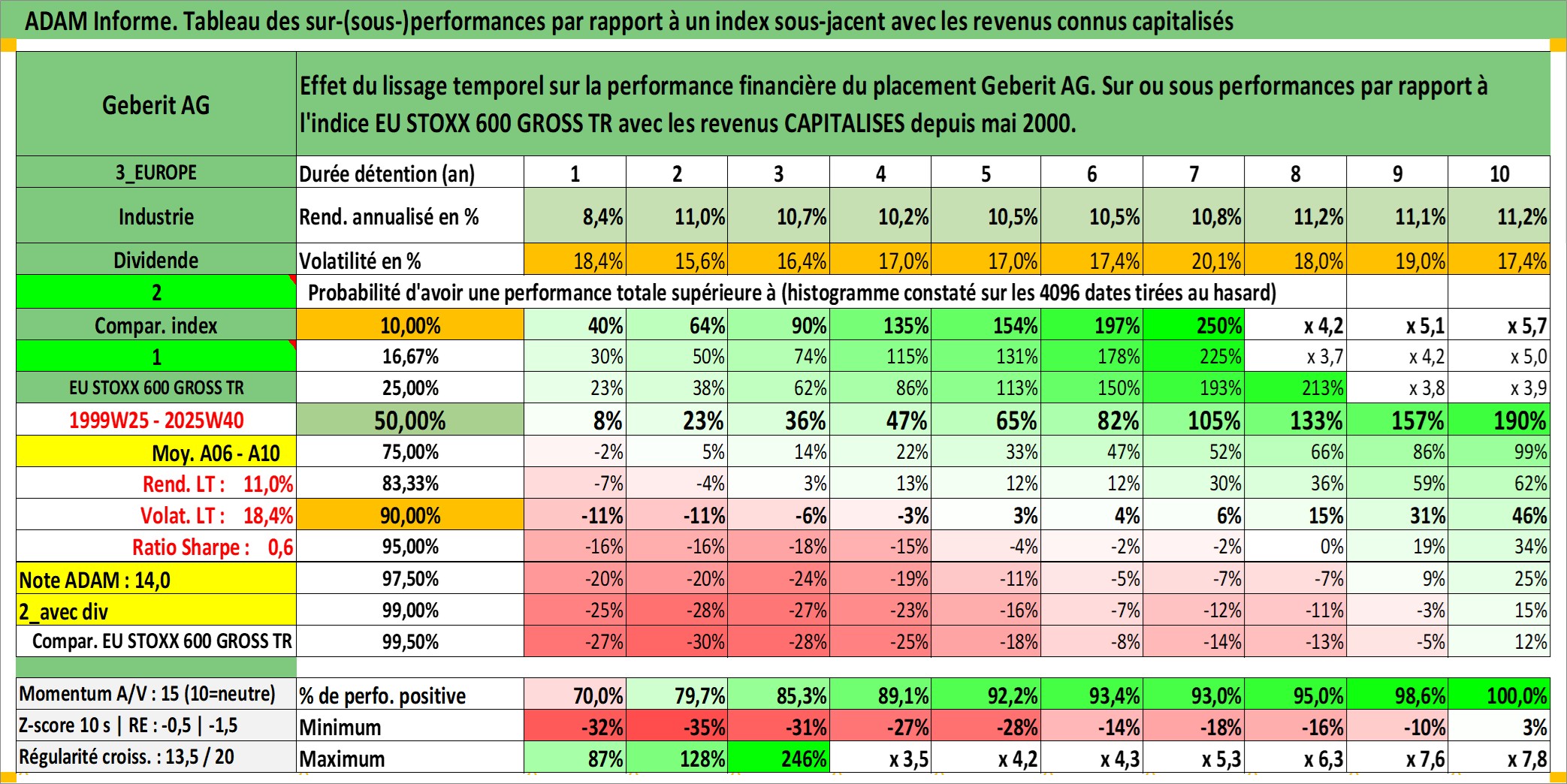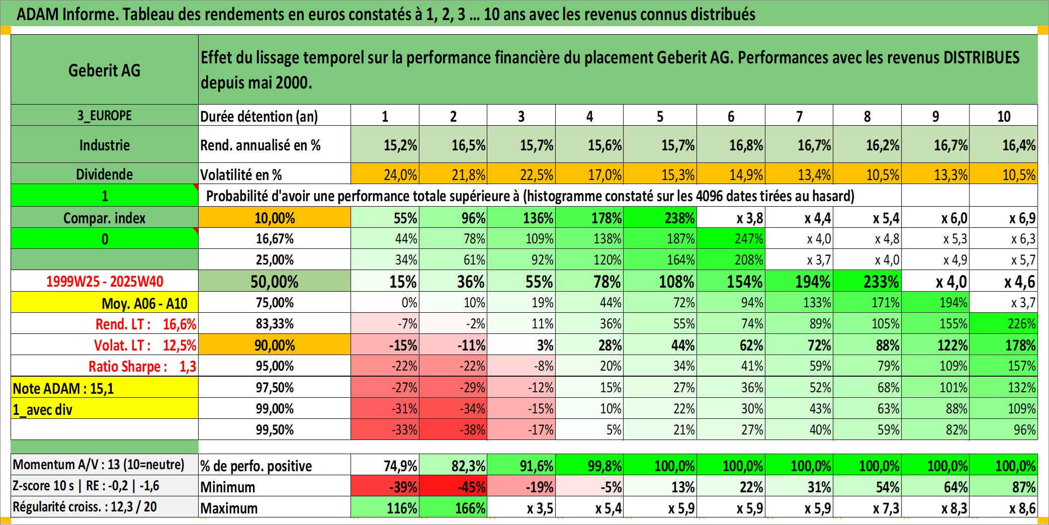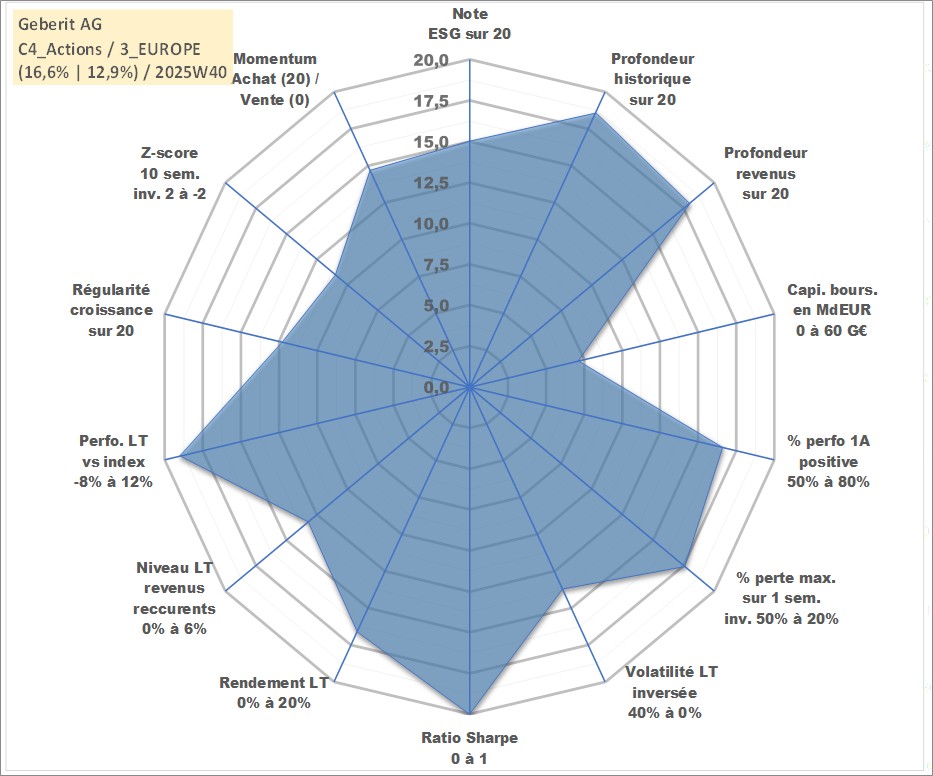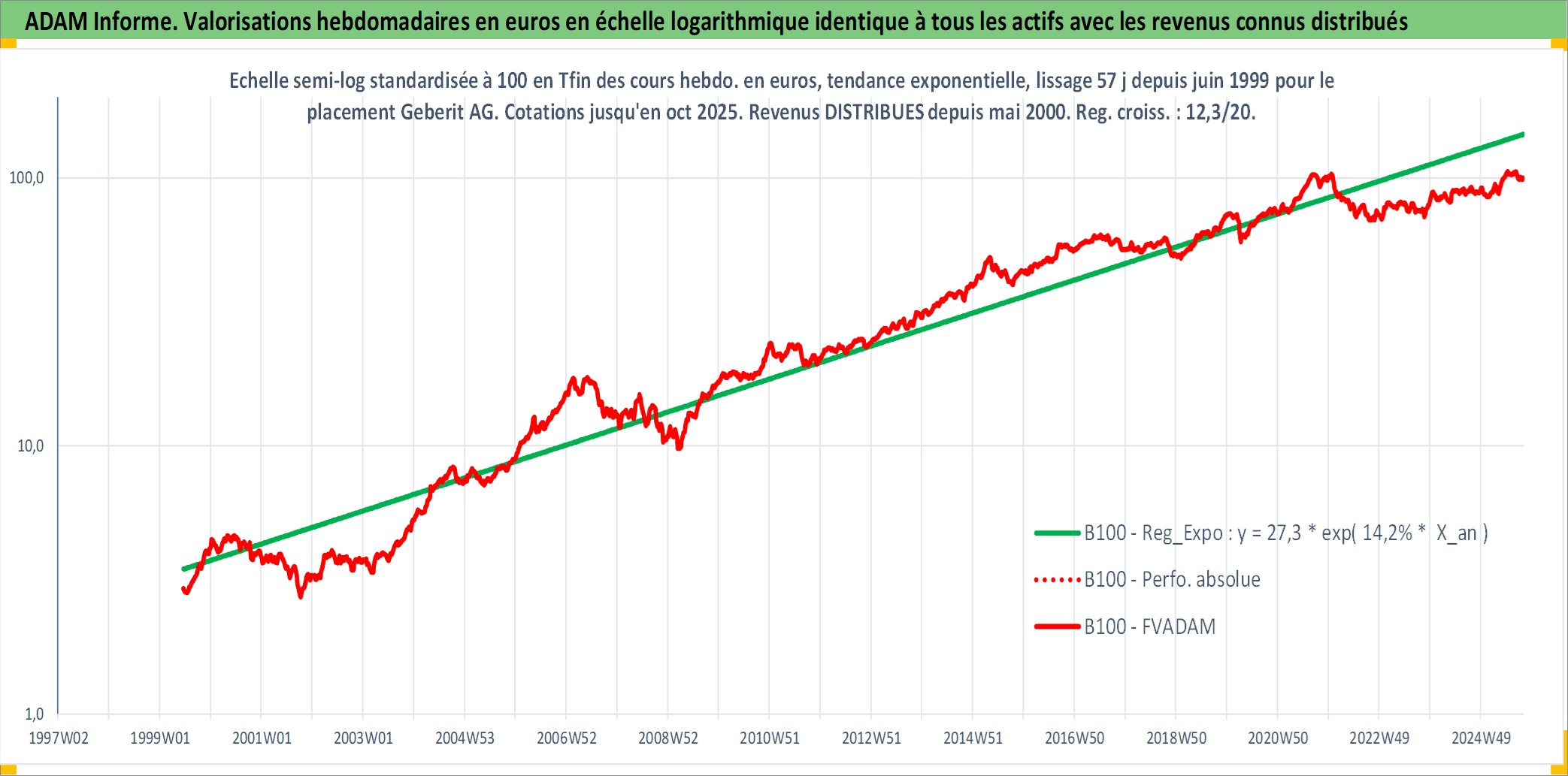 Site dédié aux investisseursPage dédiée sur site financeAnalyse des valorisations hebdomadaires de l'action Geberit AG. Cet actif est cote en CHF. Les valorisations sont en contrevaleur EURO et couvrent les semaines 1999W25 a 2025W40. Les revenus de cet actif financier sont pris en compte depuis la semaine 2000W21. La note globale ESG de cet actif est estimee a 15.0 (apres rebasage entre 0 et 20).
