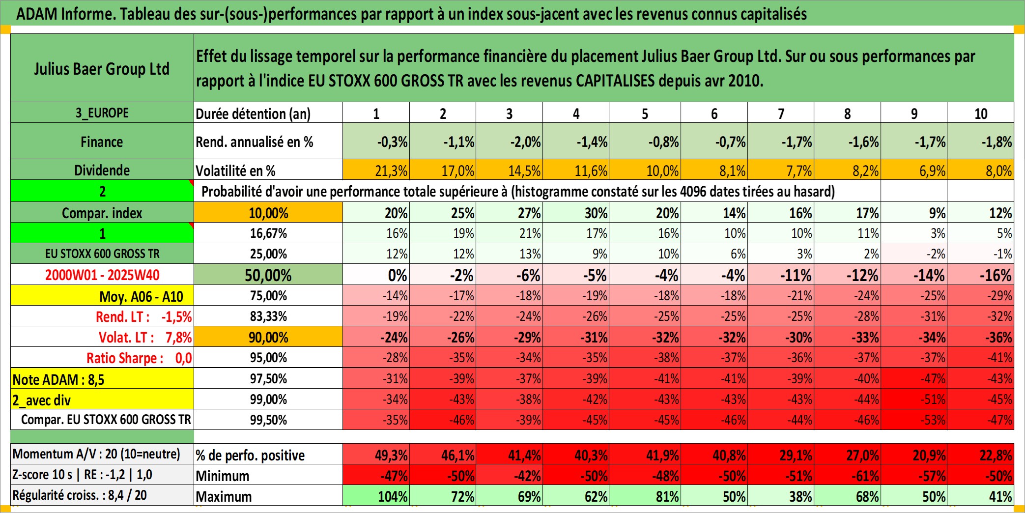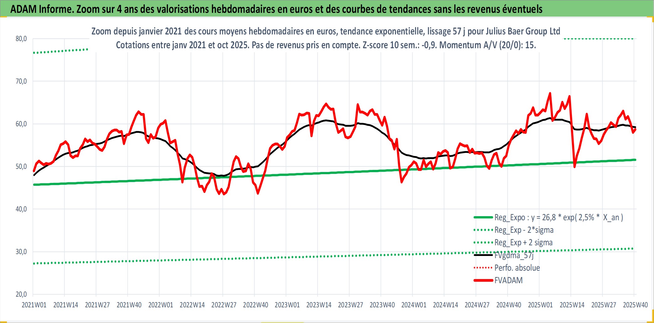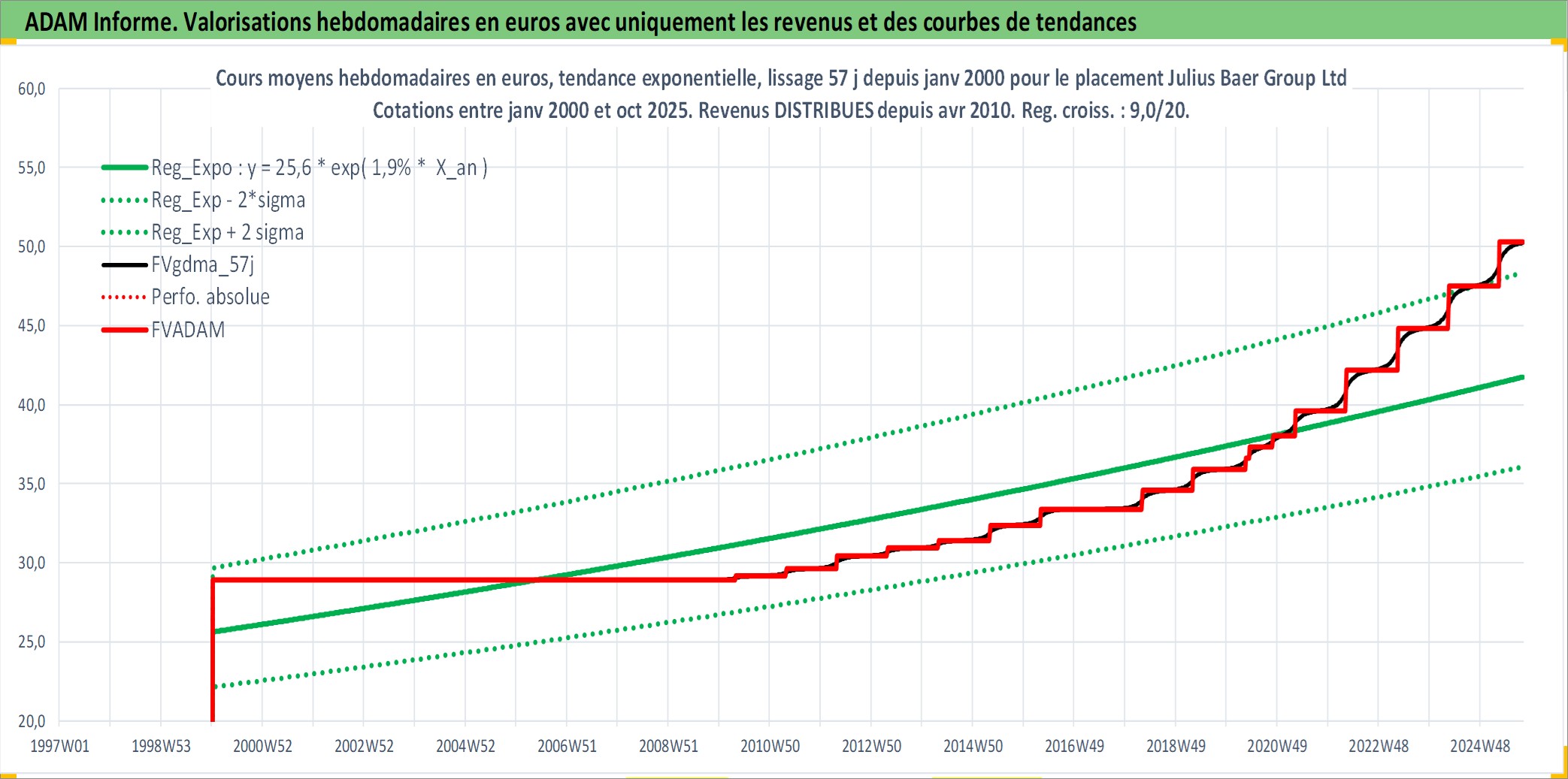 Site dédié aux investisseursPage dédiée sur site financeAnalyse des valorisations hebdomadaires de l'action Julius Baer Group Ltd. Cet actif est cote en CHF. Les valorisations sont en contrevaleur EURO et couvrent les semaines 2000W01 a 2025W40. Les revenus de cet actif financier sont pris en compte depuis la semaine 2010W15. La note globale ESG de cet actif est estimee a 10.0 (apres rebasage entre 0 et 20).