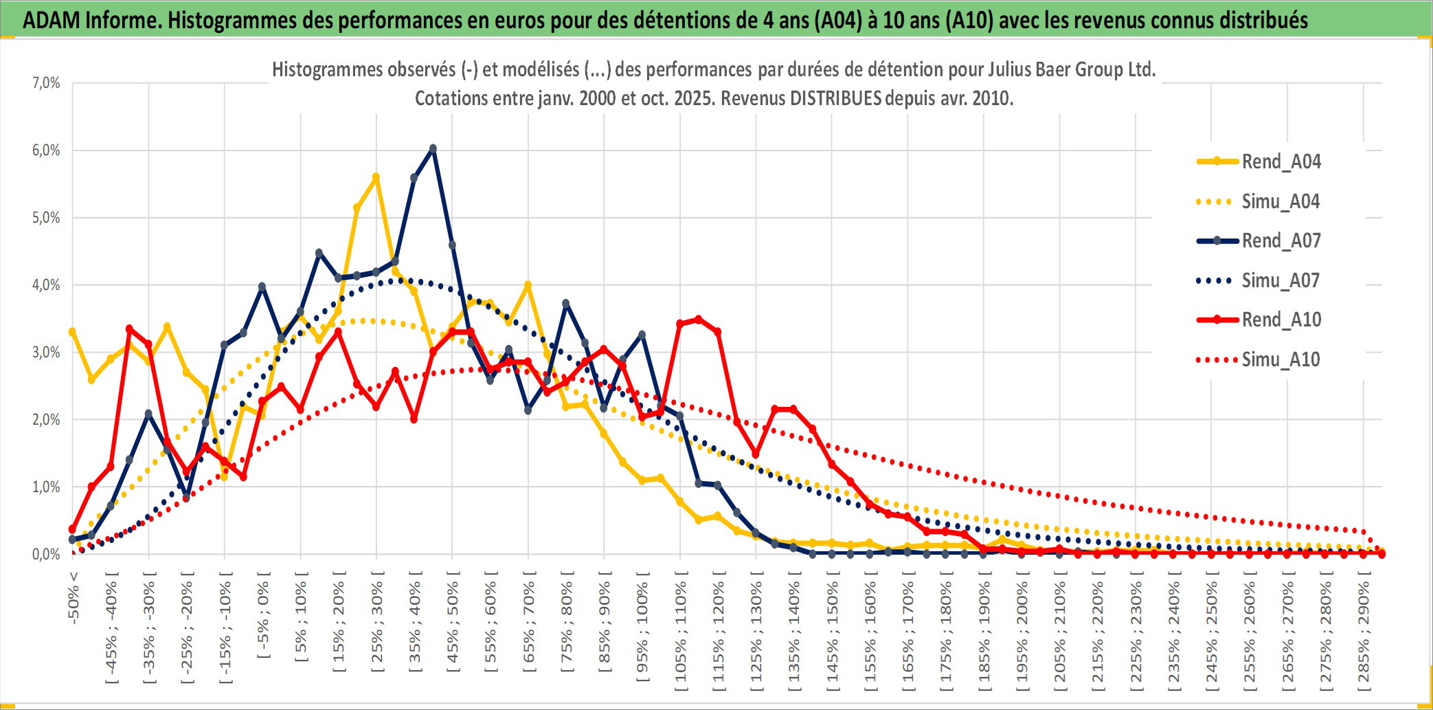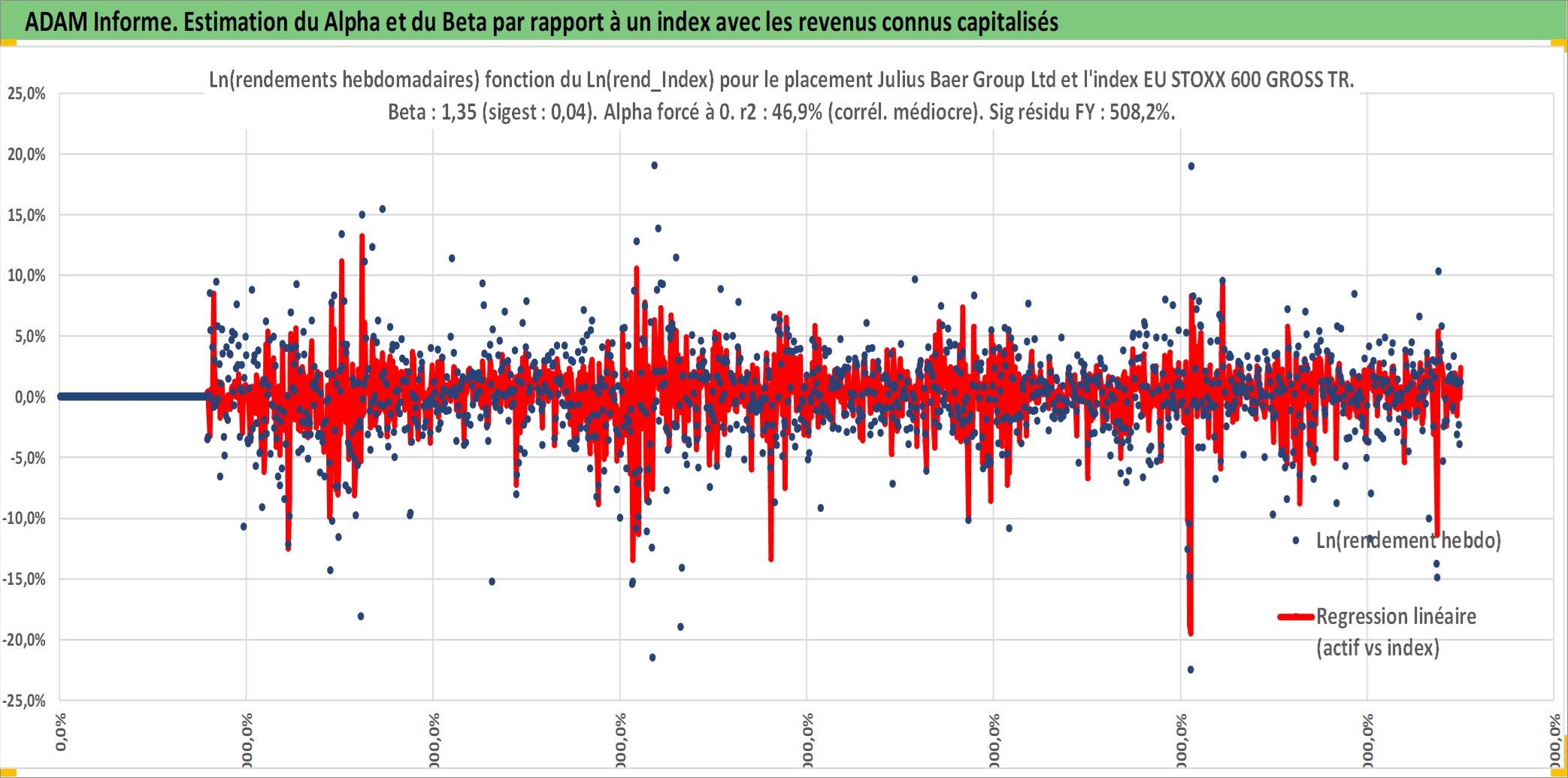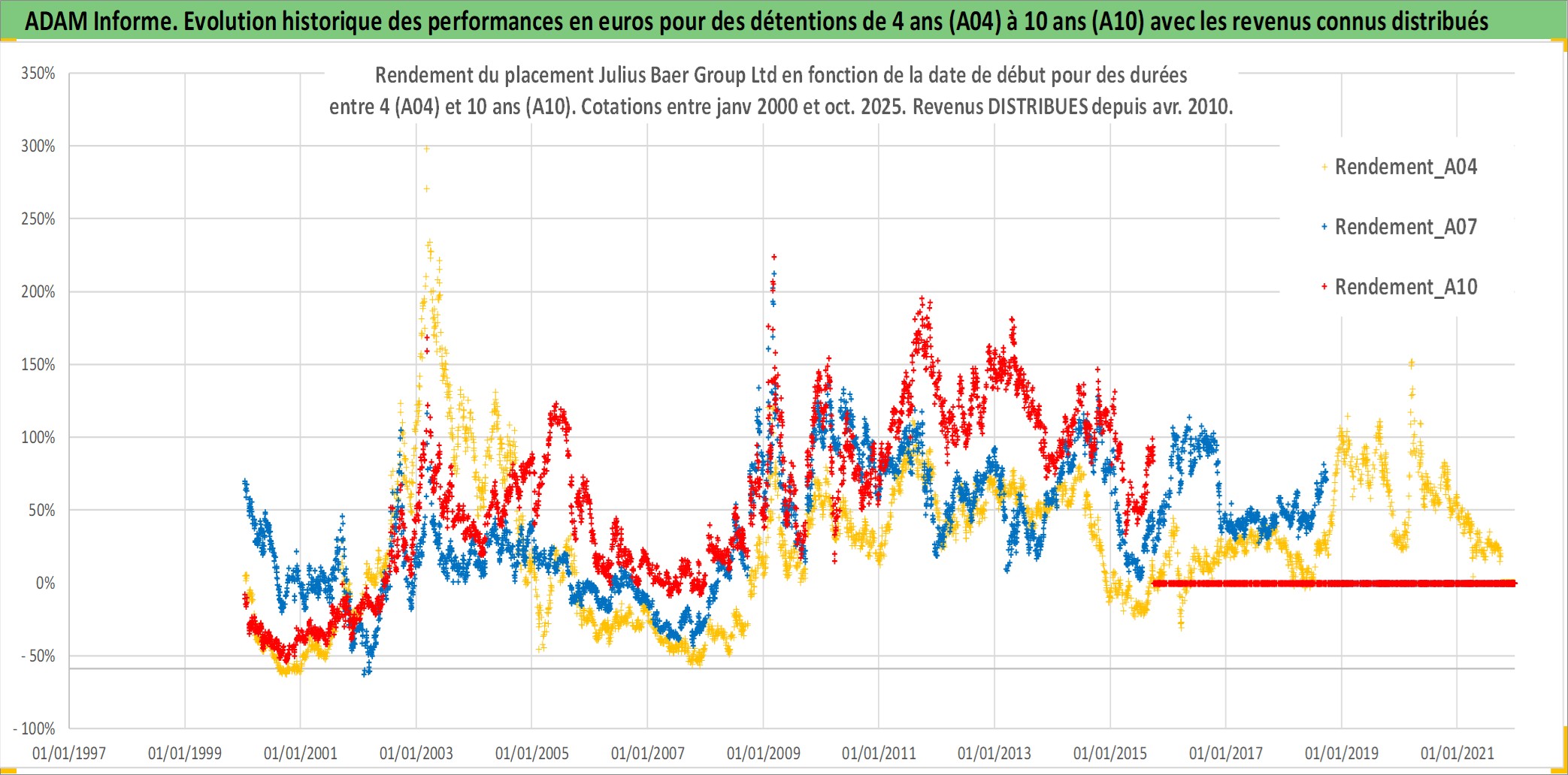 Site dédié aux investisseursPage dédiée sur site financeAnalyse des valorisations hebdomadaires de l'action Julius Baer Group Ltd. Cet actif est cote en CHF. Les valorisations sont en contrevaleur EURO et couvrent les semaines 2000W01 a 2025W40. Les revenus de cet actif financier sont pris en compte depuis la semaine 2010W15. La note globale ESG de cet actif est estimee a 10.0 (apres rebasage entre 0 et 20).