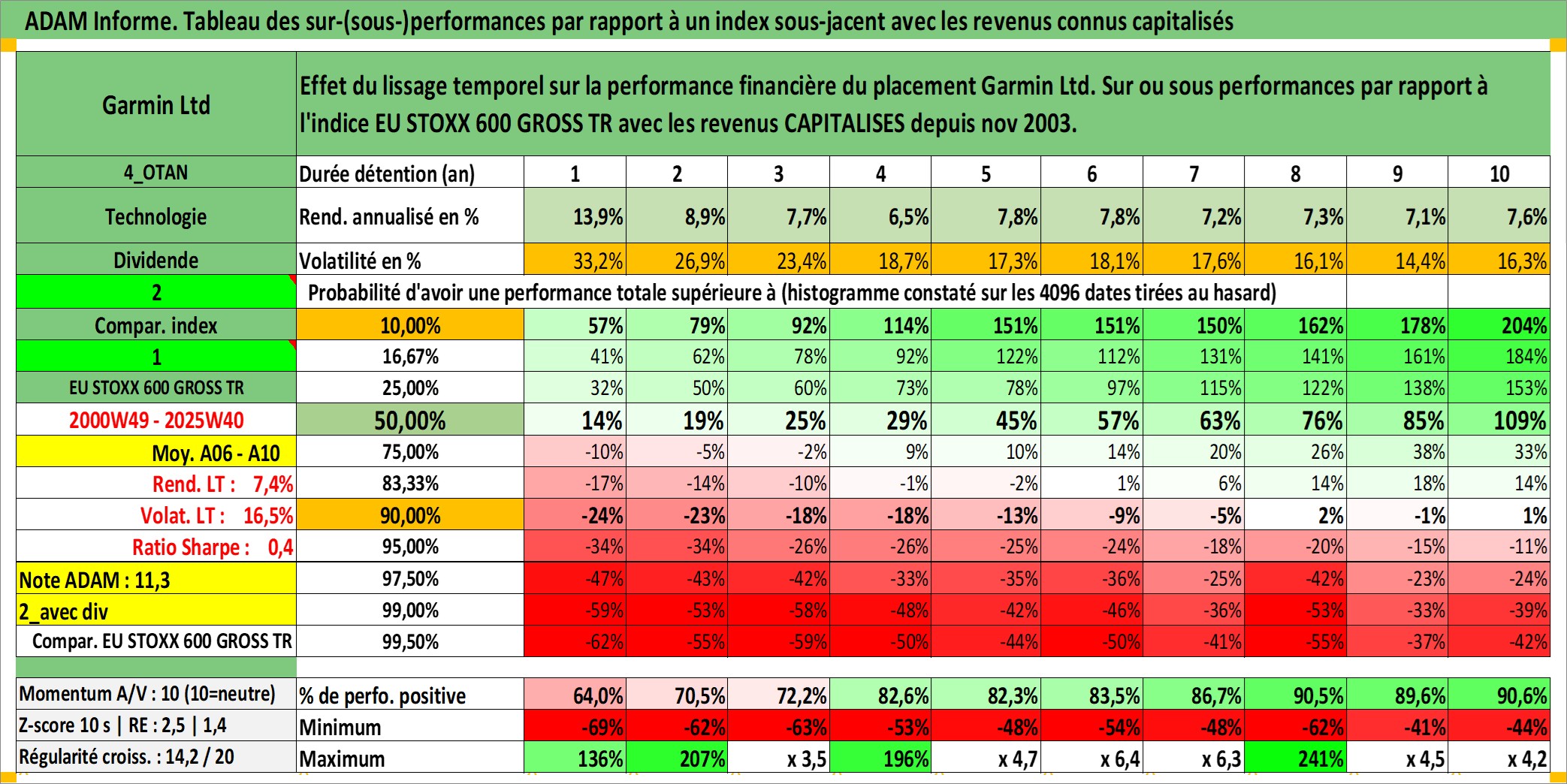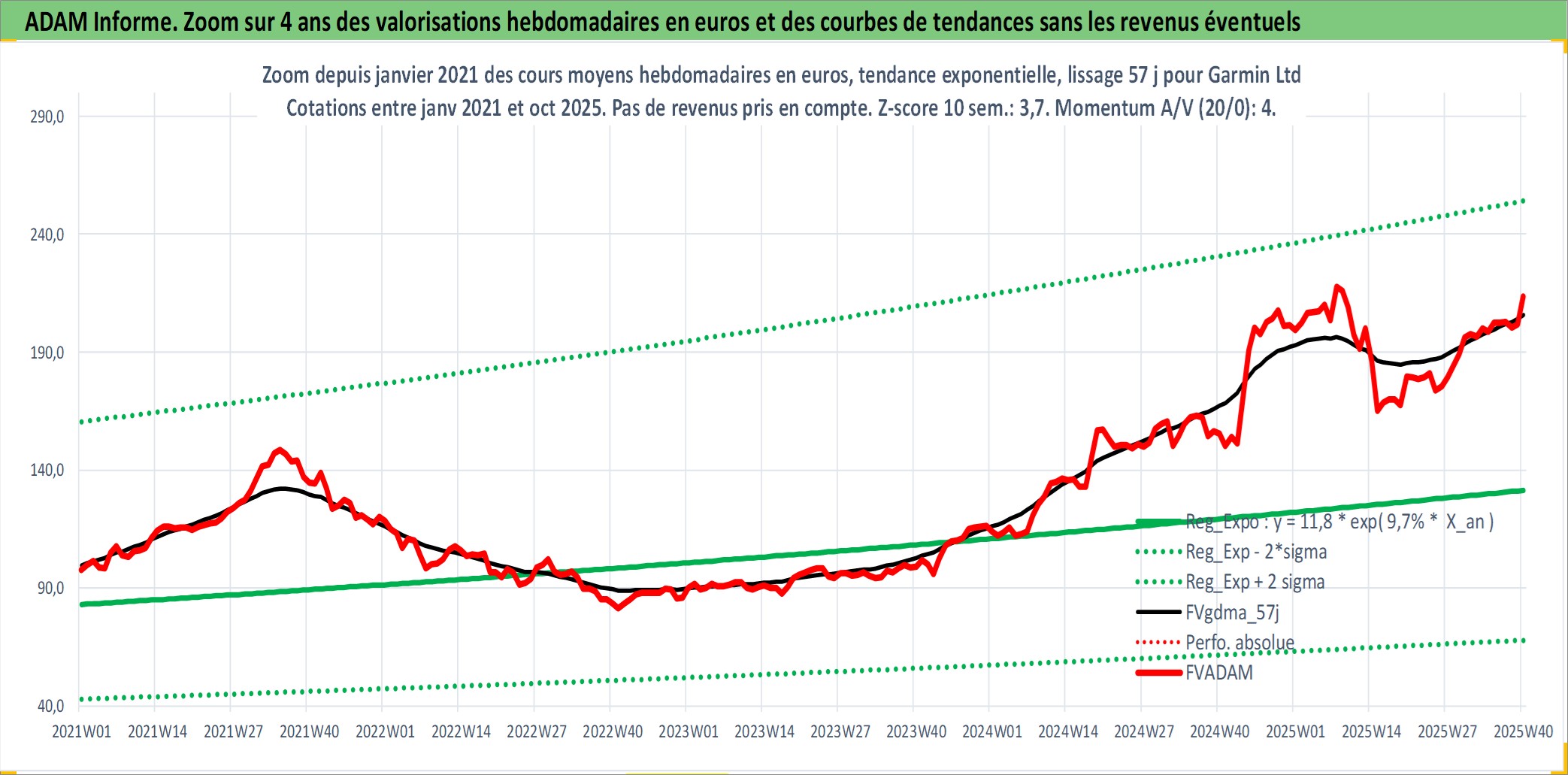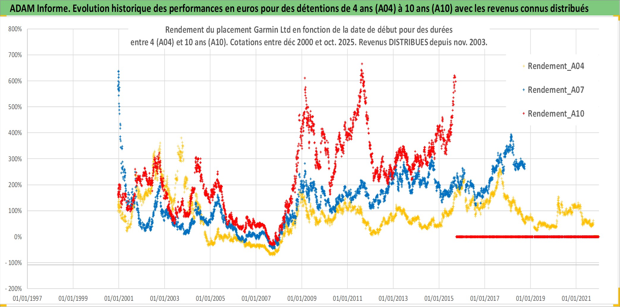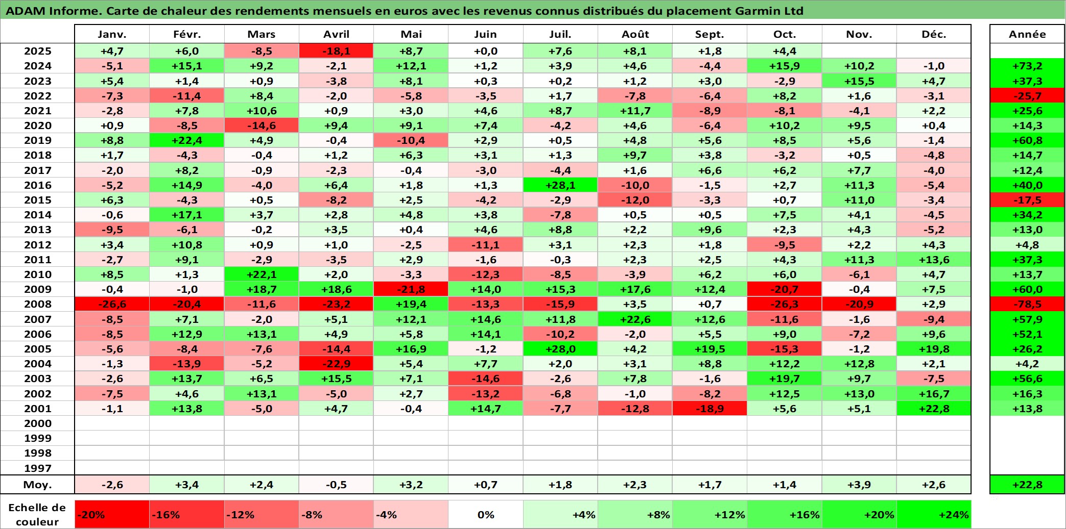 Site dédié aux investisseursPage dédiée sur site financeAnalyse des valorisations hebdomadaires de l'action Garmin Ltd. Cet actif est cote en USD. Les valorisations sont en contrevaleur EURO et couvrent les semaines 2000W49 a 2025W40. Les revenus de cet actif financier sont pris en compte depuis la semaine 2003W48. La note globale ESG de cet actif est estimee a 11.0 (apres rebasage entre 0 et 20).