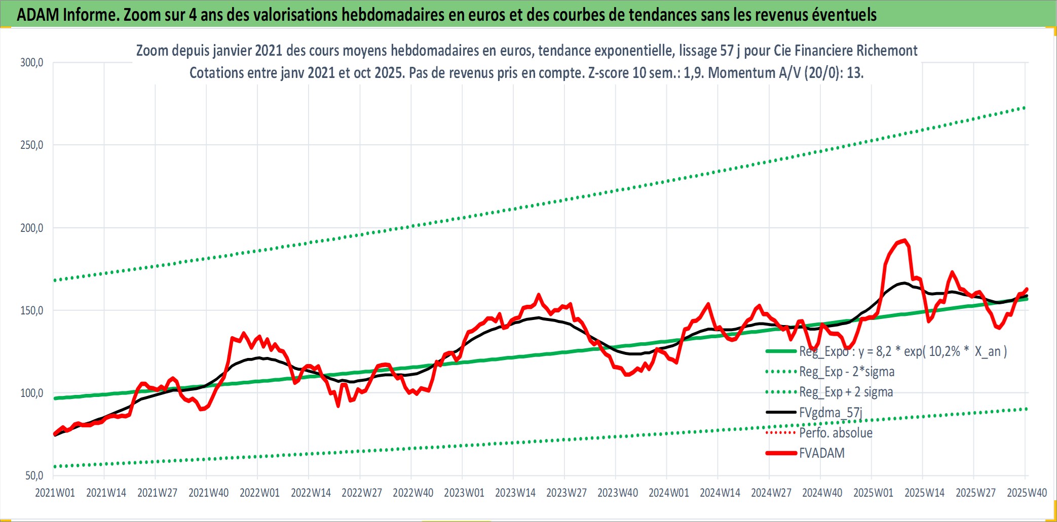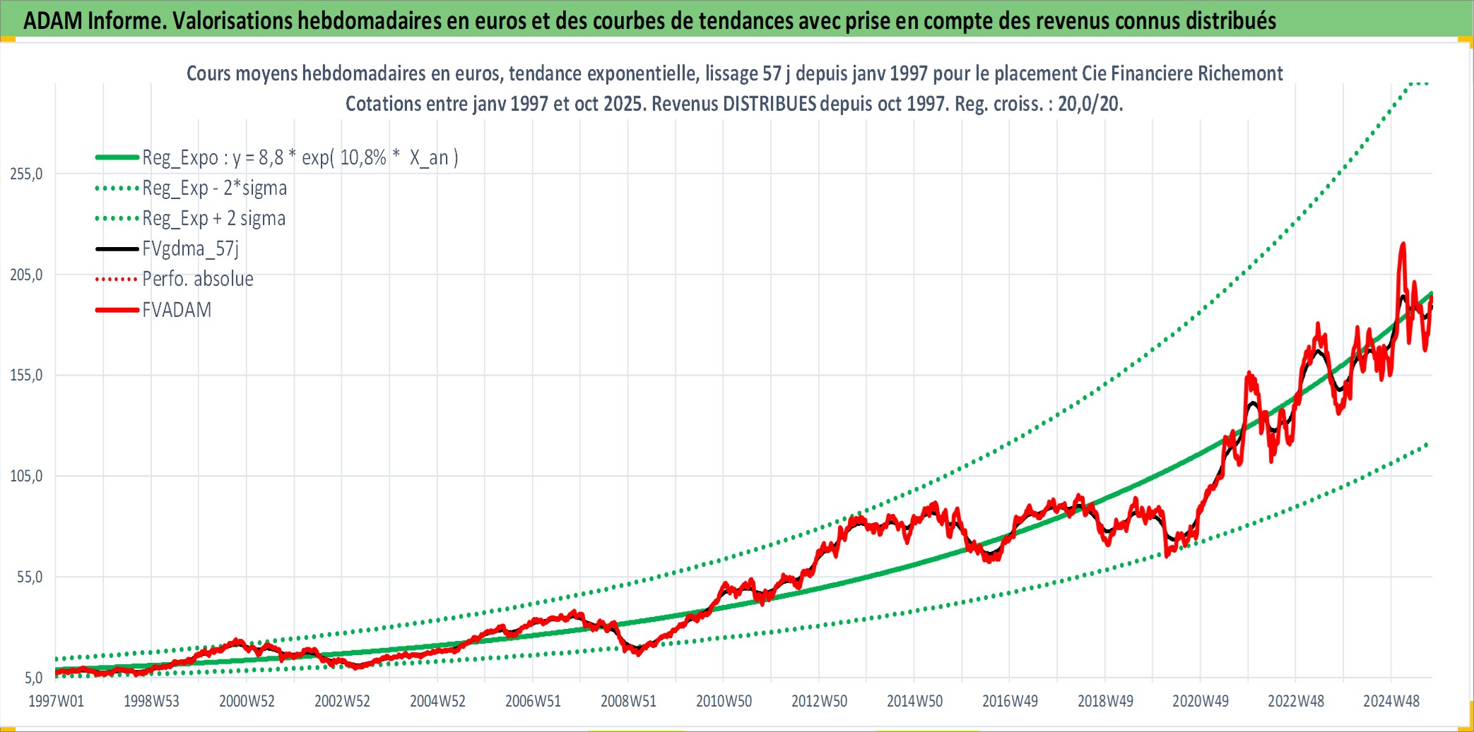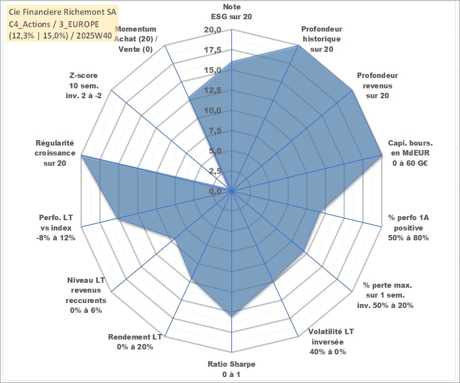 Site dédié aux investisseursPage dédiée sur site financeAnalyse des valorisations hebdomadaires de l'action Cie Financiere Richemont SA. Cet actif est cote en CHF. Les valorisations sont en contrevaleur EURO et couvrent les semaines 1997W01 a 2025W40. Les revenus de cet actif financier sont pris en compte depuis la semaine 1997W40. La note globale ESG de cet actif est estimee a 16.0 (apres rebasage entre 0 et 20).