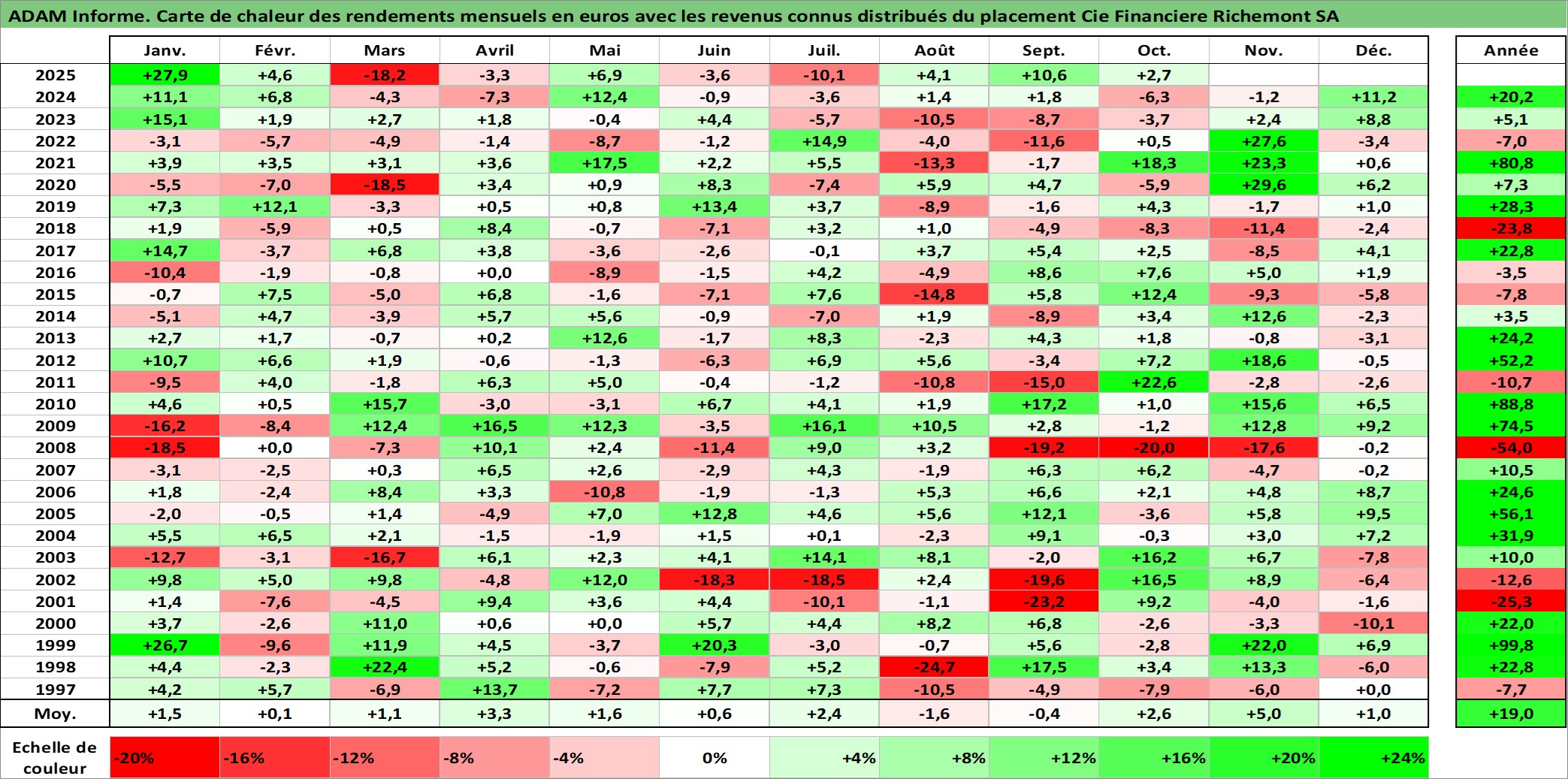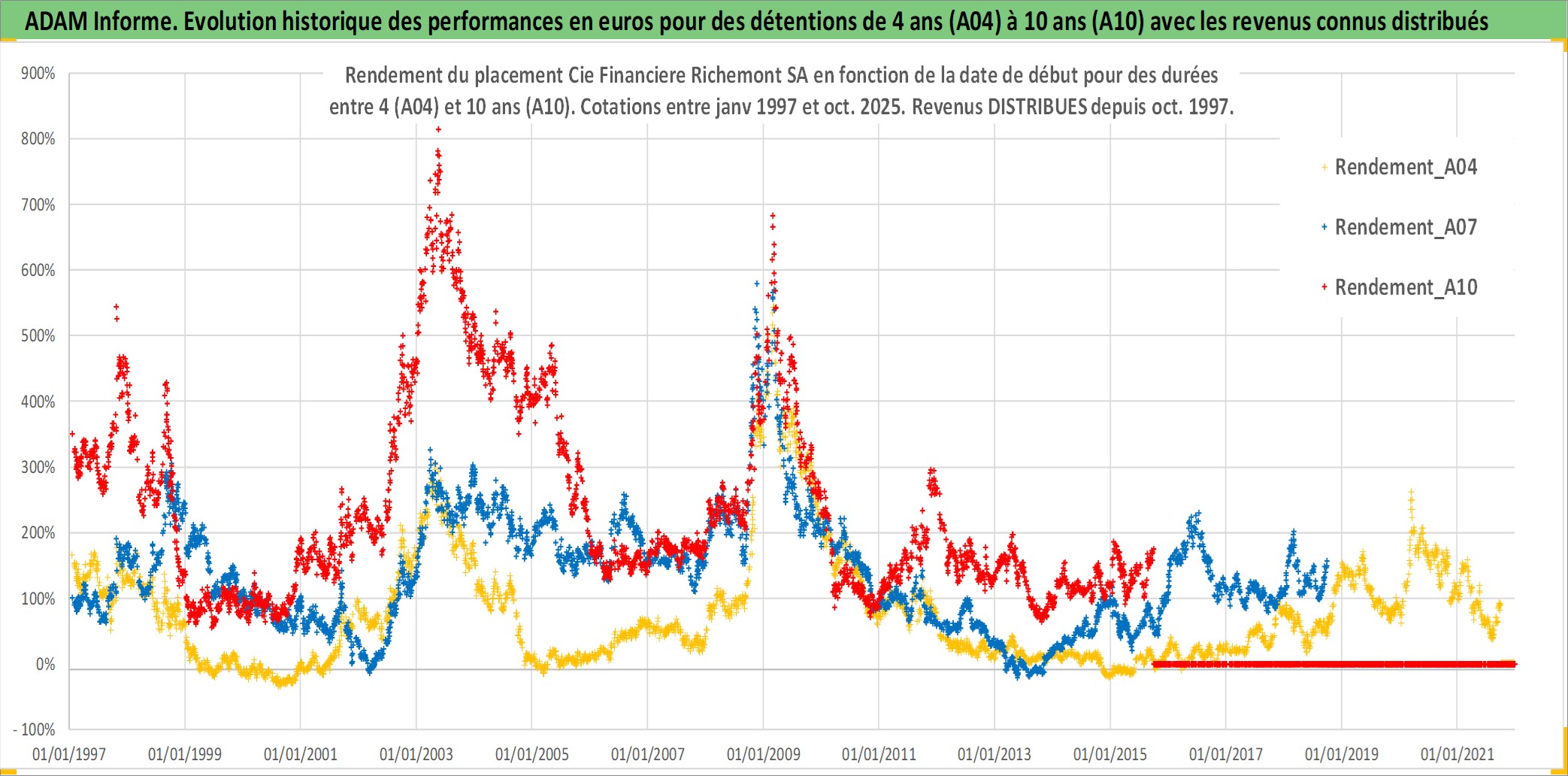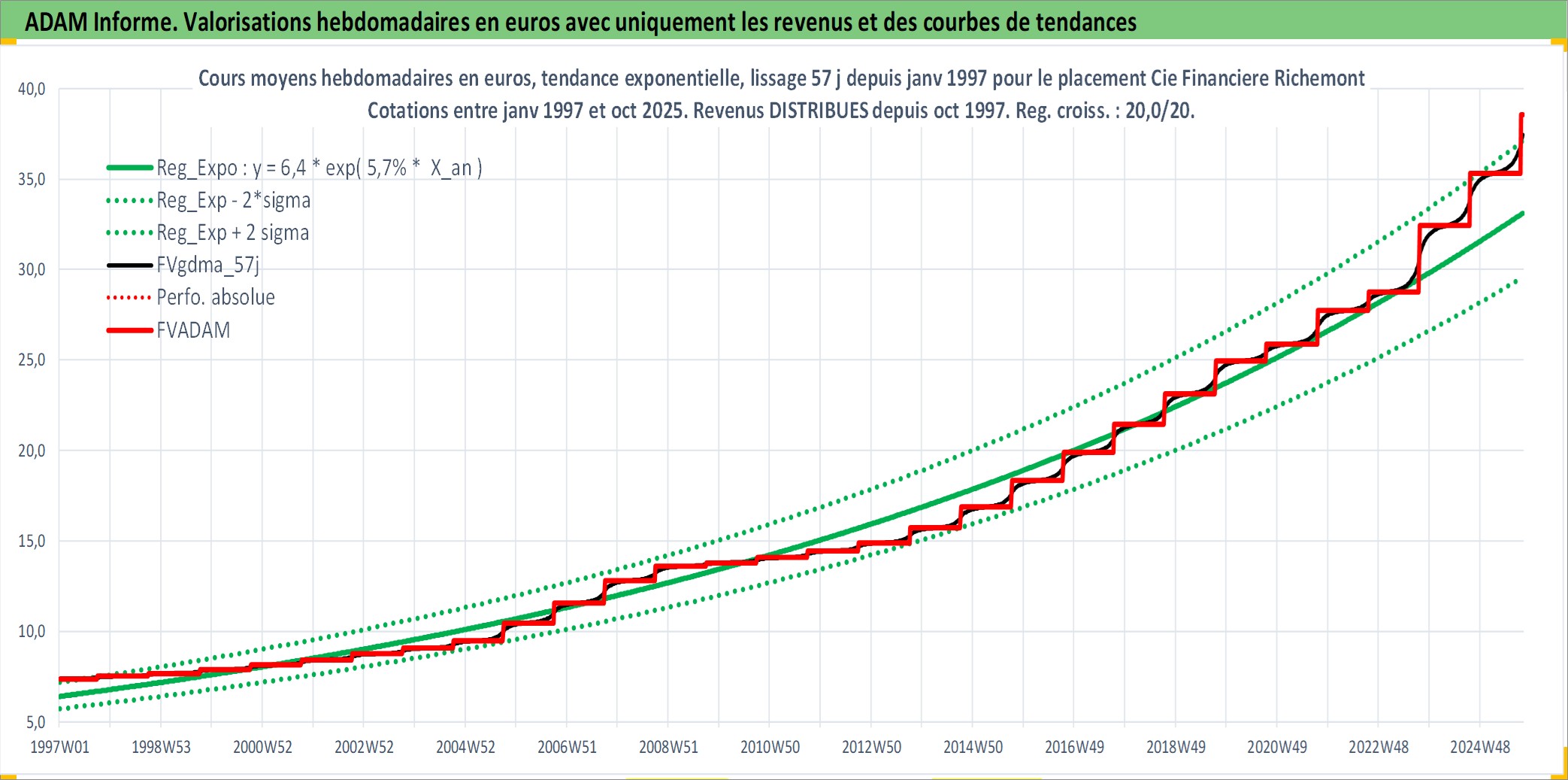 Site dédié aux investisseursPage dédiée sur site financeAnalyse des valorisations hebdomadaires de l'action Cie Financiere Richemont SA. Cet actif est cote en CHF. Les valorisations sont en contrevaleur EURO et couvrent les semaines 1997W01 a 2025W40. Les revenus de cet actif financier sont pris en compte depuis la semaine 1997W40. La note globale ESG de cet actif est estimee a 16.0 (apres rebasage entre 0 et 20).