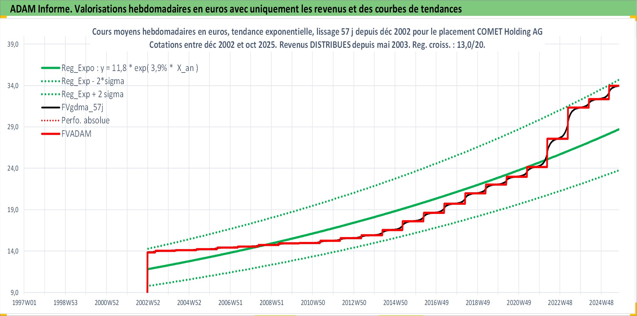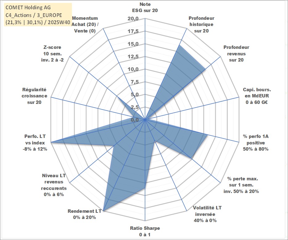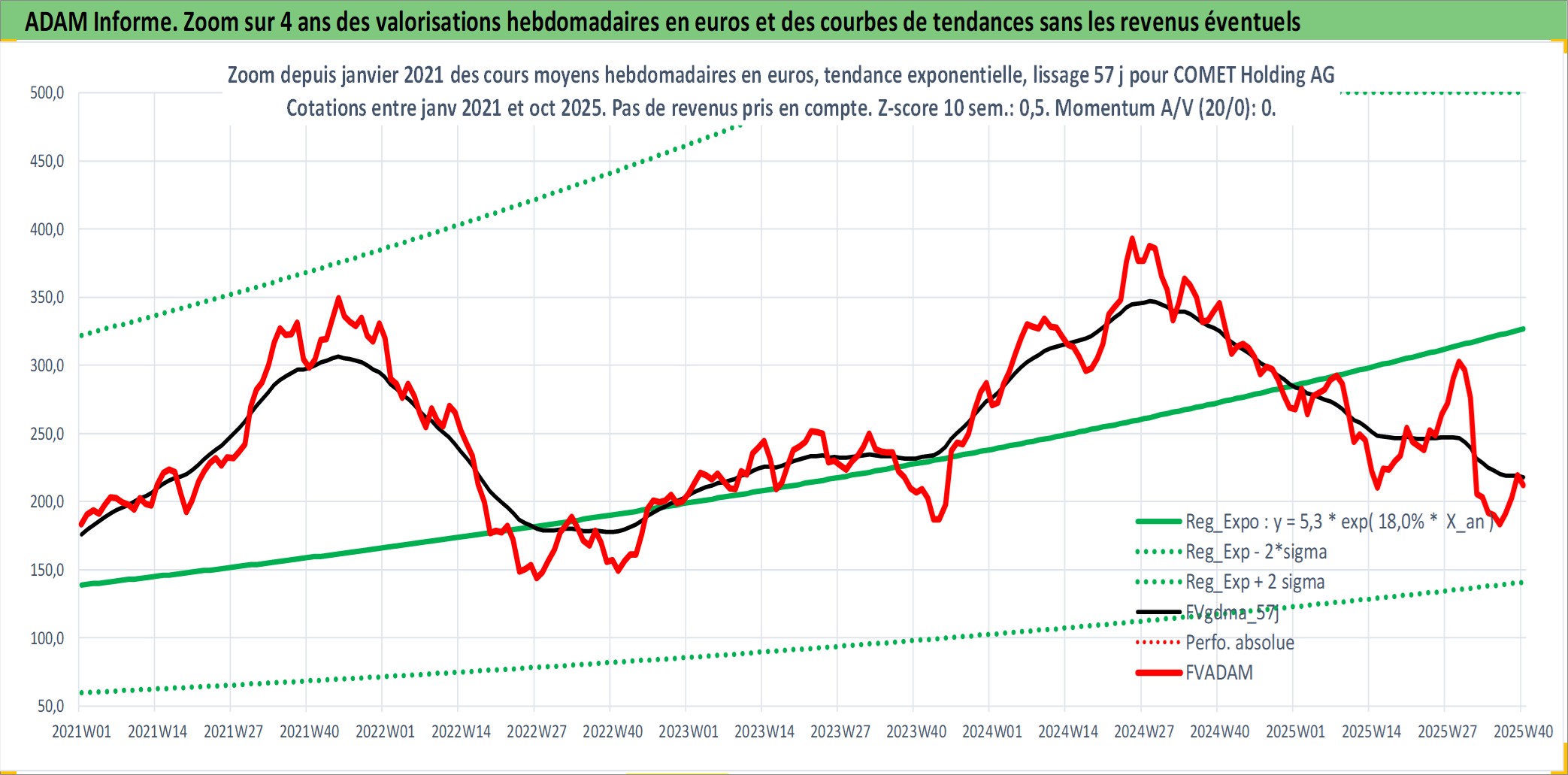 Site dédié aux investisseursPage dédiée sur site financeAnalyse des valorisations hebdomadaires de l'action COMET Holding AG. Cet actif est cote en CHF. Les valorisations sont en contrevaleur EURO et couvrent les semaines 2002W51 a 2025W40. Les revenus de cet actif financier sont pris en compte depuis la semaine 2003W19. La note ESG de cet actif n'est pas connue.