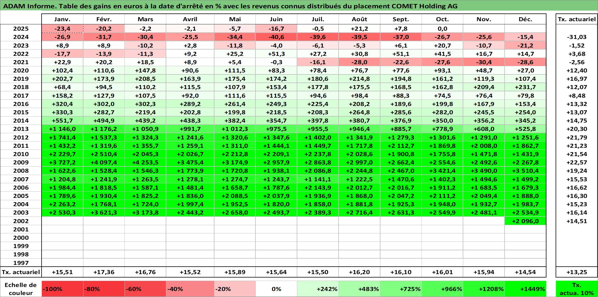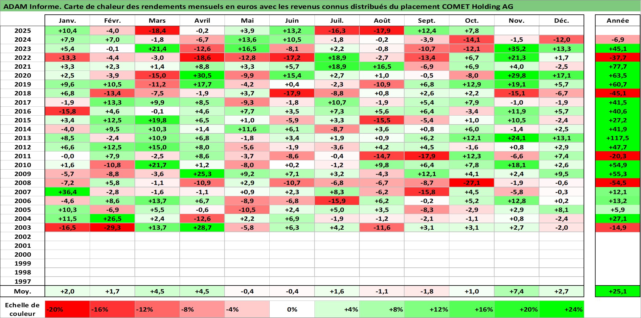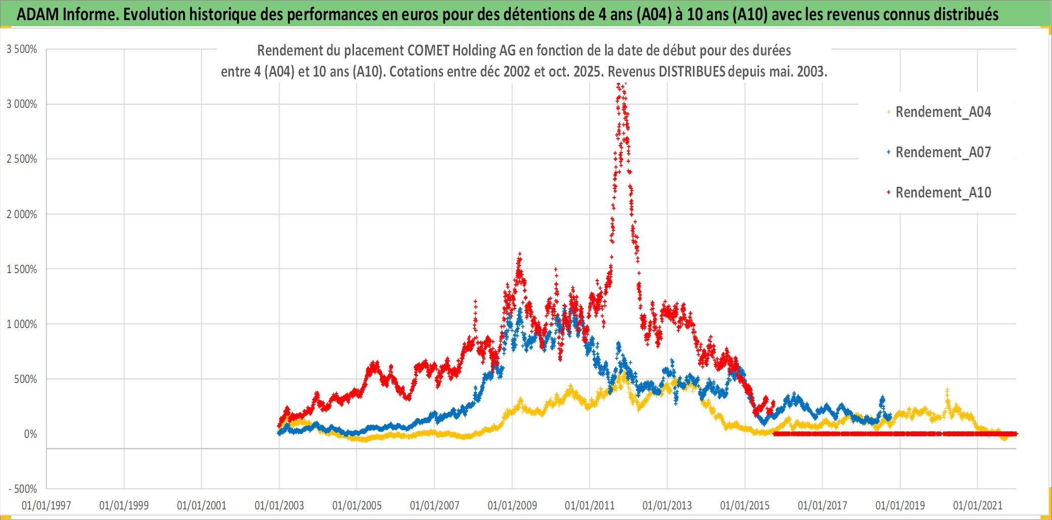 Site dédié aux investisseursPage dédiée sur site financeAnalyse des valorisations hebdomadaires de l'action COMET Holding AG. Cet actif est cote en CHF. Les valorisations sont en contrevaleur EURO et couvrent les semaines 2002W51 a 2025W40. Les revenus de cet actif financier sont pris en compte depuis la semaine 2003W19. La note ESG de cet actif n'est pas connue.