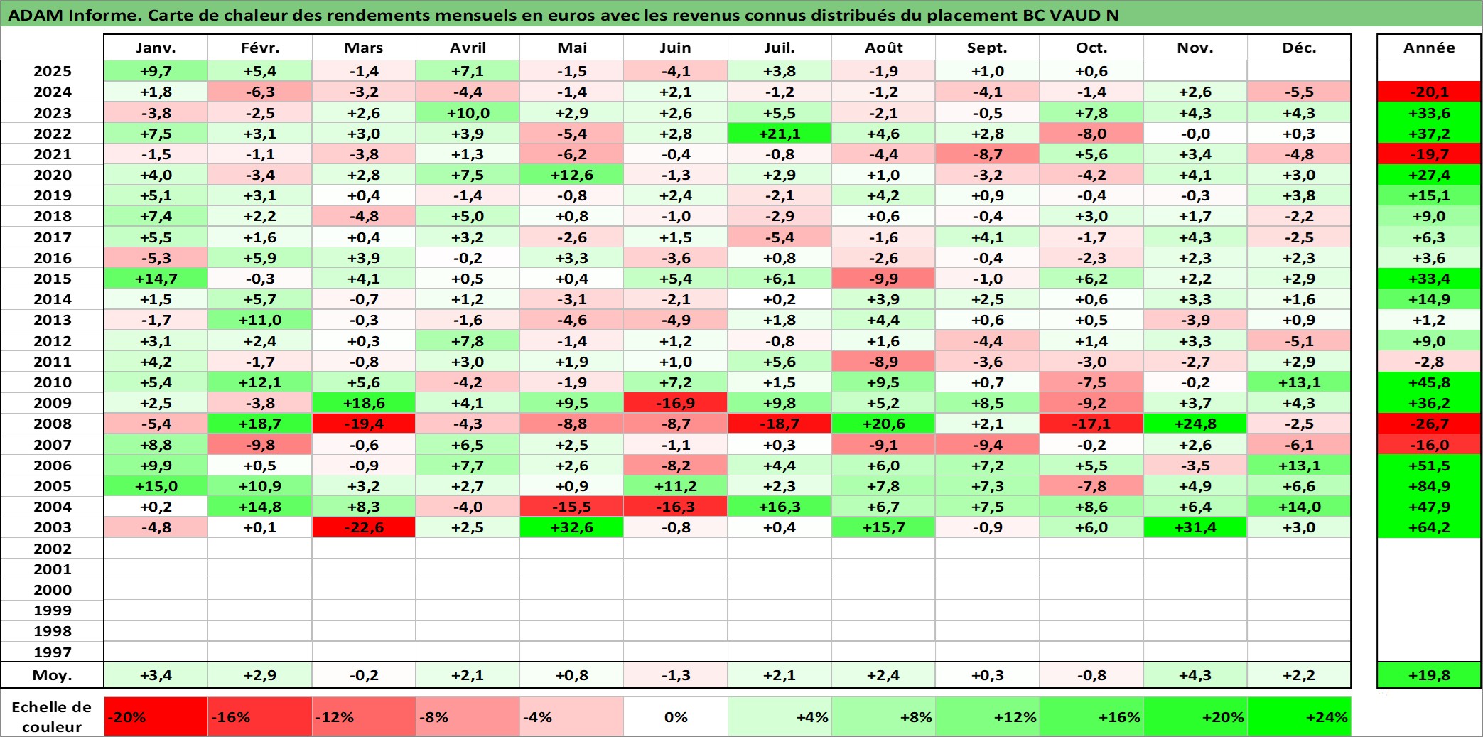 Site dédié aux investisseursPage dédiée sur site financeAnalyse des valorisations hebdomadaires de l'action BC VAUD N. Cet actif est cote en CHF. Les valorisations sont en contrevaleur EURO et couvrent les semaines 2002W49 a 2025W40. Les revenus de cet actif financier sont pris en compte depuis la semaine 2004W19. La note ESG de cet actif n'est pas connue.