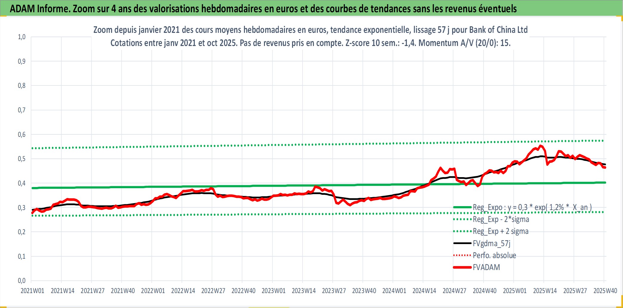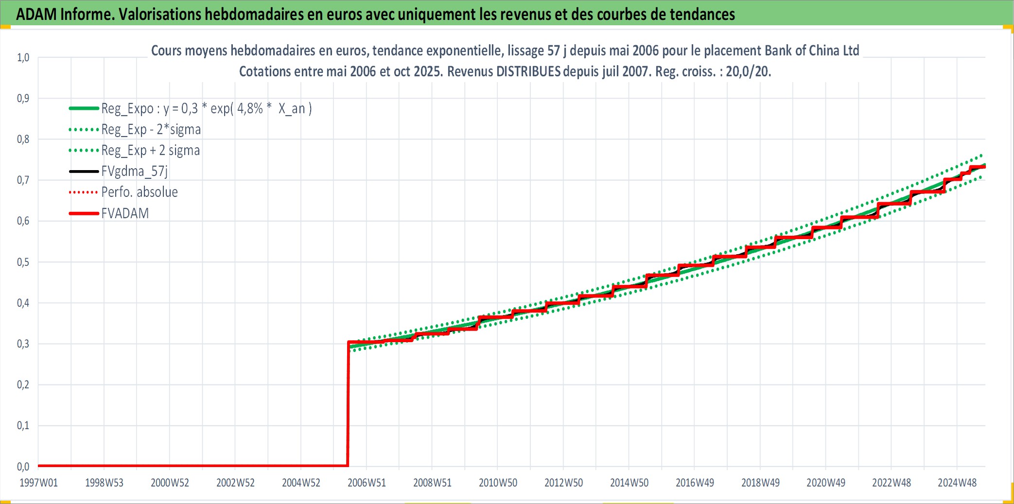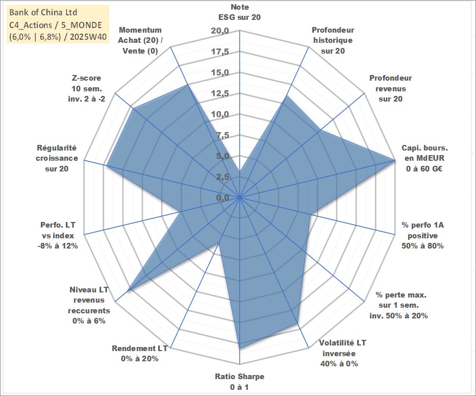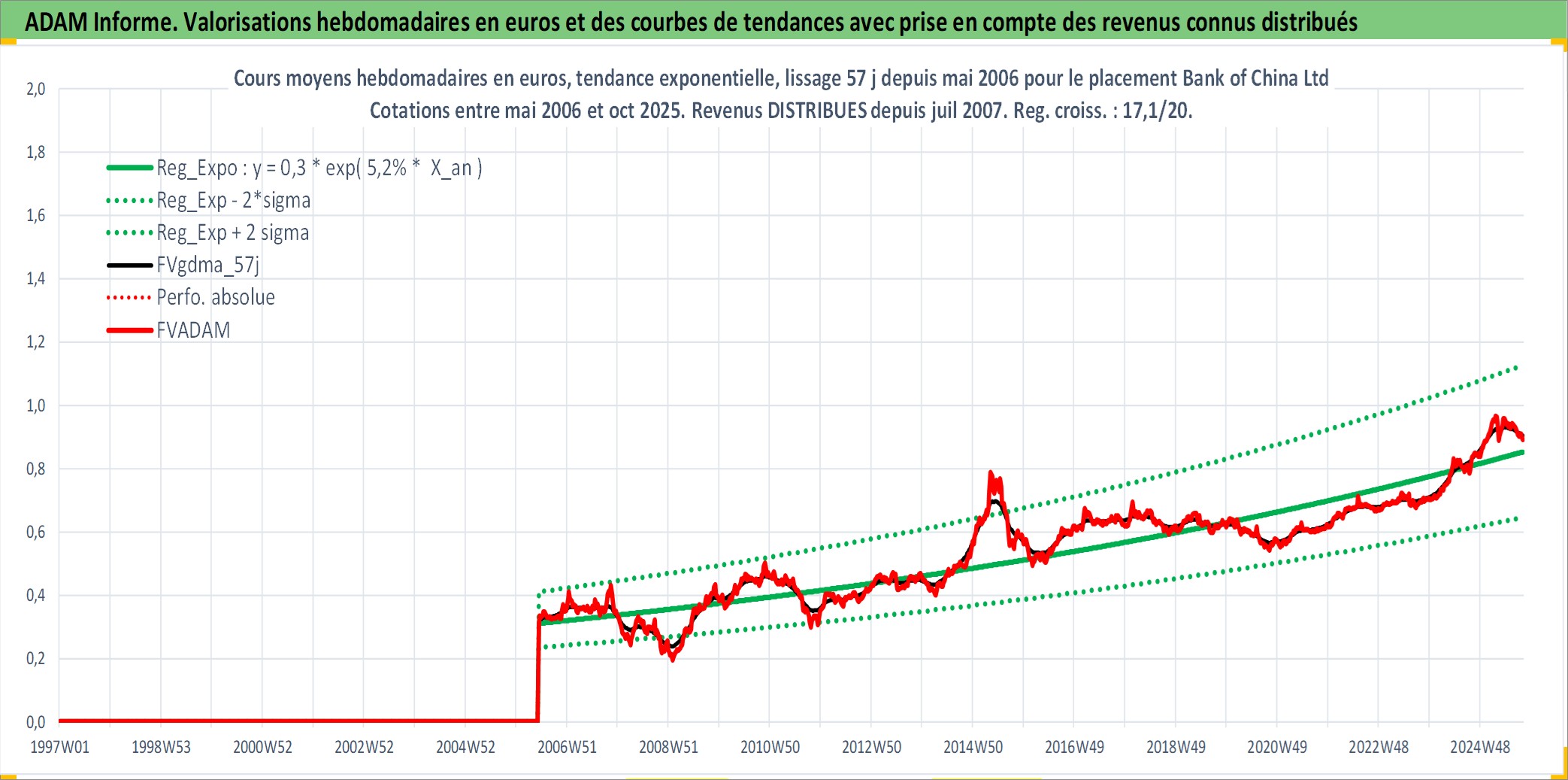 Site dédié aux investisseursPage dédiée sur site financeAnalyse des valorisations hebdomadaires de l'action Bank of China Ltd. Cet actif est cote en HKD. Les valorisations sont en contrevaleur EURO et couvrent les semaines 2006W22 a 2025W40. Les revenus de cet actif financier sont pris en compte depuis la semaine 2007W27. La note globale ESG de cet actif est estimee a 3.0 (apres rebasage entre 0 et 20).