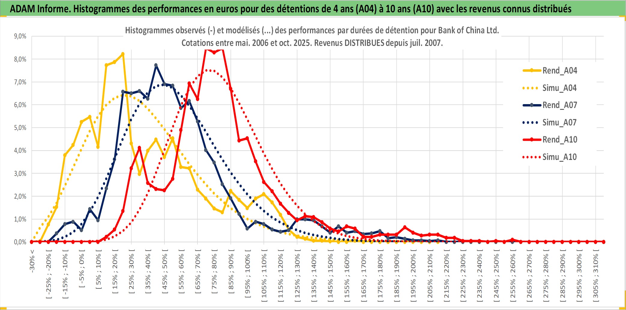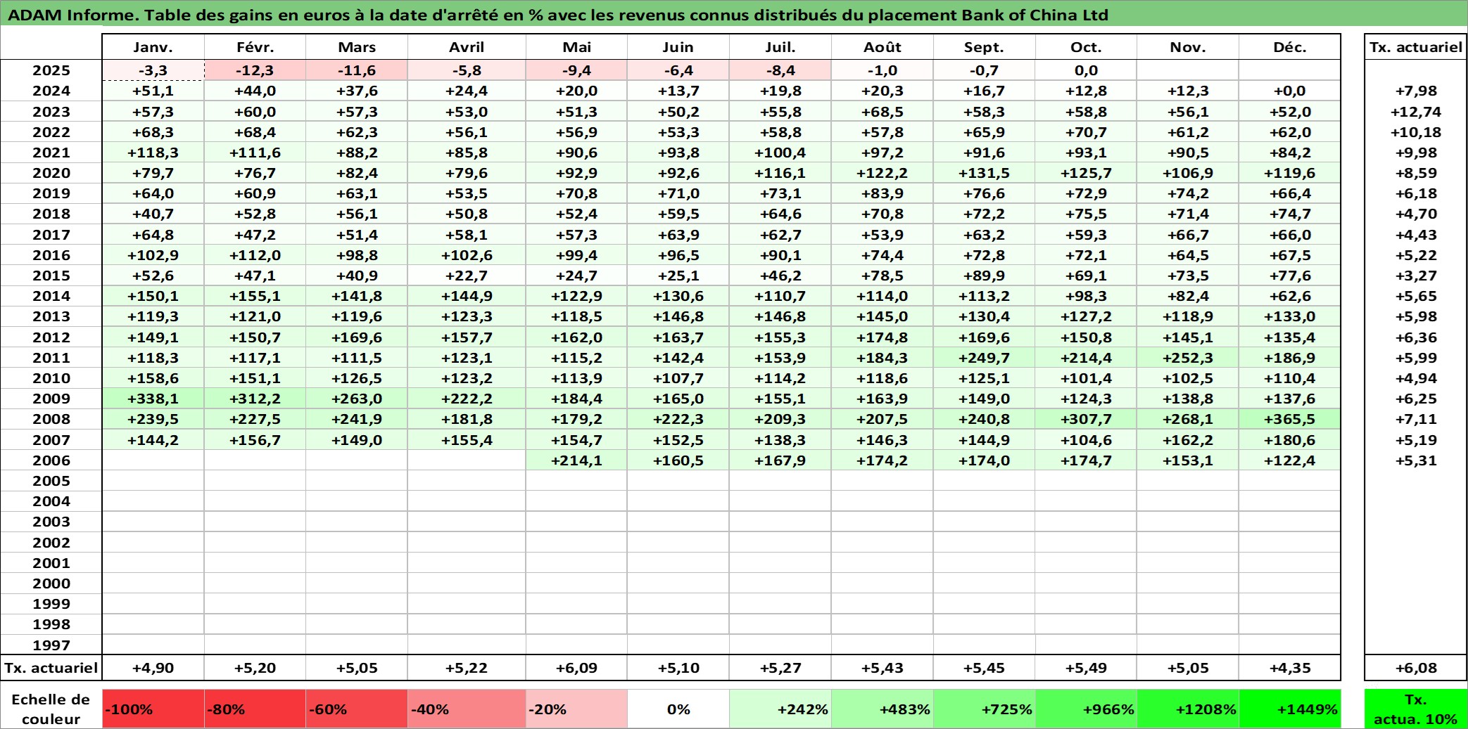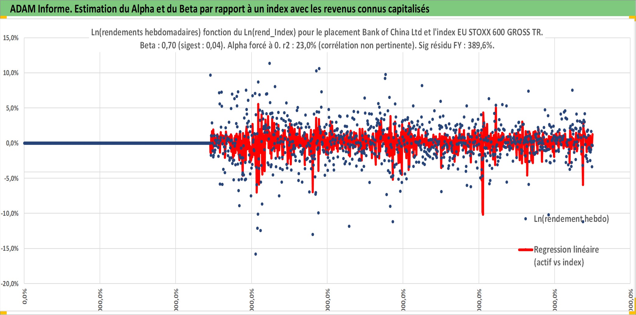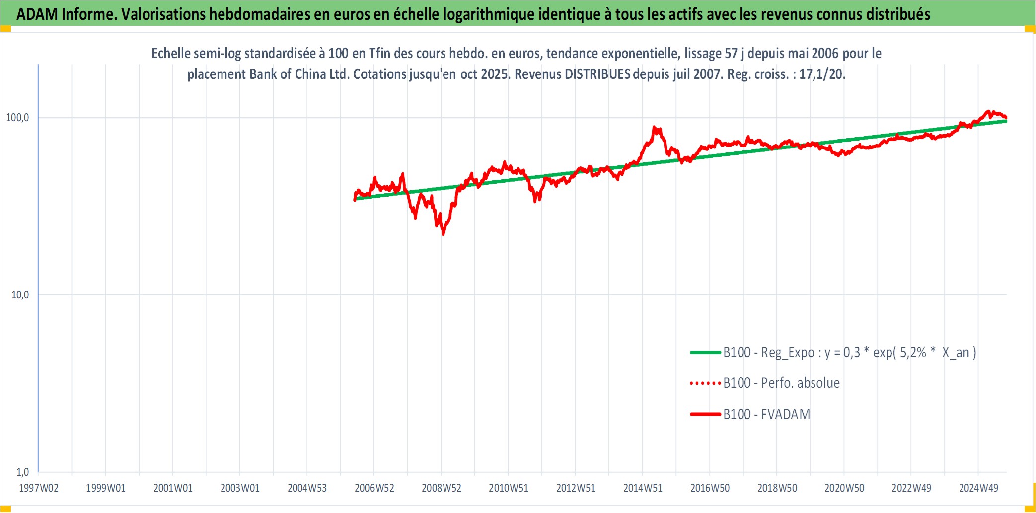Site dédié aux investisseursPage dédiée sur site financeAnalyse des valorisations hebdomadaires de l'action Bank of China Ltd. Cet actif est cote en HKD. Les valorisations sont en contrevaleur EURO et couvrent les semaines 2006W22 a 2025W40. Les revenus de cet actif financier sont pris en compte depuis la semaine 2007W27. La note globale ESG de cet actif est estimee a 3.0 (apres rebasage entre 0 et 20).